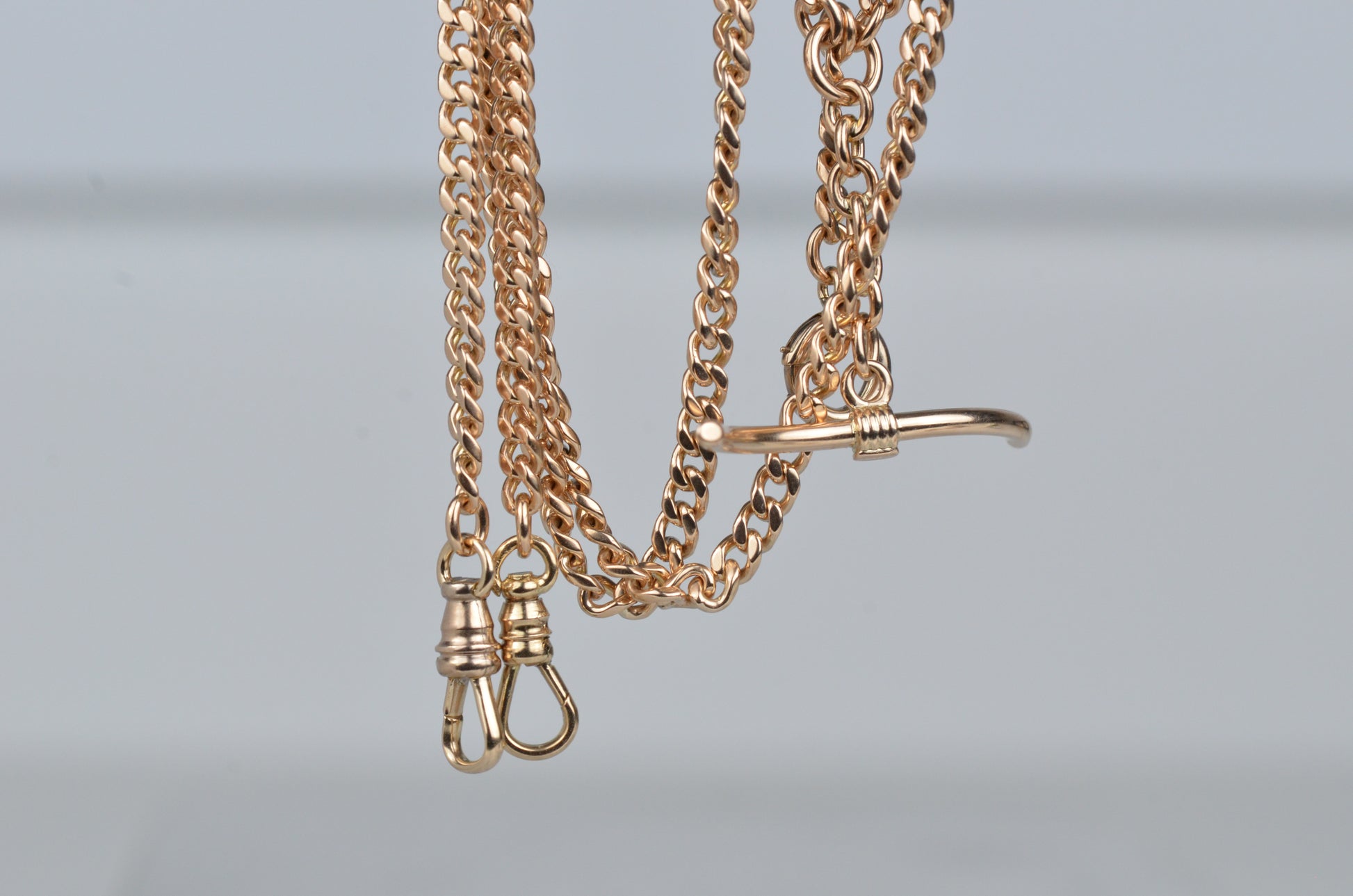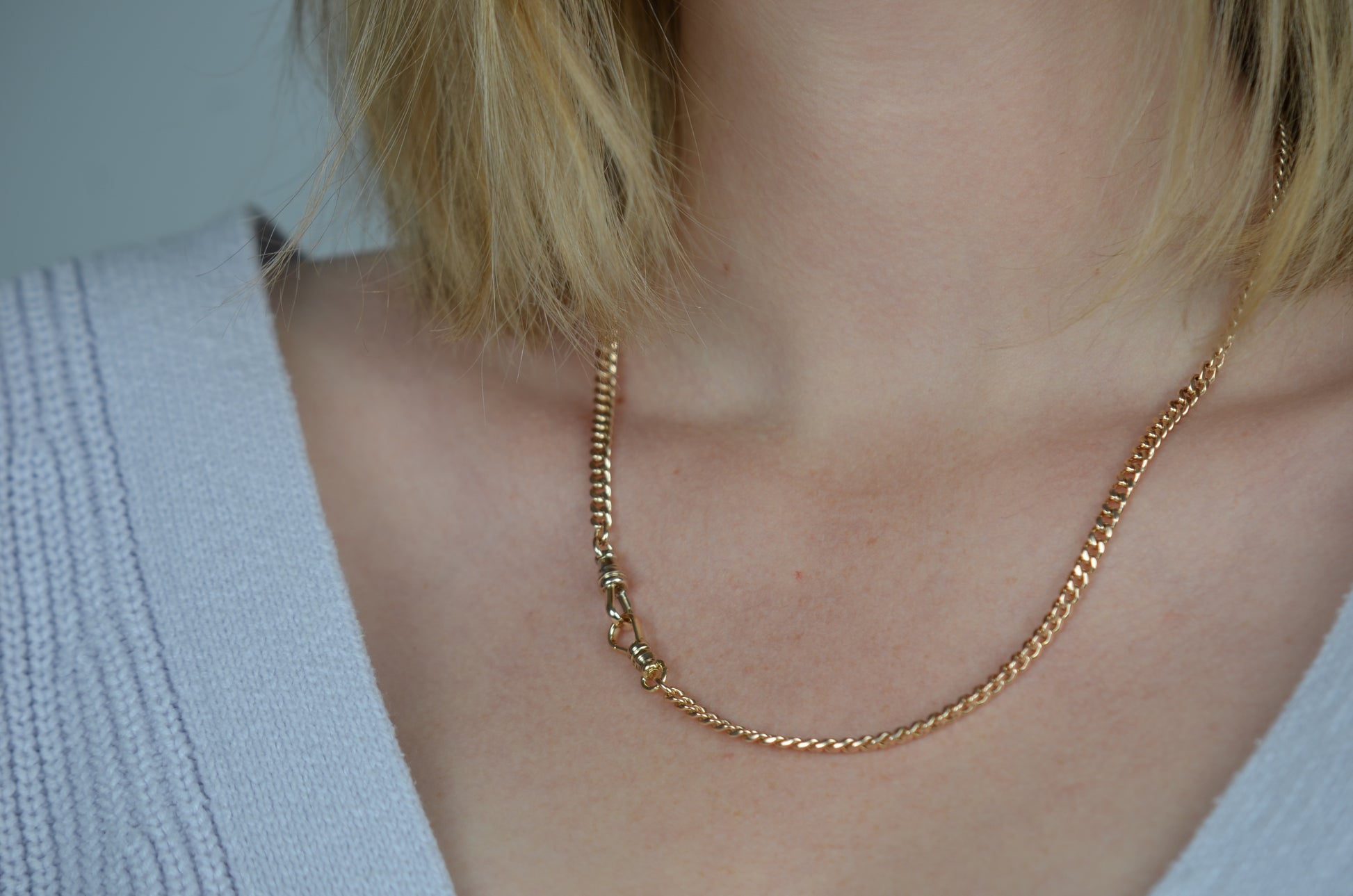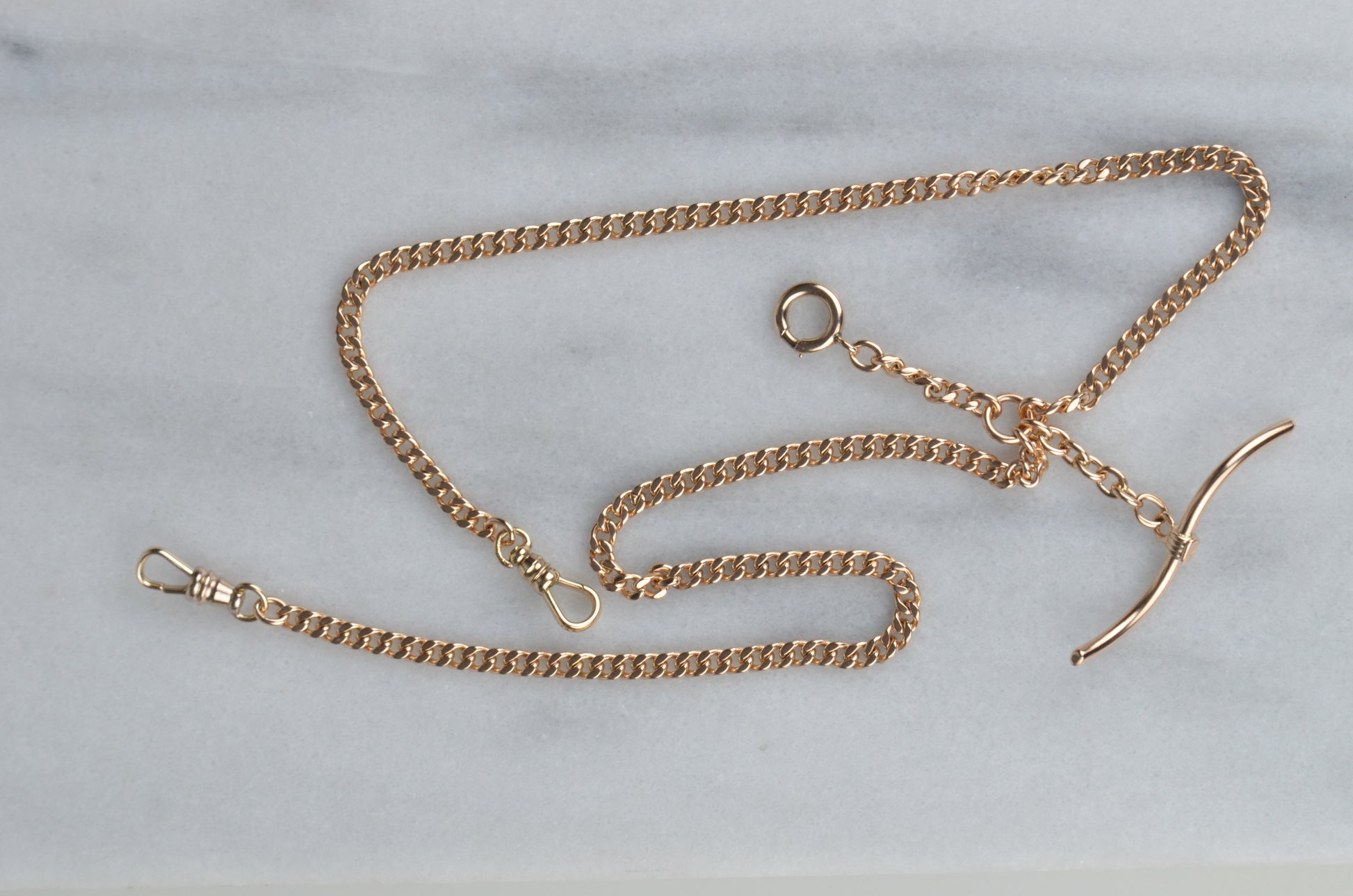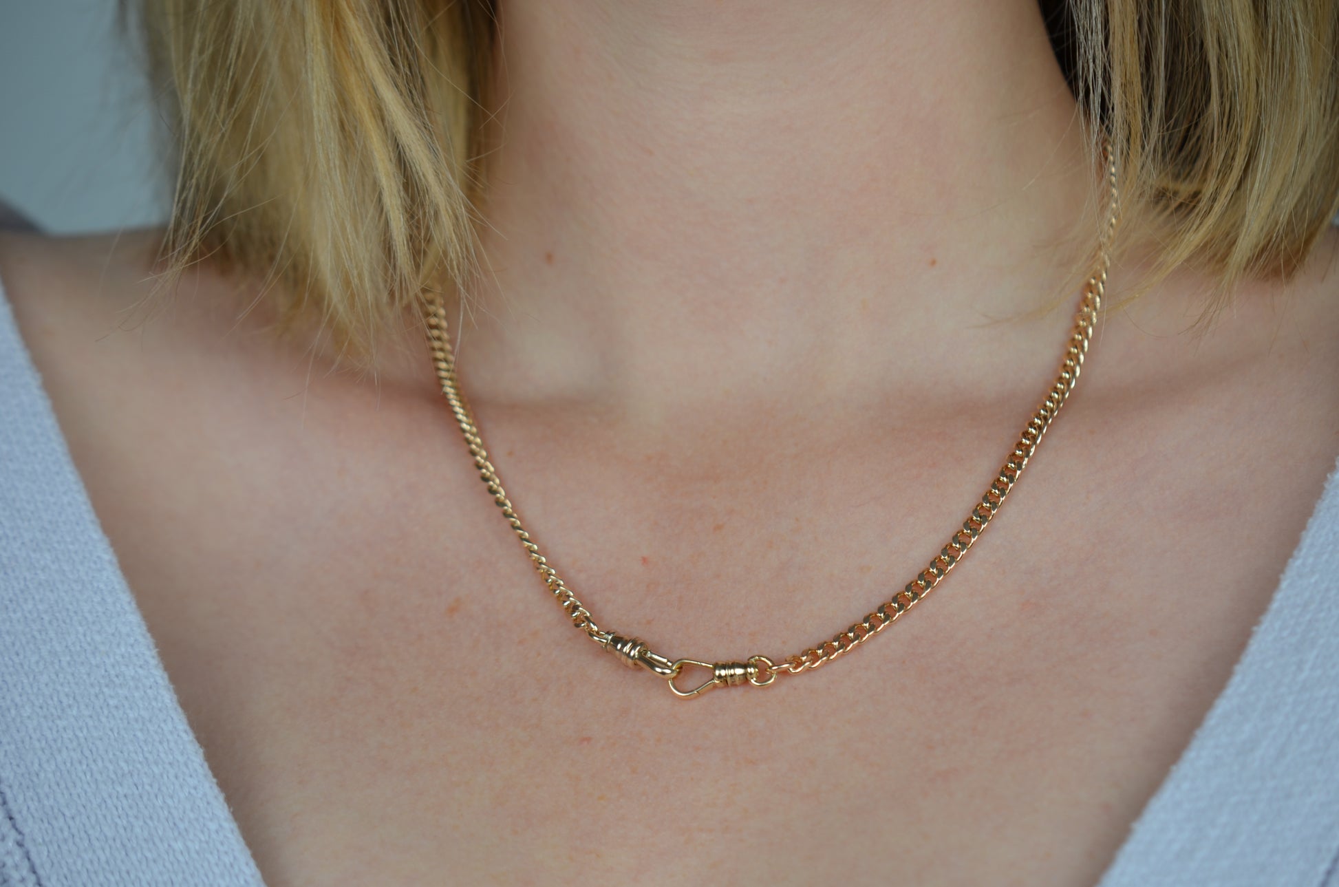 A gorgeous gold watch chain - in harder to find yellow gold - is among the most versatile pieces you can add to your collection. In its traditional style, the t-bar would slip easily through a button hole on a vest or a top, and at either end a dog clip closure makes for an easy way to attach a pocket watch, a fob, or any selection of tools or charms. Give it a modern twist by wrapping it around your wrist, or by wearing it as a necklace with either the t-bar or clasps hanging from your collarbone. Easily add charms alone or in groups, or add your favourite split ring full of them.