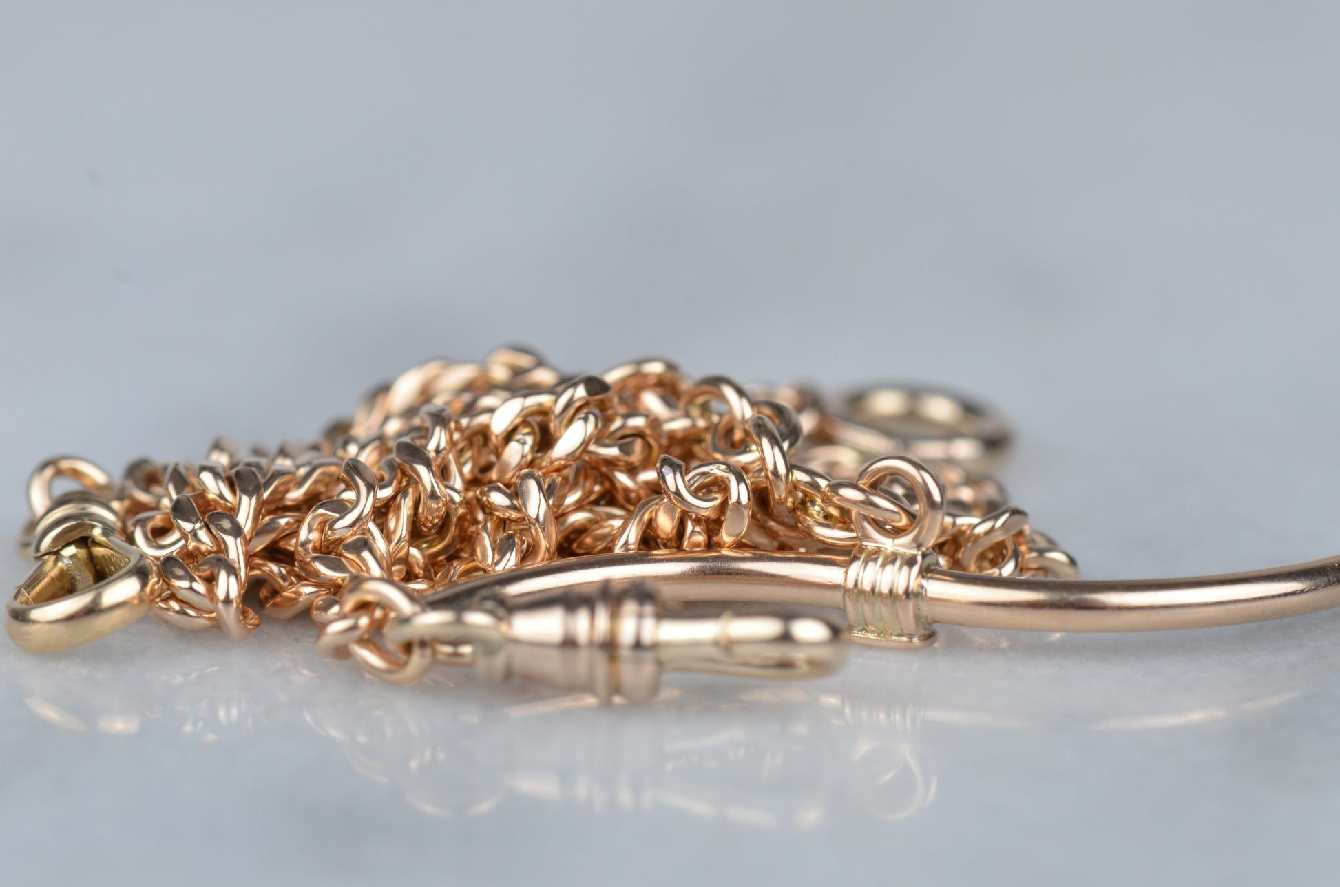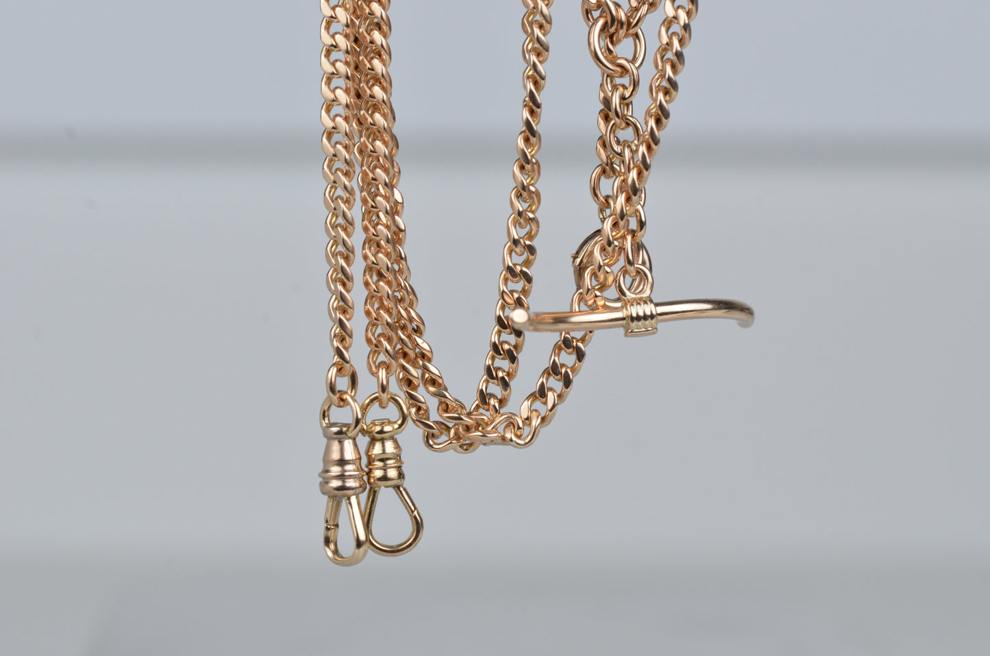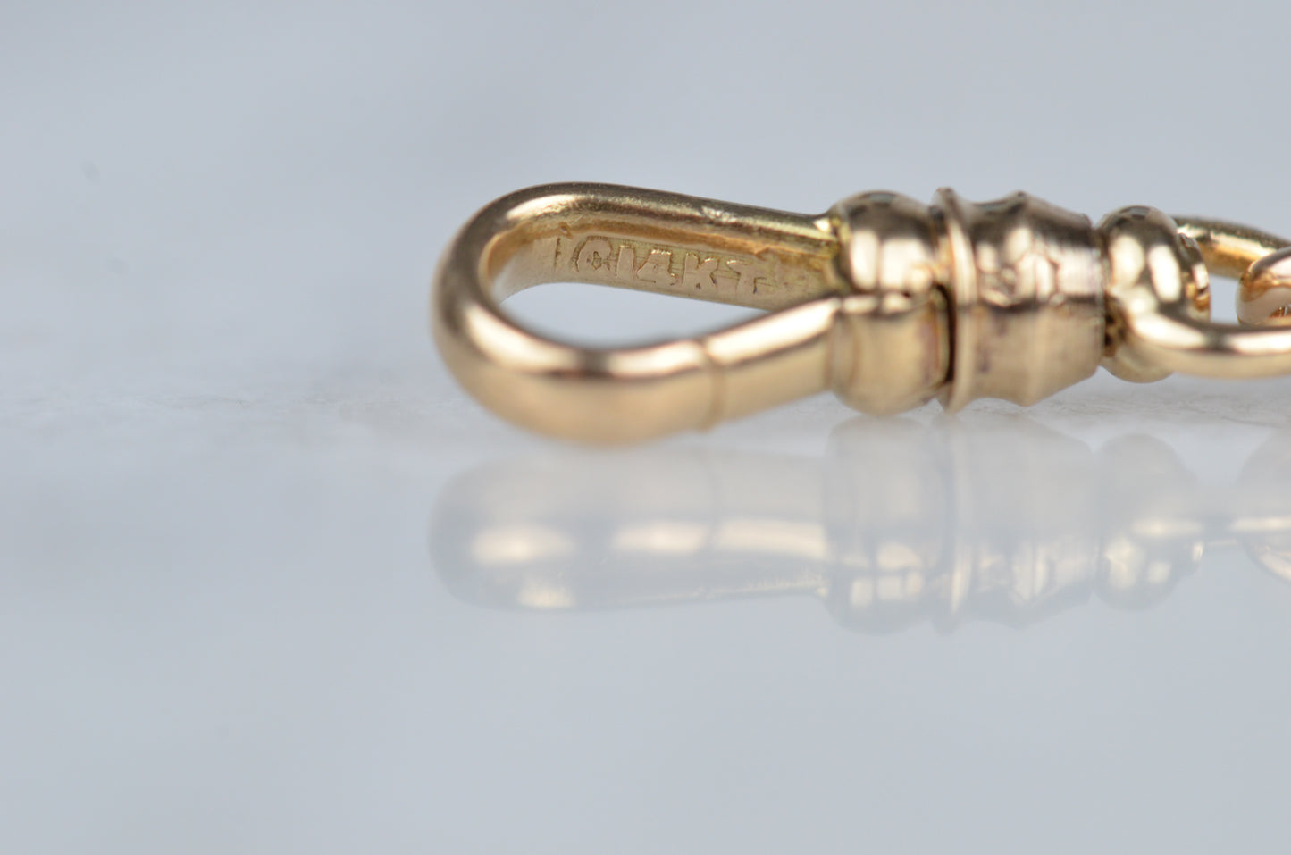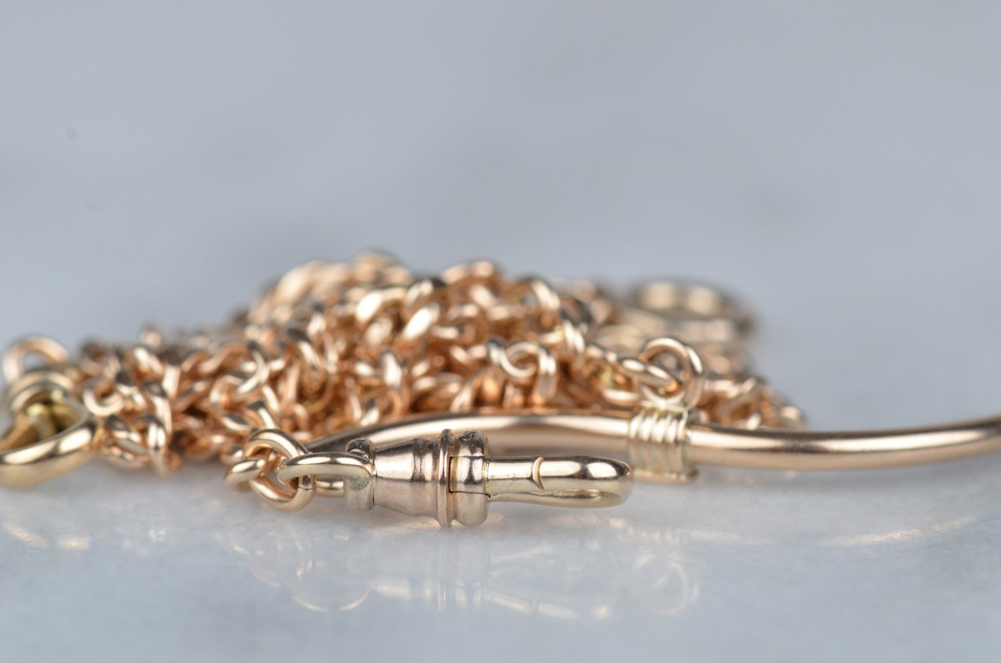 A gorgeous gold watch chain - in harder to find yellow gold - is among the most versatile pieces you can add to your collection. In its traditional style, the t-bar would slip easily through a button hole on a vest or a top, and at either end a dog clip closure makes for an easy way to attach a pocket watch, a fob, or any selection of tools or charms. Give it a modern twist by wrapping it around your wrist, or by wearing it as a necklace with either the t-bar or clasps hanging from your collarbone. Easily add charms alone or in groups, or add your favourite split ring full of them.