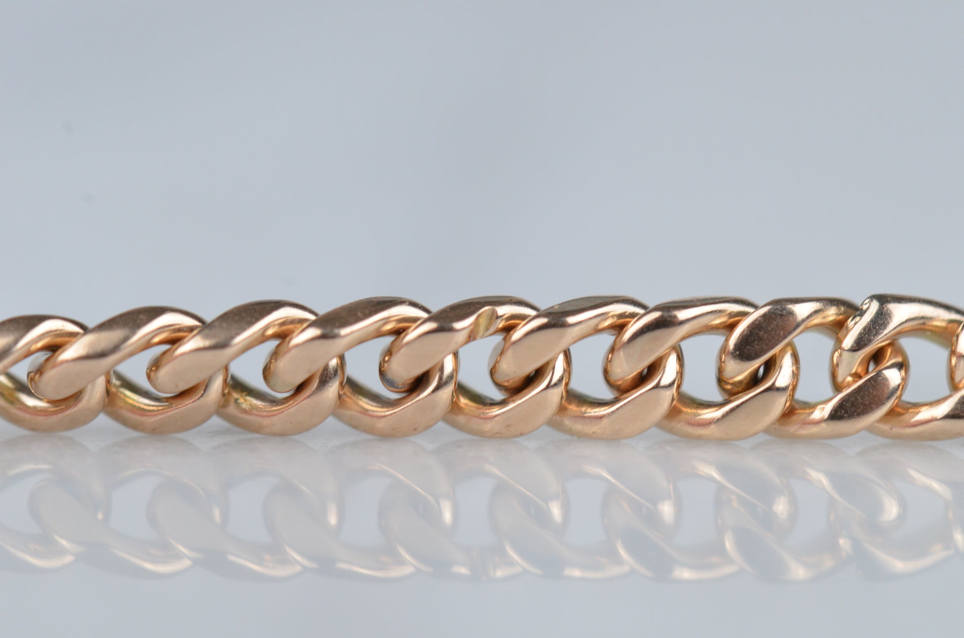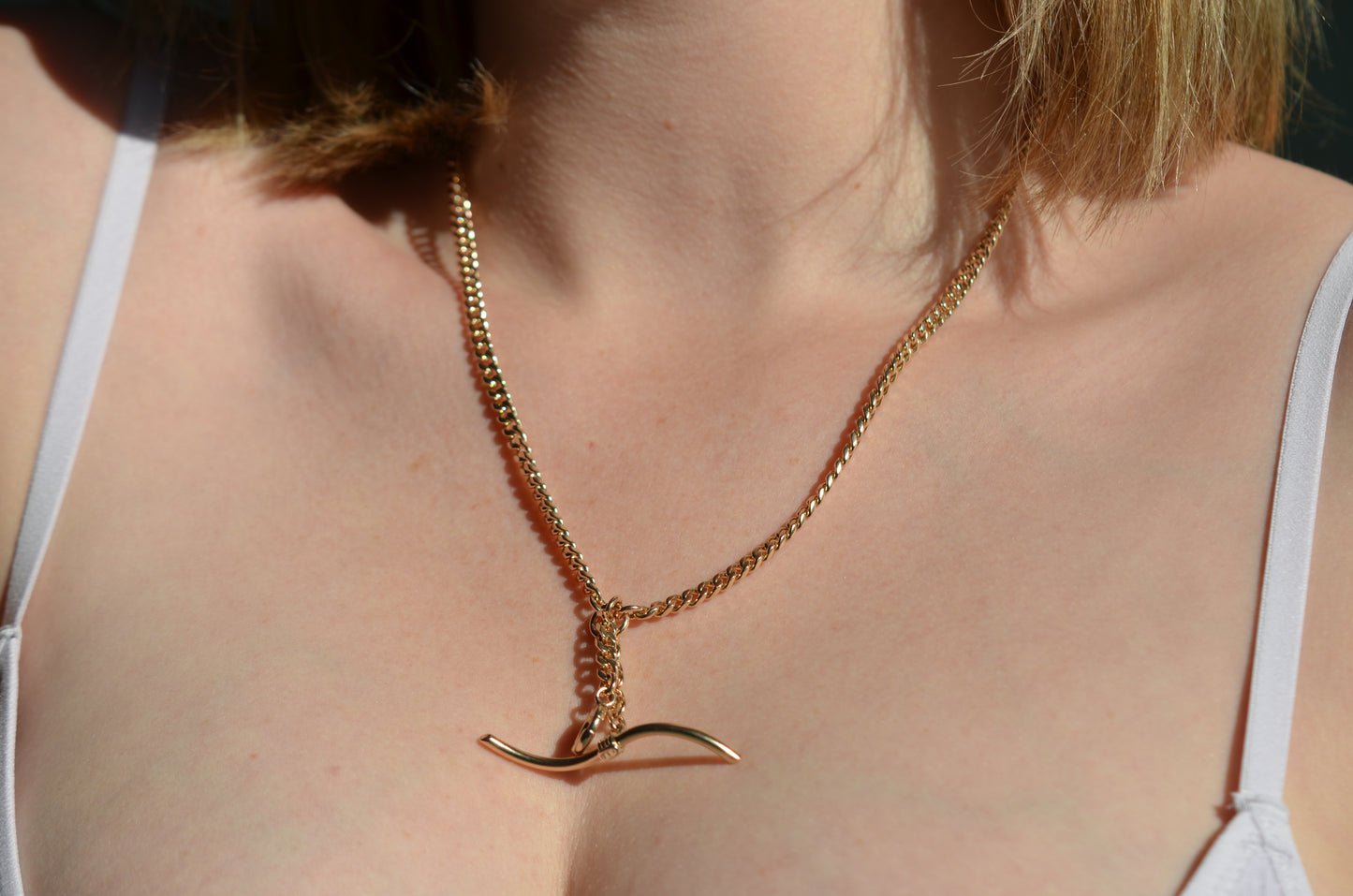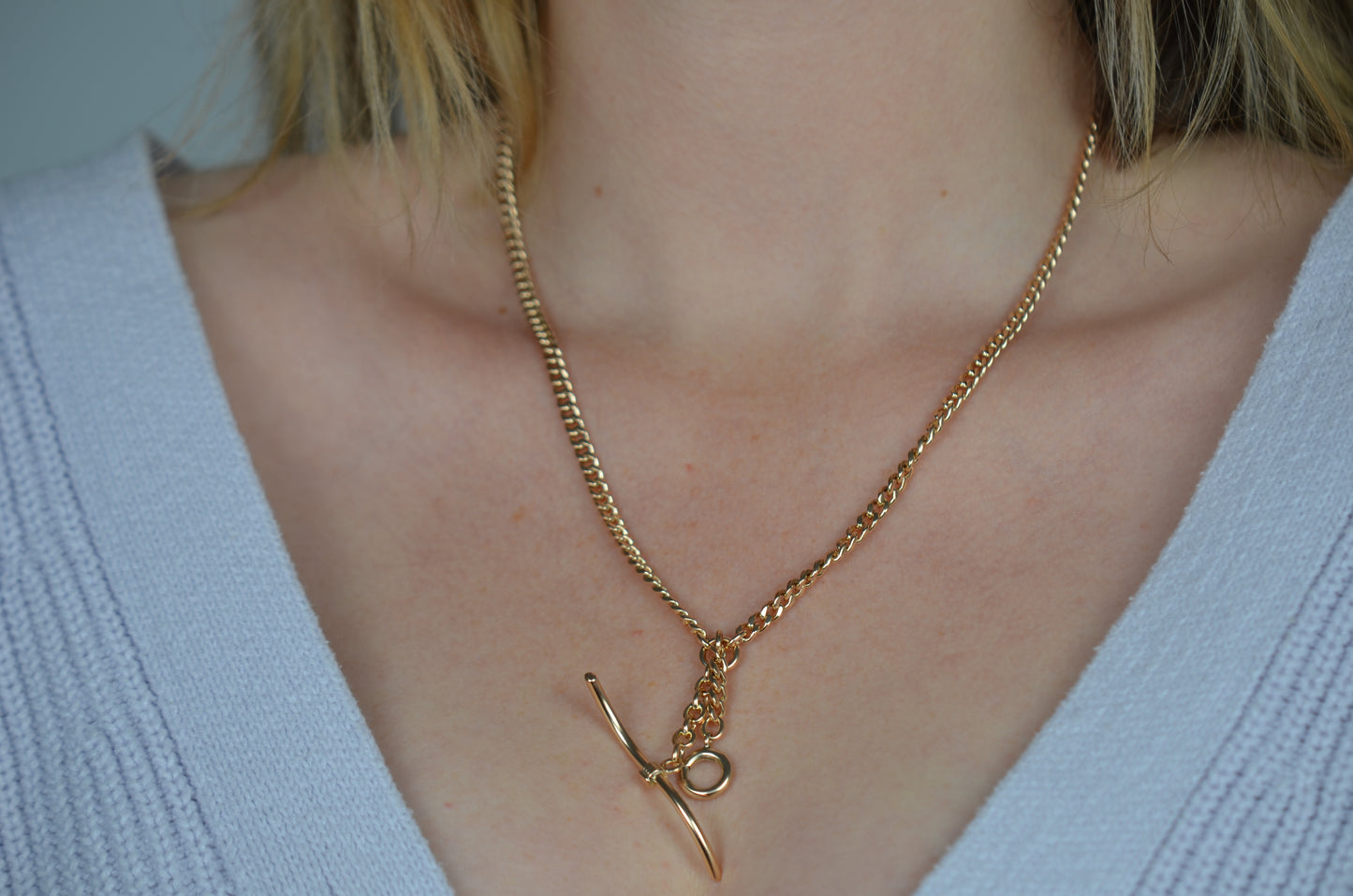 The chain is a sweet, slightly flattened curb link style with a bright finish; the t-bar's swooping serpentine shape adds depth and interest, and the bonus bolt ring in centre makes it easy to add charms there or at the ends. Not only is it difficult to find these coveted chains in lengths long enough to wear as necklaces, the higher karat than the typical 9k means this chain is much more yellow than rose.