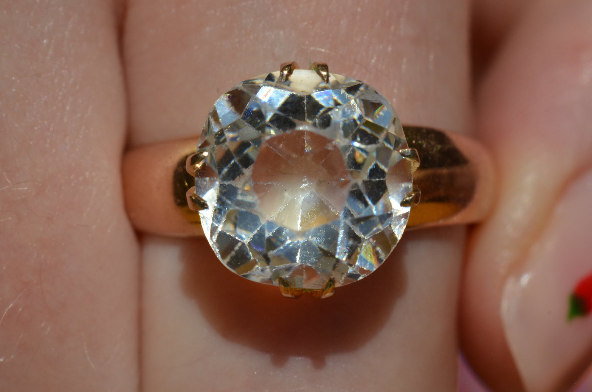 • Size 12 1/8 and can be resized within two sizes (note that culet of stone drops below ring gallery into finger hole)