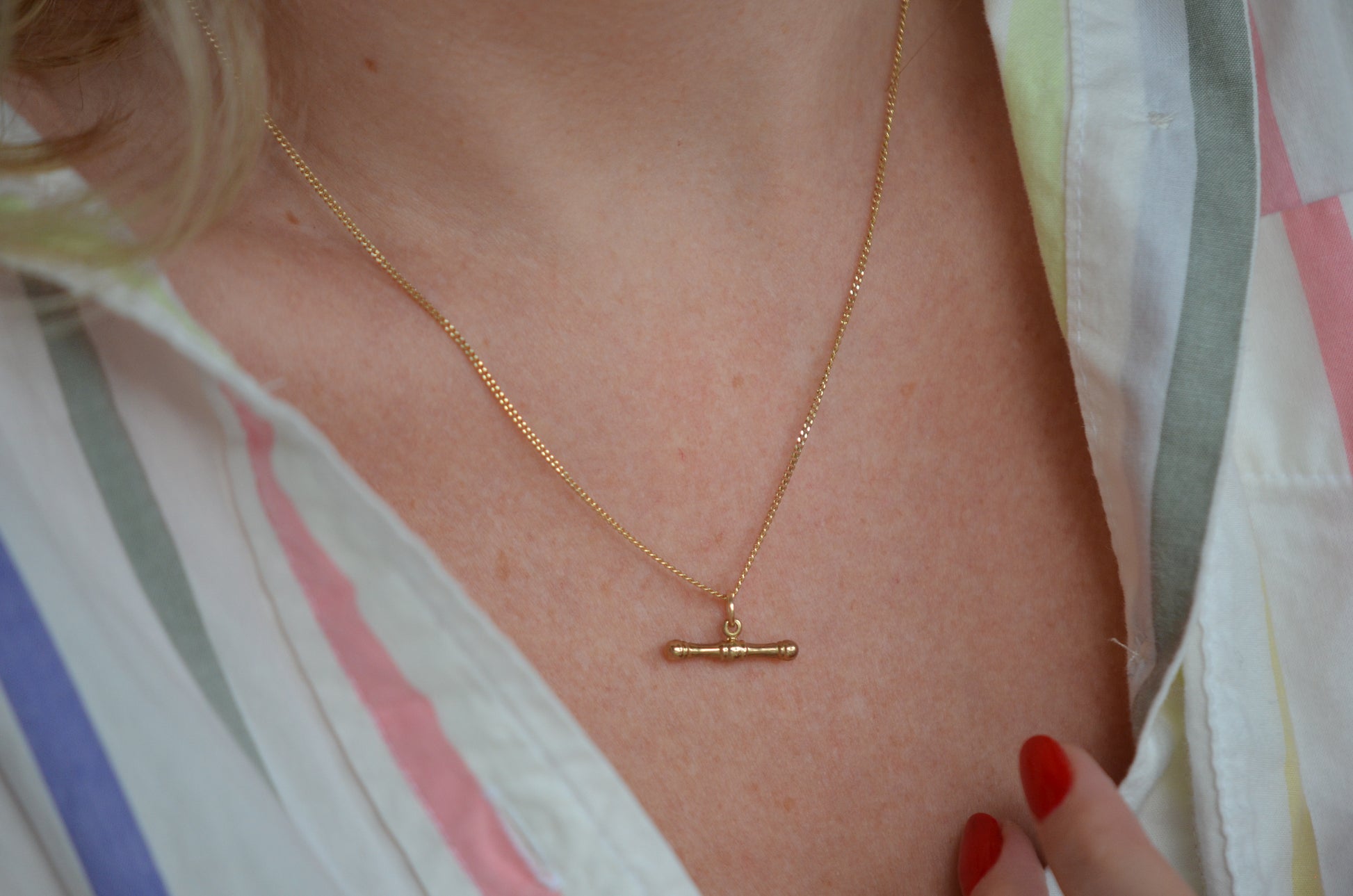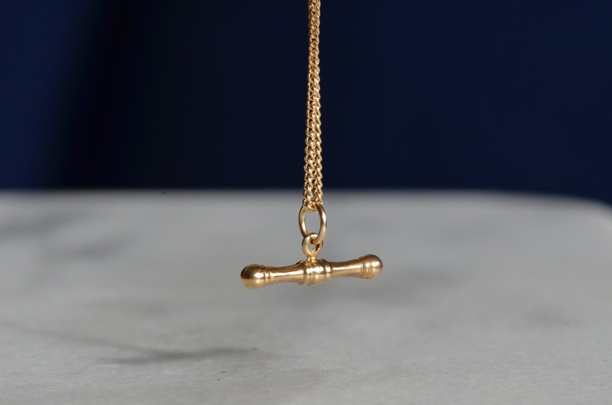 A charming component inspired by antique watch chains, the T bar was an integral piece of the chains, sliding through the buttonhole of a vest to anchor the chain, whether the watch or fob was in the pocket or out. Beloved dangling on necks and wrists as these chains began to be repurposed, this freestanding bar allows you to add a little vintage flair to your charm jumble.
