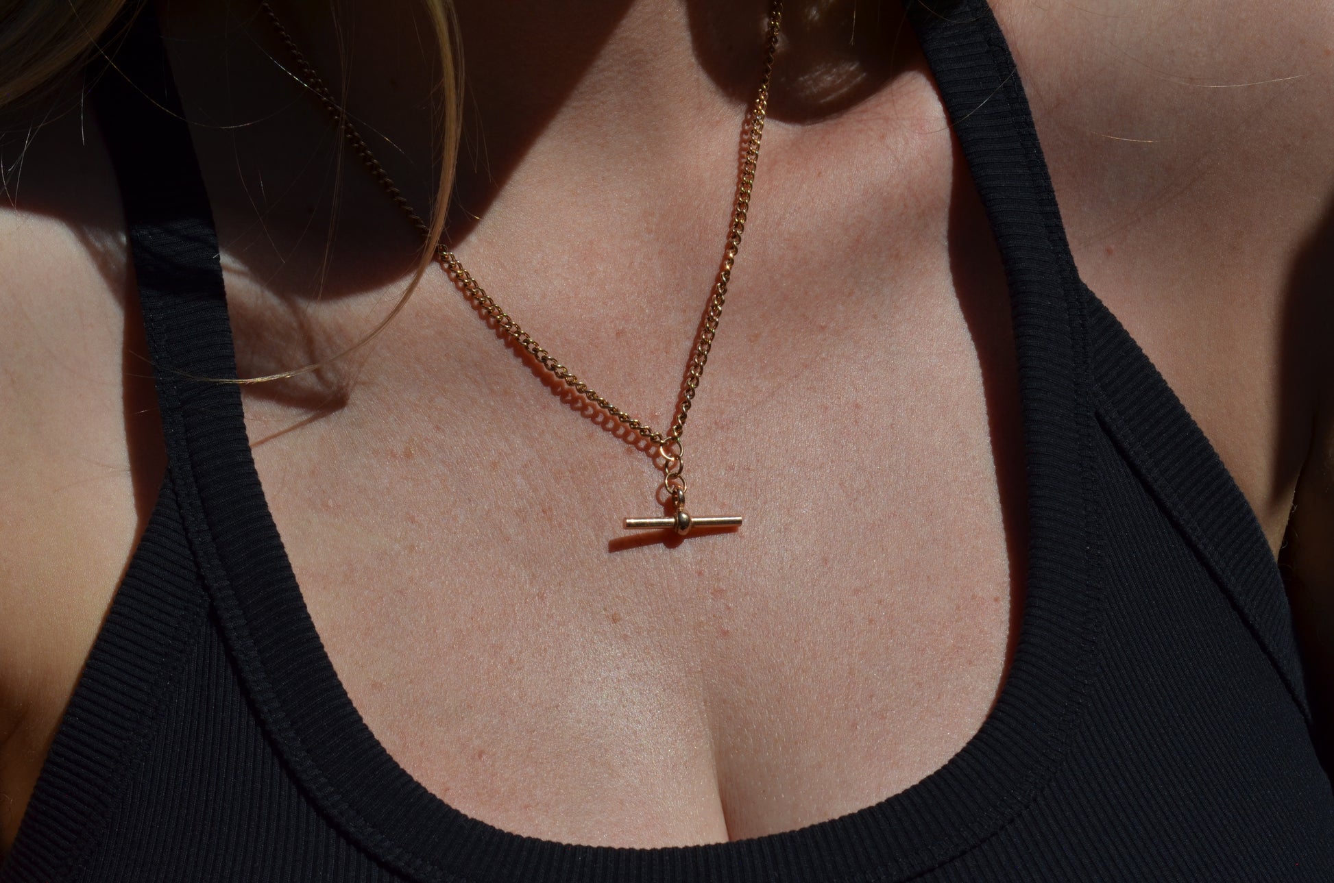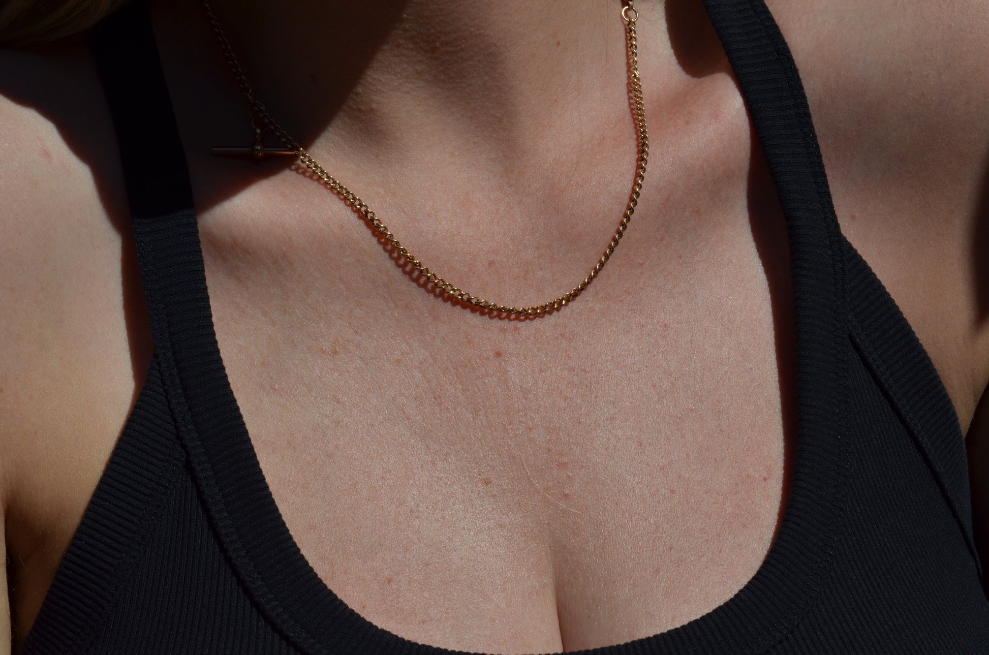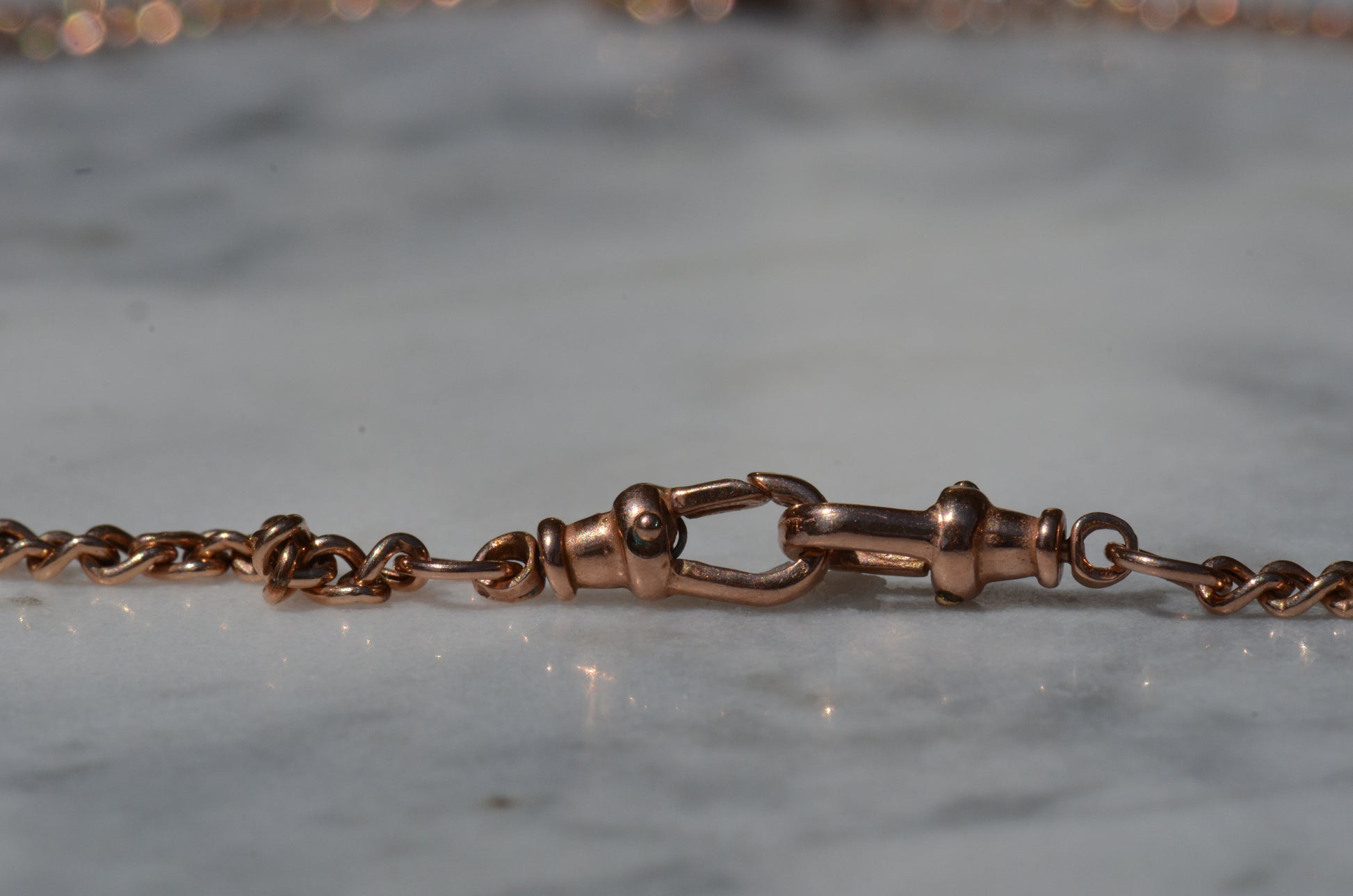 A gorgeous antique-inspired double Albert chain, these are a challenge to find in lengths long enough to wear as necklaces. Originally intended for use as watch chains, the t-bar was meant to slide through a vest's buttonhole to anchor the chain, while dogclips at either end were used to secure pocket watches, fobs, keys and the like. While they can certainly still be worn in this way today, we also love to use them as necklaces now - the dogclips perfect to attach charms alone or on a charm ring.