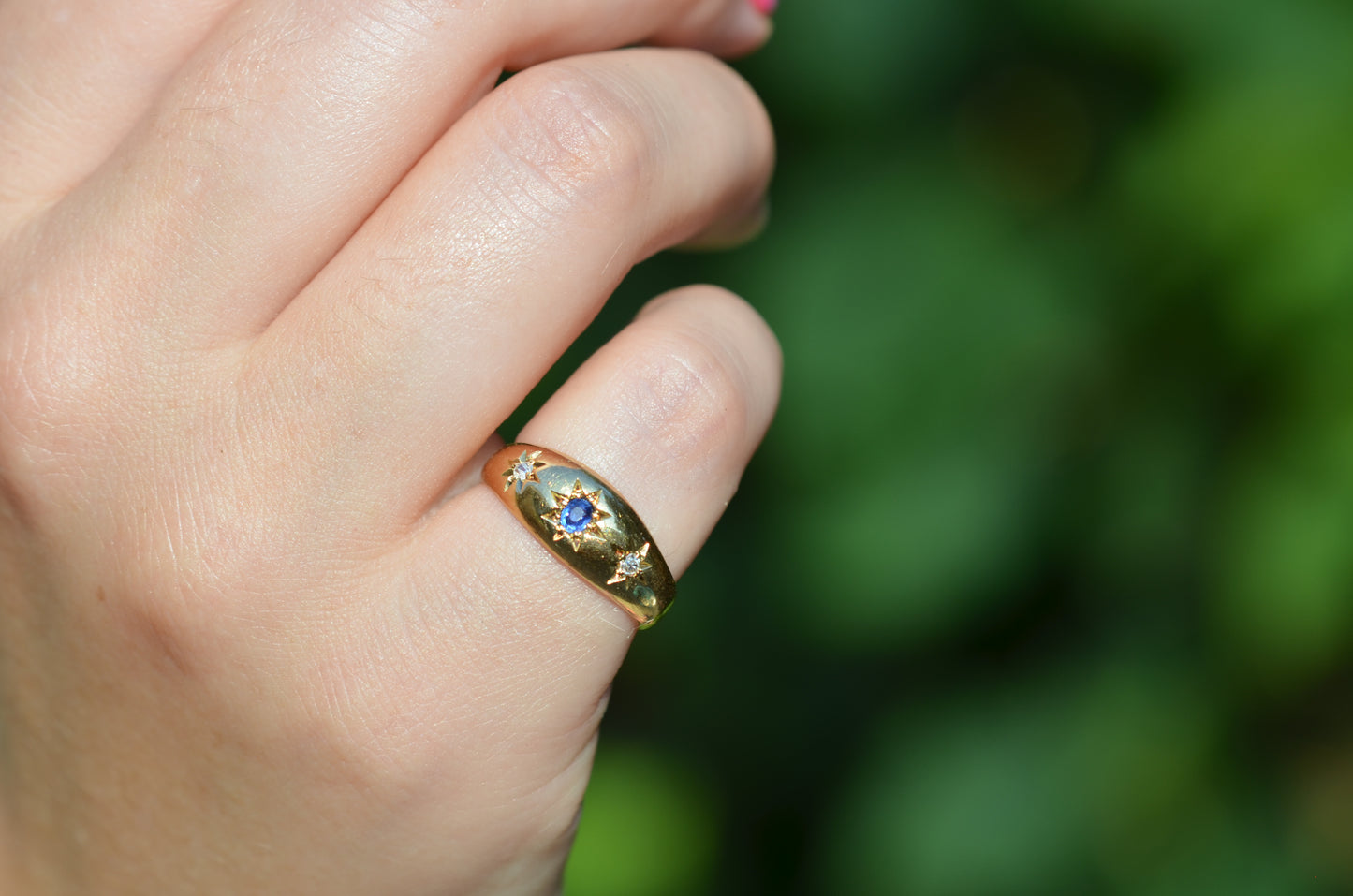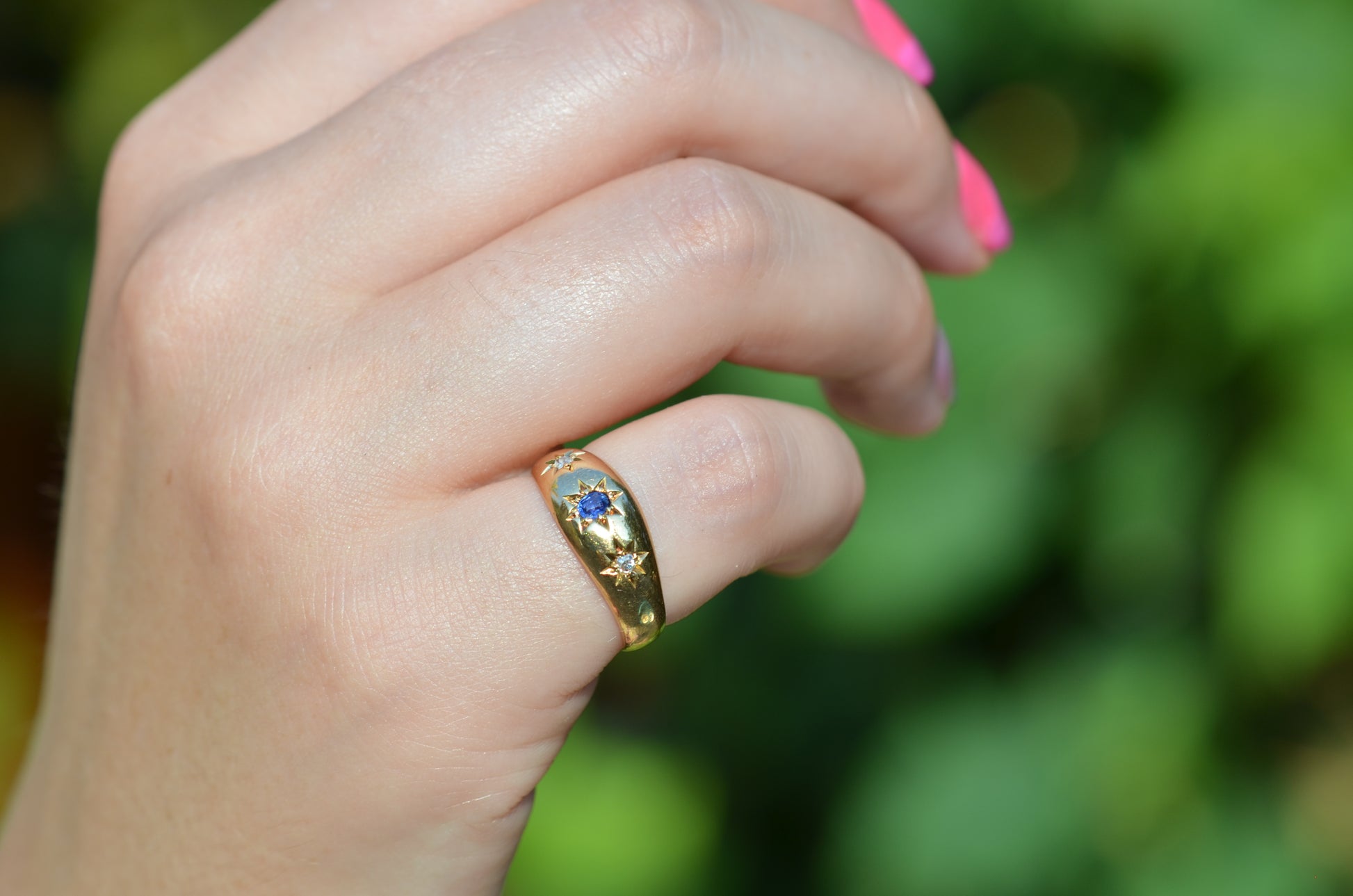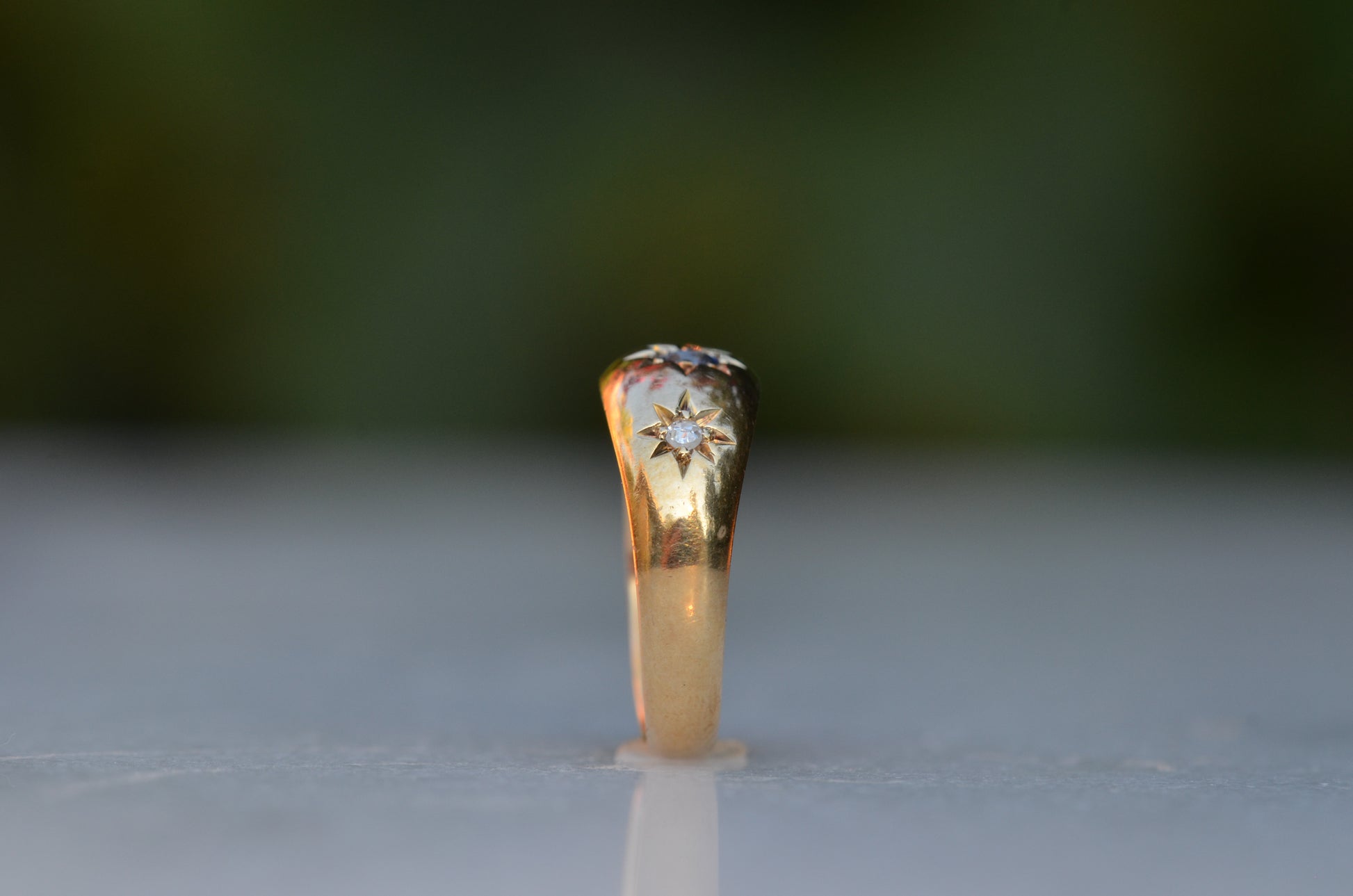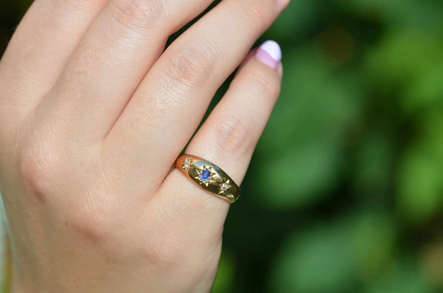 A classic Victorian piece, this style is among our most popular finds: three crisp and lively gemstones set flush into a broad band of gold, enhanced by the rays engraved into a star setting. Low rise with clean edges, this ring is ultra wearable and comfortable, and easy to pair with other pieces or wear alone. Substantial and sturdy construction will make this a mainstay in your rotation.