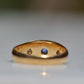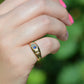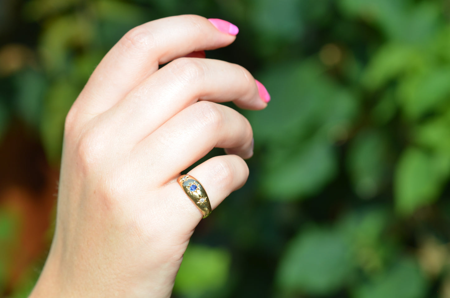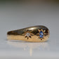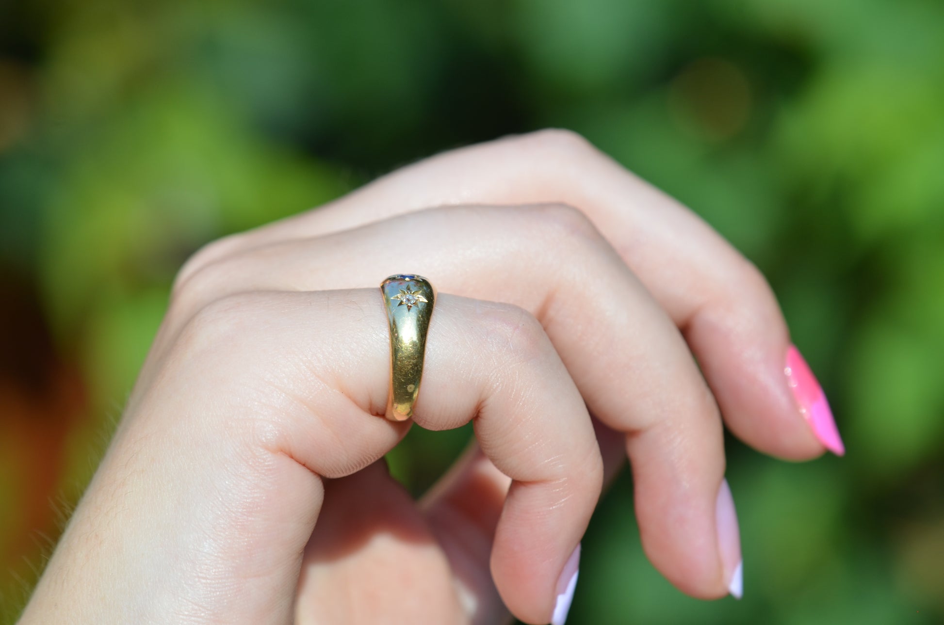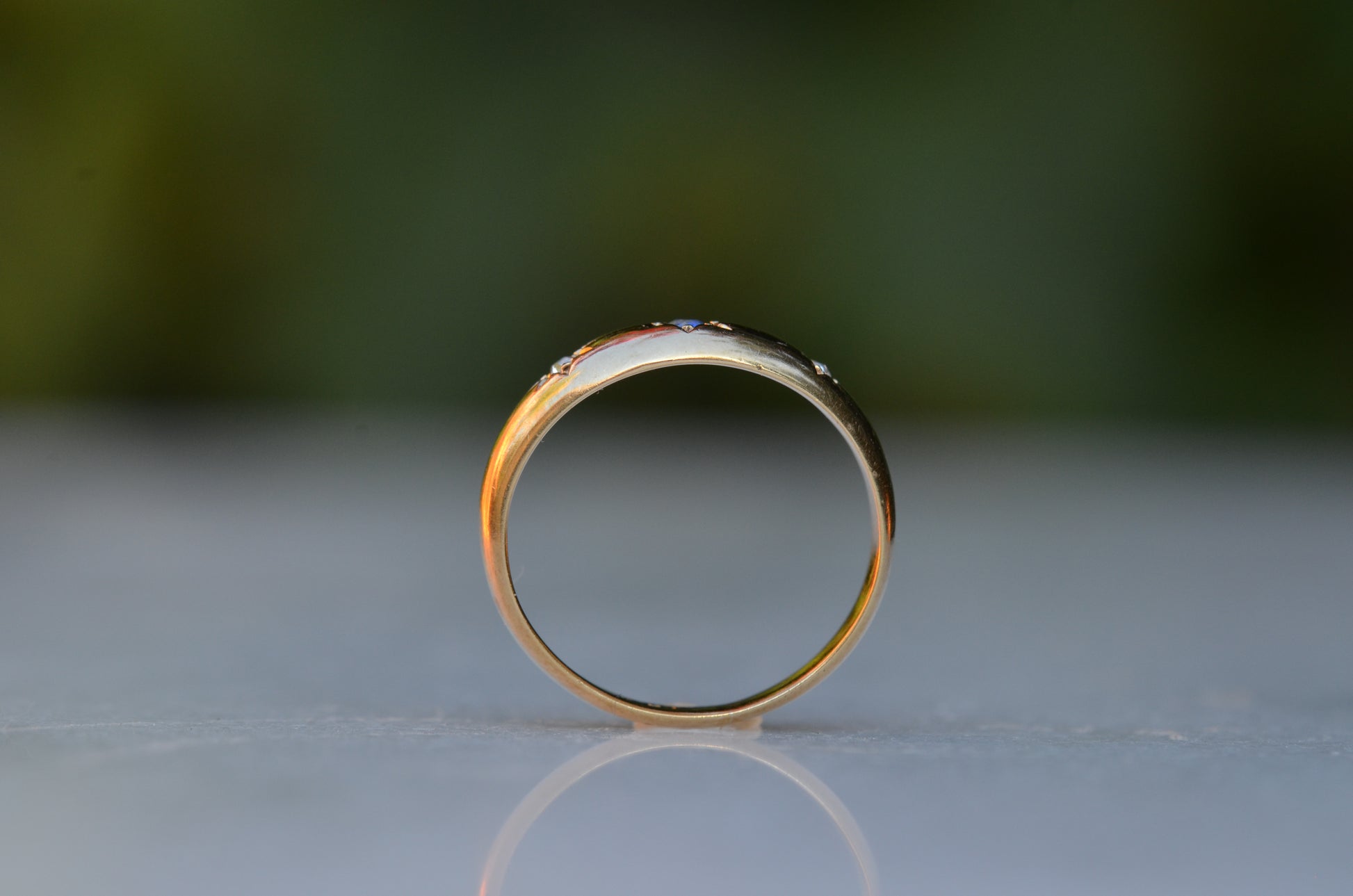 A classic Victorian piece, this style is among our most popular finds: three crisp and lively gemstones set flush into a broad band of gold, enhanced by the rays engraved into a star setting. Low rise with clean edges, this ring is ultra wearable and comfortable, and easy to pair with other pieces or wear alone. Substantial and sturdy construction will make this a mainstay in your rotation.