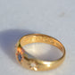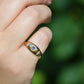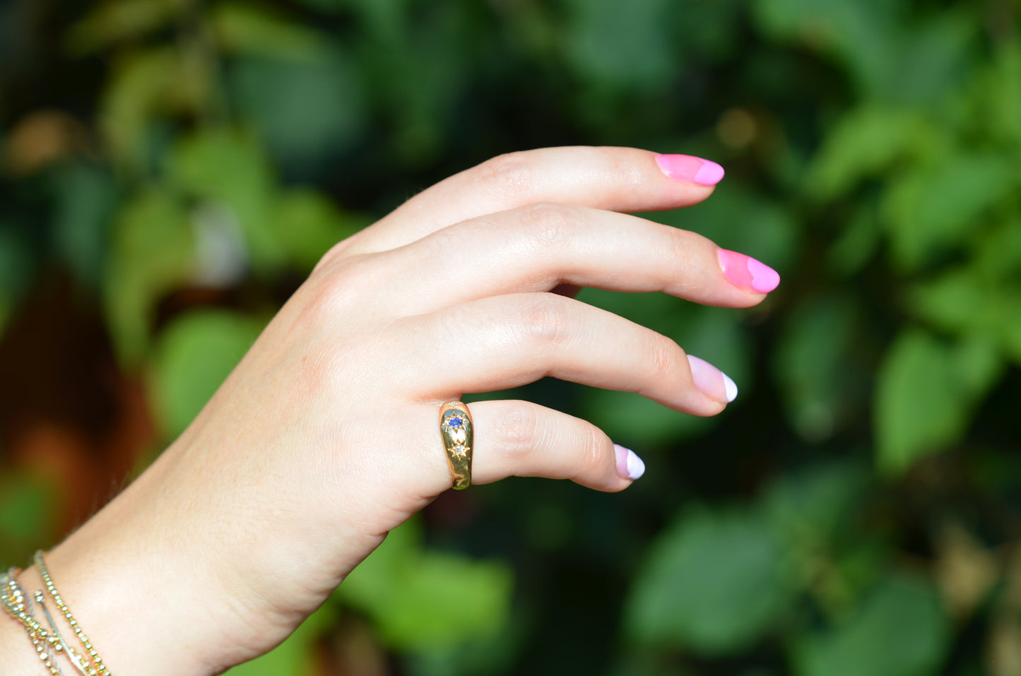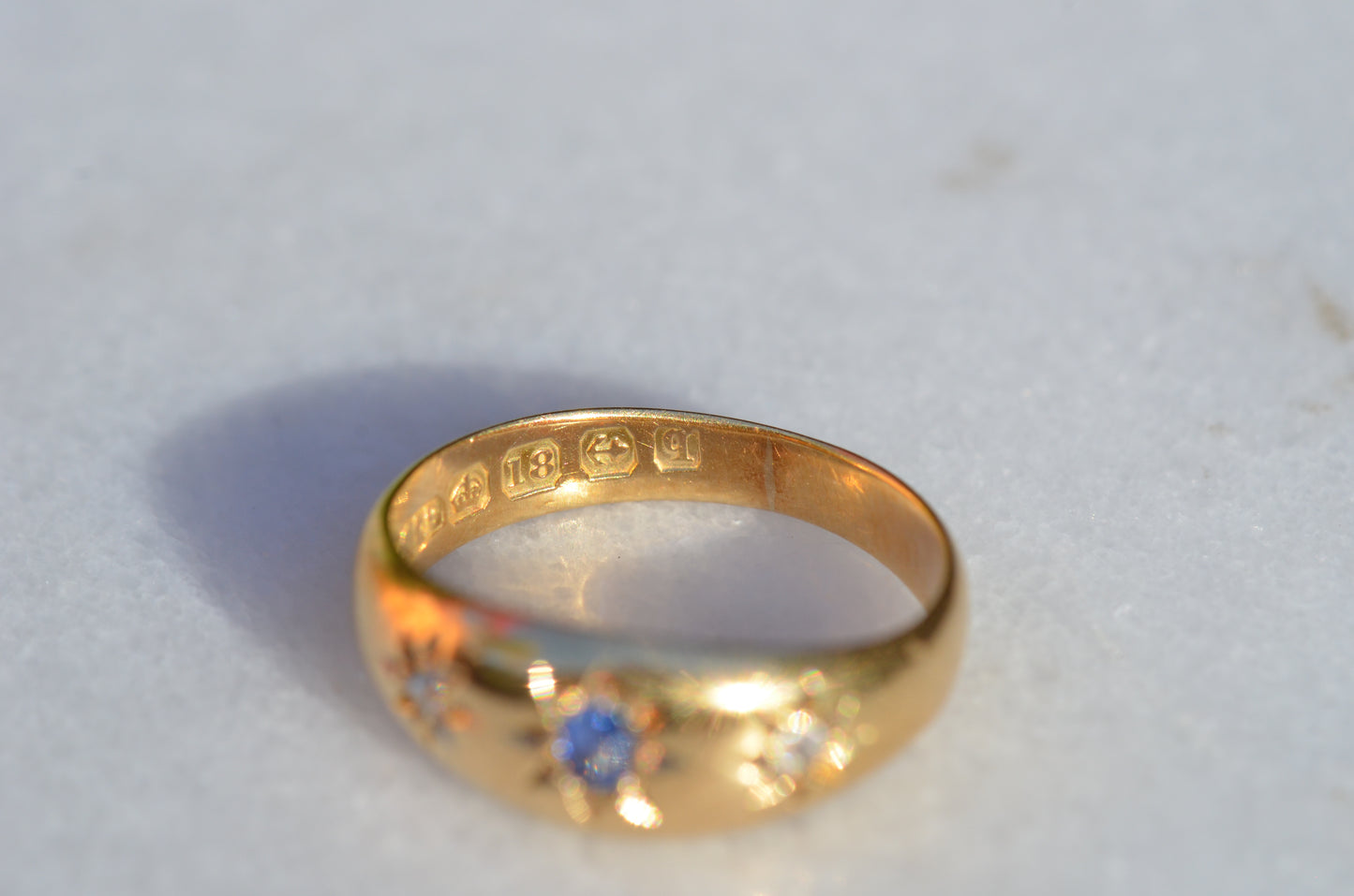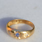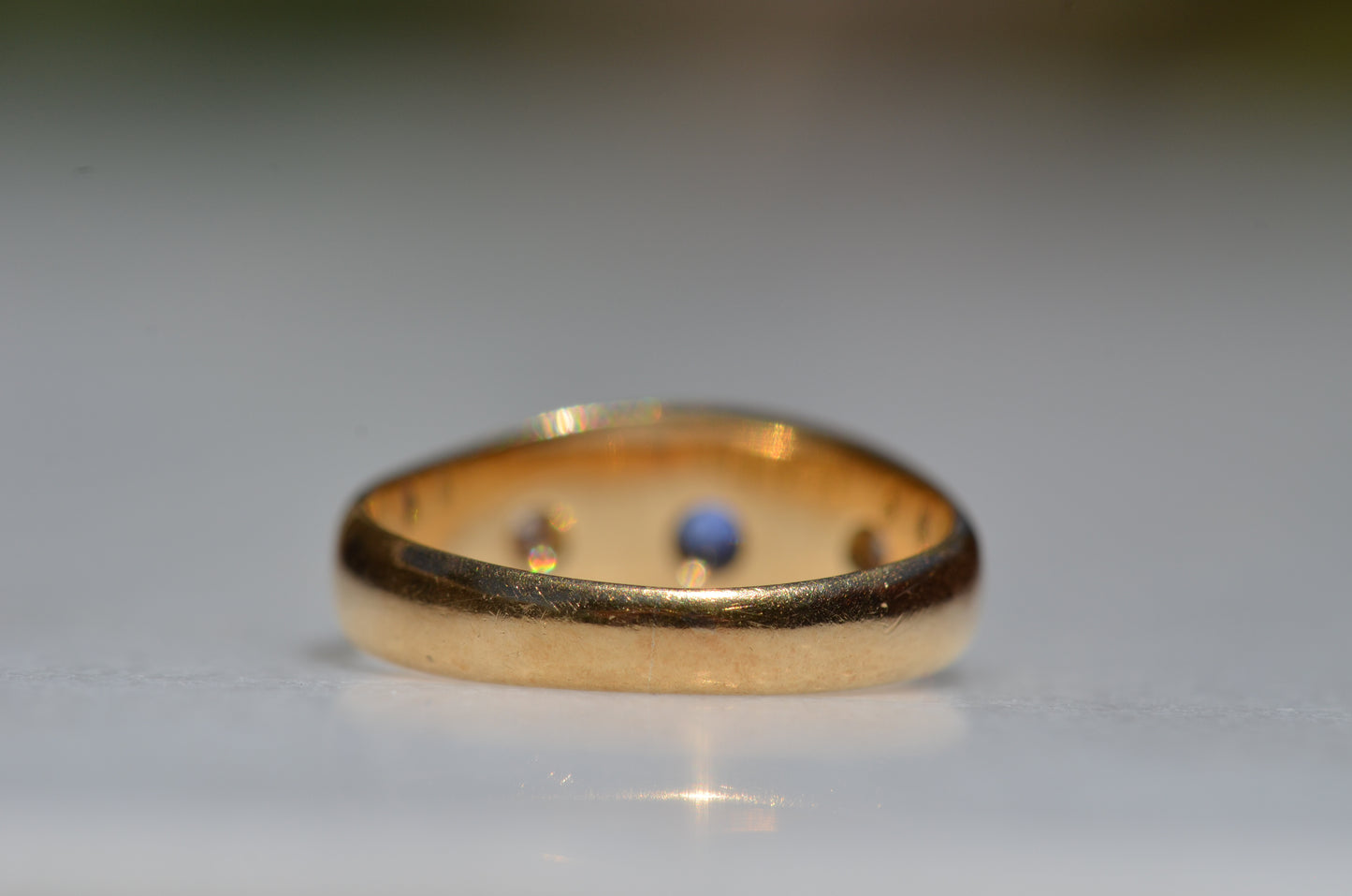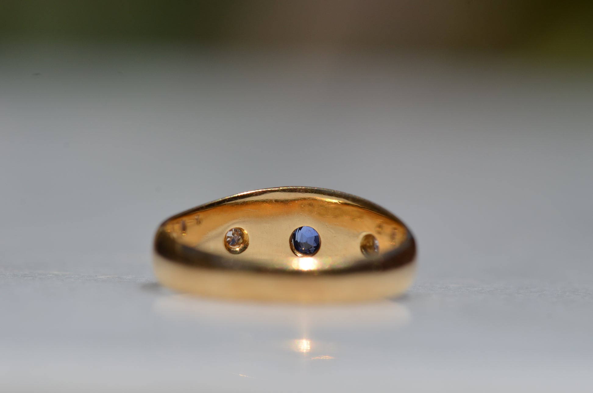 A classic Victorian piece, this style is among our most popular finds: three crisp and lively gemstones set flush into a broad band of gold, enhanced by the rays engraved into a star setting. Low rise with clean edges, this ring is ultra wearable and comfortable, and easy to pair with other pieces or wear alone. Substantial and sturdy construction will make this a mainstay in your rotation.