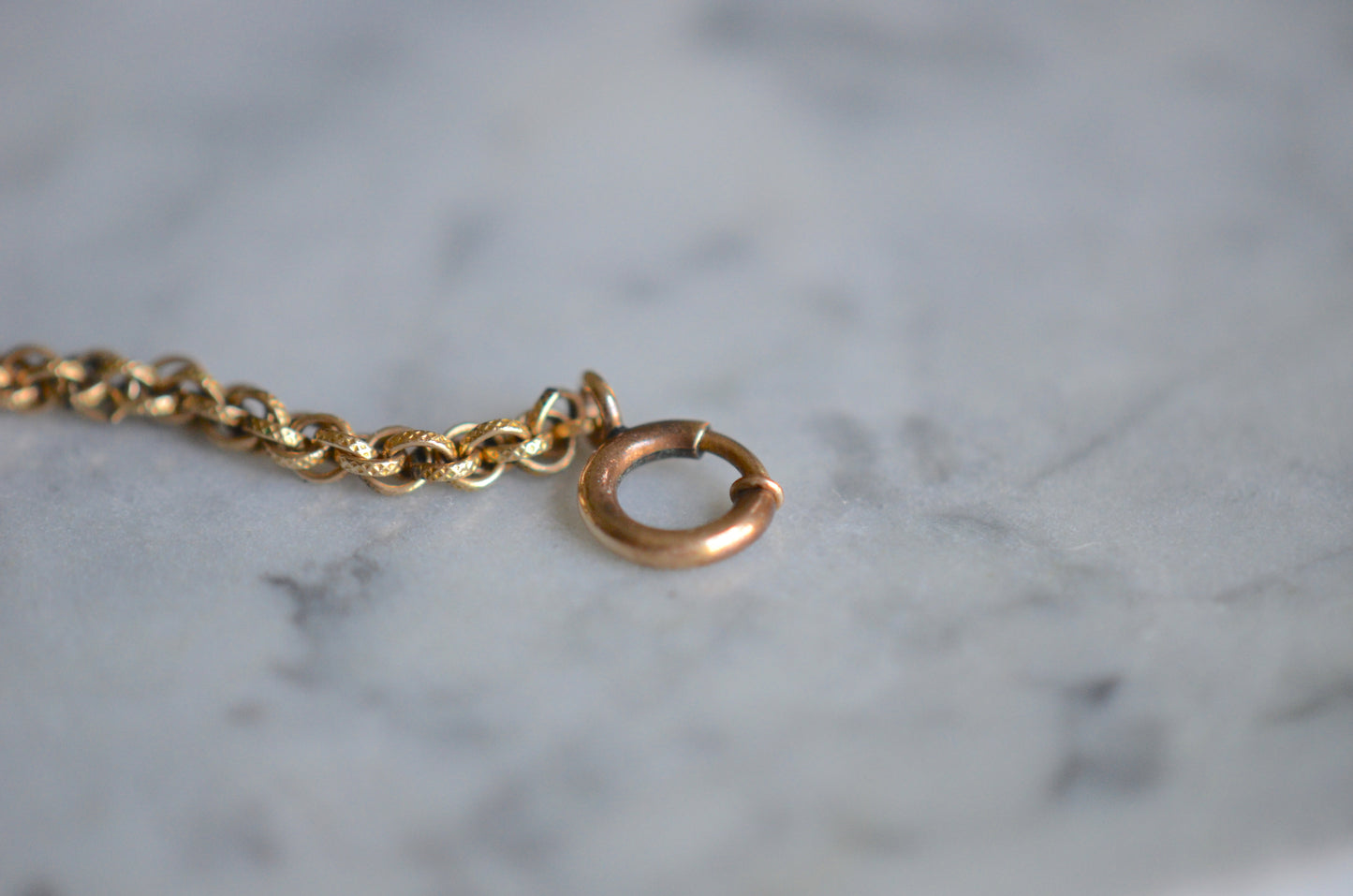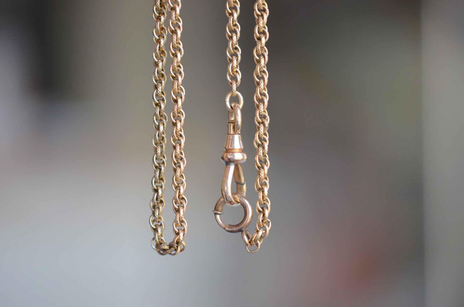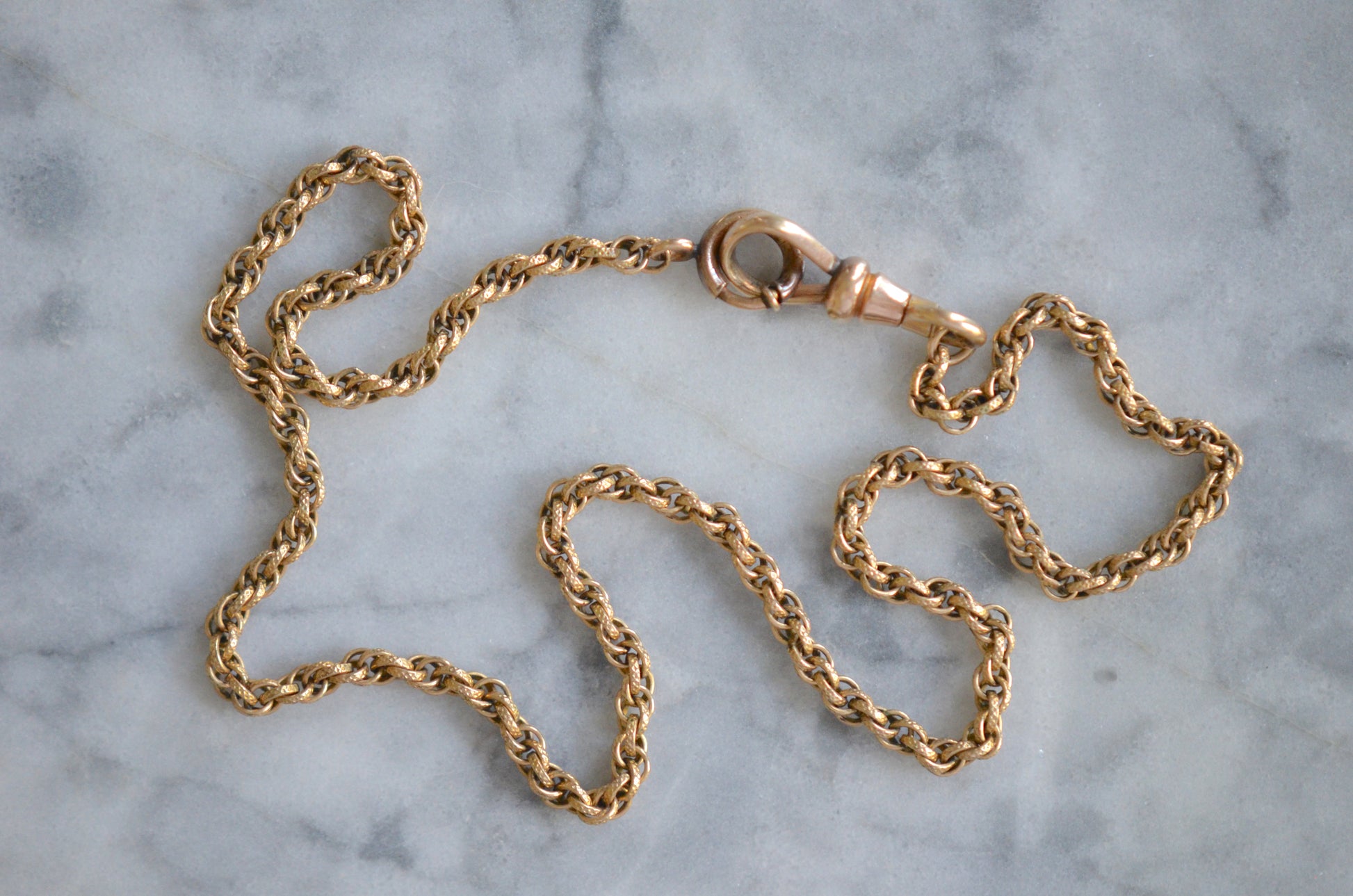 The chain itself is rather fancy - textured links are multiply looped, creating a cascading twist like a modern Singapore chain; there is lovely depth to the chain as a result, and along with the patina on the gold fill creates a rich and engaging look. At a length of 13.5", it can easily be worn as a choker, doubled up as a bracelet, or as a chain to hold a pocket watch or charms and fobs as originally intended.