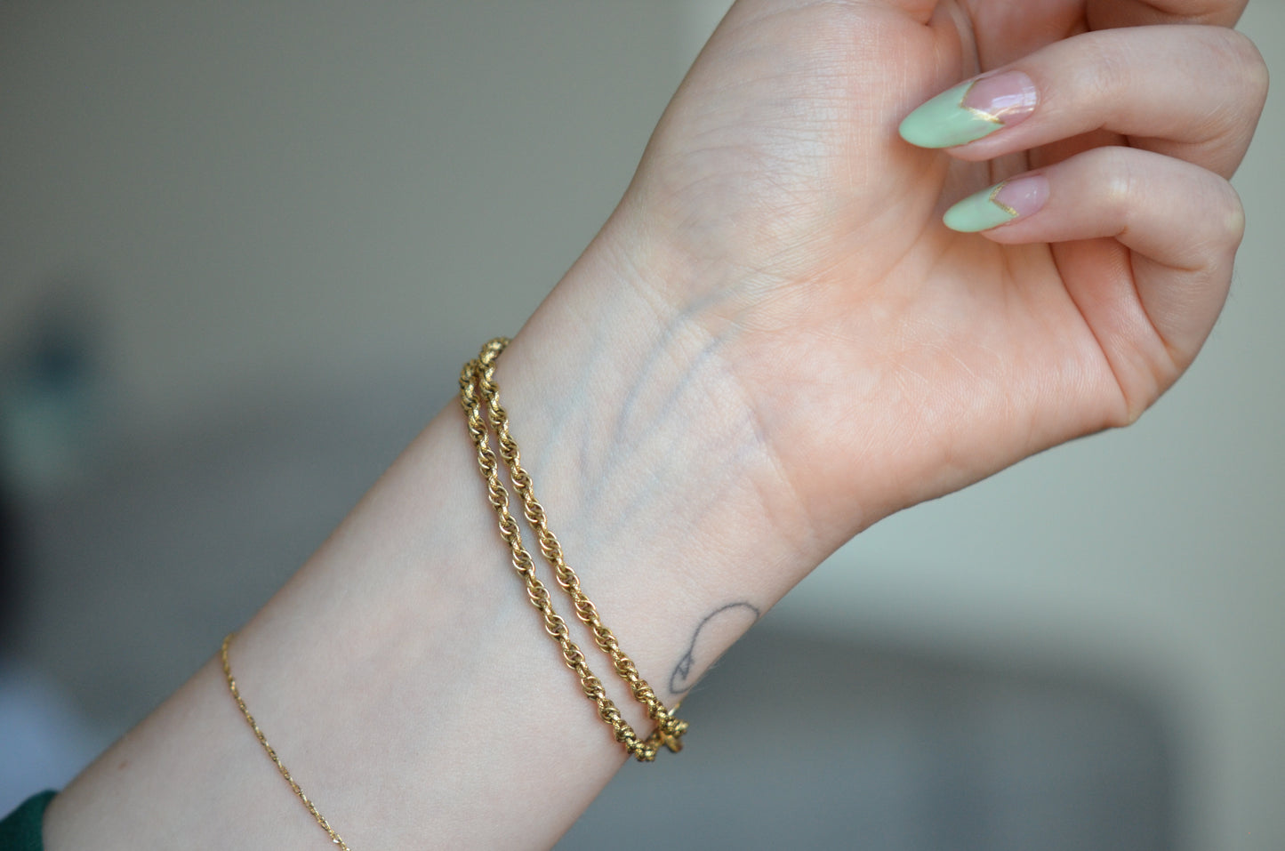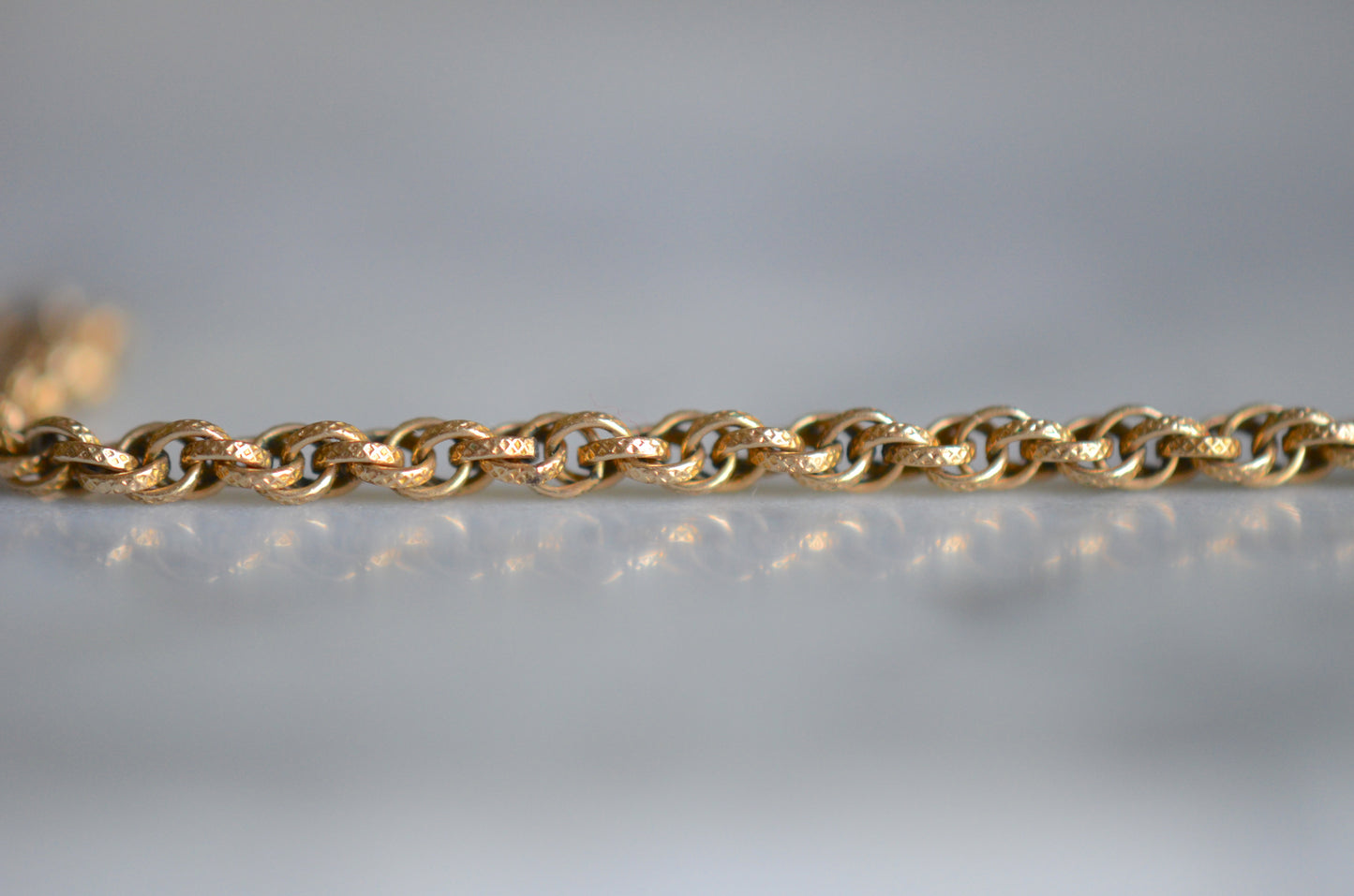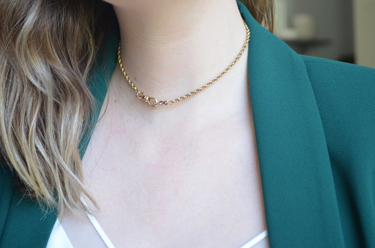 The chain itself is rather fancy - textured links are multiply looped, creating a cascading twist like a modern Singapore chain; there is lovely depth to the chain as a result, and along with the patina on the gold fill creates a rich and engaging look. At a length of 13.5", it can easily be worn as a choker, doubled up as a bracelet, or as a chain to hold a pocket watch or charms and fobs as originally intended.