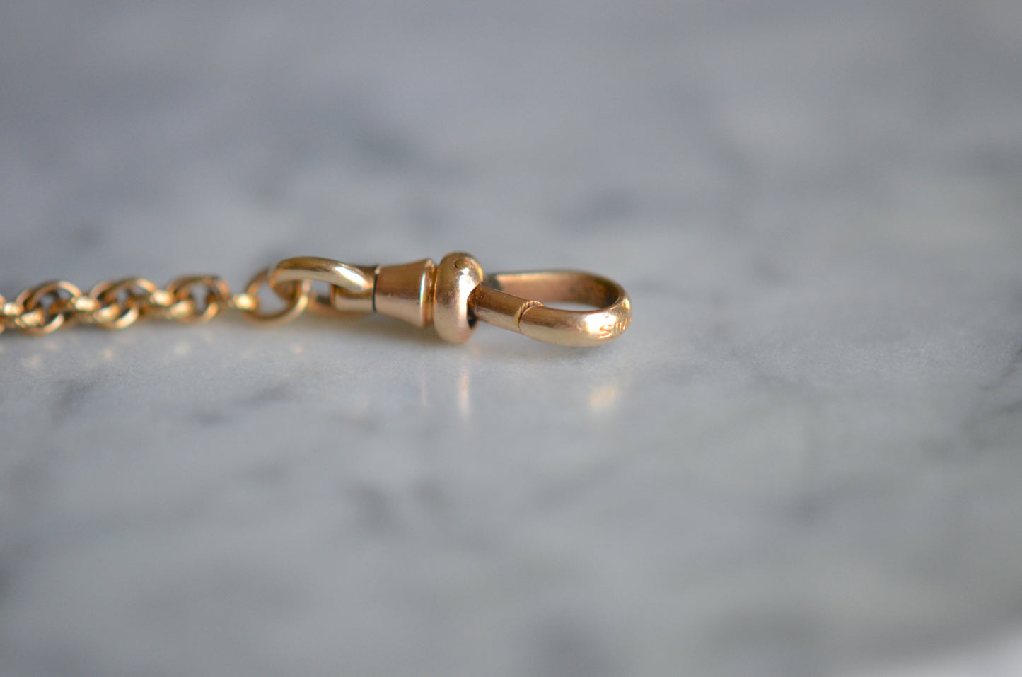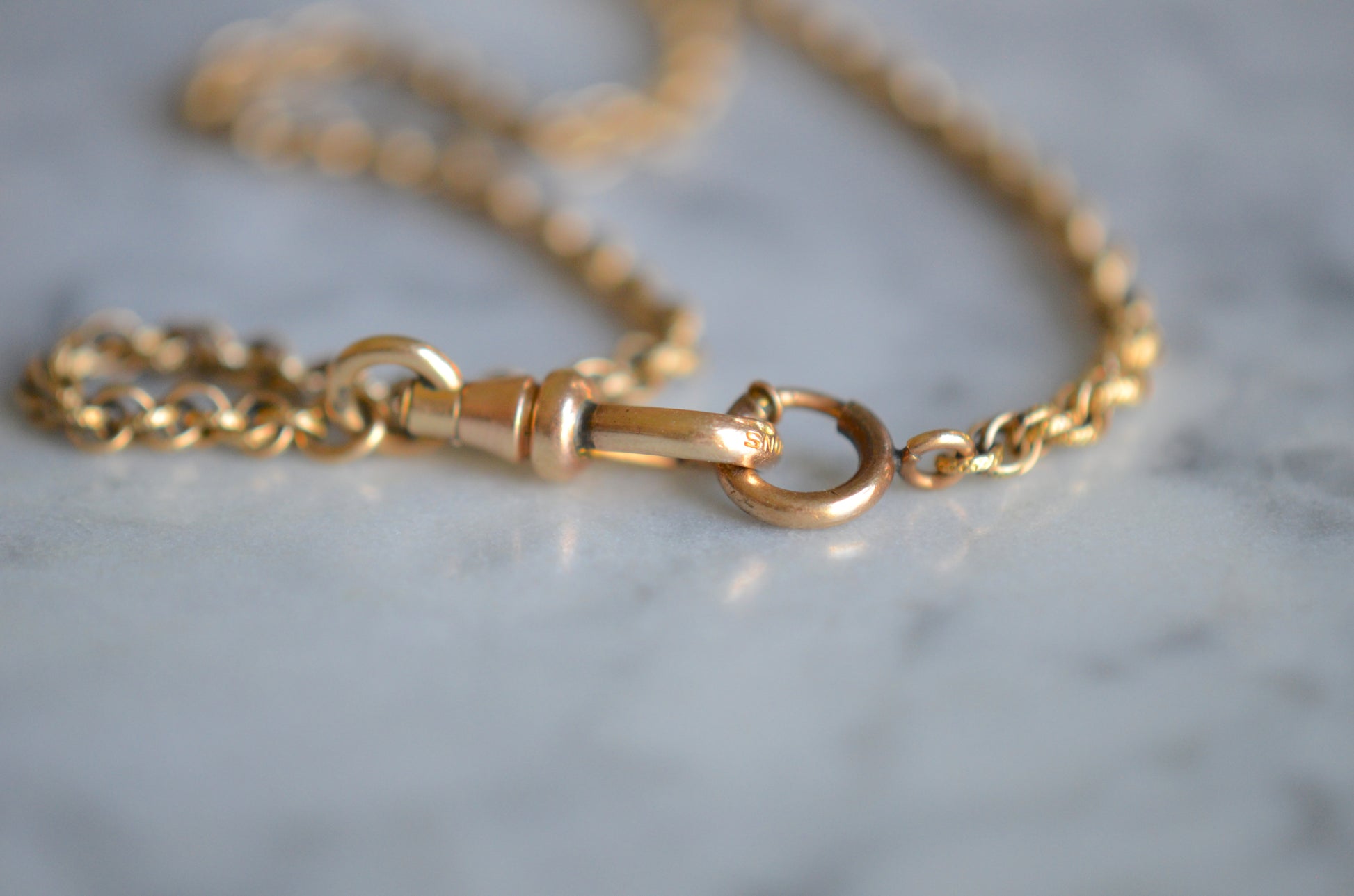 A gorgeous and versatile chain, this piece comes to us from the R. F. Simmons Company, renowned for their chains, and founded in Attleboro, Massachusetts in 1885. Designed as a watch chain, the piece has a dogclip closure at one end and an antique-style spring ring at the other. These older spring rings can be a surprise at first for those only familiar with contemporary ones: there is no little lever to grip, and the portion that locks into the tube is rather short - when using this clasp, you'll want to grip the little ridge and make sure that when you close it, the ring is properly aligned and fully closed.