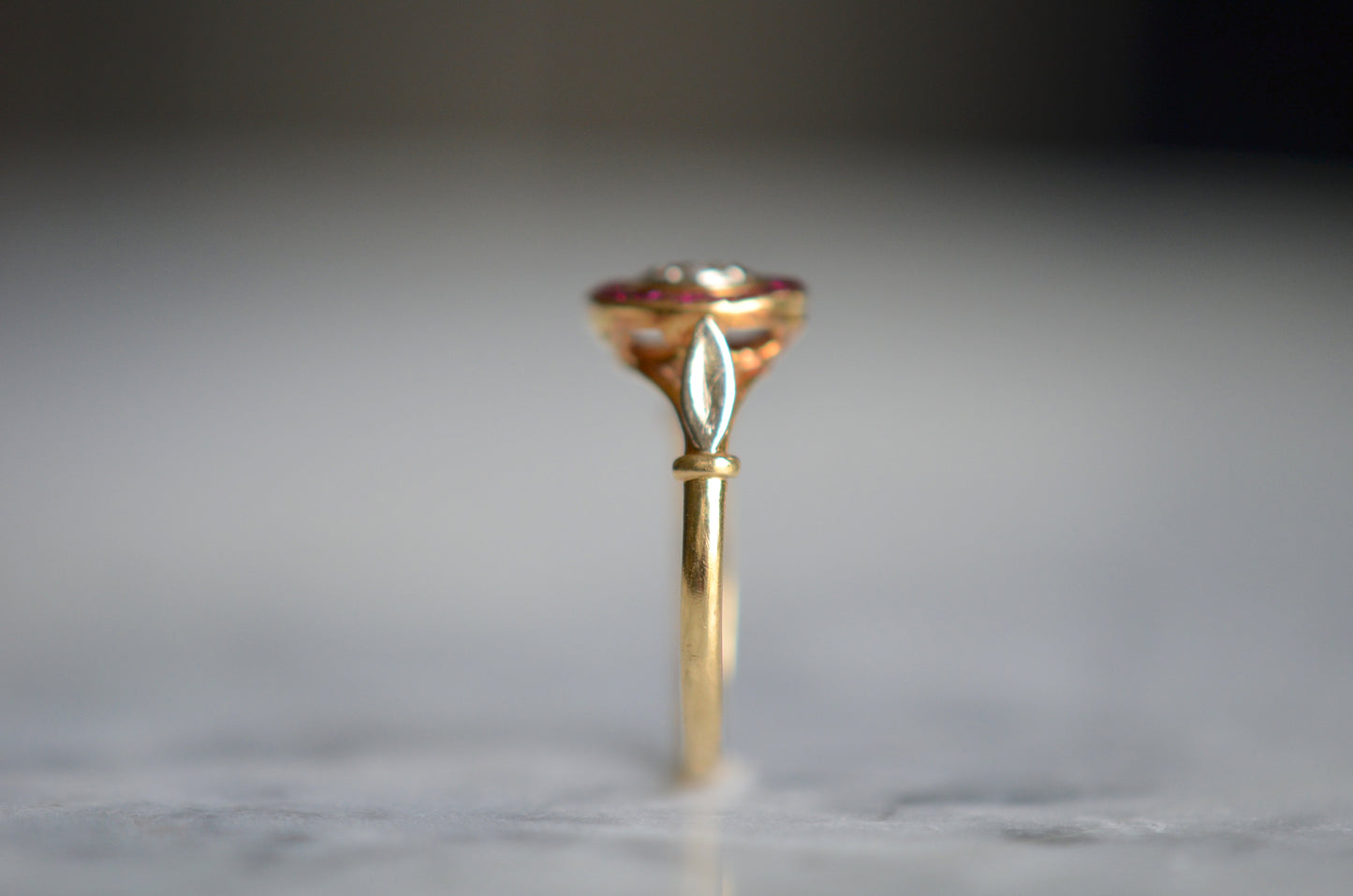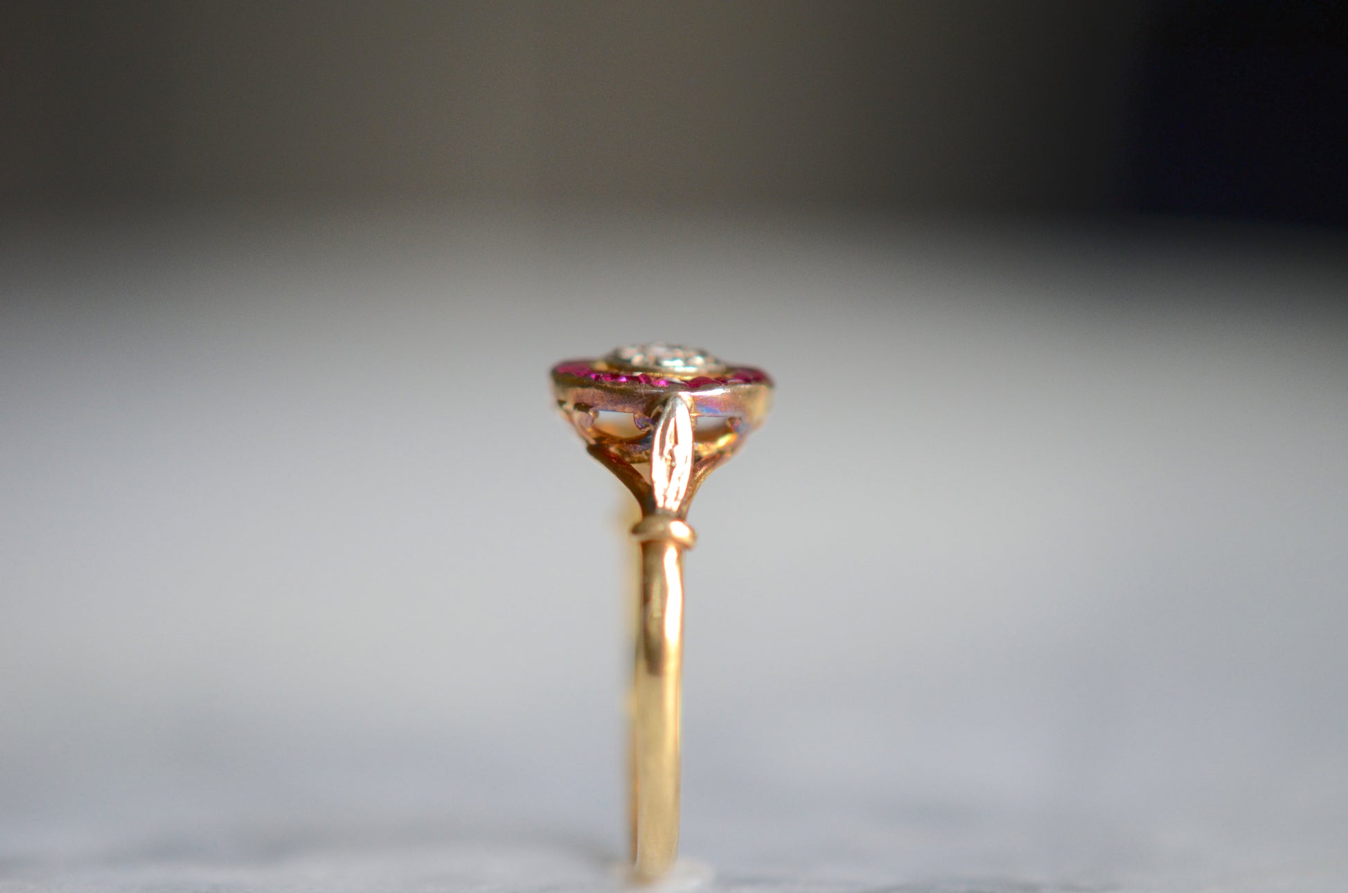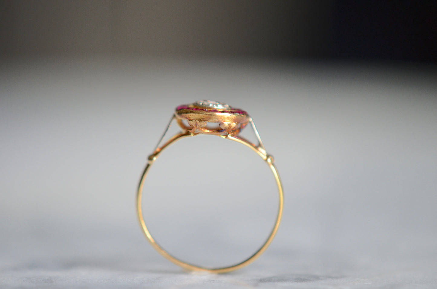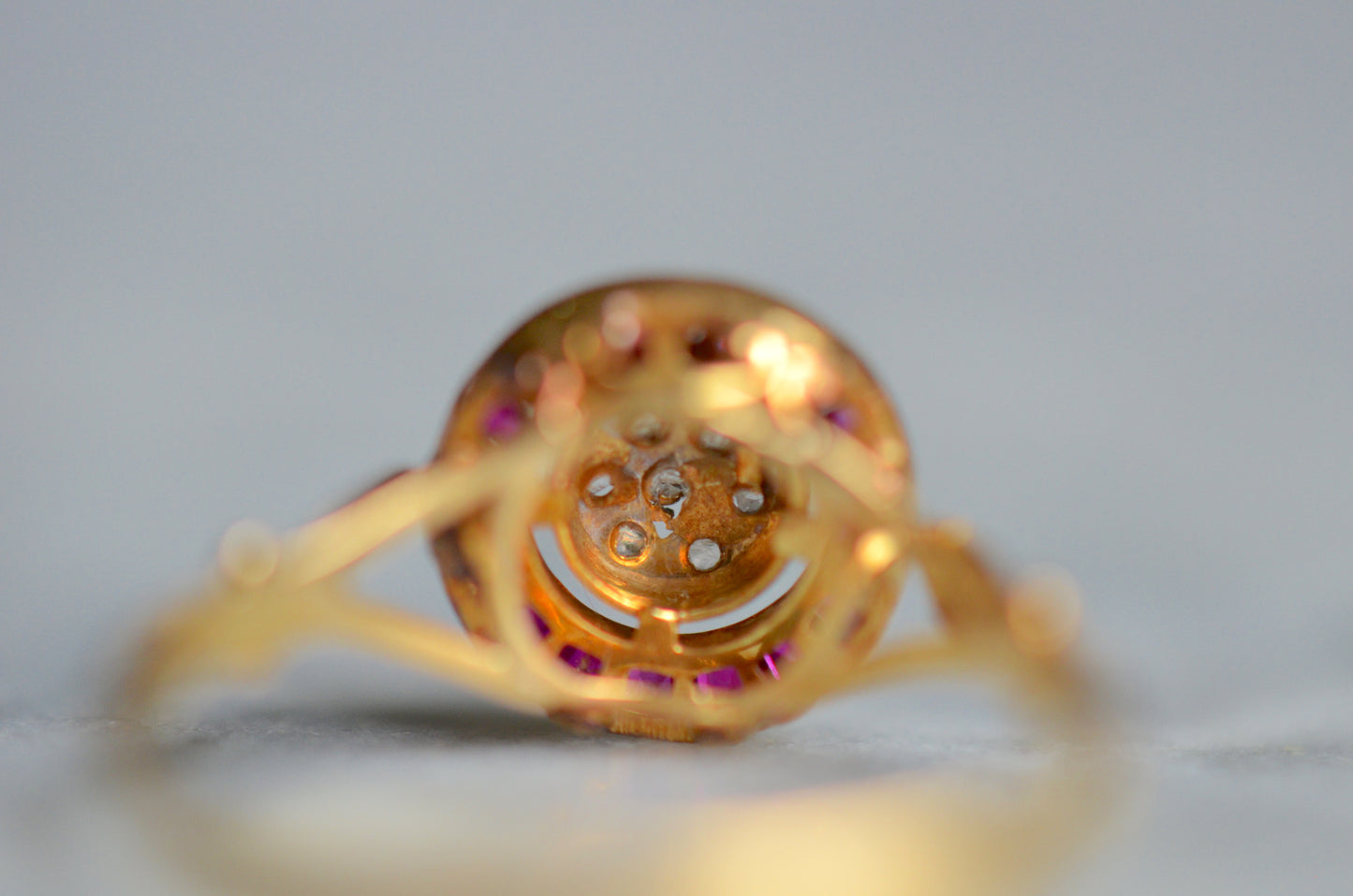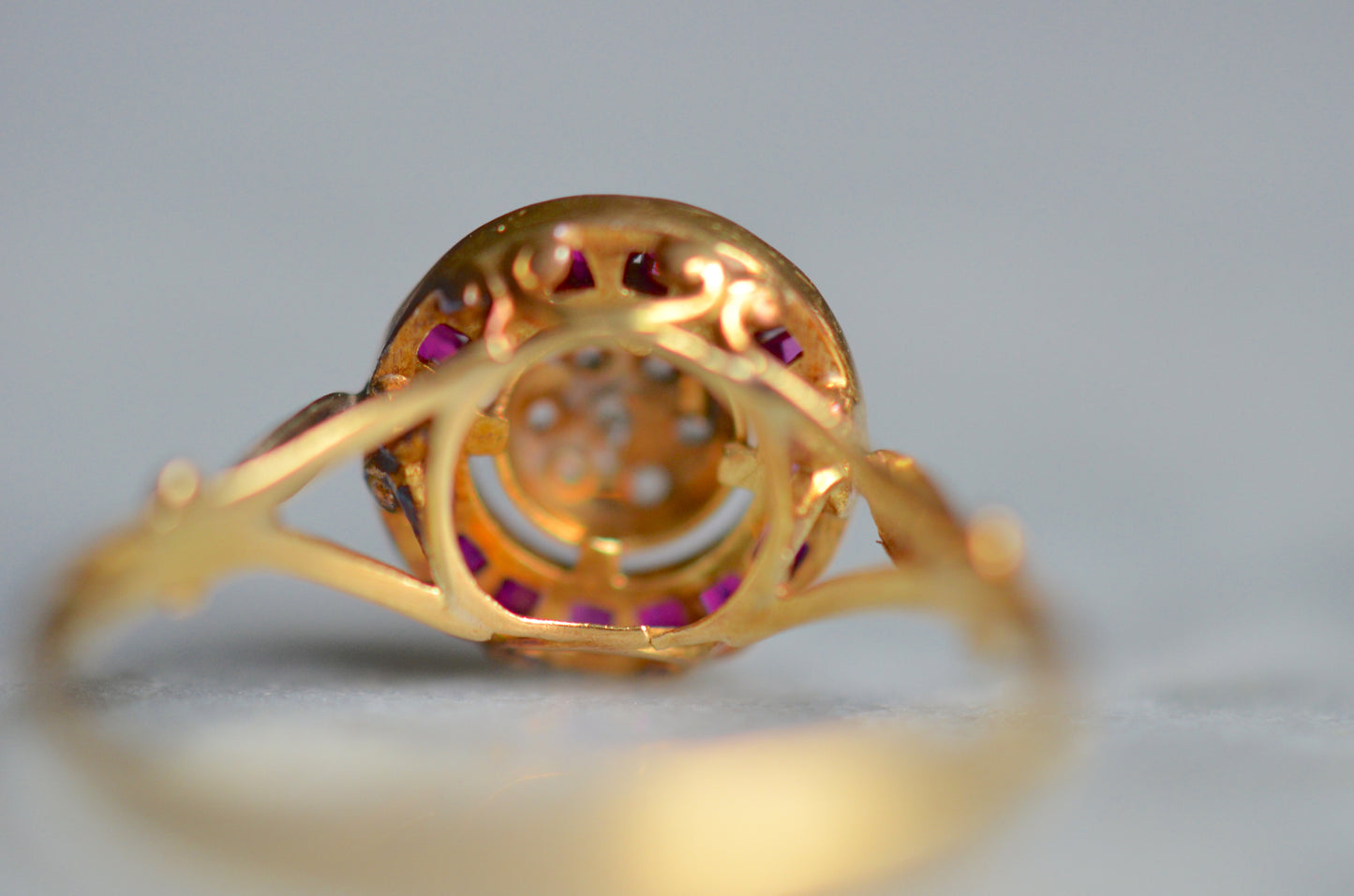 To be reinforced and refreshed, we would rebuild and bolster the outer bezel that holds the calibré rubies (it's worn thin and patchy in some places), replace the central plate holding the rose cut diamonds (there's a small hole through it, though the stones are all in place), and touch up the connection points between the head and shank.