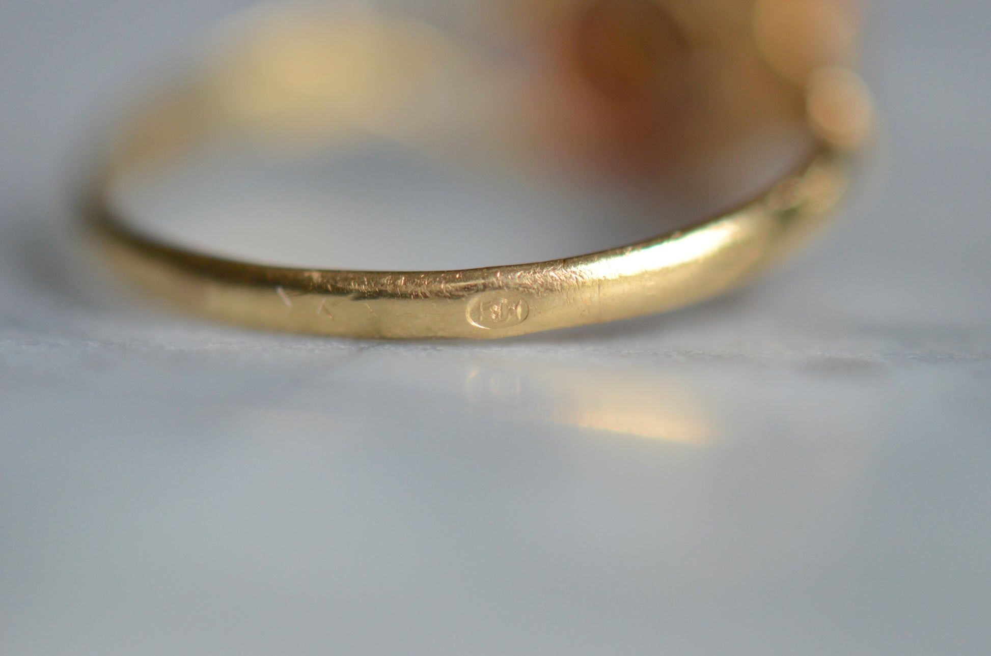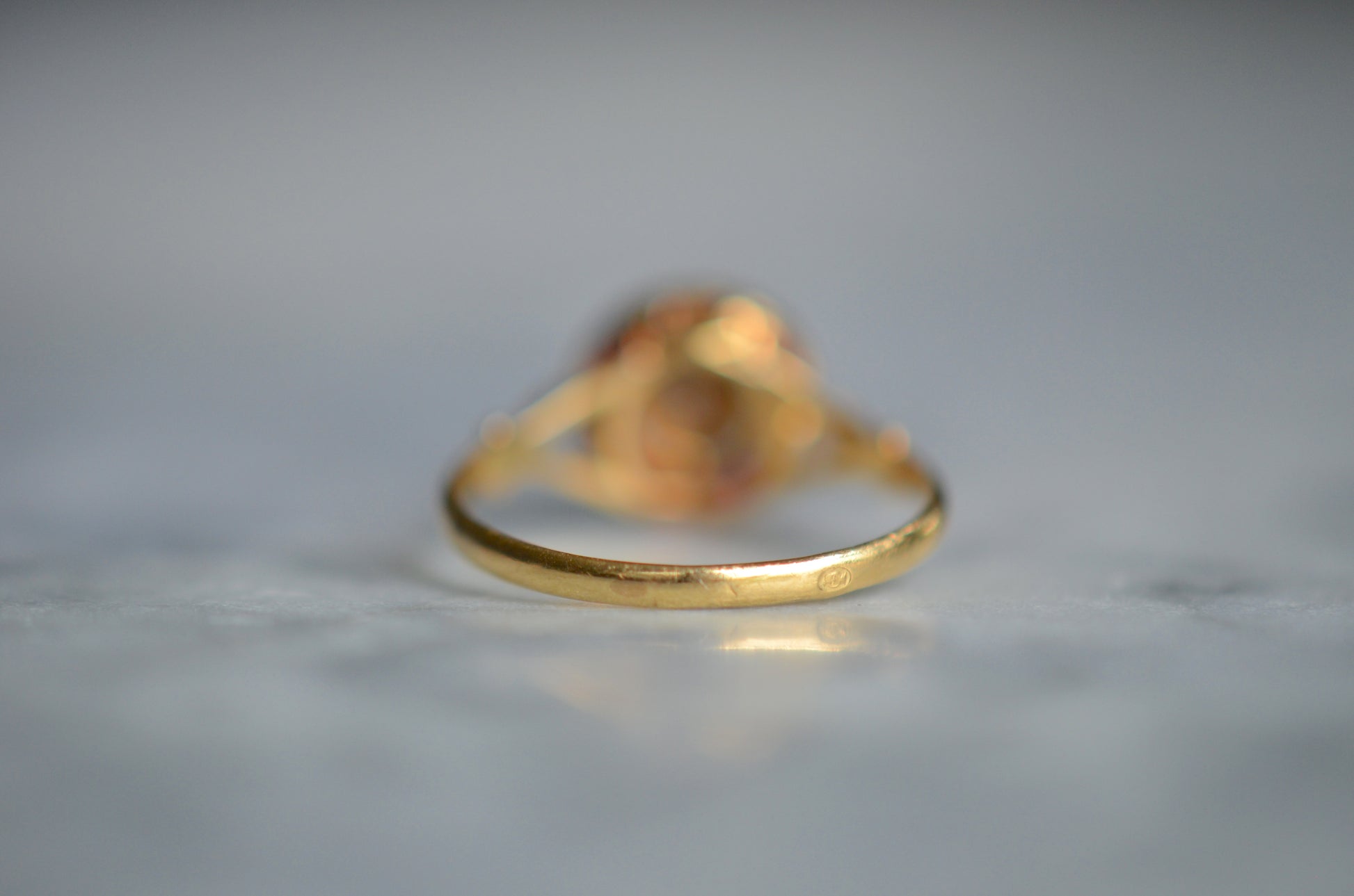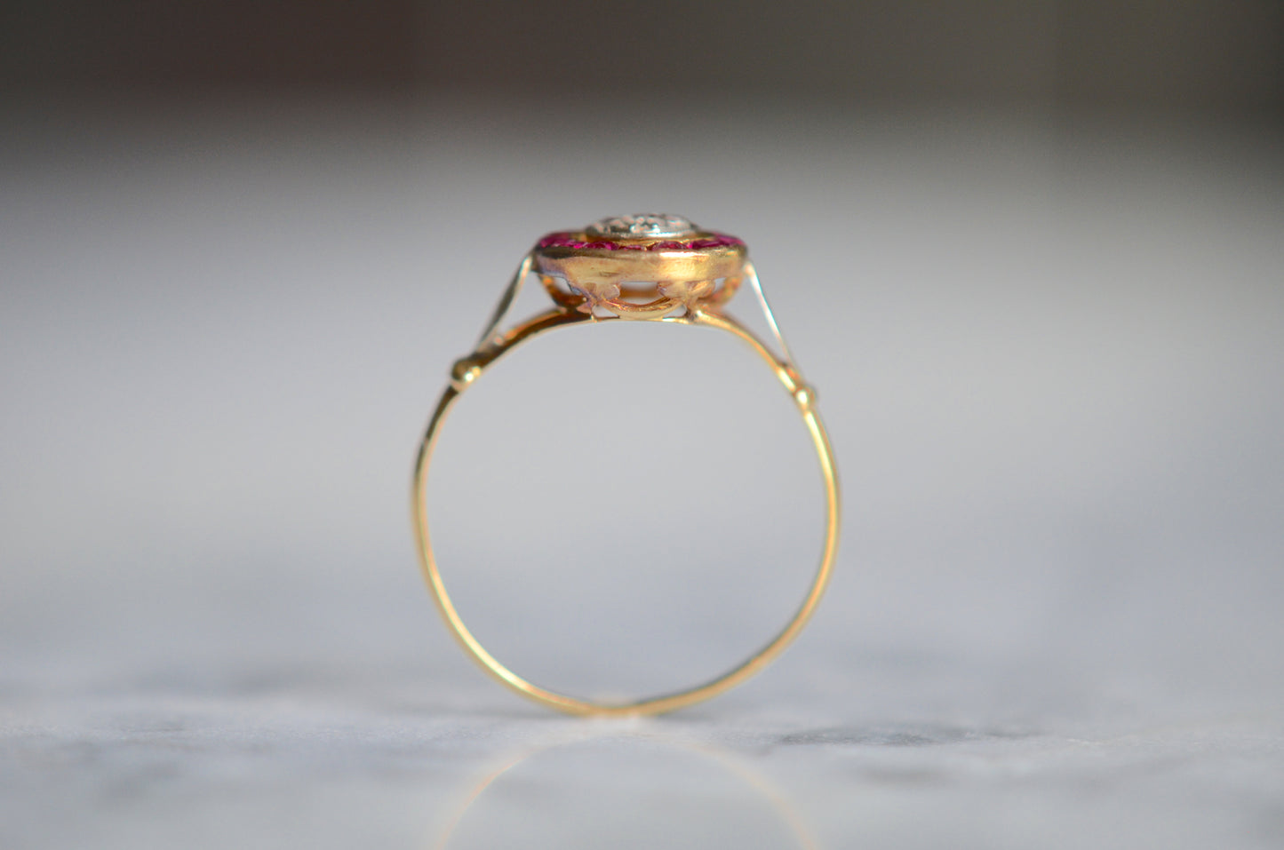 The sweetest little old lady, this ring has been places and seen things. A fully original authentic Art Deco target ring, she is not in the best shape of her life, but at present is uniquely and utterly herself. Though not currently suitable for everyday wear, she IS wearable as is as long as care is taken. Her stones are all secure, with no loose parts or rattles, and her head and shank are both intact - she's a purist's dream (you can only be an original antique once!), and as a result we are offering her as is, with the option to restore her to her former glory.