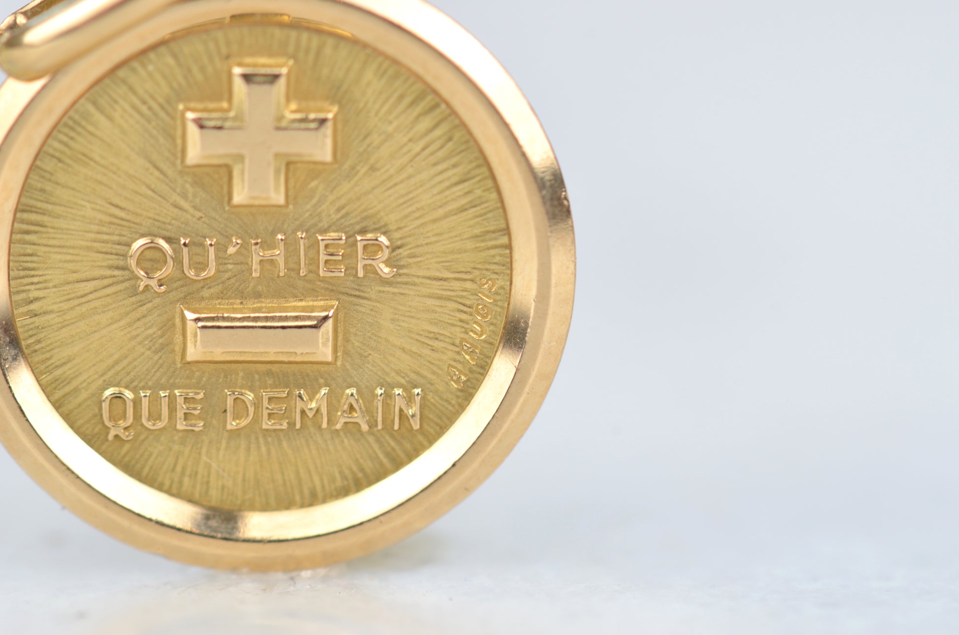 Beautiful vintage French love token, in a simple, minimalist version that is thick and sturdy. Created c. 1916 by Alphonse Augis and inspired by a letter poet Rosemonde Gérard wrote to her husband, the writer Edmond Rostand, the pendant features a rebus reading "+ qu'hier - que demain" for the lines,