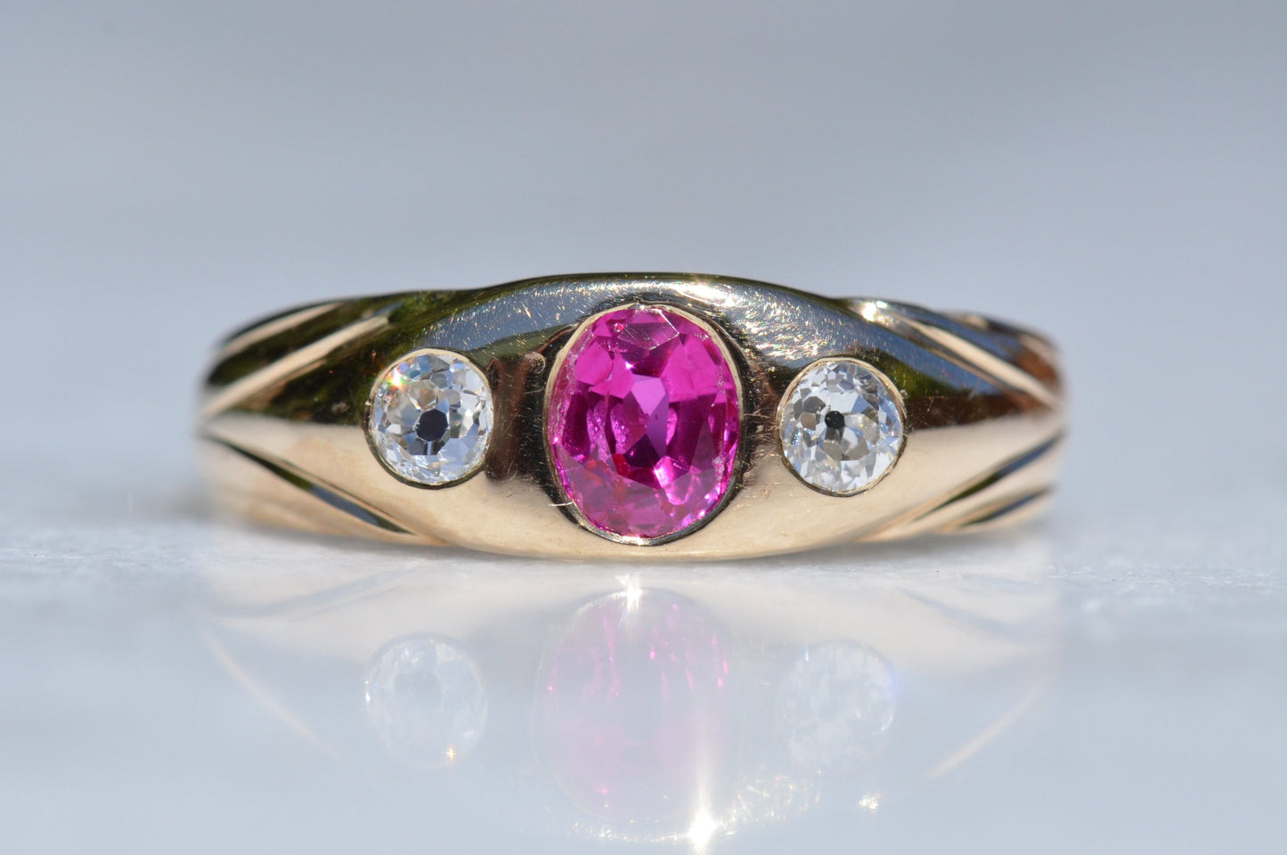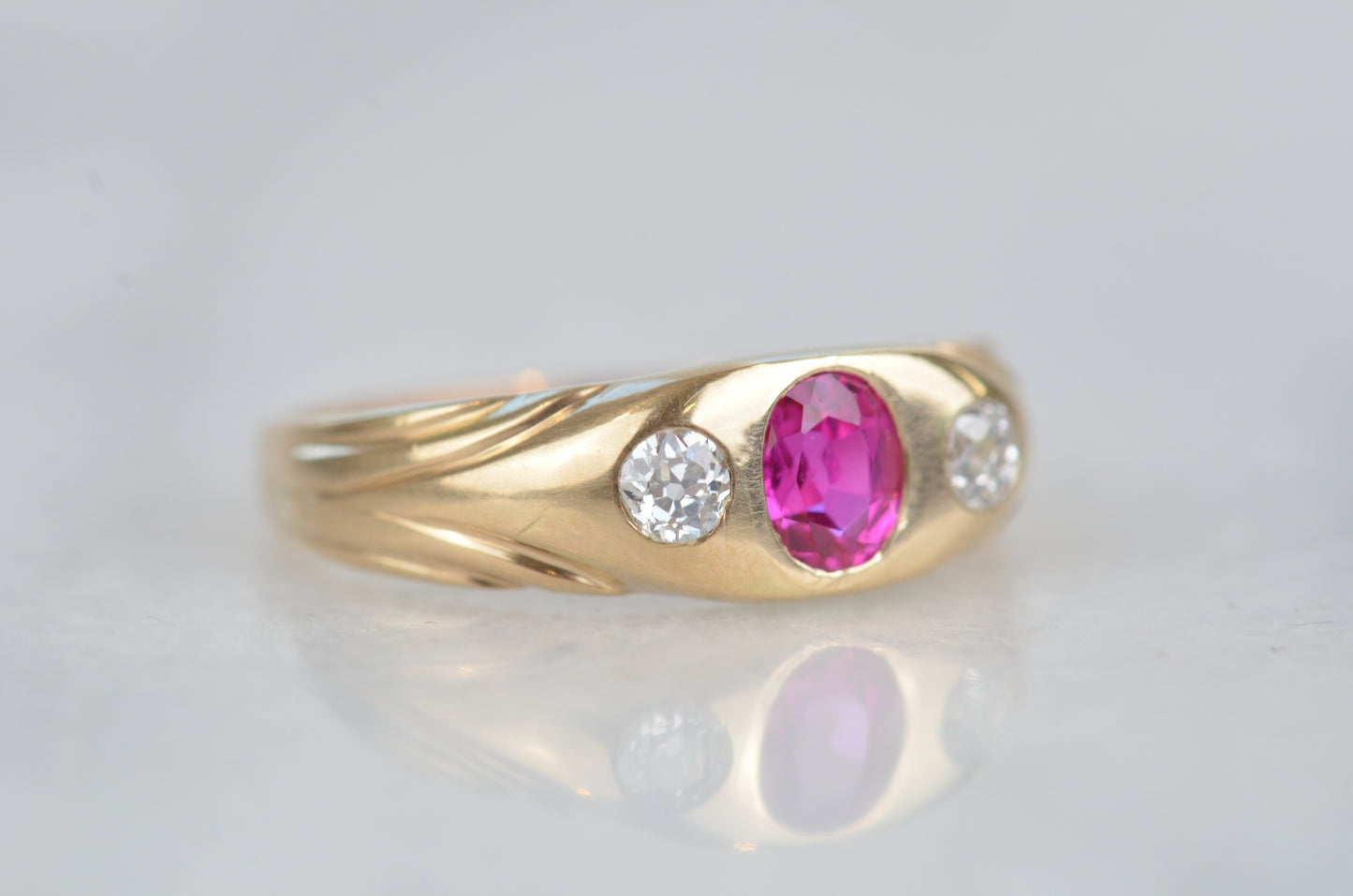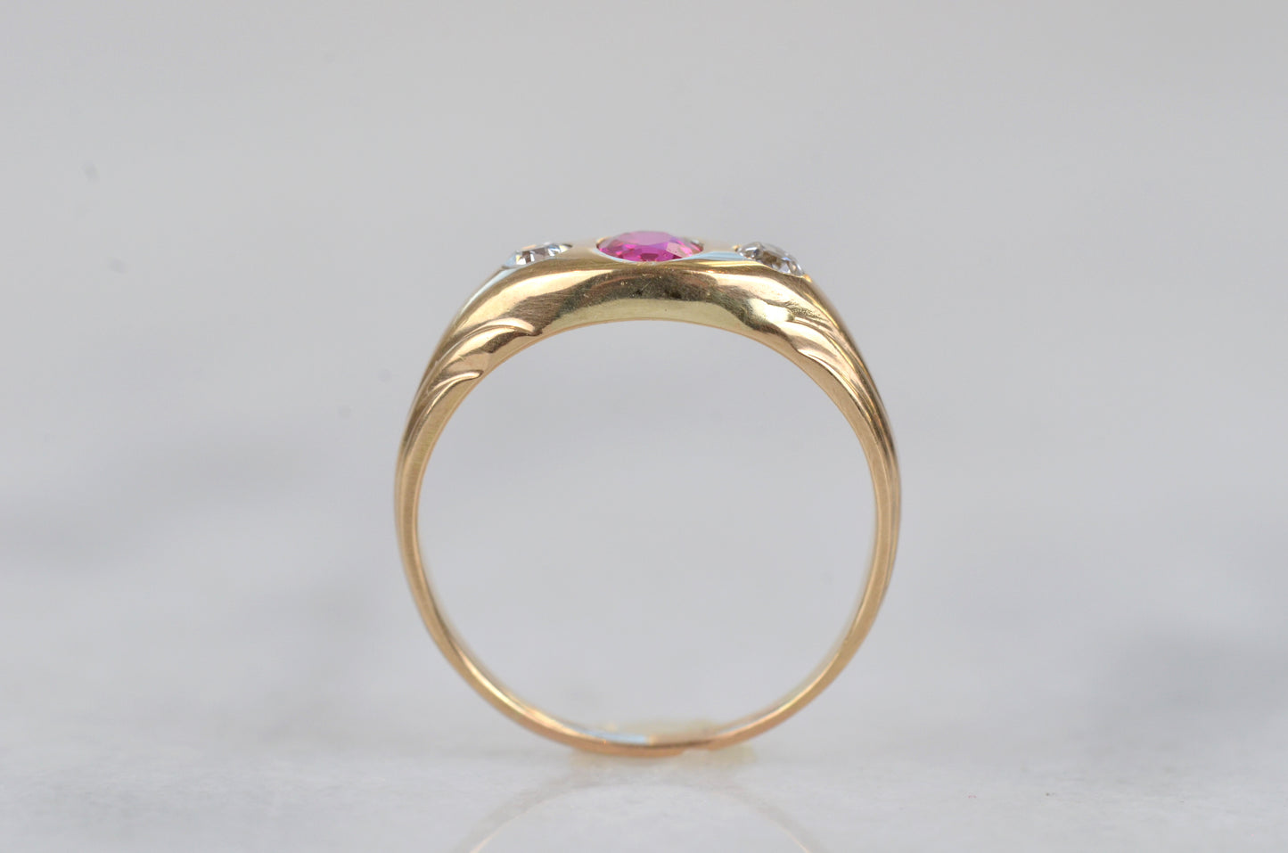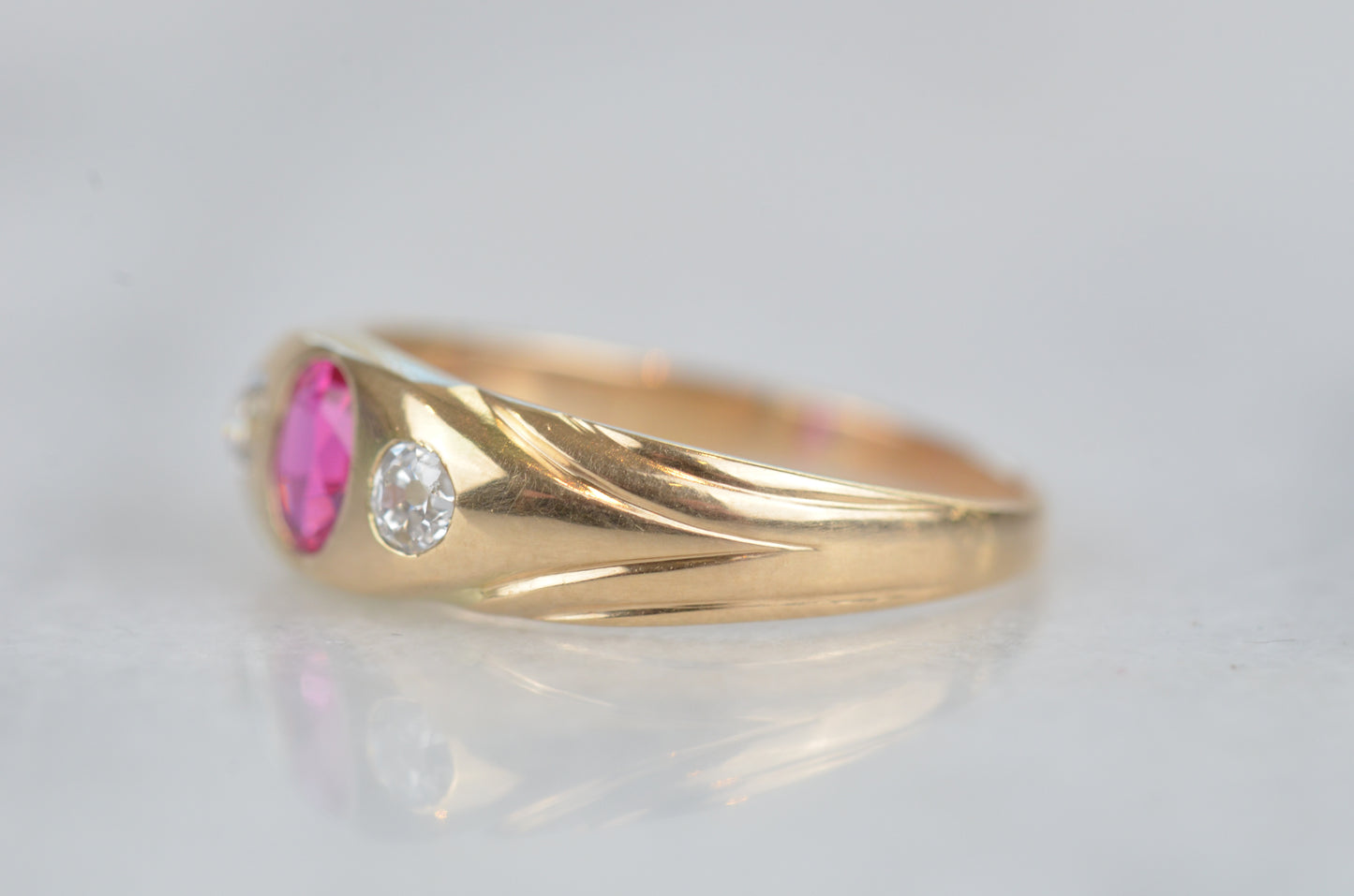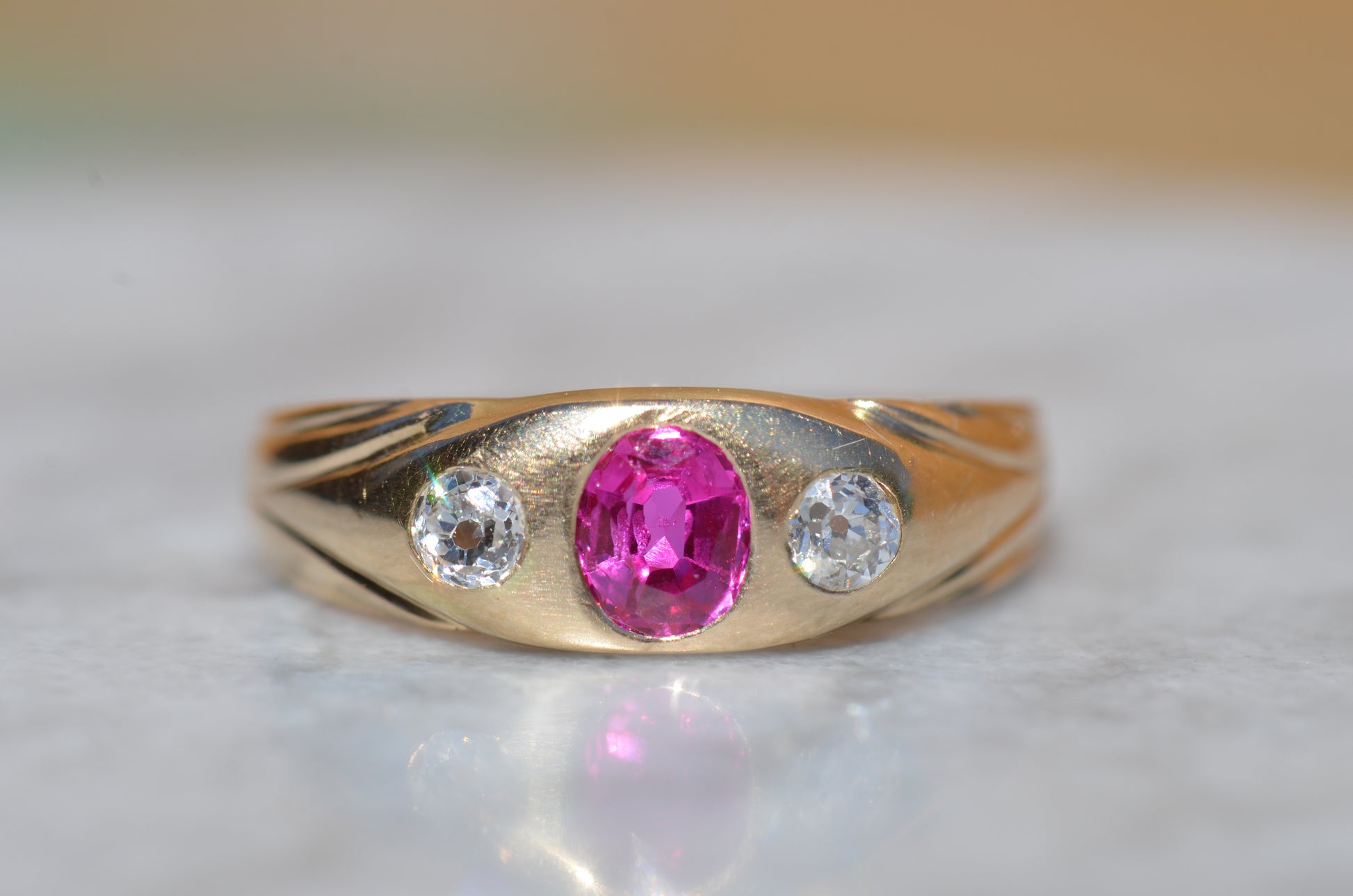 This early 20th century ring is absolutely electrifying: crisp, bright white diamonds with blocky old facets and prominent culets sit astride a beaming pink early synthetic ruby. While today, a synthetic origin isn't considered as valuable as natural, it's important to remember that in the early 20th century this would have been positively cutting edge technology: synthetic rubies created using Verneuil's process came to market in 1903 after over 50 years of experimentation. Early synthetic stones in jewelry were the perfect blend of technology and art, and at the time many considered them superior for their vivid colour saturation and freedom from inclusions and other imperfections. While increasingly available in the 1900s and 1910s, they particularly took off in the Art Deco period, which made striking use of synthetic rubies and sapphires in perfectly matched shades for accent stones and calibré cut decoration. This ring is beautifully crafted, thick with gold and smooth all over - a dream for everyday wear, and dare we say even a perfect alternative engagement ring?