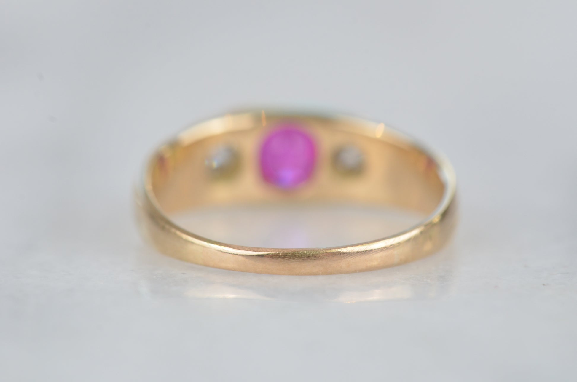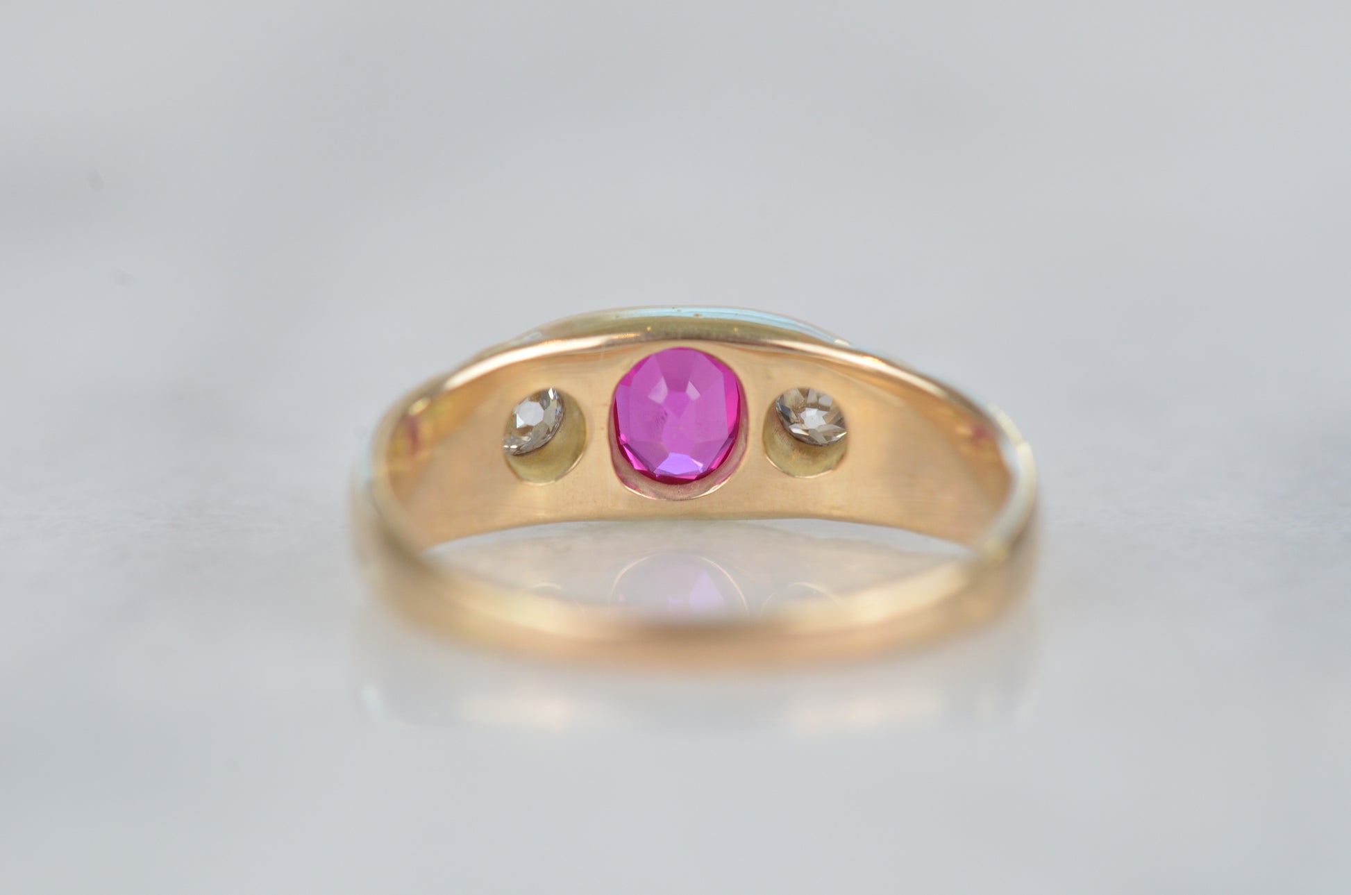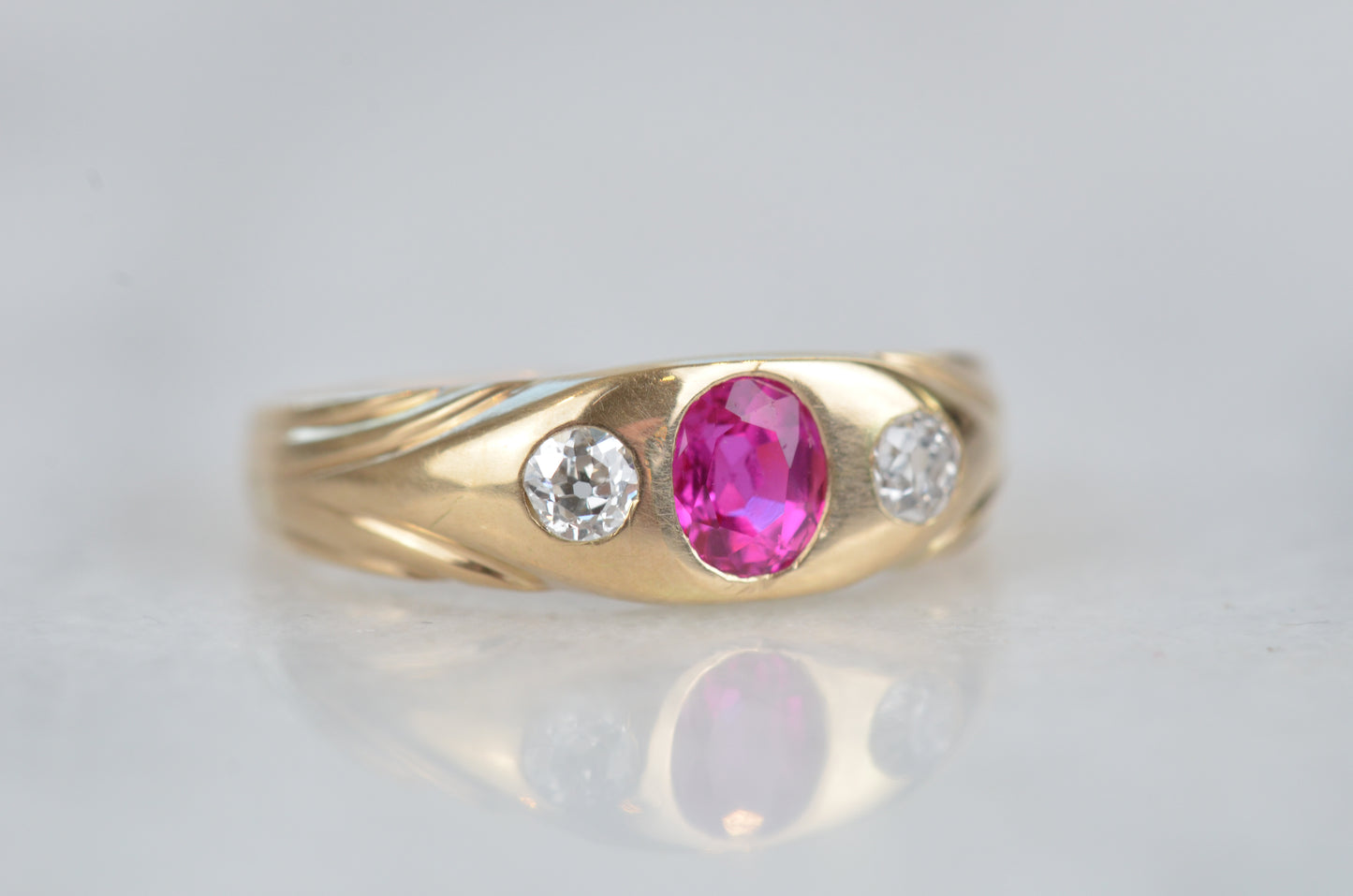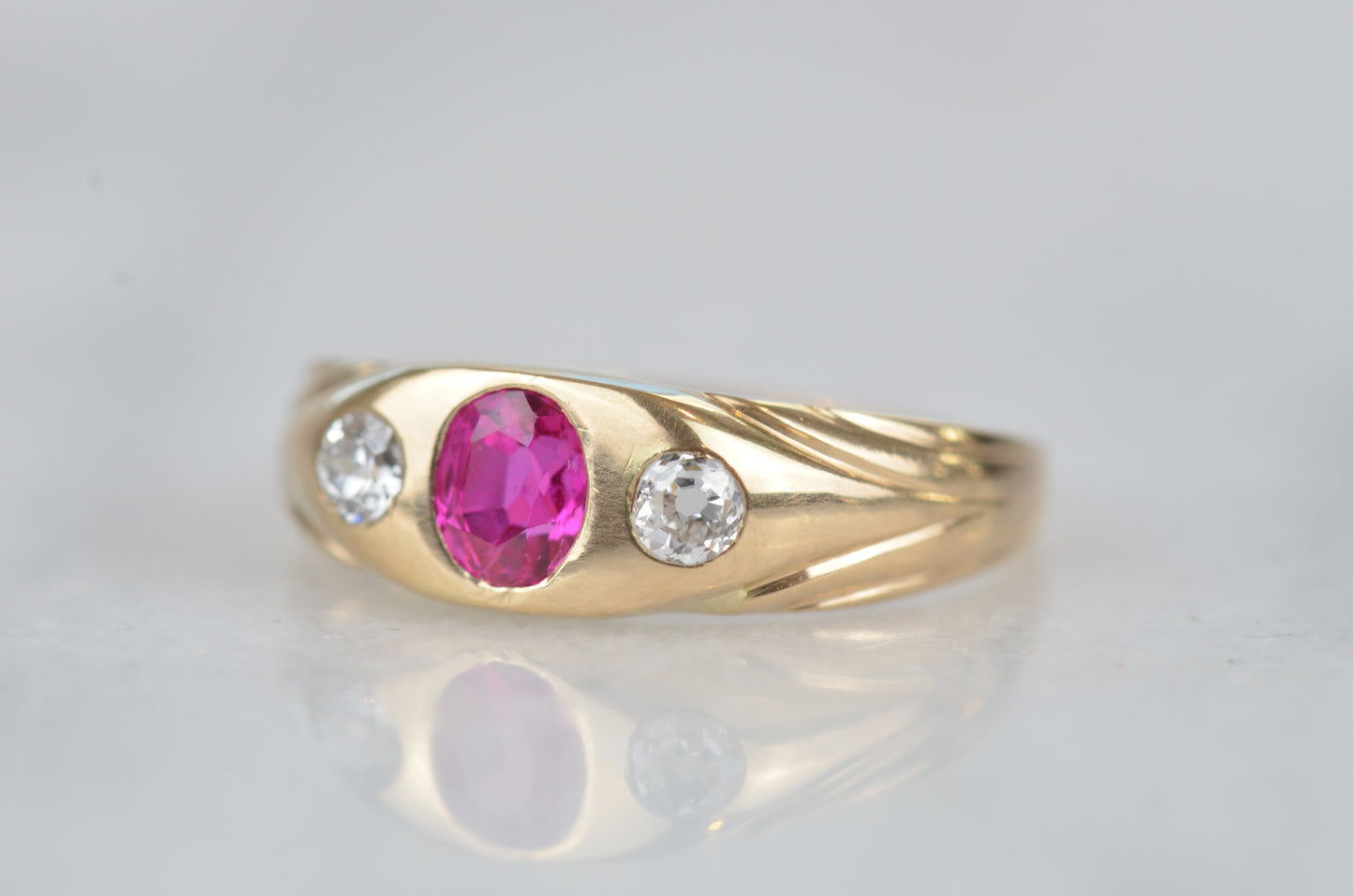 This early 20th century ring is absolutely electrifying: crisp, bright white diamonds with blocky old facets and prominent culets sit astride a beaming pink early synthetic ruby. While today, a synthetic origin isn't considered as valuable as natural, it's important to remember that in the early 20th century this would have been positively cutting edge technology: synthetic rubies created using Verneuil's process came to market in 1903 after over 50 years of experimentation. Early synthetic stones in jewelry were the perfect blend of technology and art, and at the time many considered them superior for their vivid colour saturation and freedom from inclusions and other imperfections. While increasingly available in the 1900s and 1910s, they particularly took off in the Art Deco period, which made striking use of synthetic rubies and sapphires in perfectly matched shades for accent stones and calibré cut decoration. This ring is beautifully crafted, thick with gold and smooth all over - a dream for everyday wear, and dare we say even a perfect alternative engagement ring?