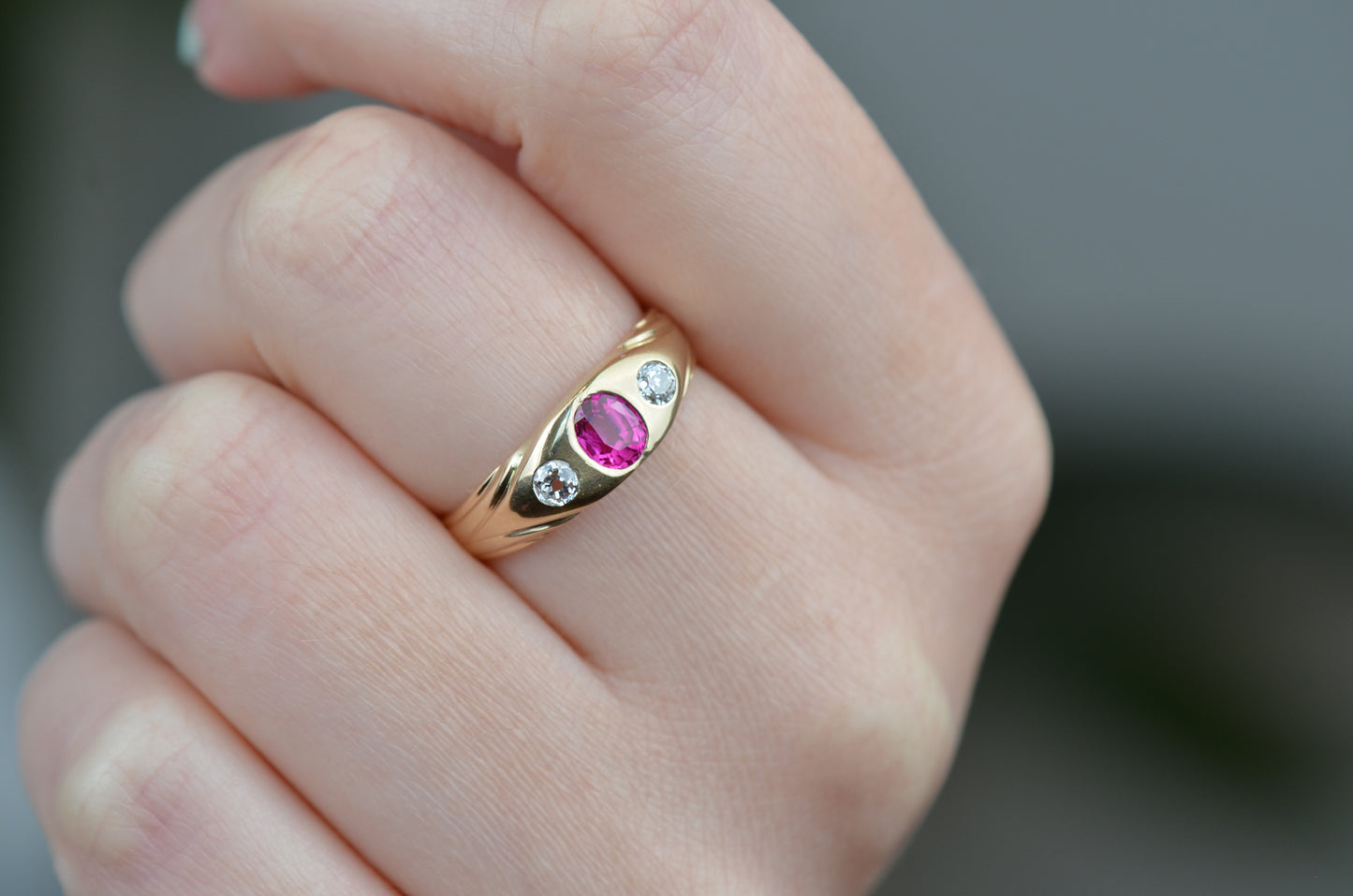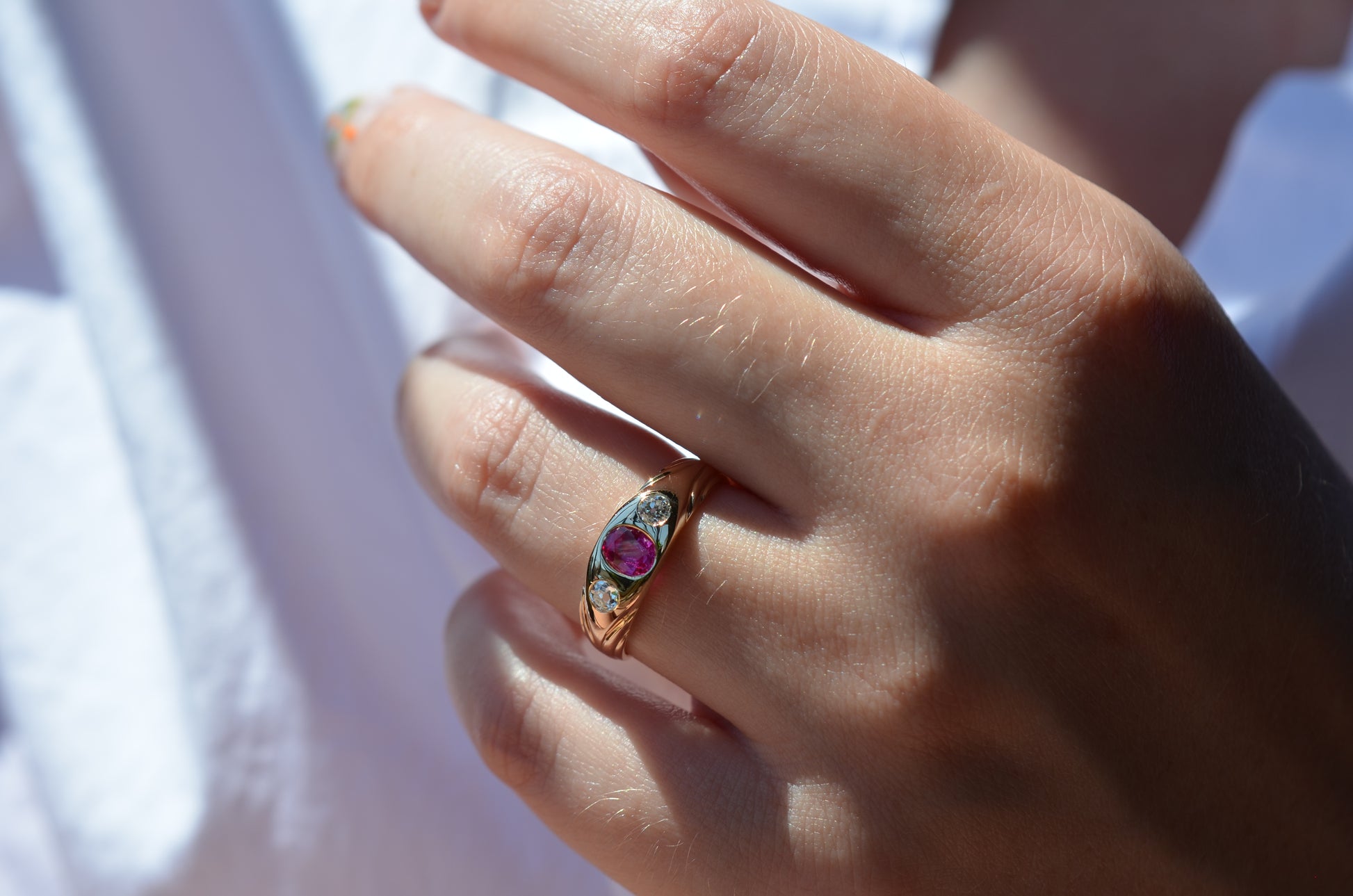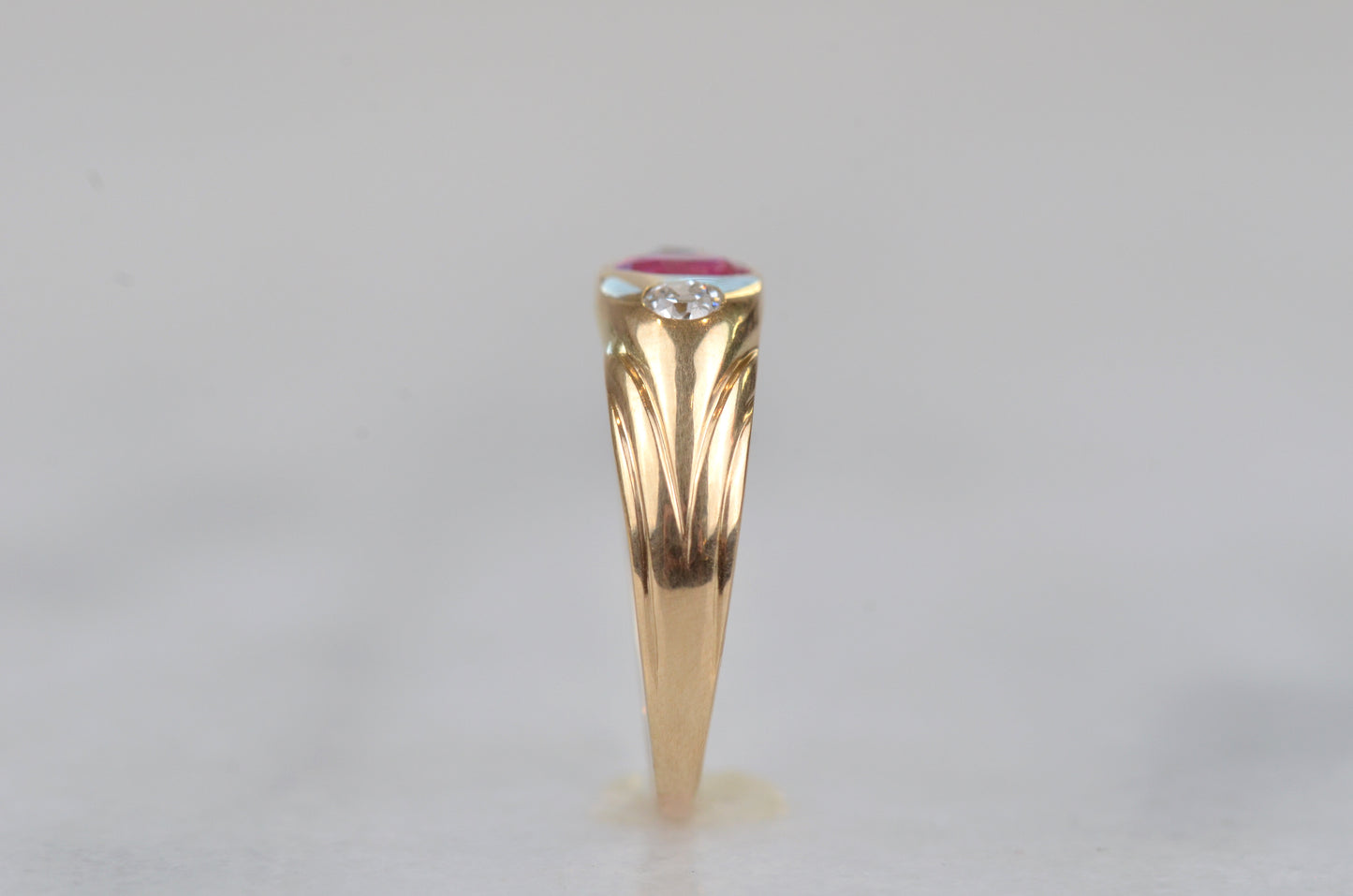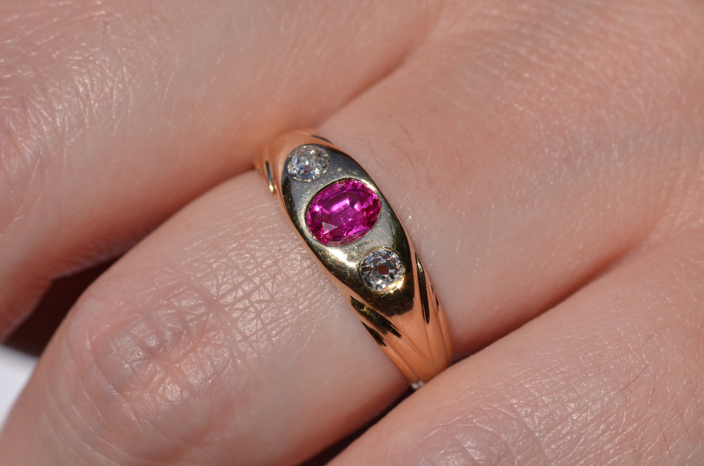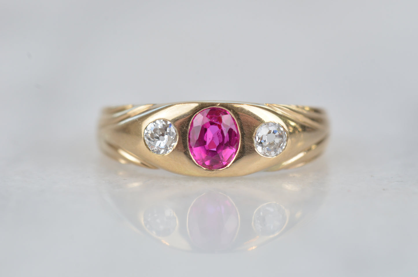 This early 20th century ring is absolutely electrifying: crisp, bright white diamonds with blocky old facets and prominent culets sit astride a beaming pink early synthetic ruby. While today, a synthetic origin isn't considered as valuable as natural, it's important to remember that in the early 20th century this would have been positively cutting edge technology: synthetic rubies created using Verneuil's process came to market in 1903 after over 50 years of experimentation. Early synthetic stones in jewelry were the perfect blend of technology and art, and at the time many considered them superior for their vivid colour saturation and freedom from inclusions and other imperfections. While increasingly available in the 1900s and 1910s, they particularly took off in the Art Deco period, which made striking use of synthetic rubies and sapphires in perfectly matched shades for accent stones and calibré cut decoration. This ring is beautifully crafted, thick with gold and smooth all over - a dream for everyday wear, and dare we say even a perfect alternative engagement ring?