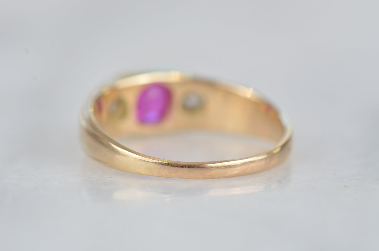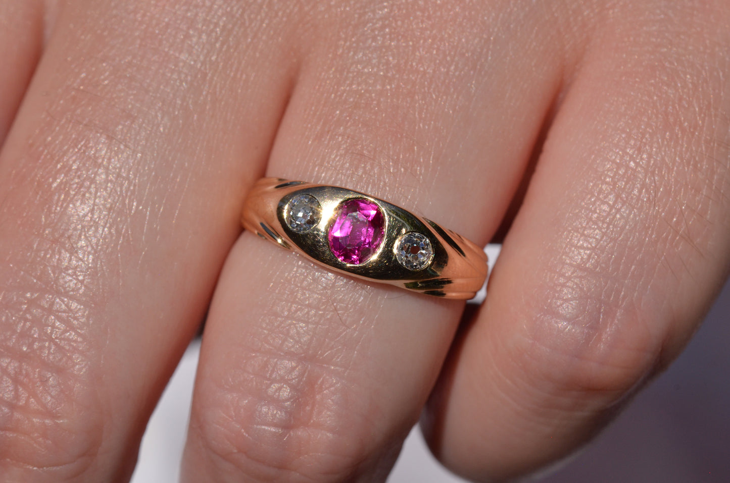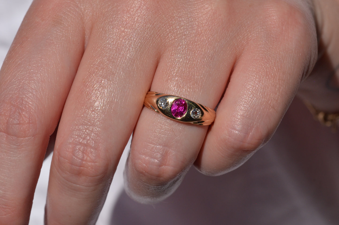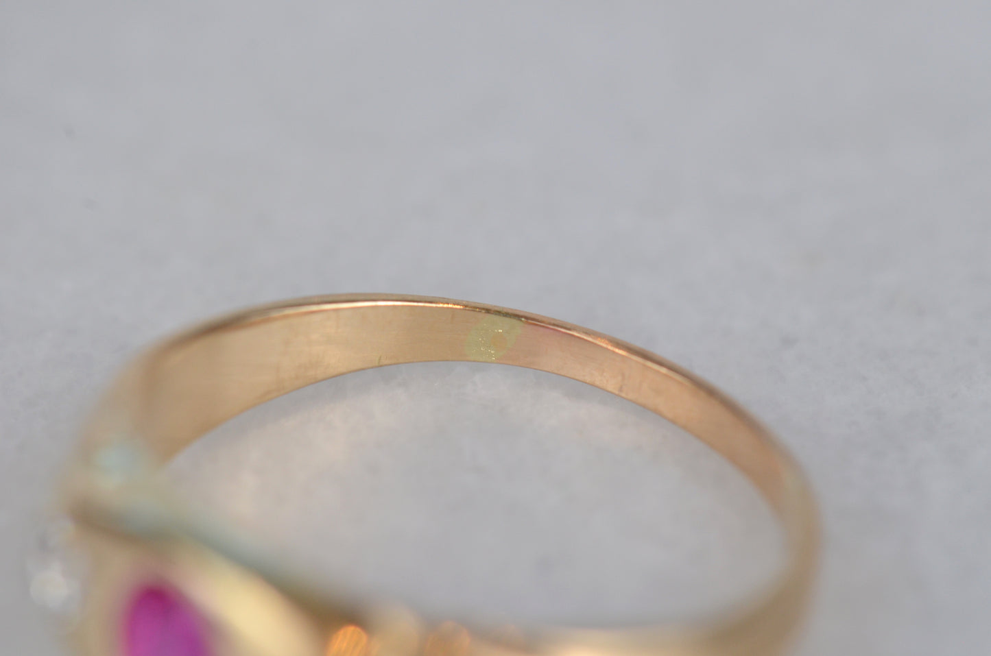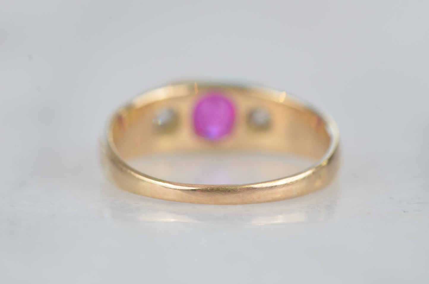 This early 20th century ring is absolutely electrifying: crisp, bright white diamonds with blocky old facets and prominent culets sit astride a beaming pink early synthetic ruby. While today, a synthetic origin isn't considered as valuable as natural, it's important to remember that in the early 20th century this would have been positively cutting edge technology: synthetic rubies created using Verneuil's process came to market in 1903 after over 50 years of experimentation. Early synthetic stones in jewelry were the perfect blend of technology and art, and at the time many considered them superior for their vivid colour saturation and freedom from inclusions and other imperfections. While increasingly available in the 1900s and 1910s, they particularly took off in the Art Deco period, which made striking use of synthetic rubies and sapphires in perfectly matched shades for accent stones and calibré cut decoration. This ring is beautifully crafted, thick with gold and smooth all over - a dream for everyday wear, and dare we say even a perfect alternative engagement ring?