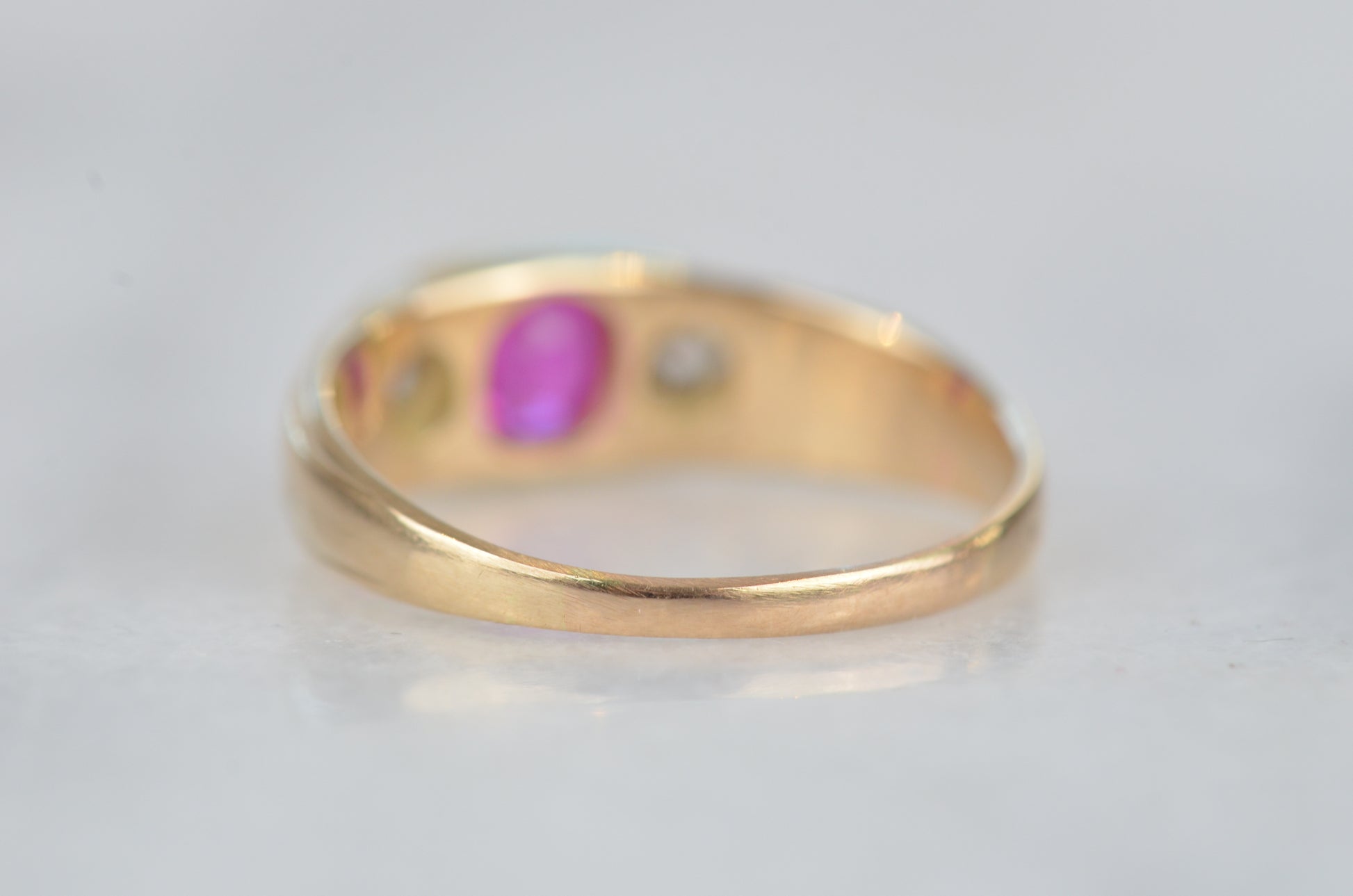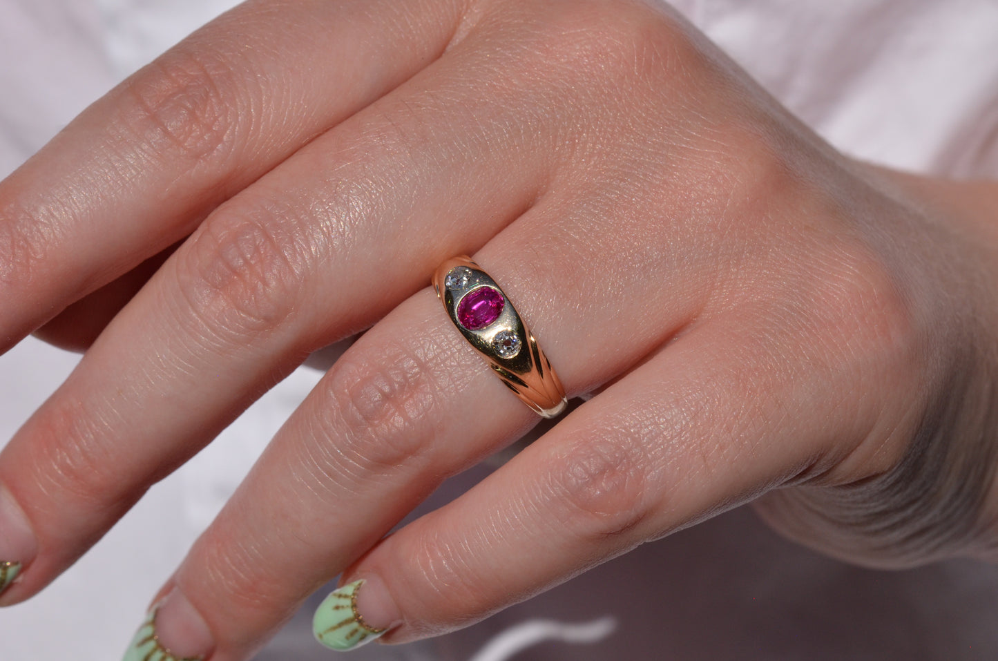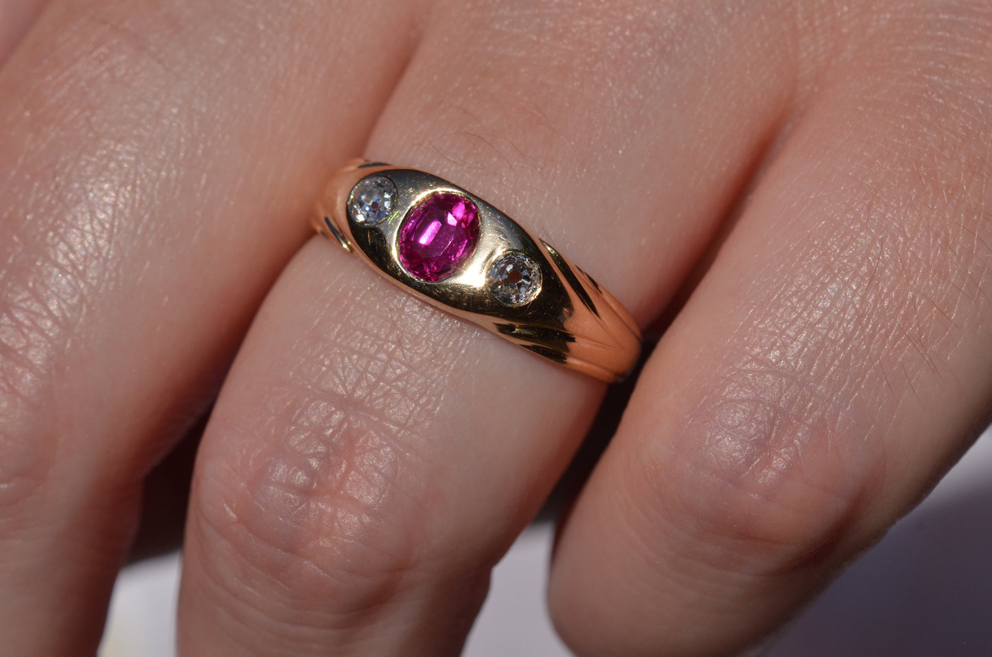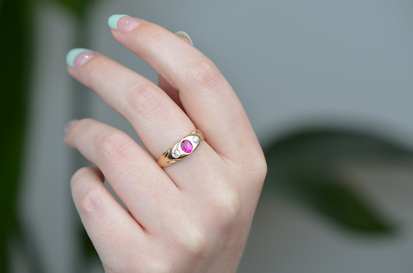 This early 20th century ring is absolutely electrifying: crisp, bright white diamonds with blocky old facets and prominent culets sit astride a beaming pink early synthetic ruby. While today, a synthetic origin isn't considered as valuable as natural, it's important to remember that in the early 20th century this would have been positively cutting edge technology: synthetic rubies created using Verneuil's process came to market in 1903 after over 50 years of experimentation. Early synthetic stones in jewelry were the perfect blend of technology and art, and at the time many considered them superior for their vivid colour saturation and freedom from inclusions and other imperfections. While increasingly available in the 1900s and 1910s, they particularly took off in the Art Deco period, which made striking use of synthetic rubies and sapphires in perfectly matched shades for accent stones and calibré cut decoration. This ring is beautifully crafted, thick with gold and smooth all over - a dream for everyday wear, and dare we say even a perfect alternative engagement ring?
