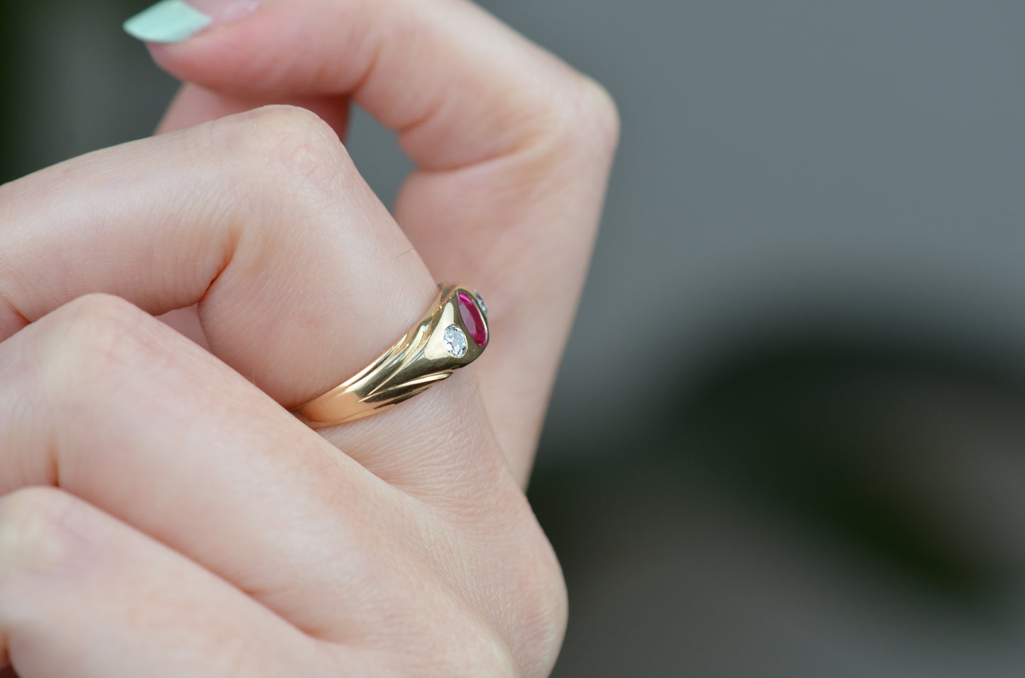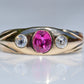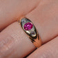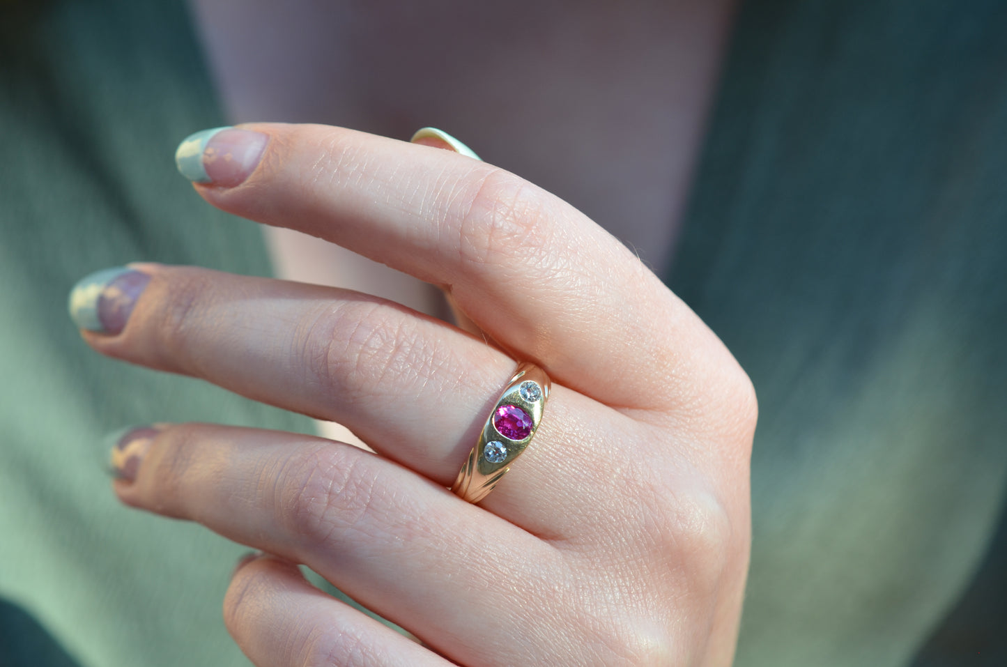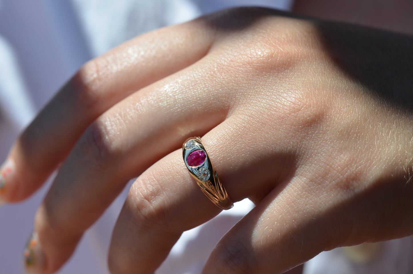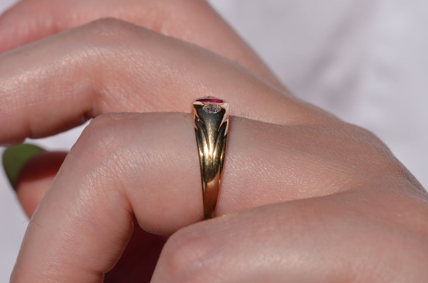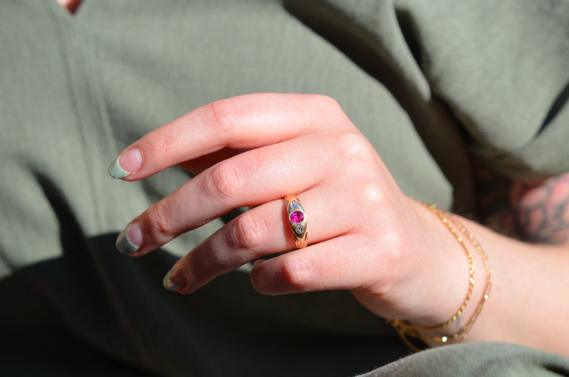 This early 20th century ring is absolutely electrifying: crisp, bright white diamonds with blocky old facets and prominent culets sit astride a beaming pink early synthetic ruby. While today, a synthetic origin isn't considered as valuable as natural, it's important to remember that in the early 20th century this would have been positively cutting edge technology: synthetic rubies created using Verneuil's process came to market in 1903 after over 50 years of experimentation. Early synthetic stones in jewelry were the perfect blend of technology and art, and at the time many considered them superior for their vivid colour saturation and freedom from inclusions and other imperfections. While increasingly available in the 1900s and 1910s, they particularly took off in the Art Deco period, which made striking use of synthetic rubies and sapphires in perfectly matched shades for accent stones and calibré cut decoration. This ring is beautifully crafted, thick with gold and smooth all over - a dream for everyday wear, and dare we say even a perfect alternative engagement ring?