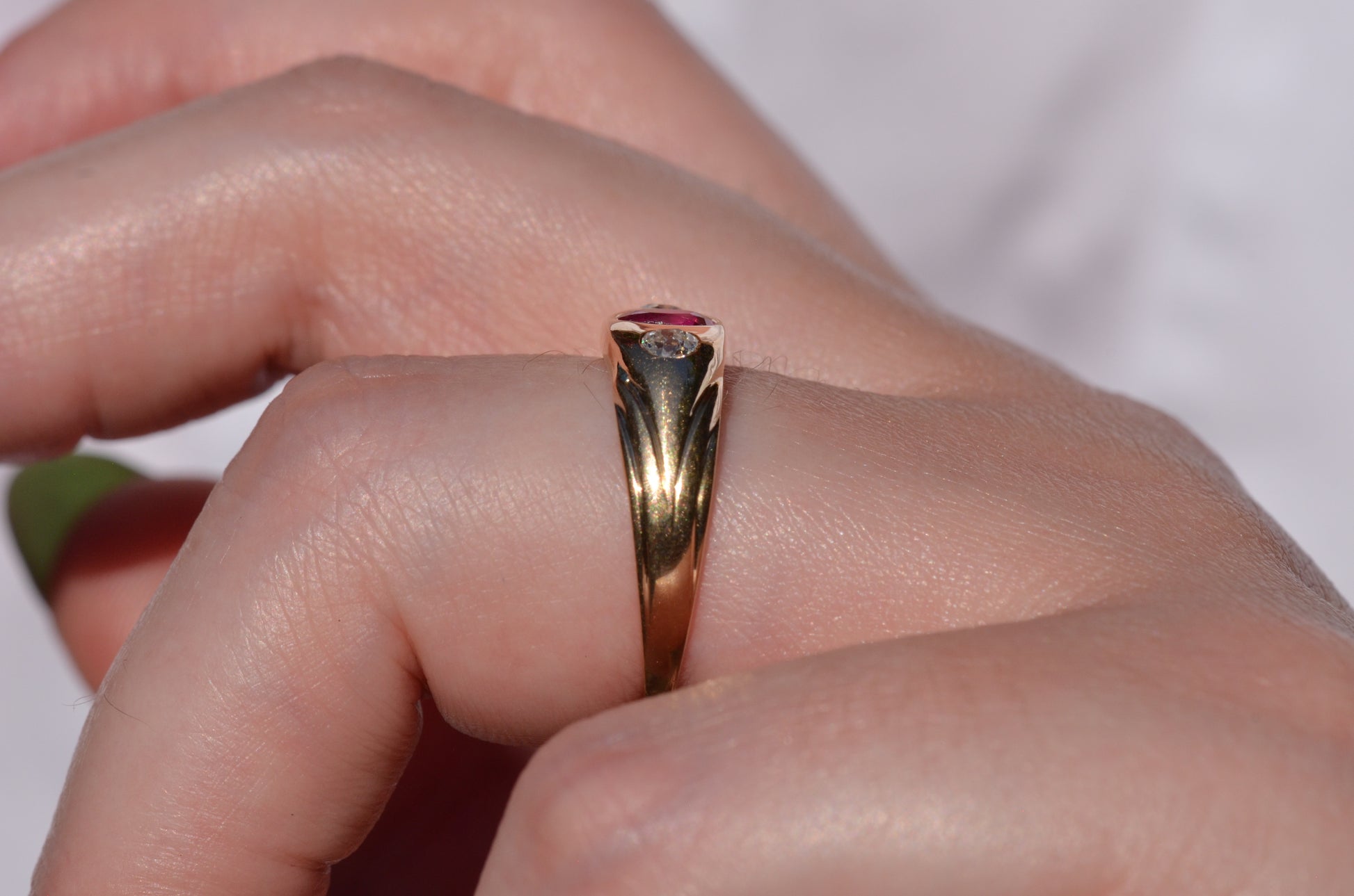 Very good antique condition with wear in line with age and use, including a small chip on the pavilion of the ruby, and very minor evidence of past resizing. Ring has been relatively recently polished. c1920. Originally manufactured in the US but not USMCA-compliant and may incur duties or tariffs.