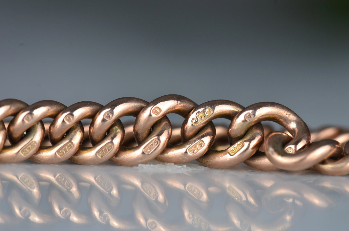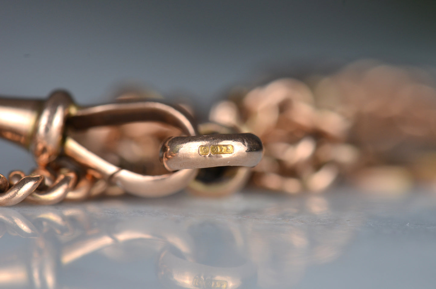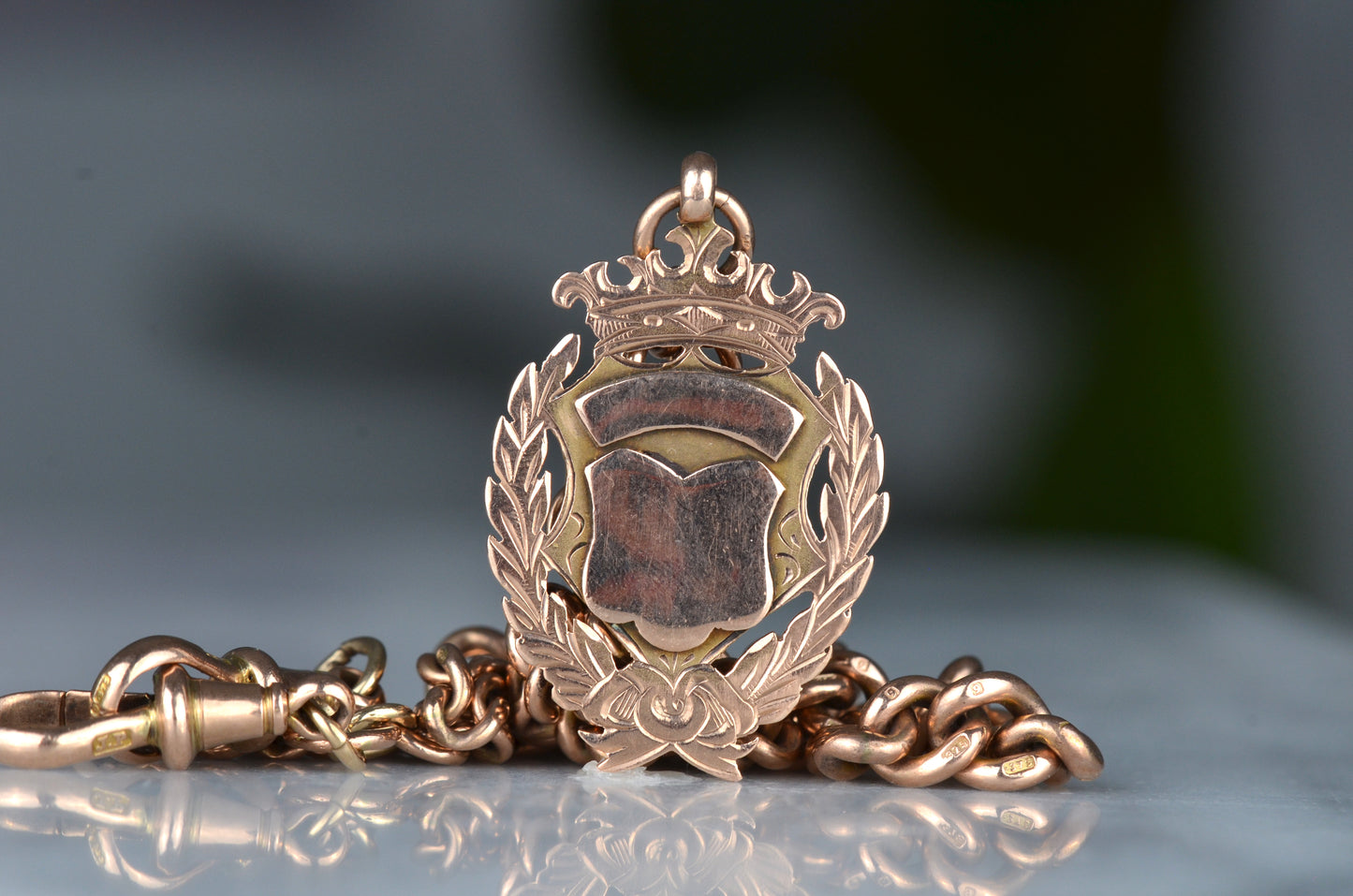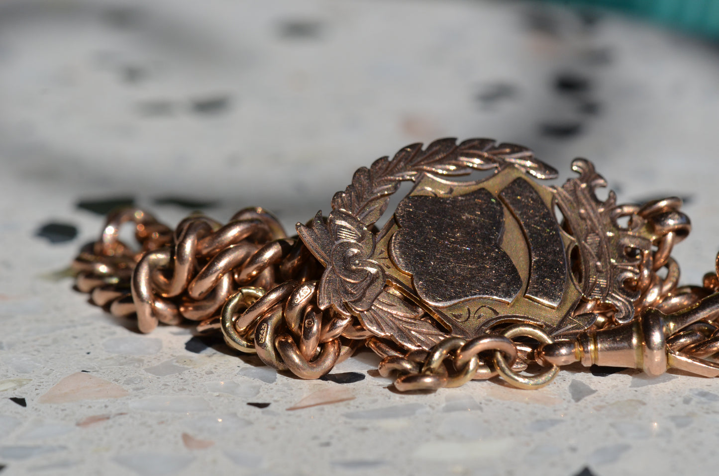 Each arm of the chain has a subtle and beautiful taper, widest in the middle and thinning out towards the clasp and the shield, for added depth and interest. The oxidation of the copper in the 9k gold has given the chain a delightful pinkish hue.