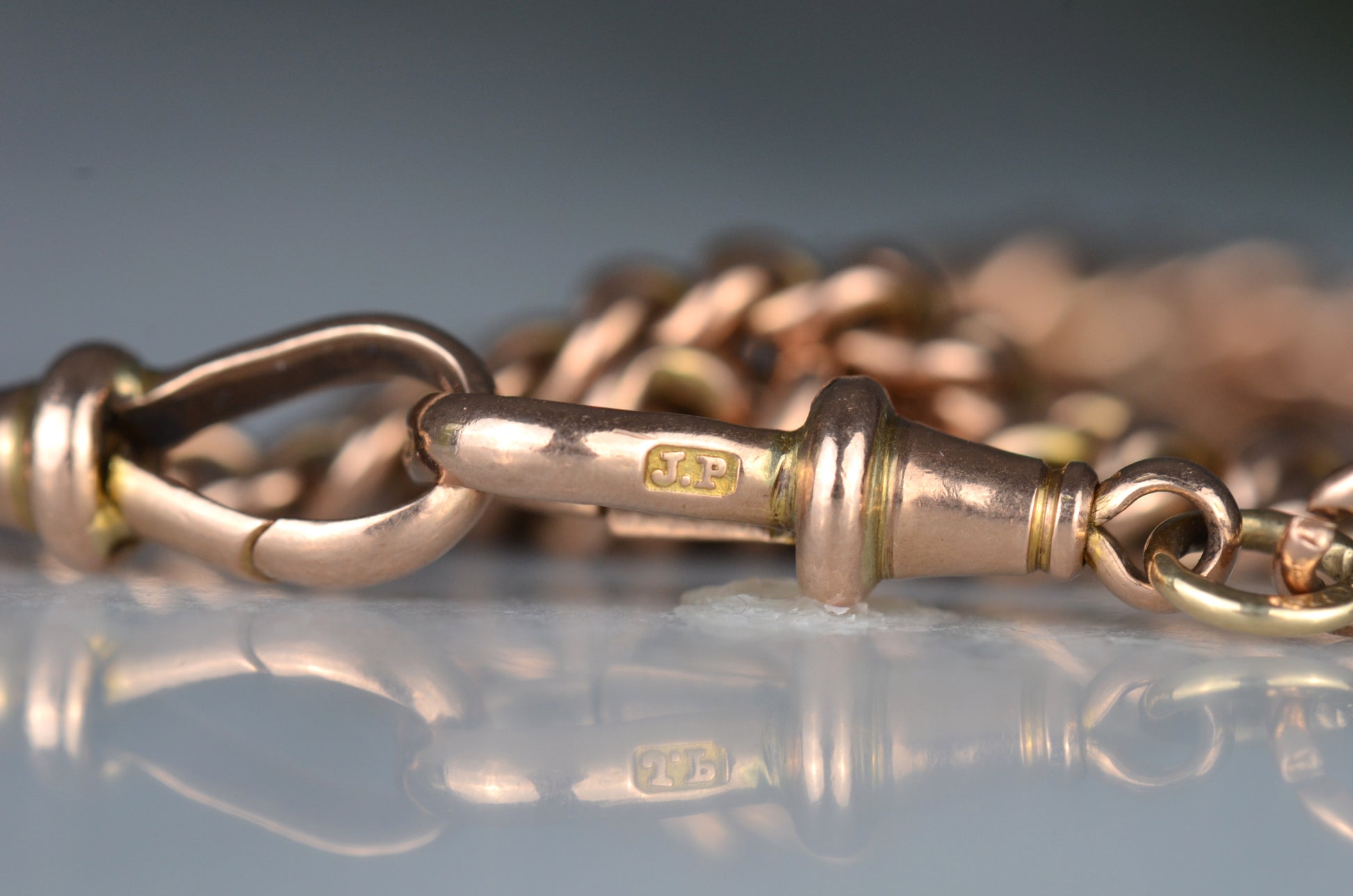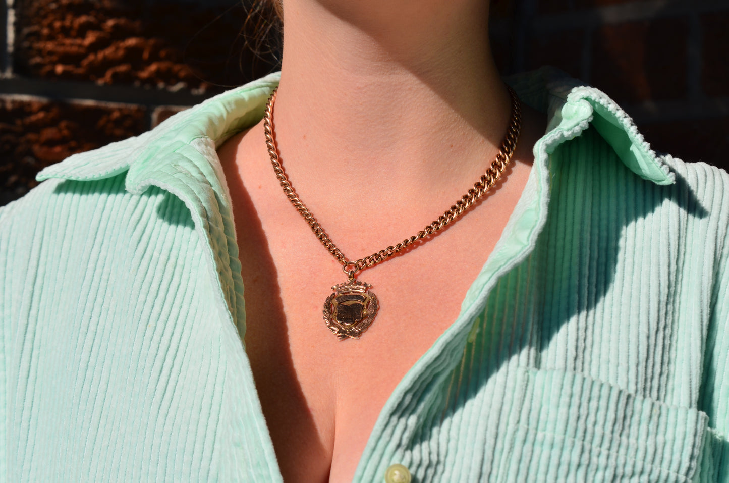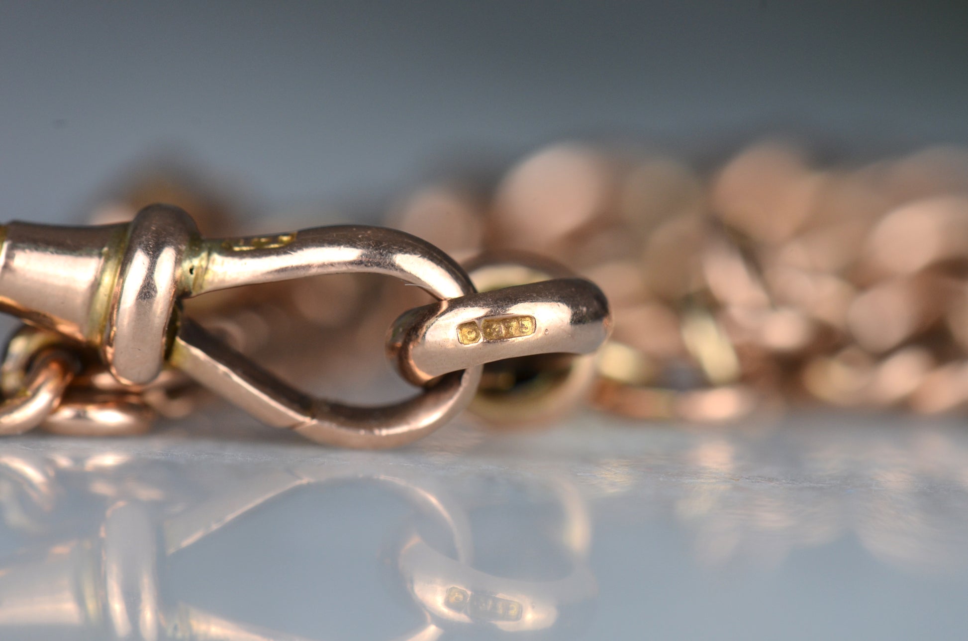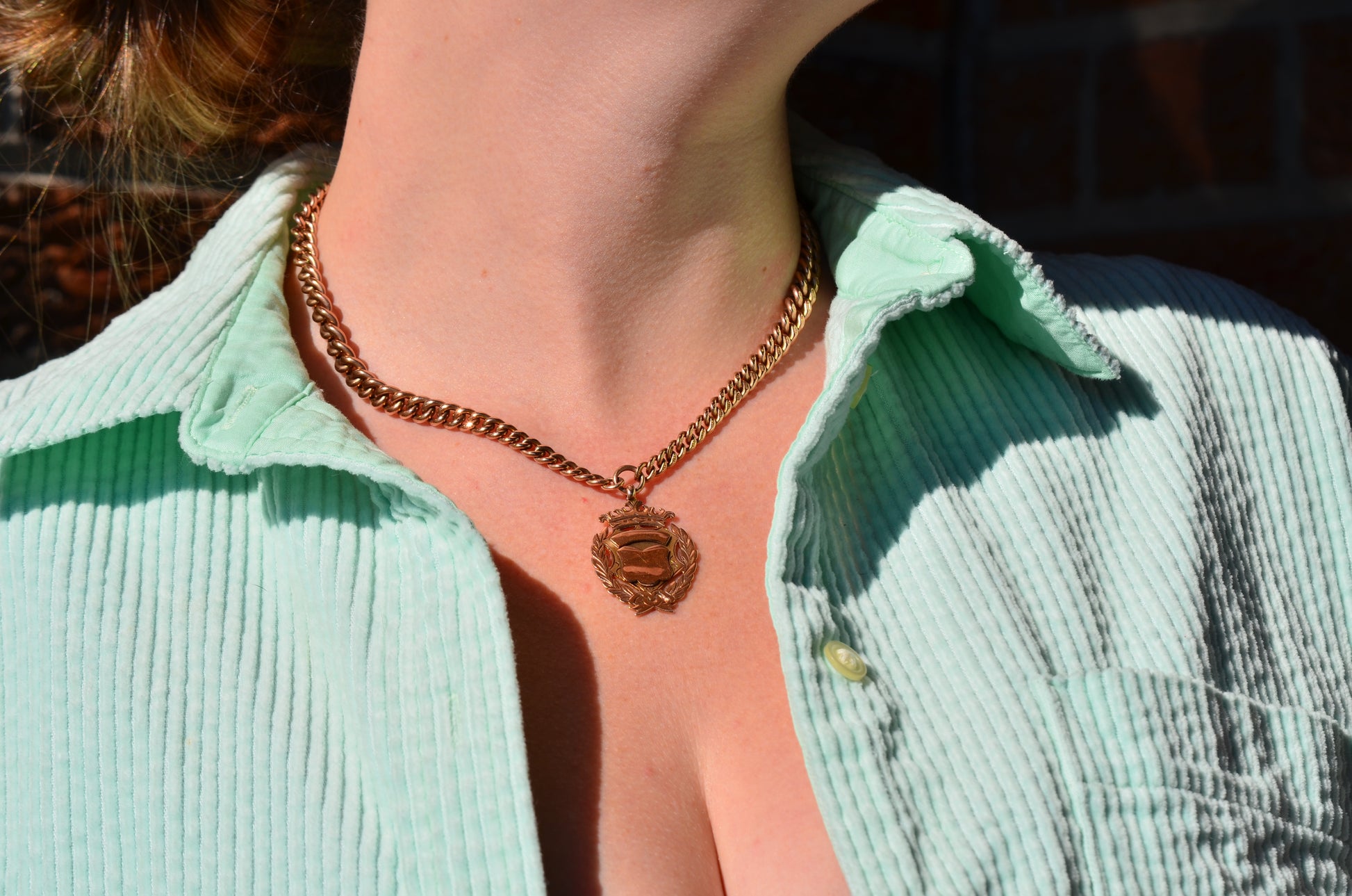 Each arm of the chain has a subtle and beautiful taper, widest in the middle and thinning out towards the clasp and the shield, for added depth and interest. The oxidation of the copper in the 9k gold has given the chain a delightful pinkish hue.