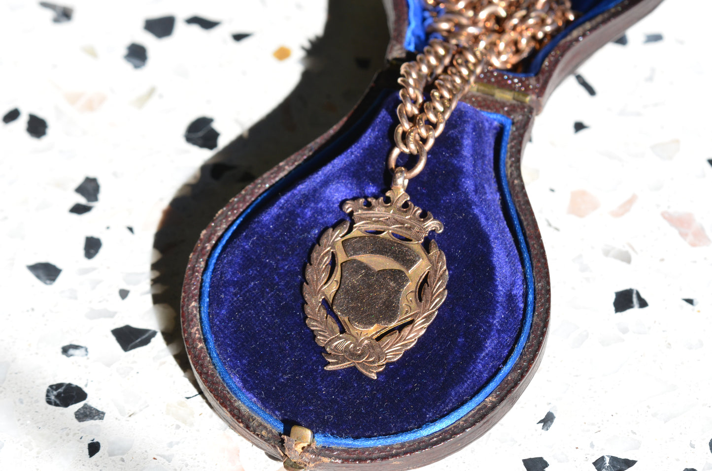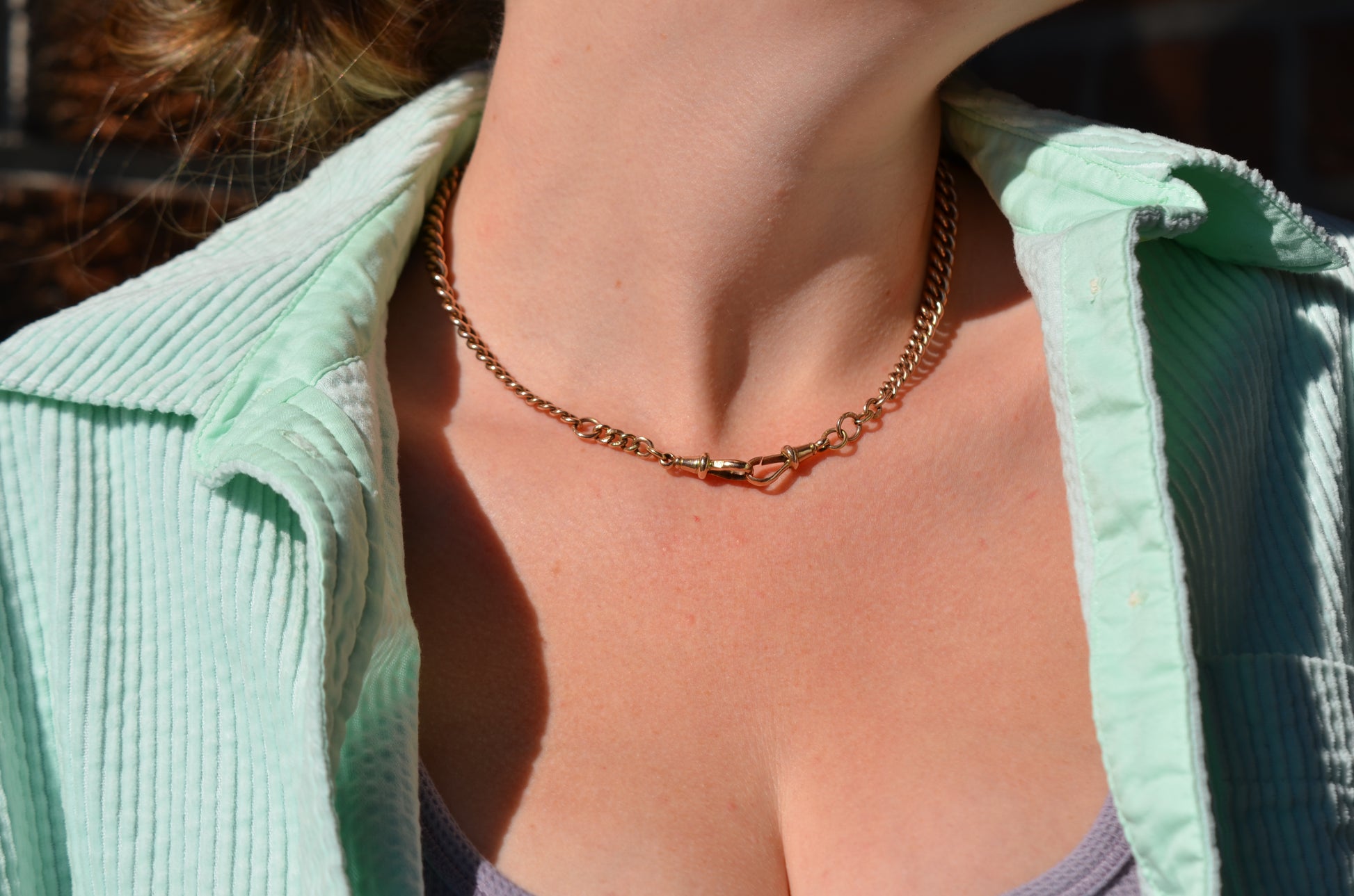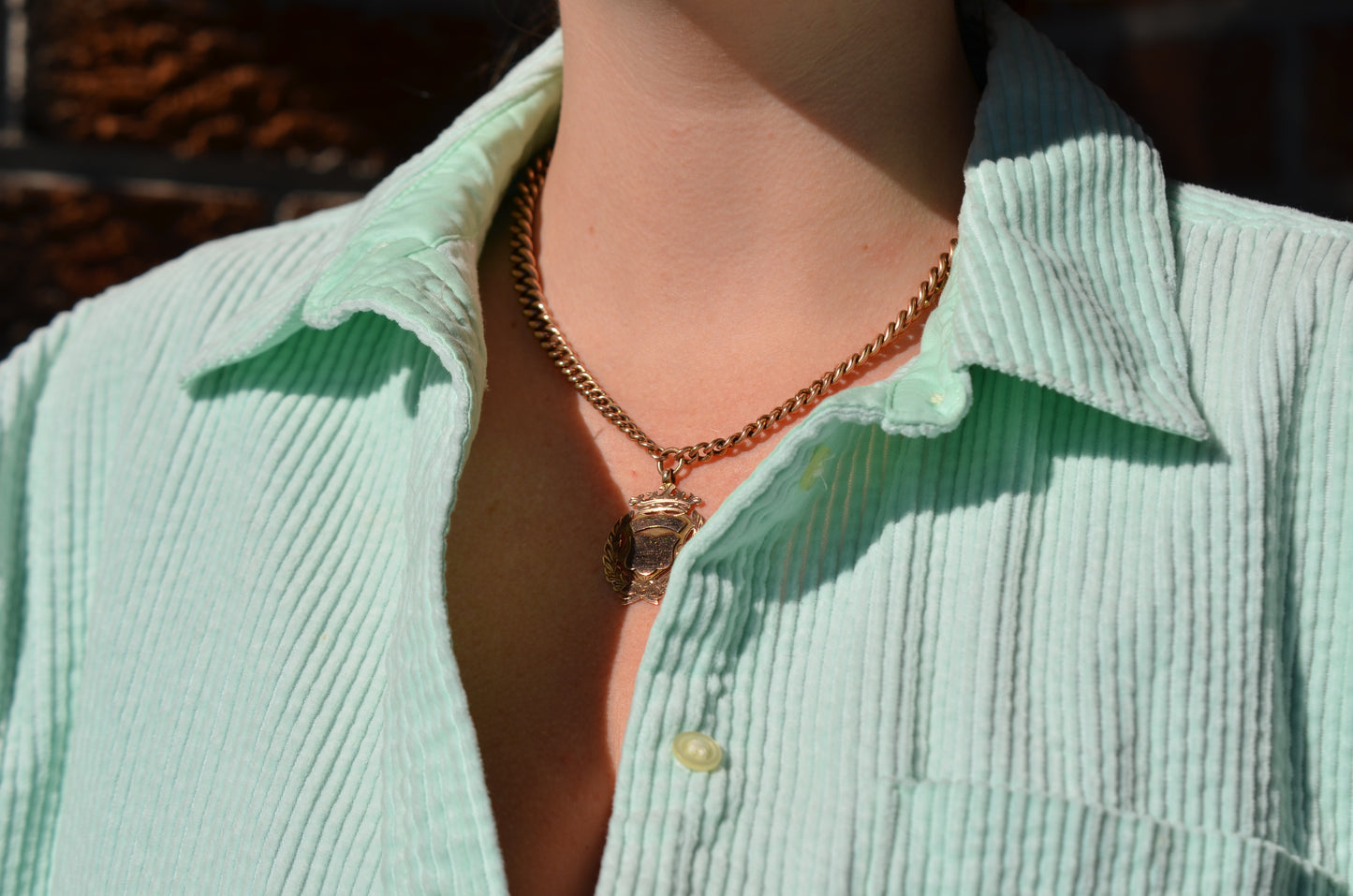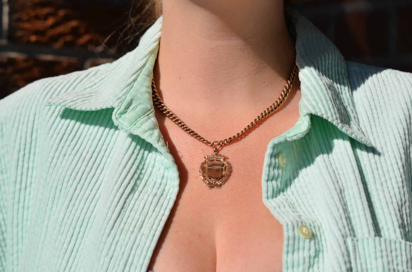 Each arm of the chain has a subtle and beautiful taper, widest in the middle and thinning out towards the clasp and the shield, for added depth and interest. The oxidation of the copper in the 9k gold has given the chain a delightful pinkish hue.