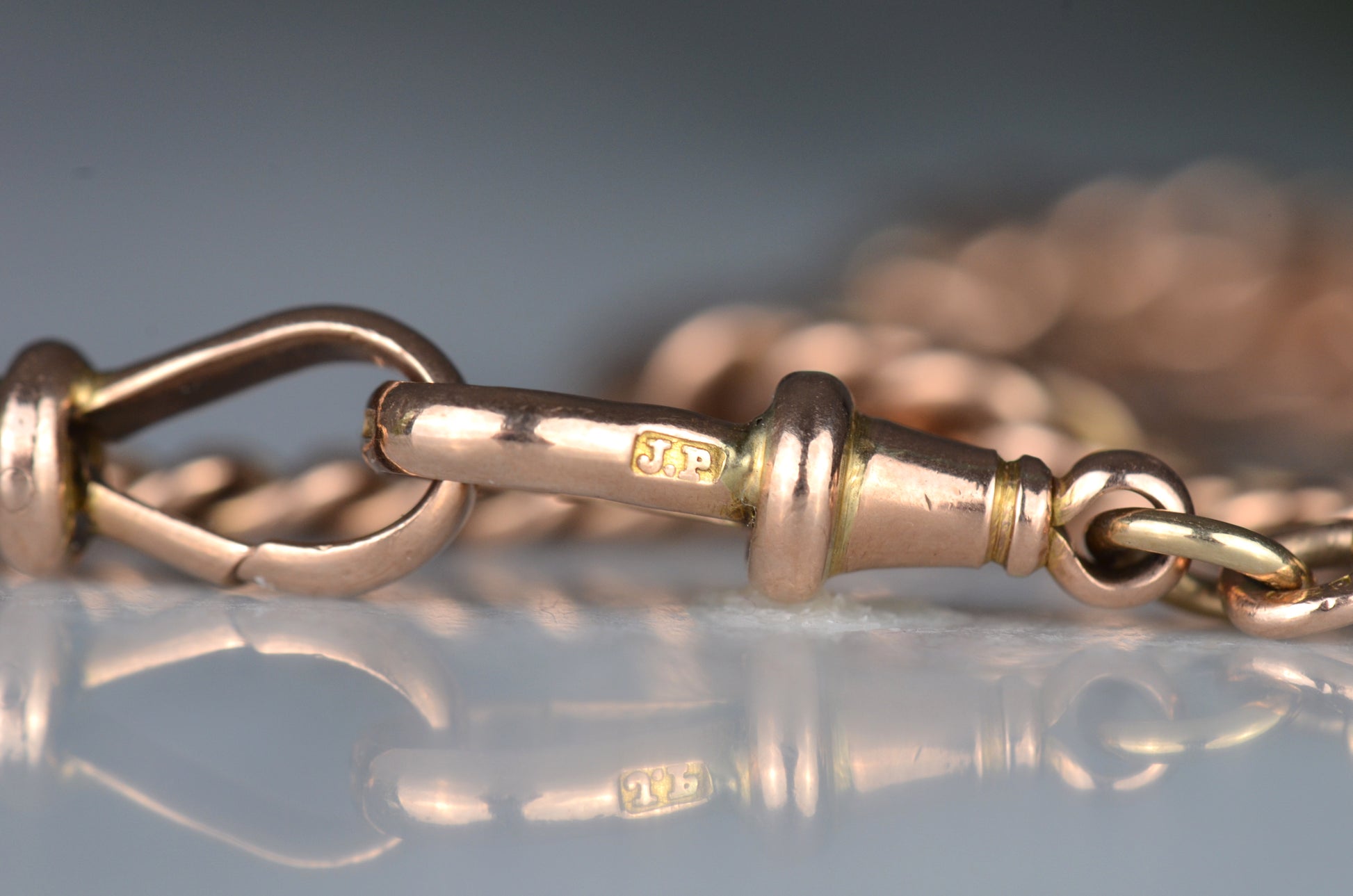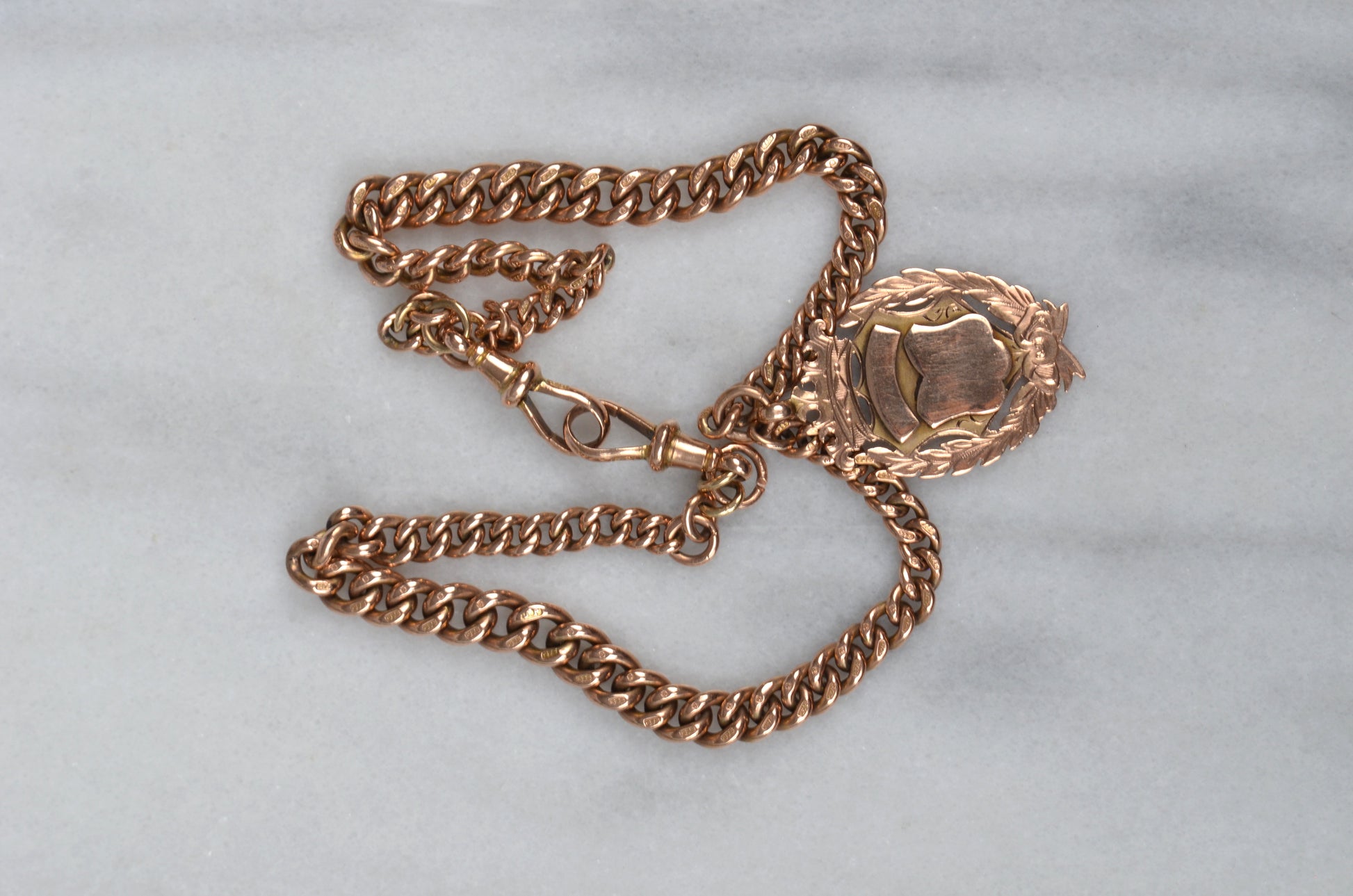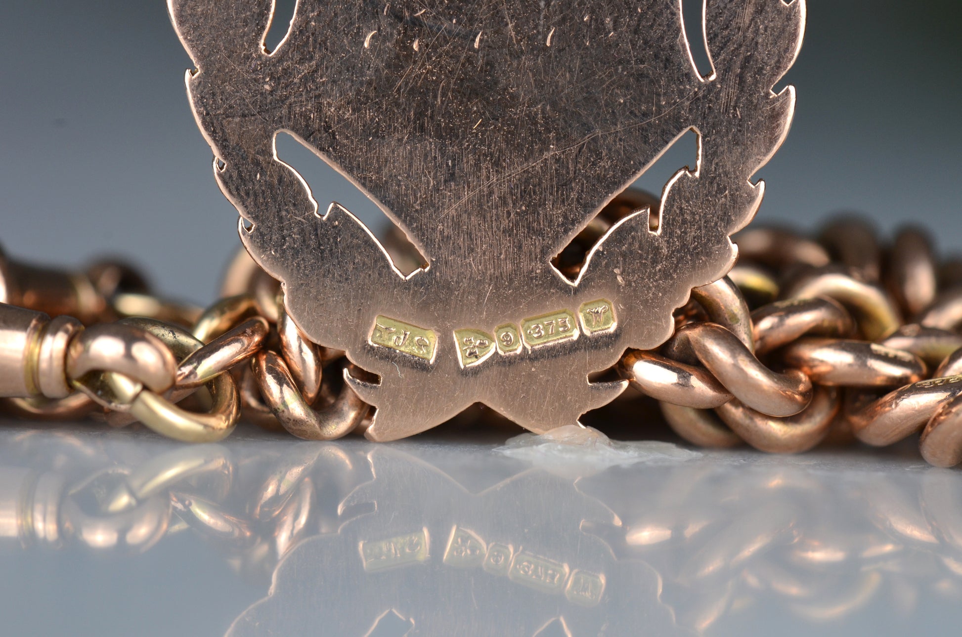 • 9k rosy gold, stamped throughout and tested; matched dog clips both stamped with maker's mark JP, each link stamped 9•375, shield has full British hallmarks for Chester 1922, maker's mark TJS
