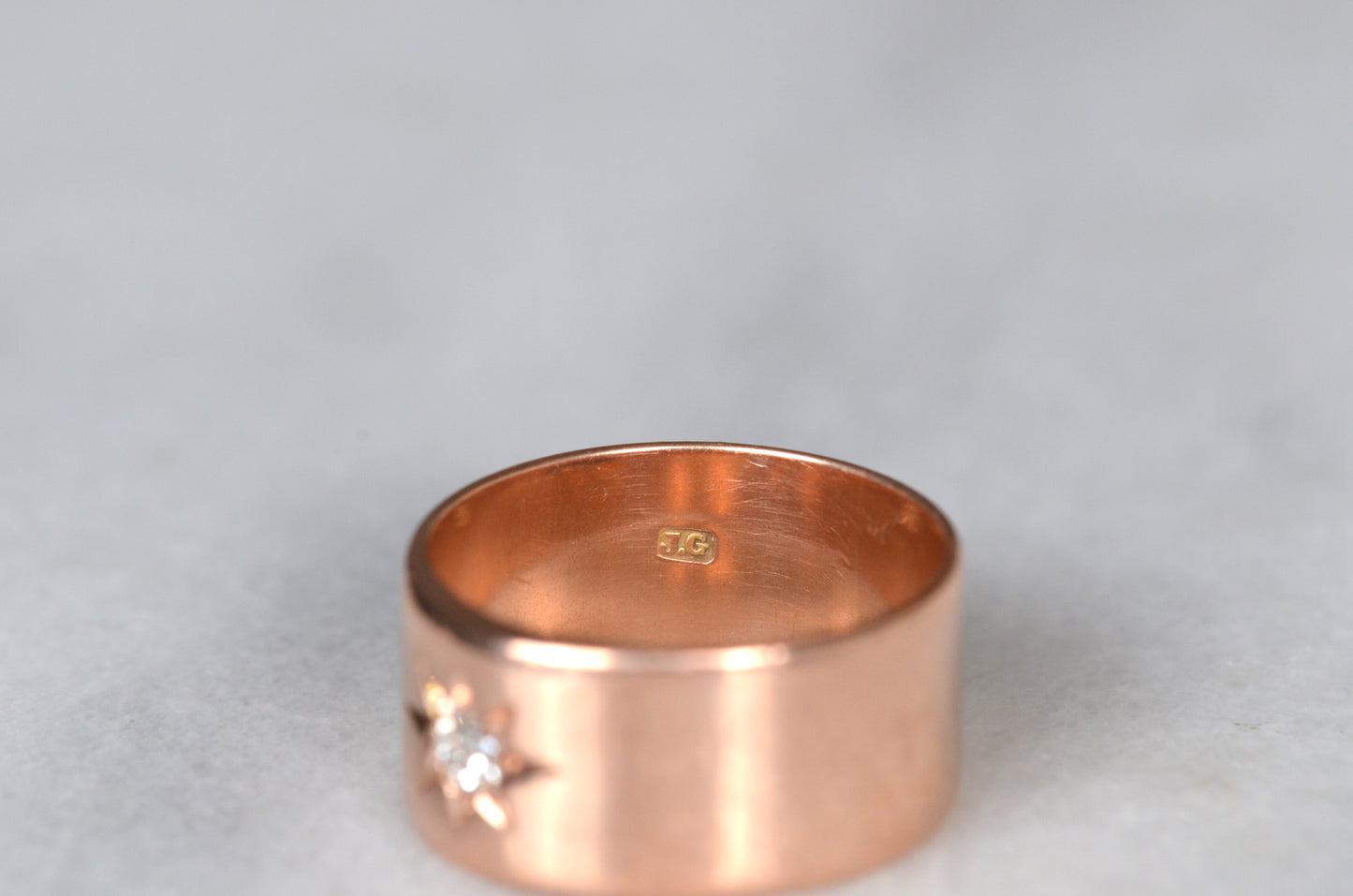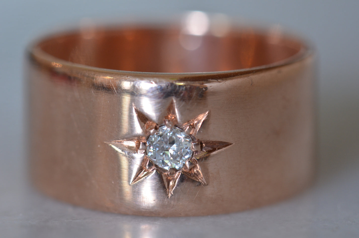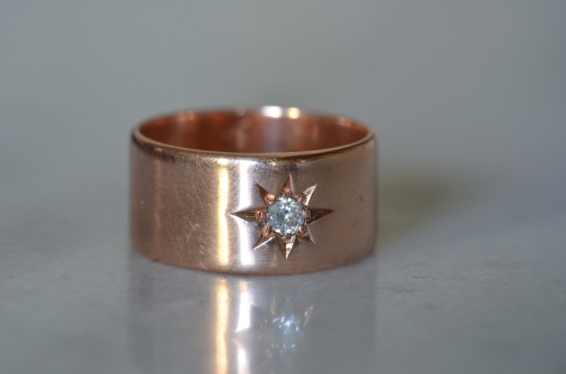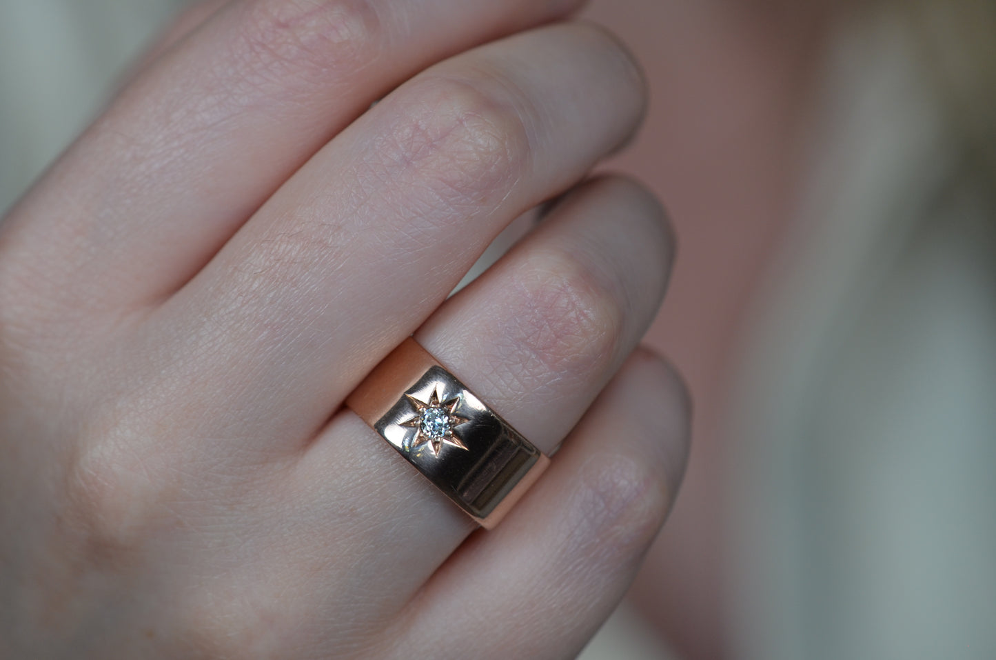 Luscious and weighty, with a bright sparkling diamond within a crisp star setting flush into the ring - this piece is an absolute dream! Wide across but slim between the fingers, this cigar-style ring is so comfortable you'll forget you're wearing it, until the sun catches the sea of rosy gold and rainbows flashing from the old mine cut diamond. Absolutely ideal as a statement piece, an everyday power stacker, or even a unique and unconventional engagement ring for her, him, or them.