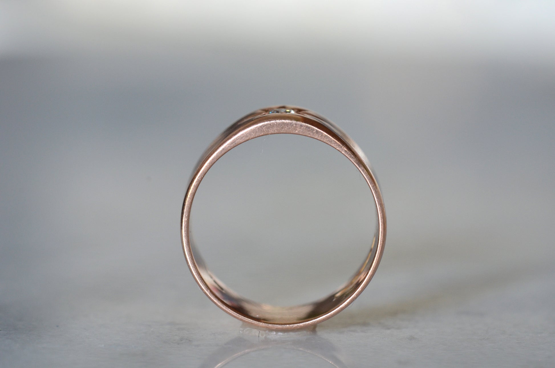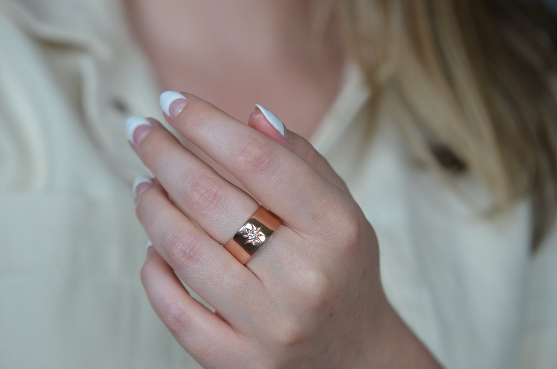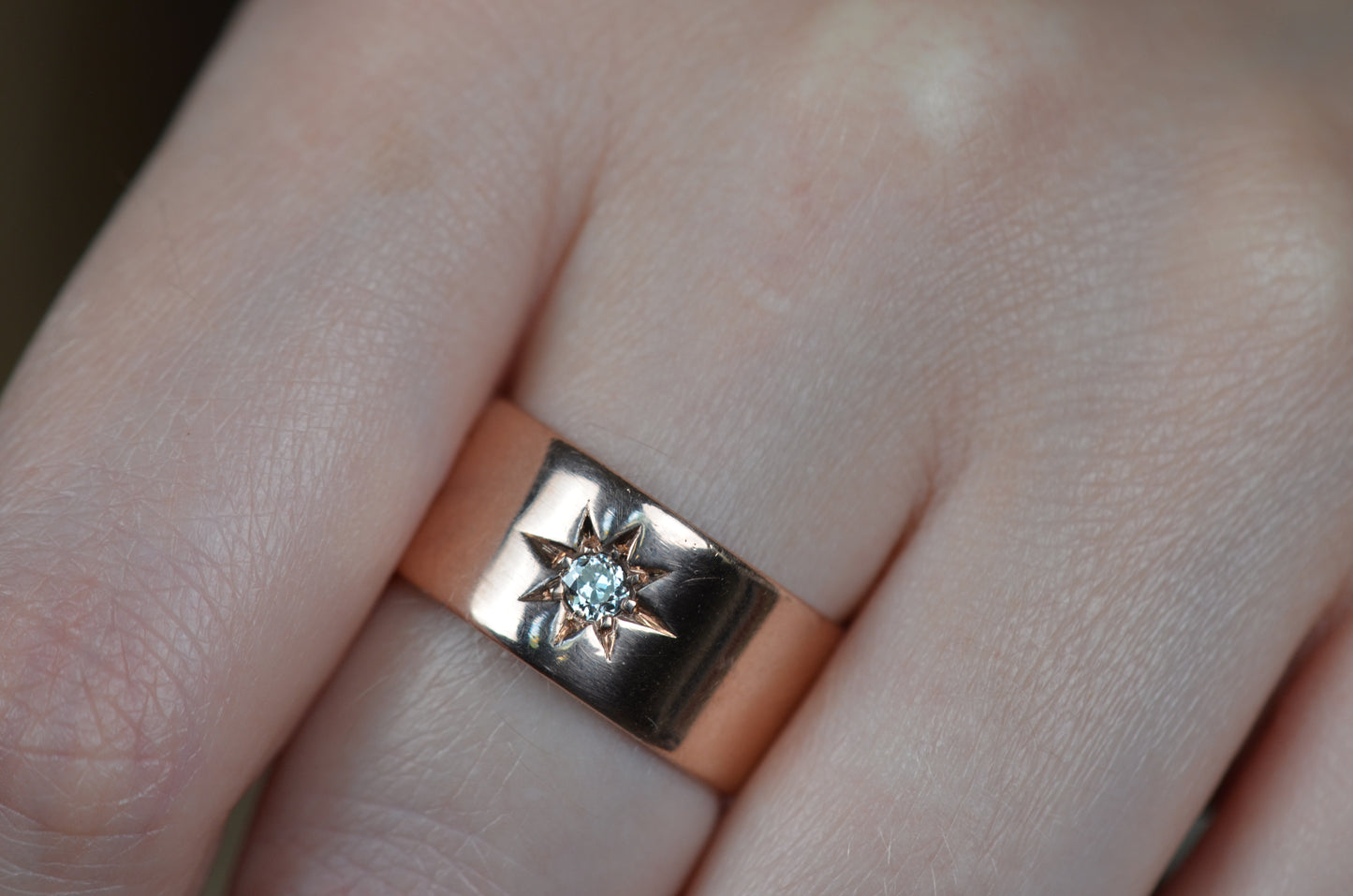 Luscious and weighty, with a bright sparkling diamond within a crisp star setting flush into the ring - this piece is an absolute dream! Wide across but slim between the fingers, this cigar-style ring is so comfortable you'll forget you're wearing it, until the sun catches the sea of rosy gold and rainbows flashing from the old mine cut diamond. Absolutely ideal as a statement piece, an everyday power stacker, or even a unique and unconventional engagement ring for her, him, or them.