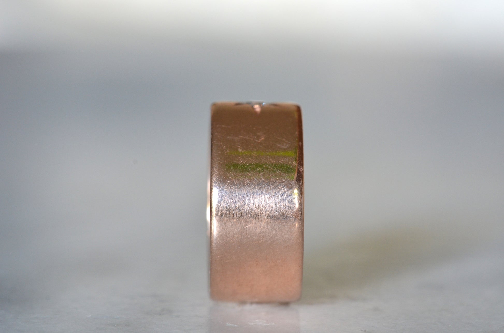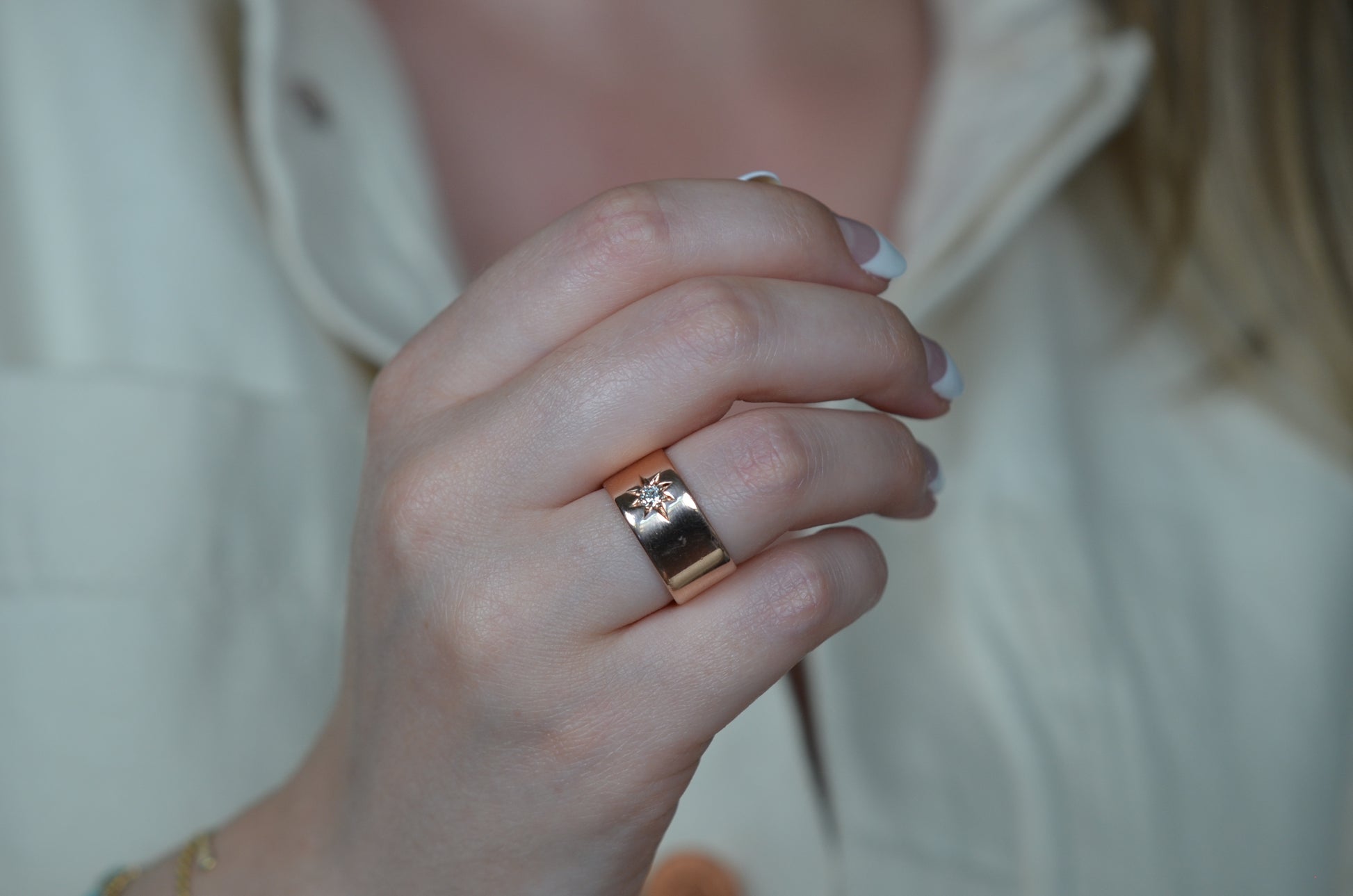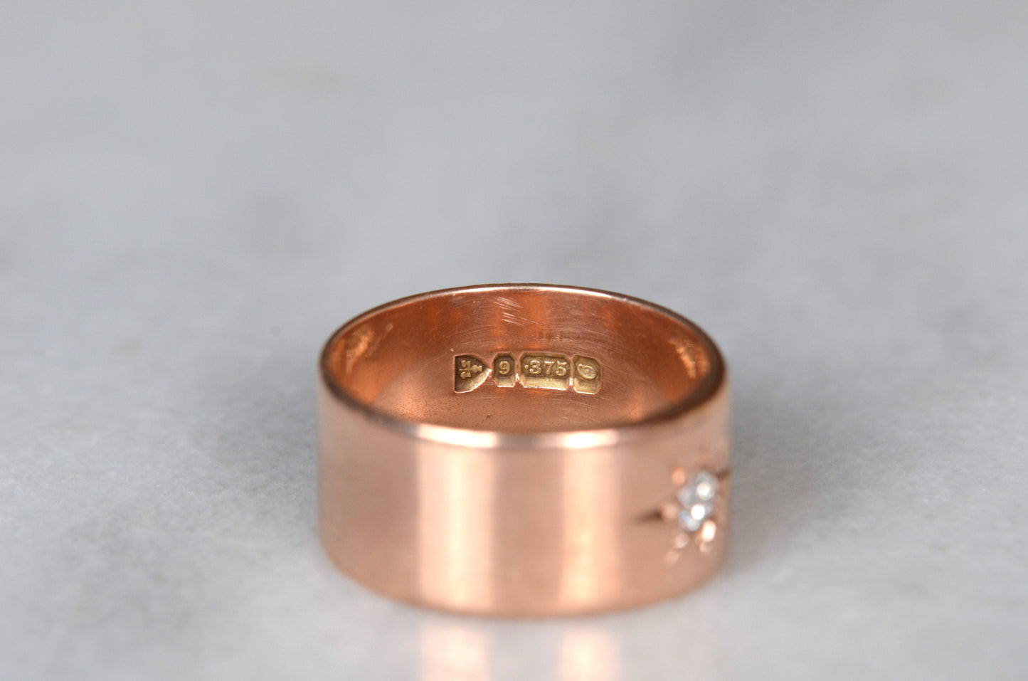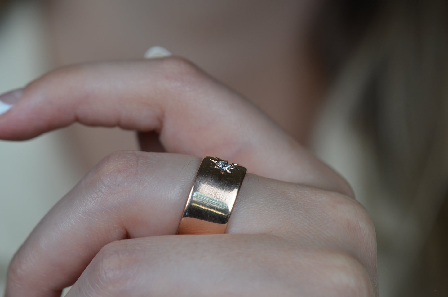 Luscious and weighty, with a bright sparkling diamond within a crisp star setting flush into the ring - this piece is an absolute dream! Wide across but slim between the fingers, this cigar-style ring is so comfortable you'll forget you're wearing it, until the sun catches the sea of rosy gold and rainbows flashing from the old mine cut diamond. Absolutely ideal as a statement piece, an everyday power stacker, or even a unique and unconventional engagement ring for her, him, or them.