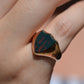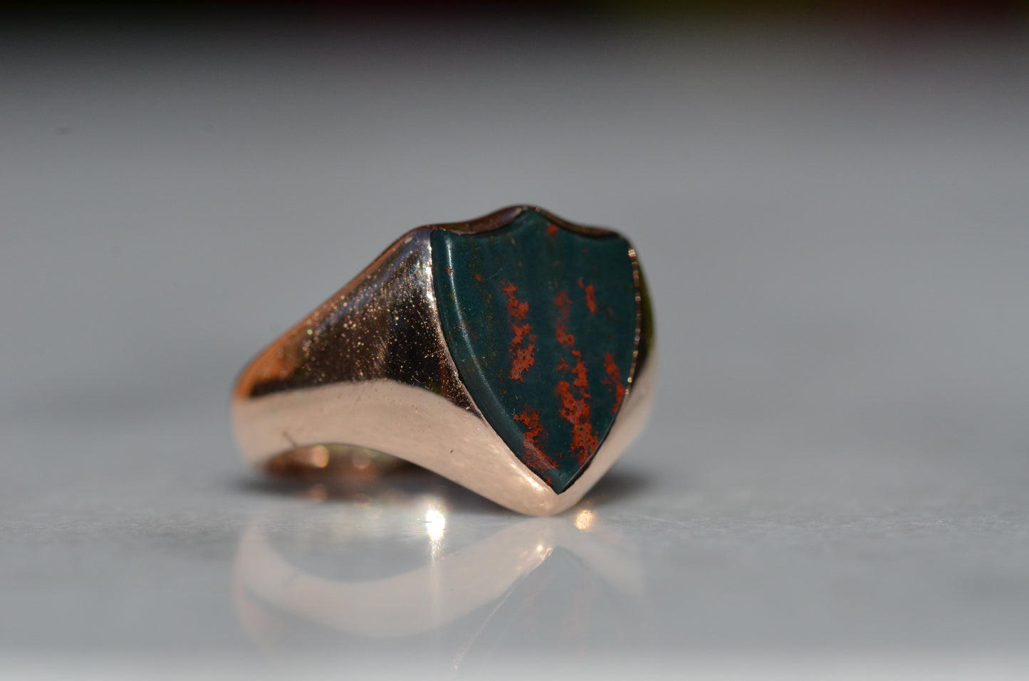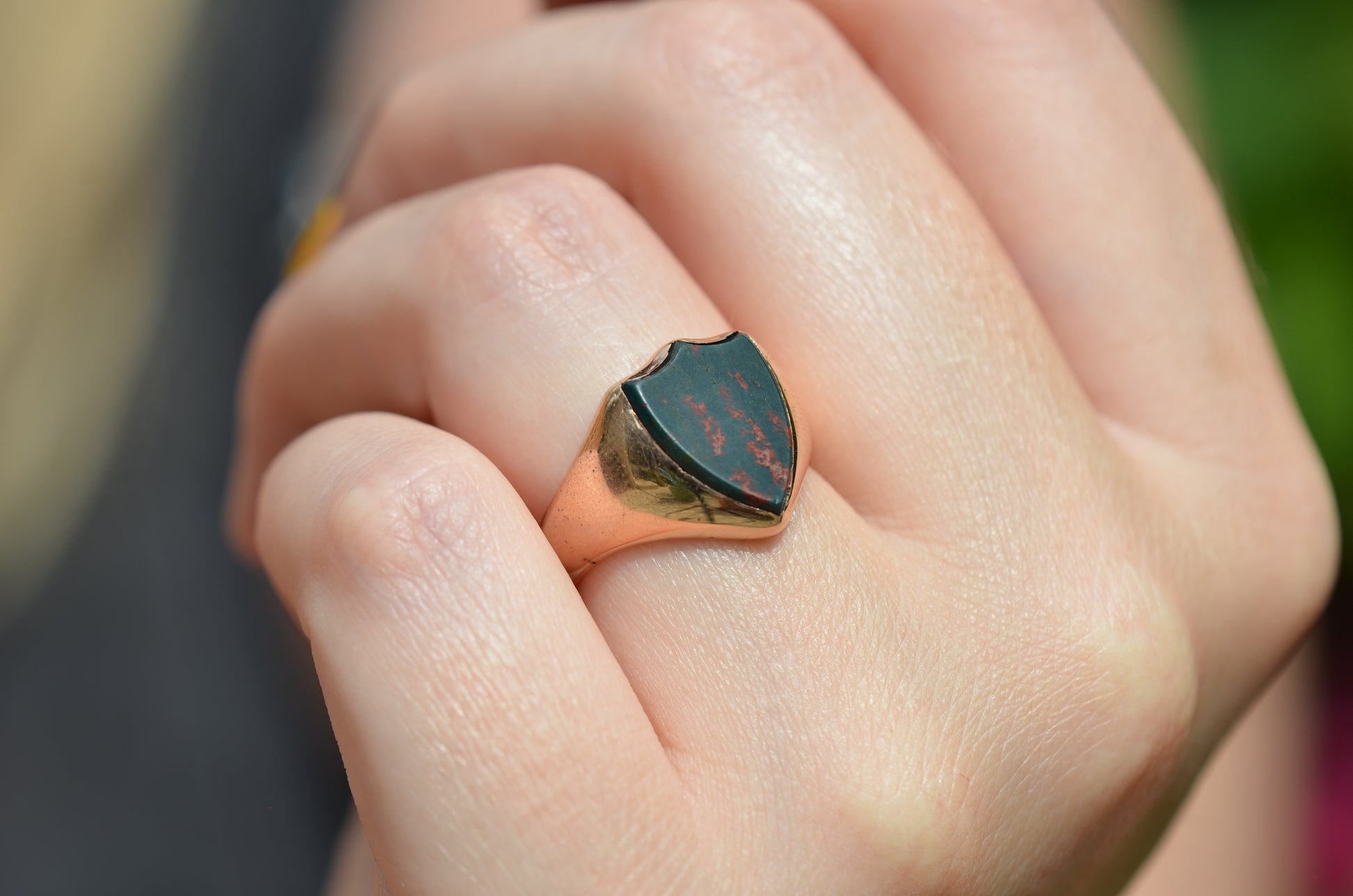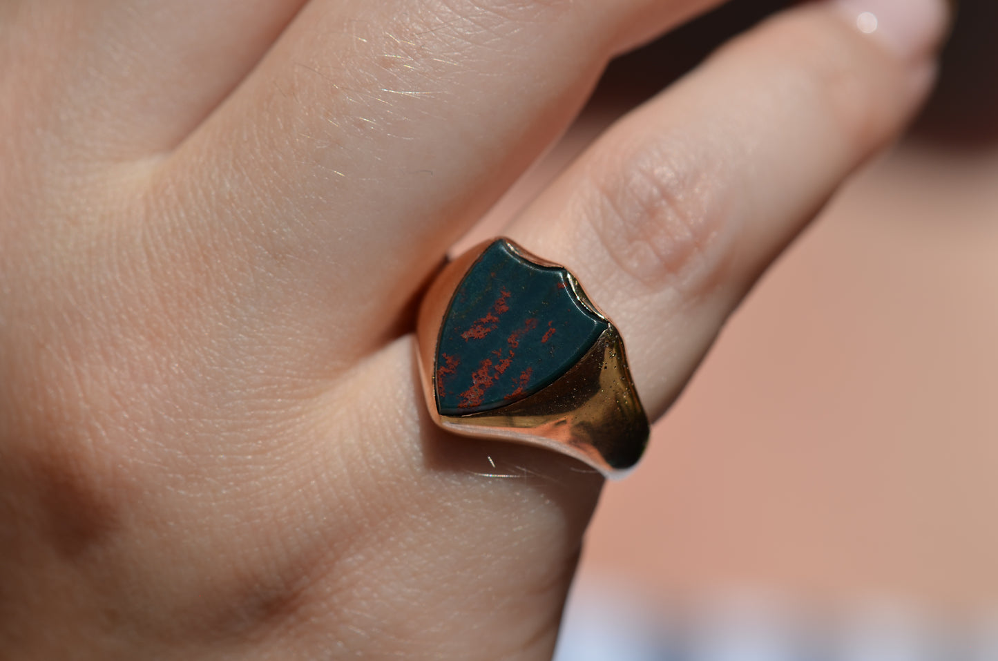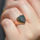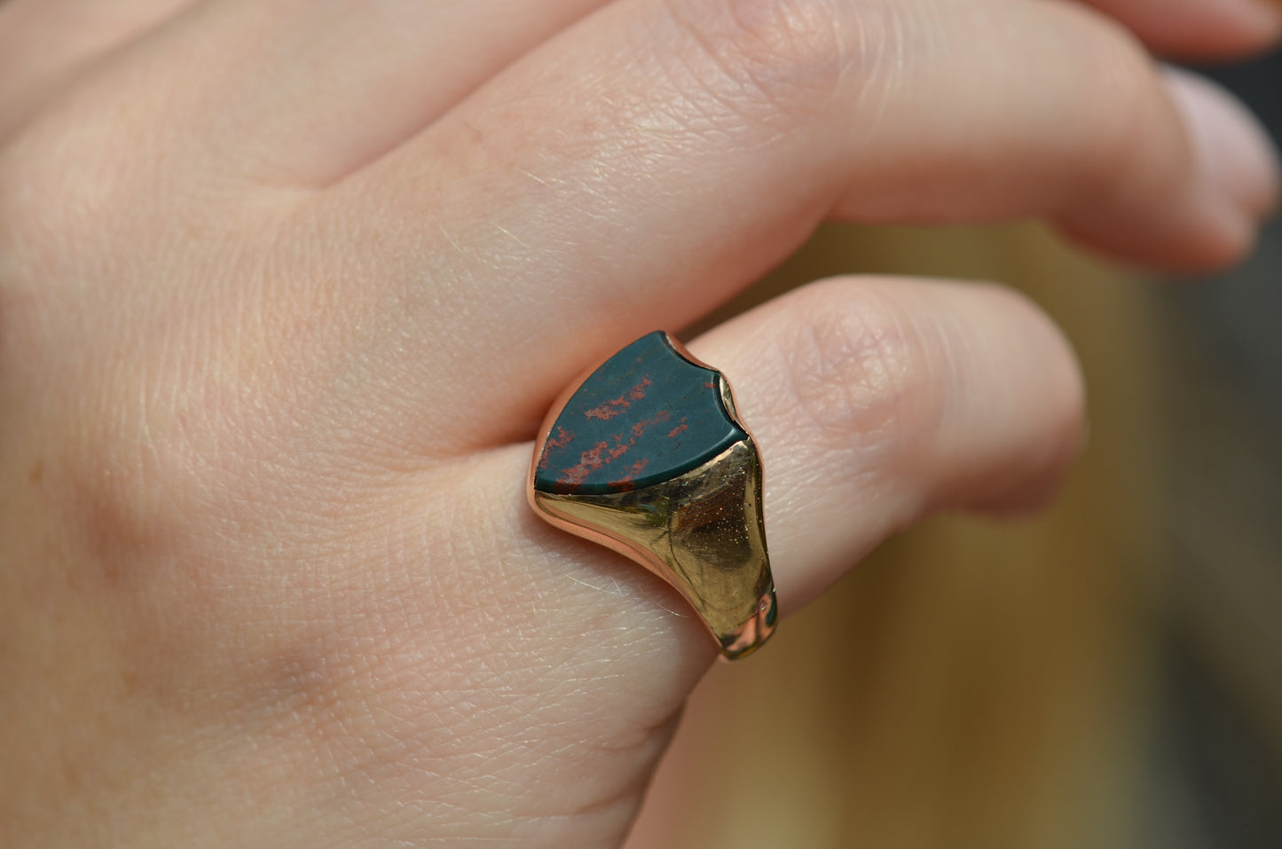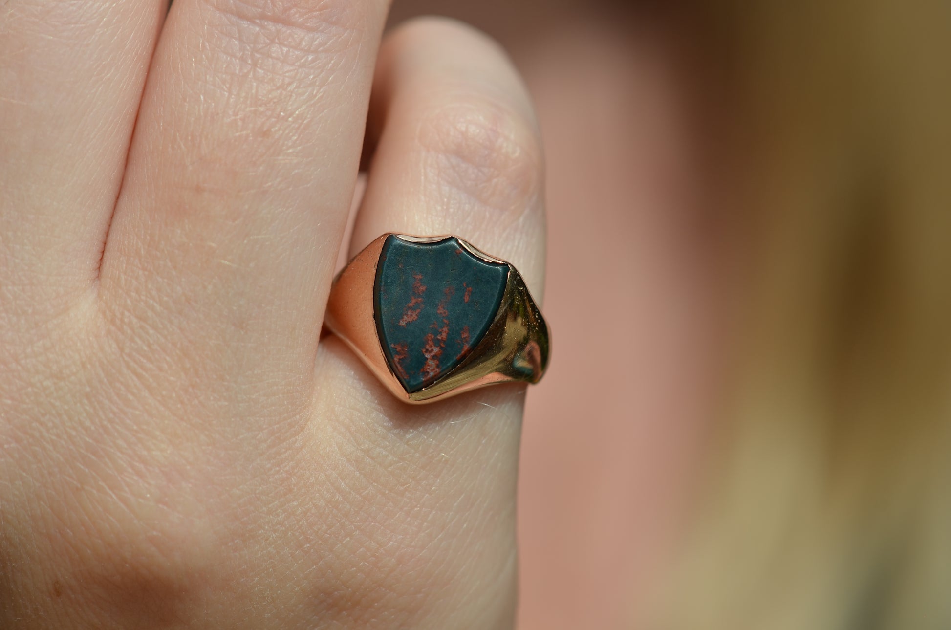 Deep and moody, we love the depth of inky dark green flecked with red that is so unique to bloodstone - a specific variety of cryptocrystalline quartz. The subtle sheen of the stone is perfectly complemented by the broken-in patina of the gold band, and the bold shield shape of the stone and mount. A perfect unisex piece for anyone looking for a mysterious conversation starter.