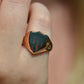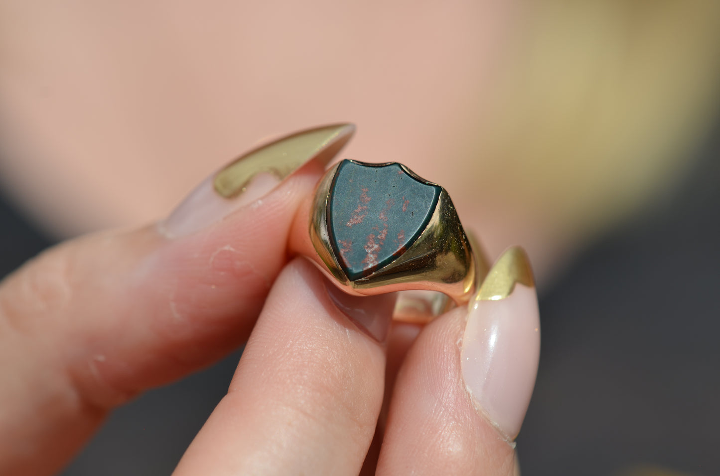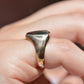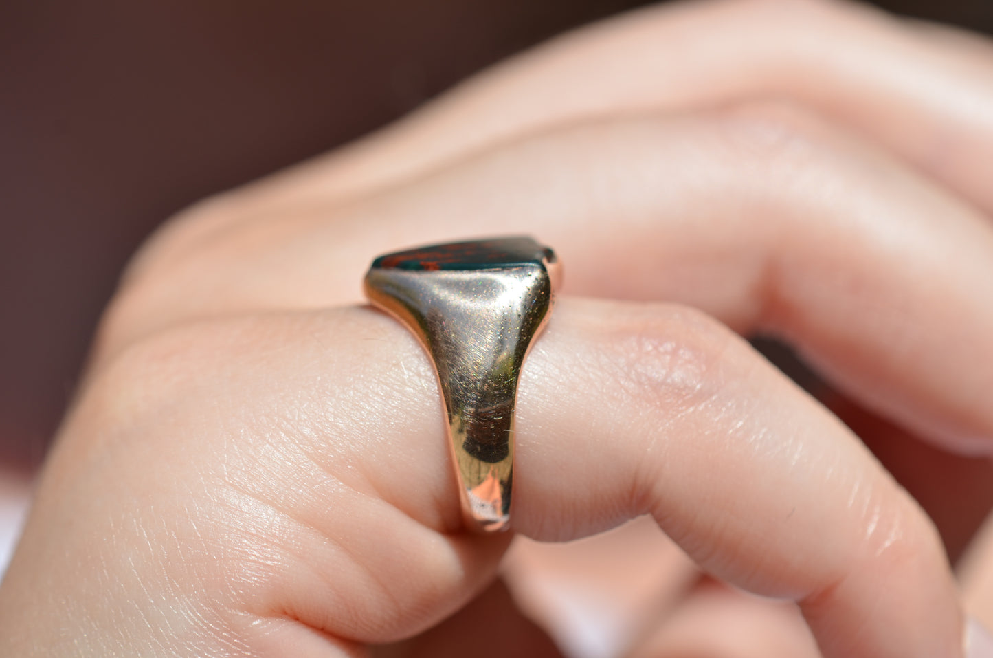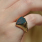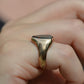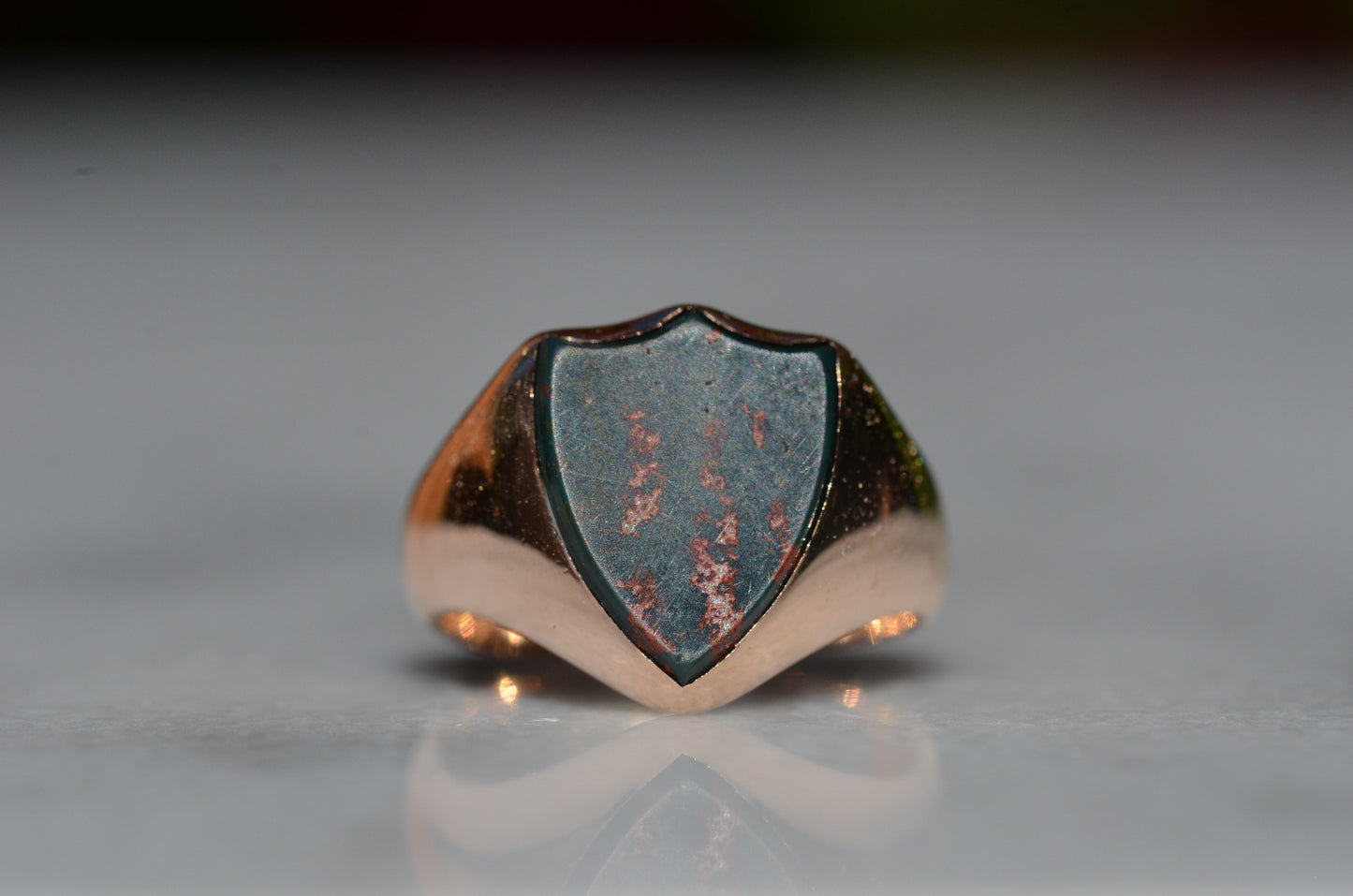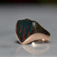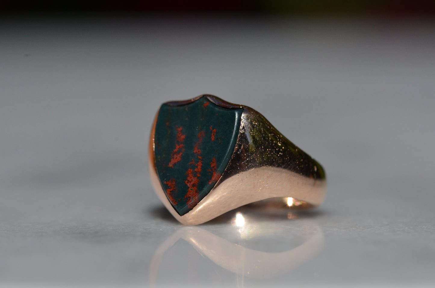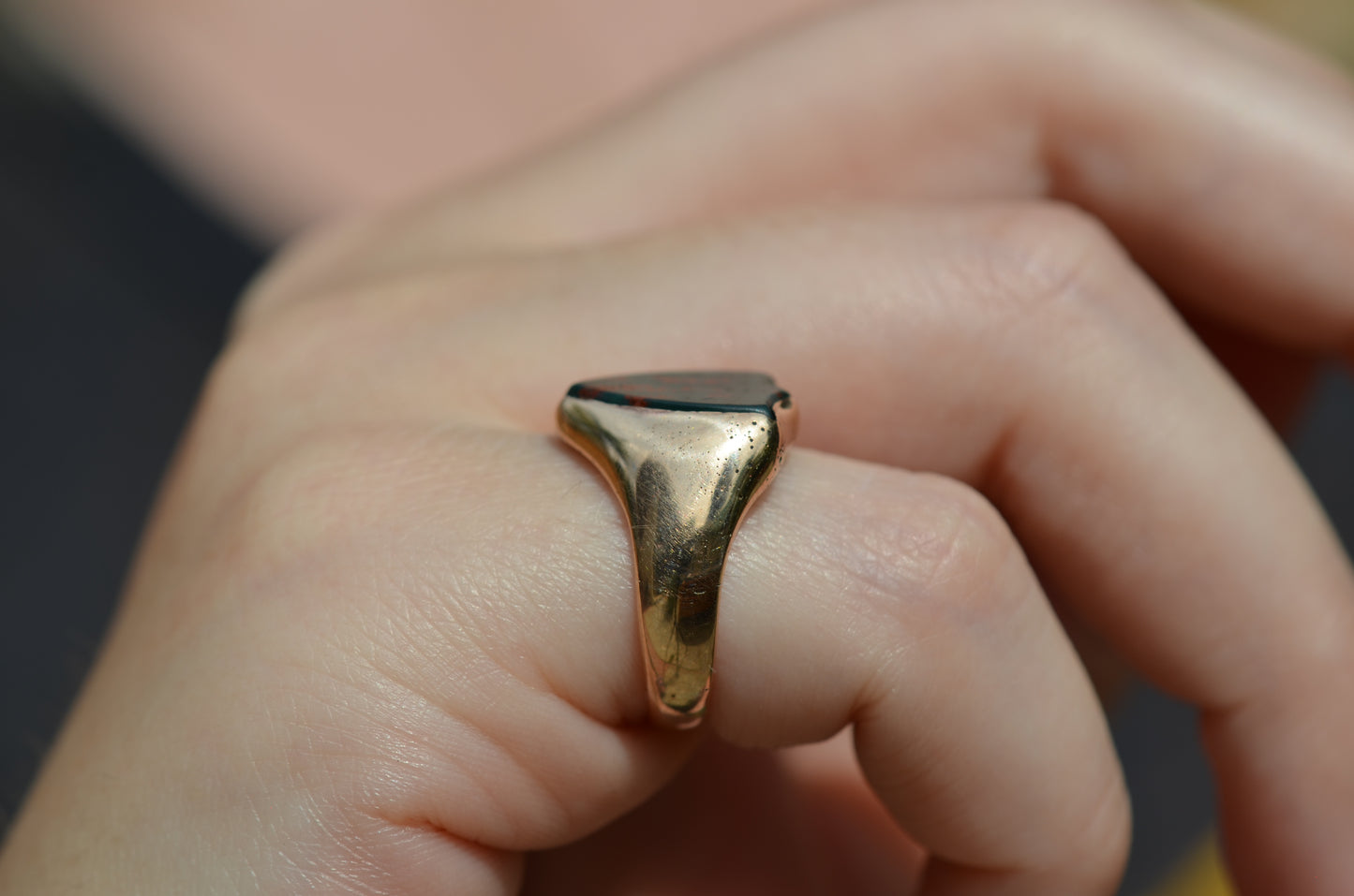 Deep and moody, we love the depth of inky dark green flecked with red that is so unique to bloodstone - a specific variety of cryptocrystalline quartz. The subtle sheen of the stone is perfectly complemented by the broken-in patina of the gold band, and the bold shield shape of the stone and mount. A perfect unisex piece for anyone looking for a mysterious conversation starter.