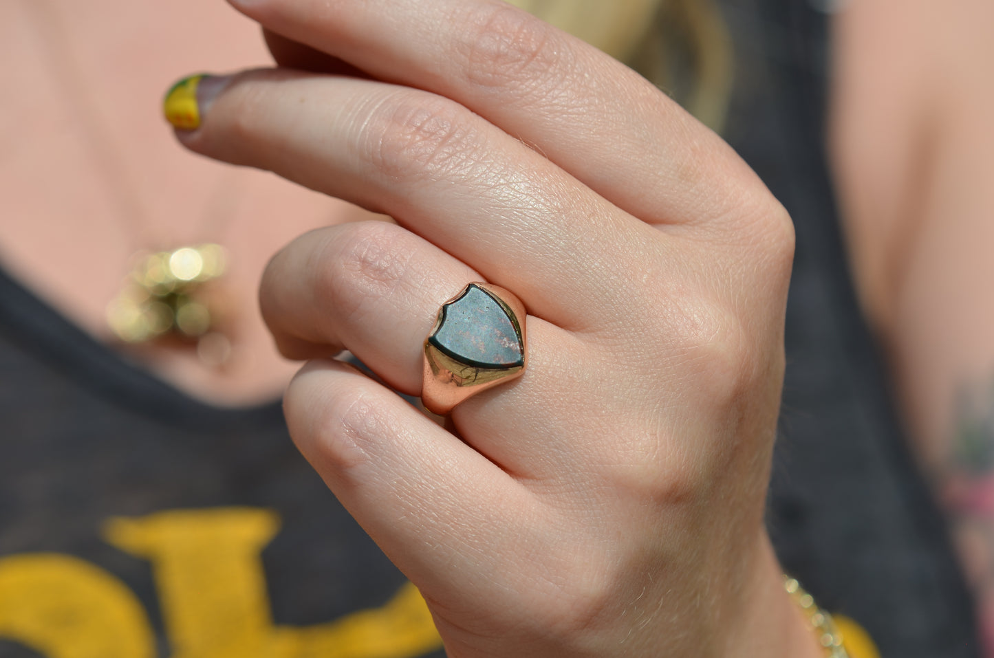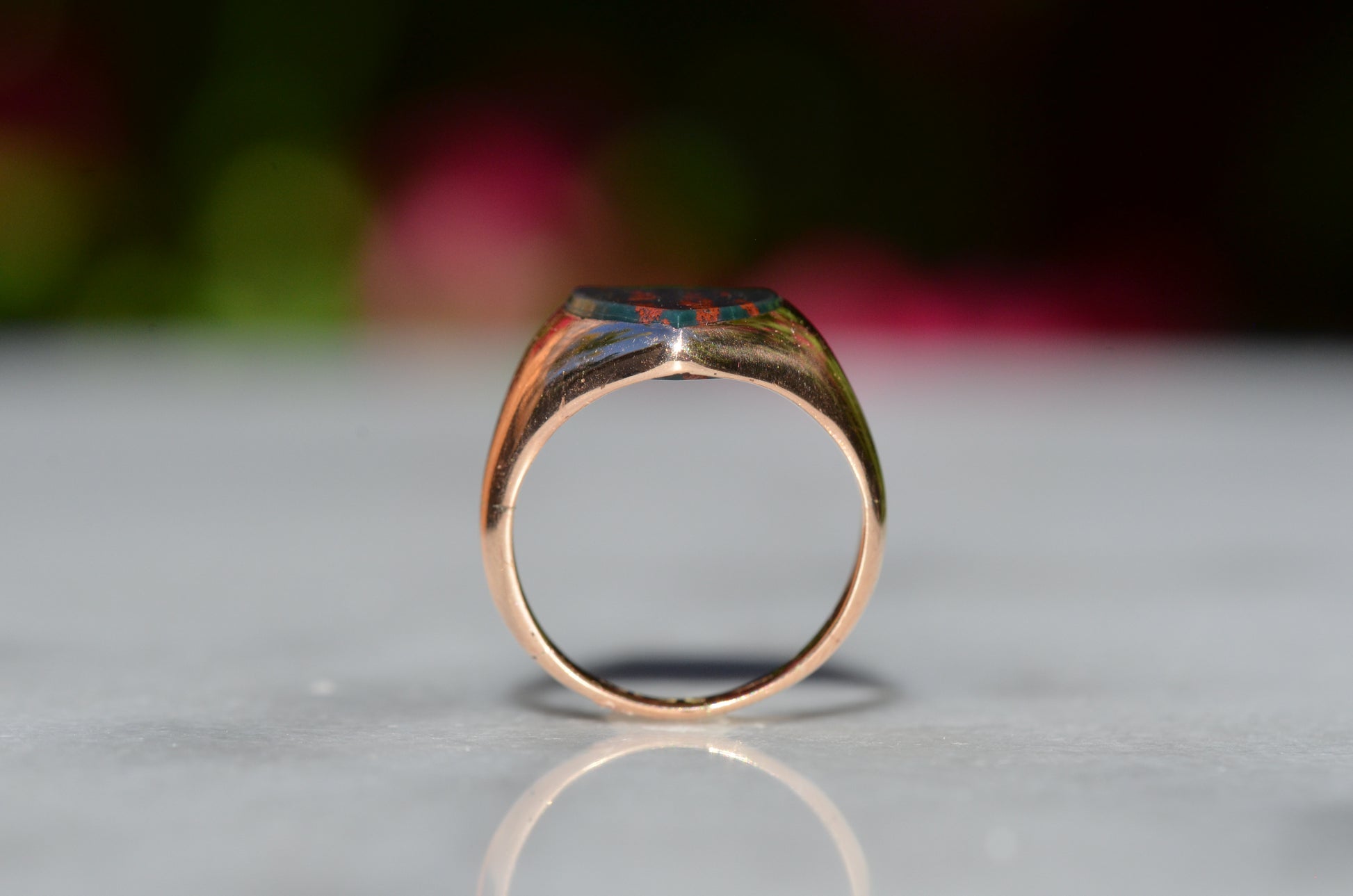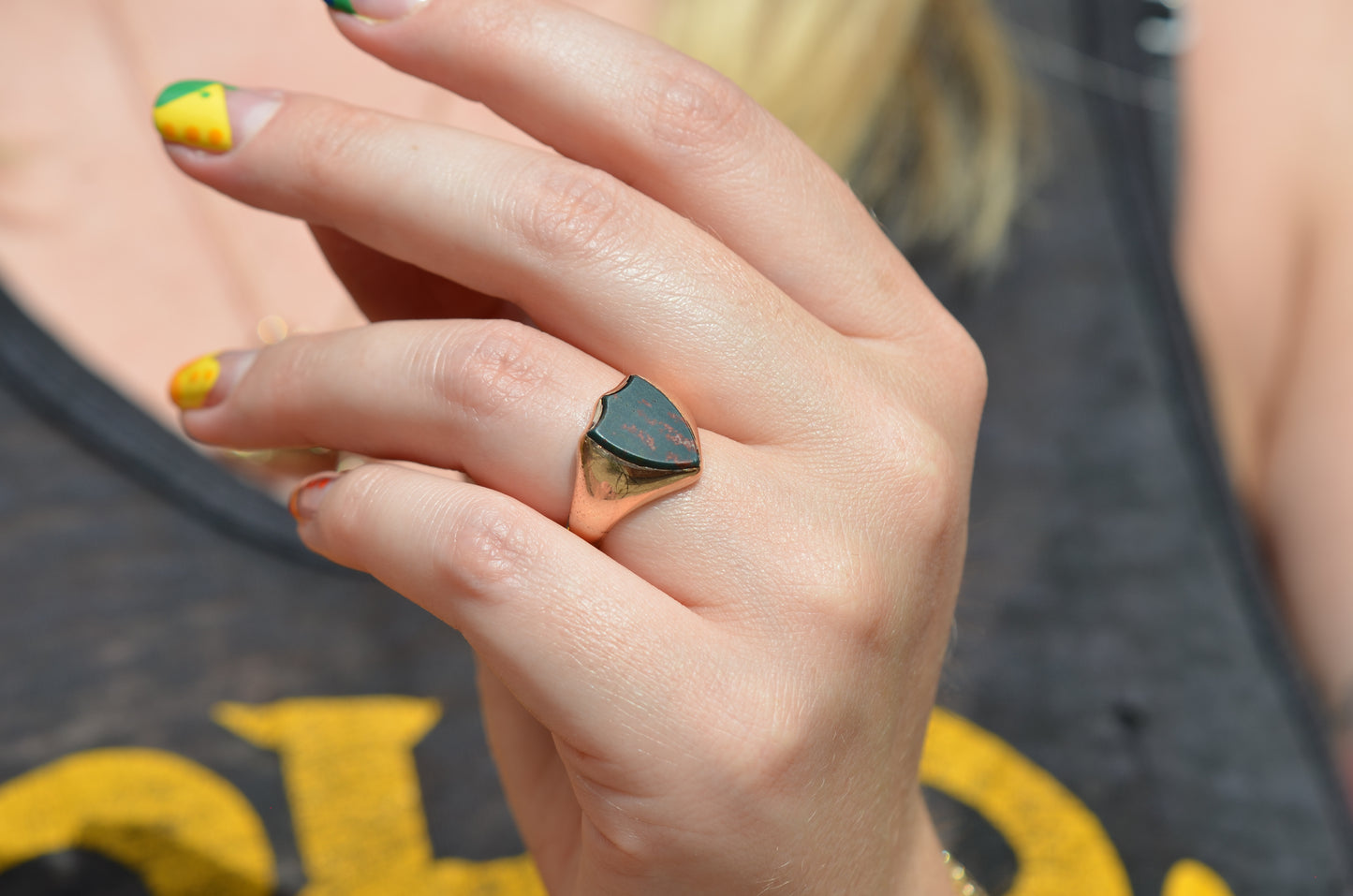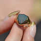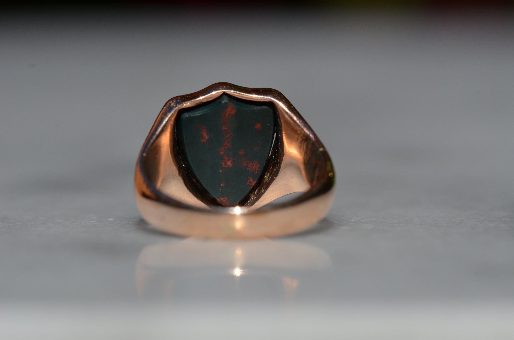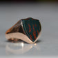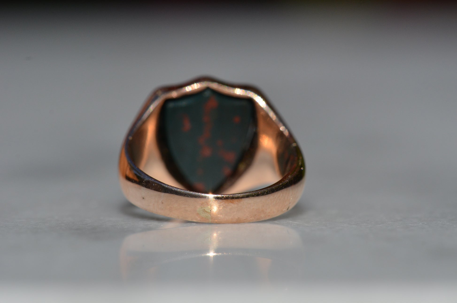 Deep and moody, we love the depth of inky dark green flecked with red that is so unique to bloodstone - a specific variety of cryptocrystalline quartz. The subtle sheen of the stone is perfectly complemented by the broken-in patina of the gold band, and the bold shield shape of the stone and mount. A perfect unisex piece for anyone looking for a mysterious conversation starter.