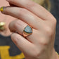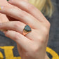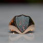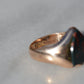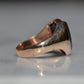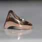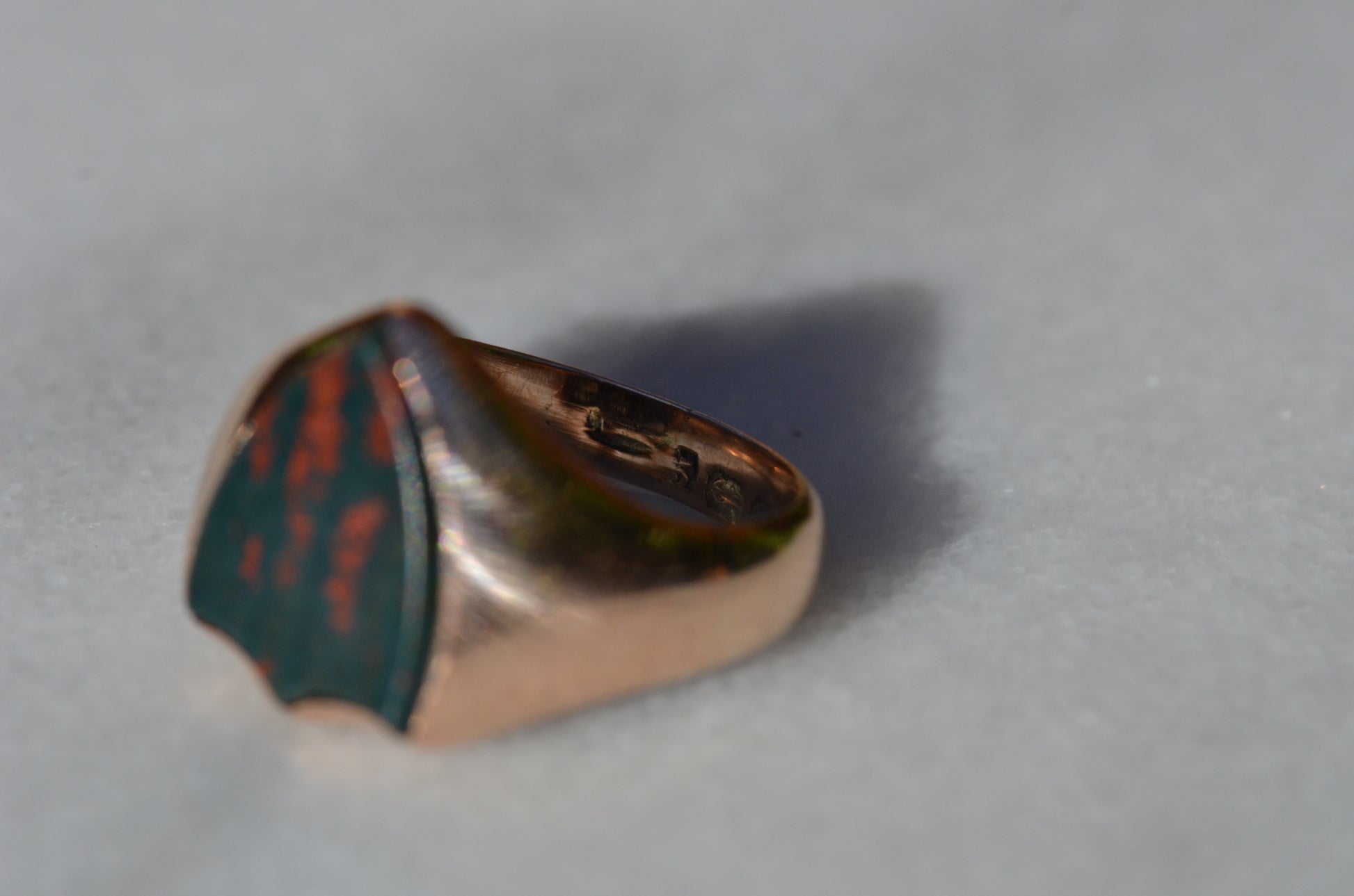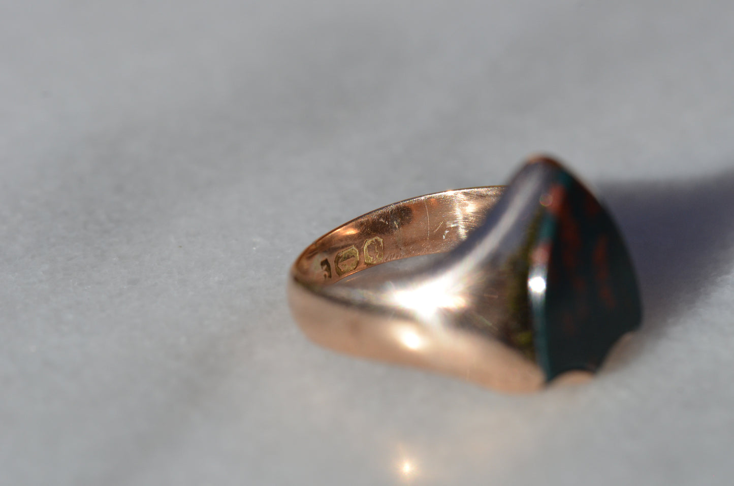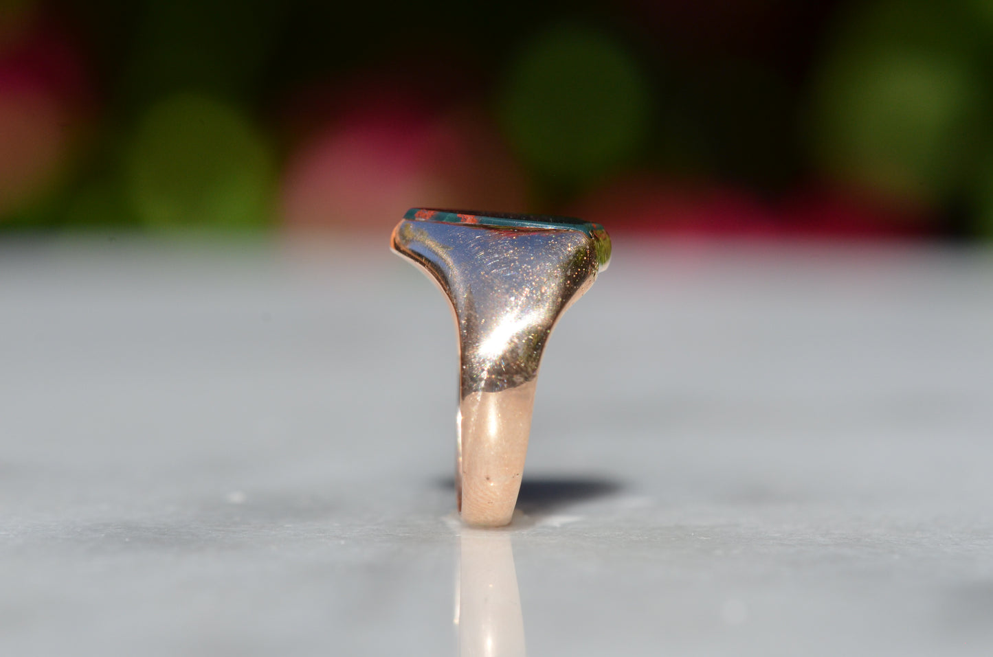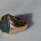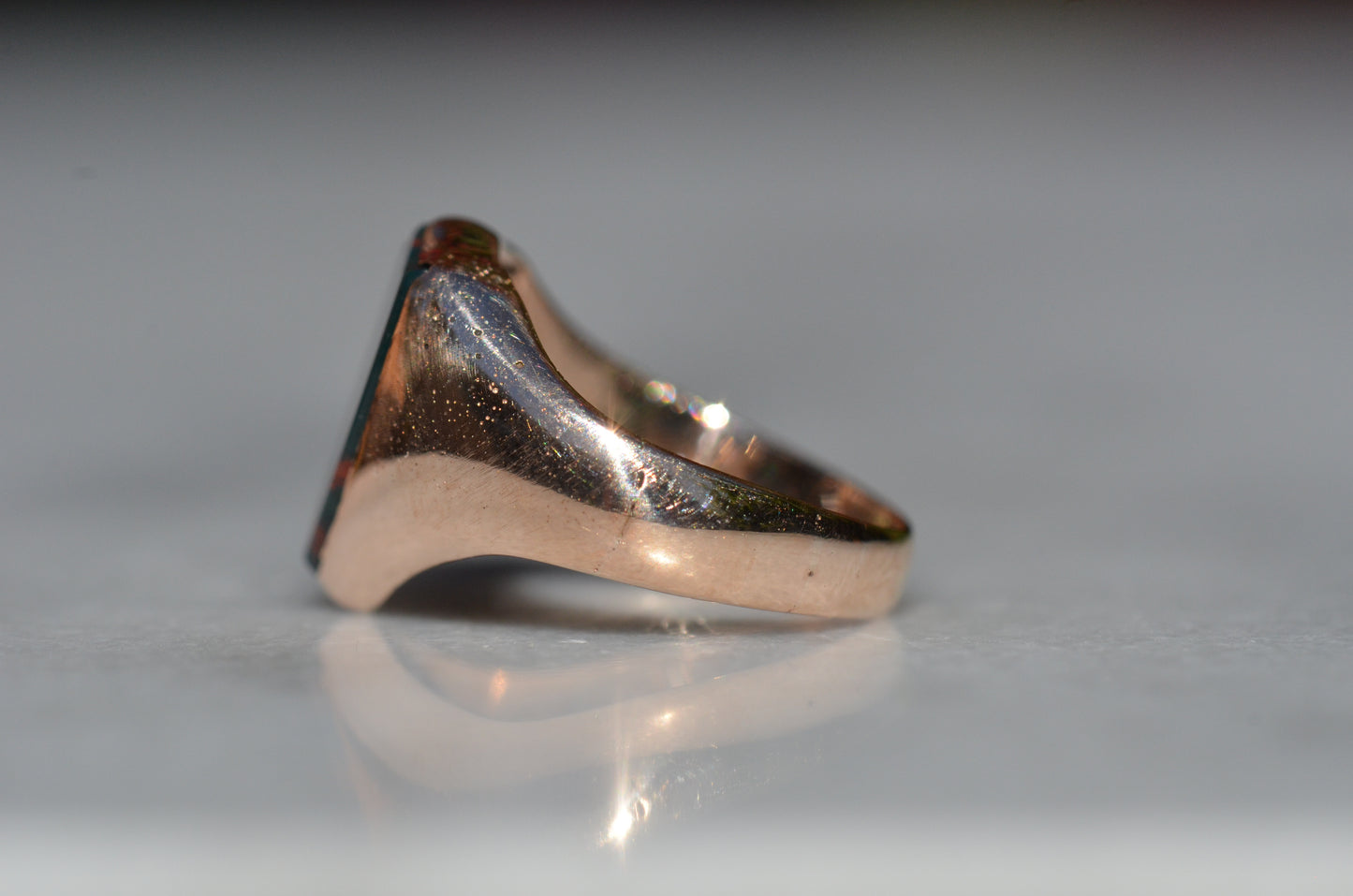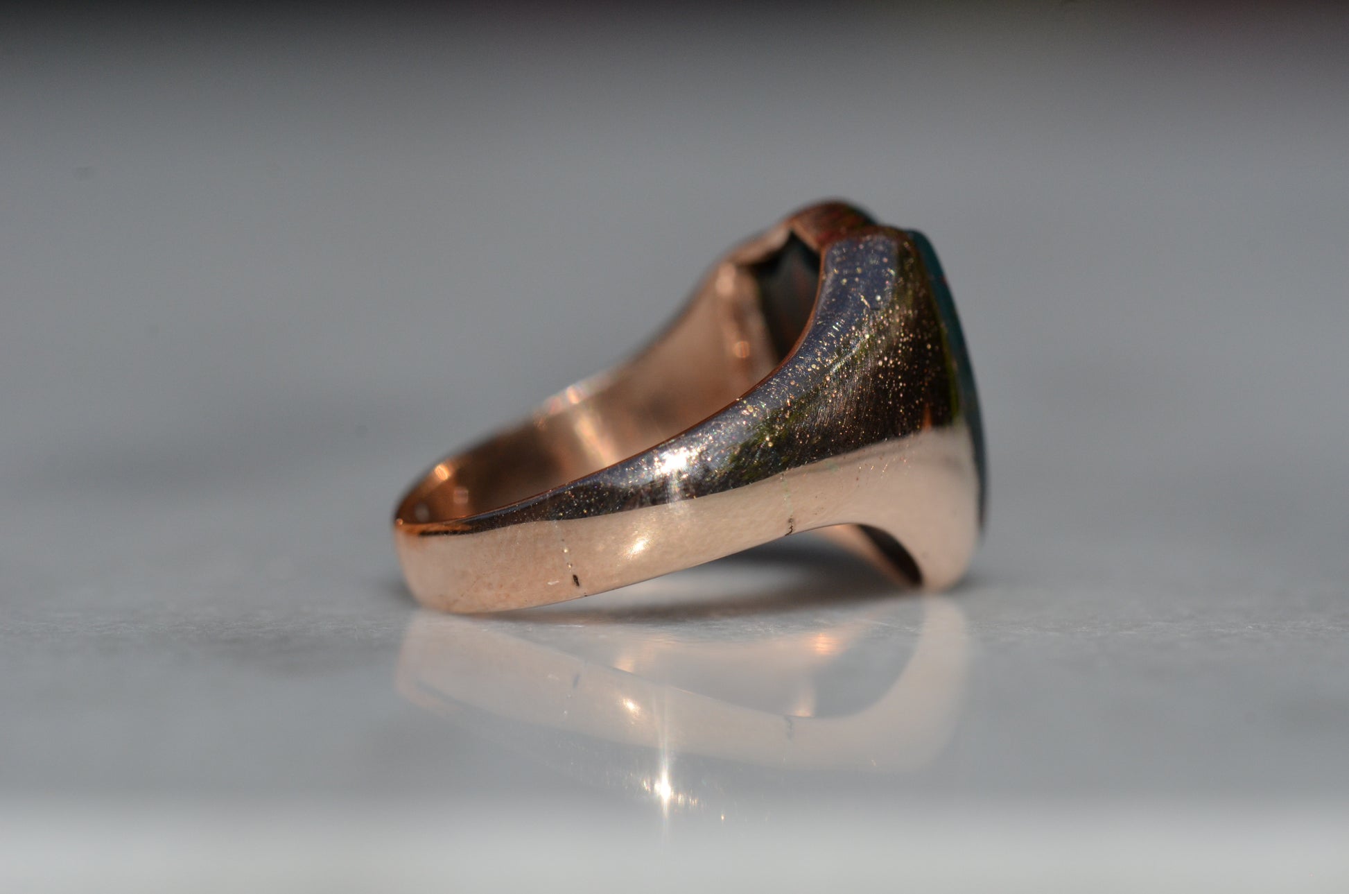 Deep and moody, we love the depth of inky dark green flecked with red that is so unique to bloodstone - a specific variety of cryptocrystalline quartz. The subtle sheen of the stone is perfectly complemented by the broken-in patina of the gold band, and the bold shield shape of the stone and mount. A perfect unisex piece for anyone looking for a mysterious conversation starter.
