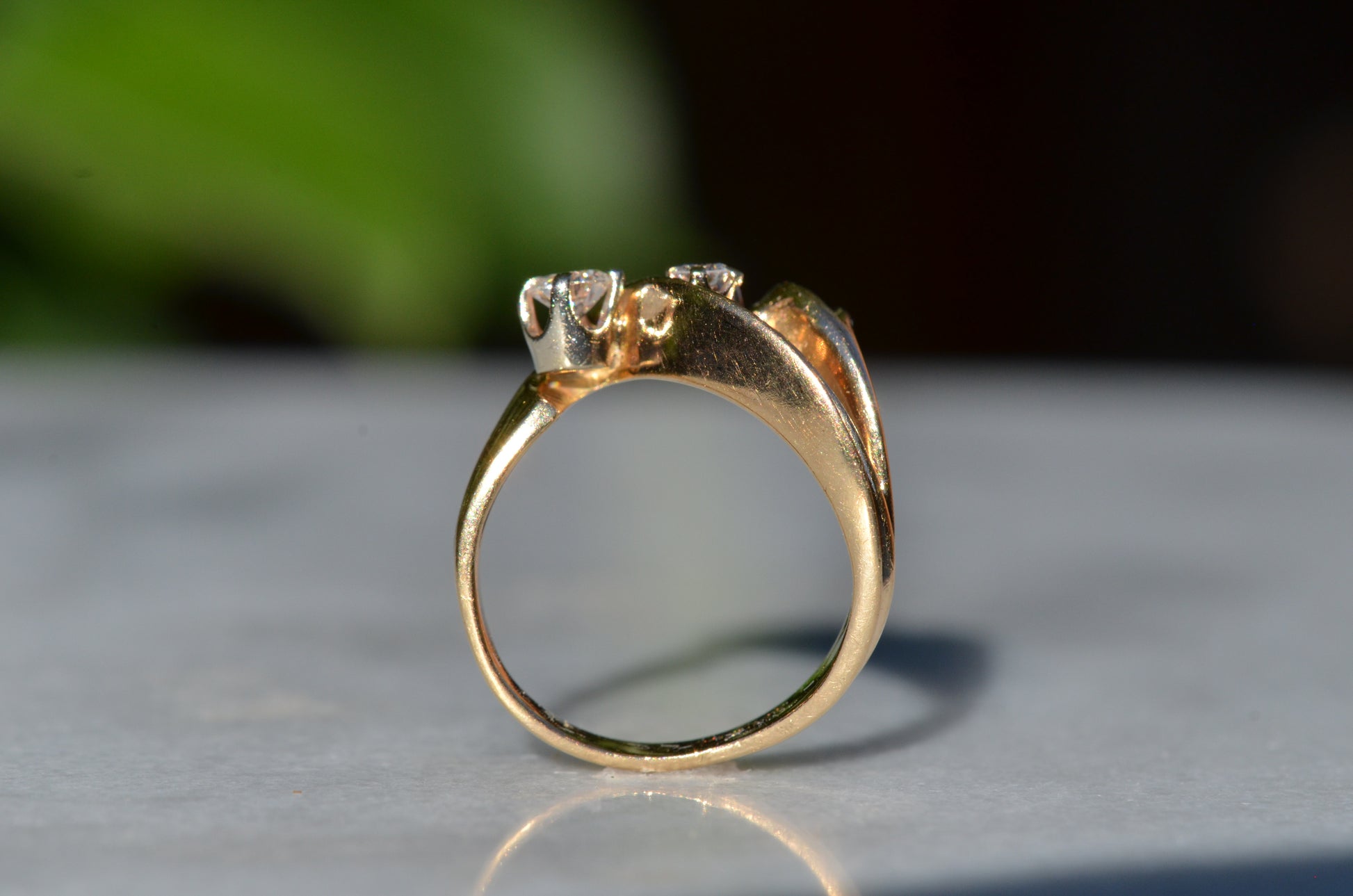 Very good vintage condition with moderate wear in line with previous use, including slightly visible past resizing and a small fracture below of the girdle of the larger diamond.