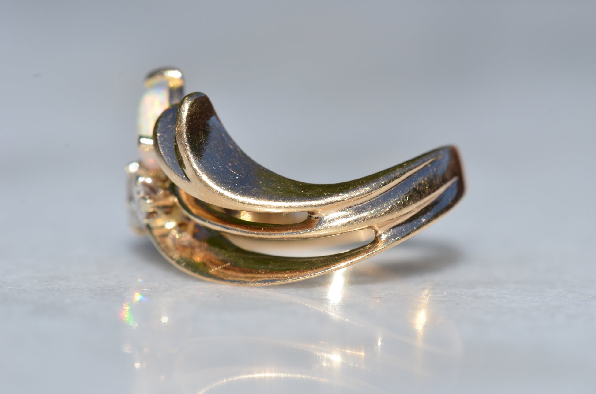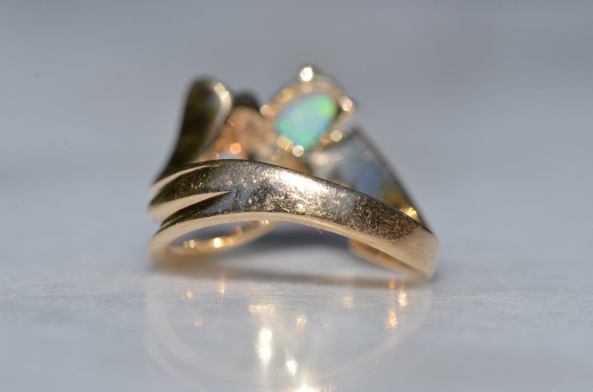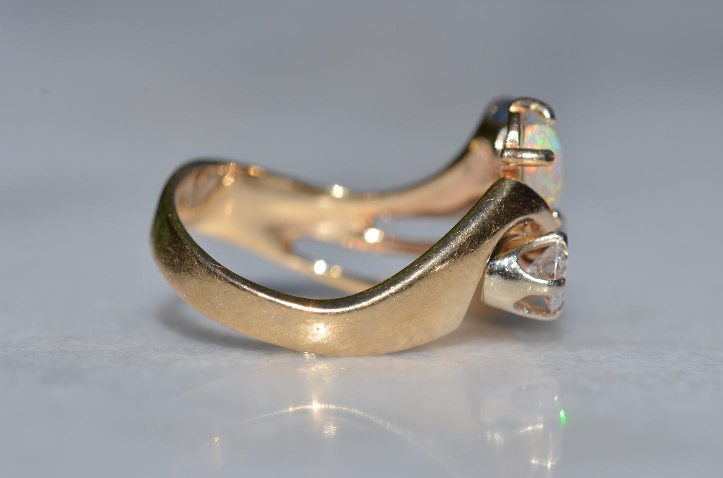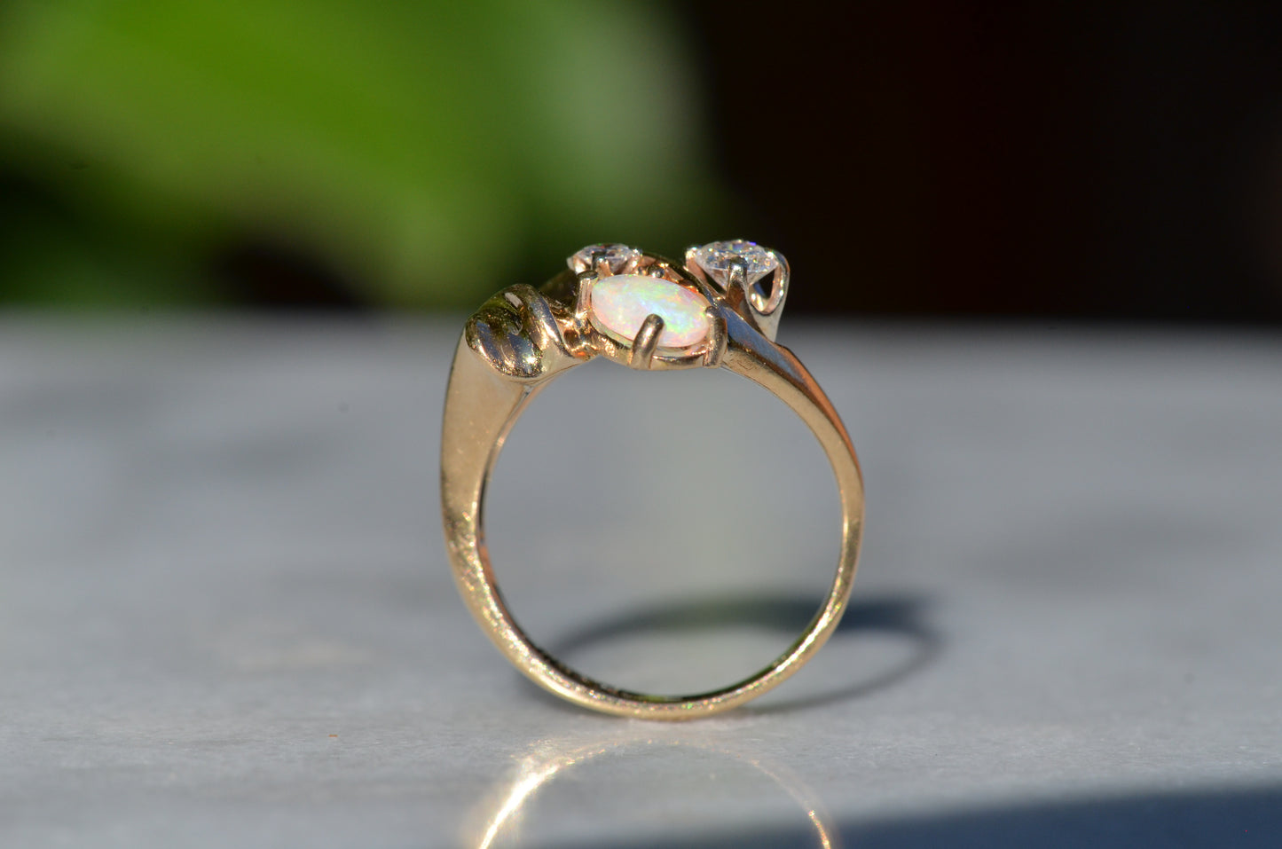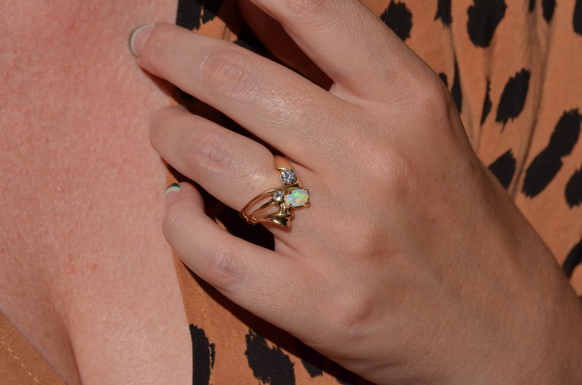 This glamorous vintage ring is a complete showstopper. A positively dazzling oval-shaped opal is joined by a pair of sparkling diamonds, appearing to spray outward from the band. The dynamic asymmetry is complemented by the rainbow play of colour in the opal and twinkling from the bright diamonds. Whiplash lines and sharp angles round out the tour de force design on this ring that is unlike any other we've seen.