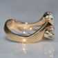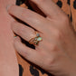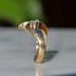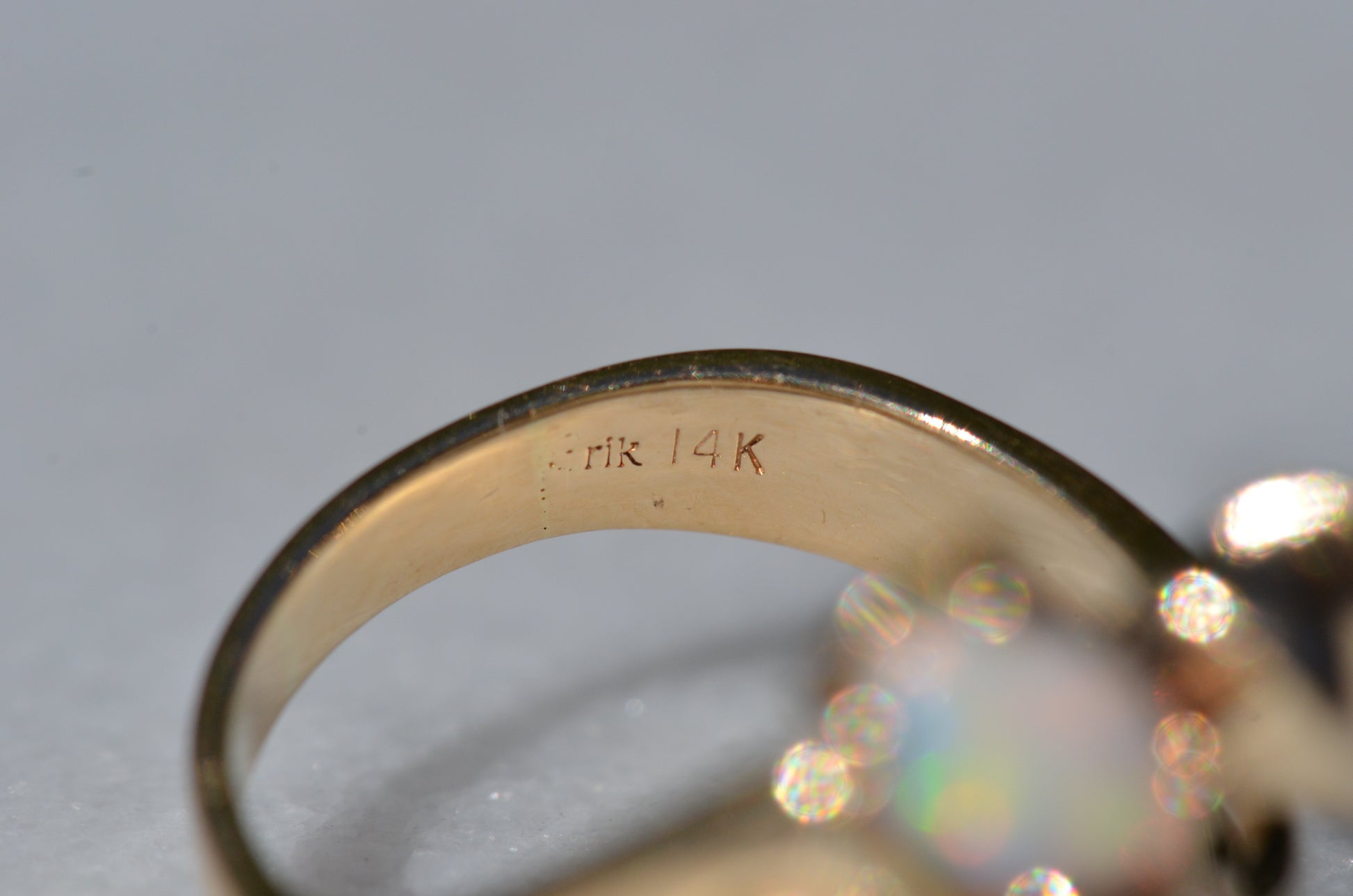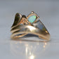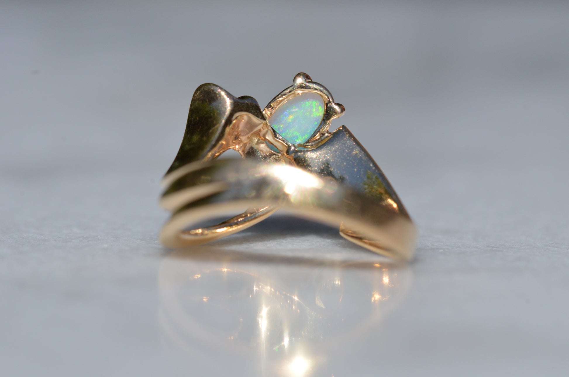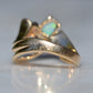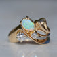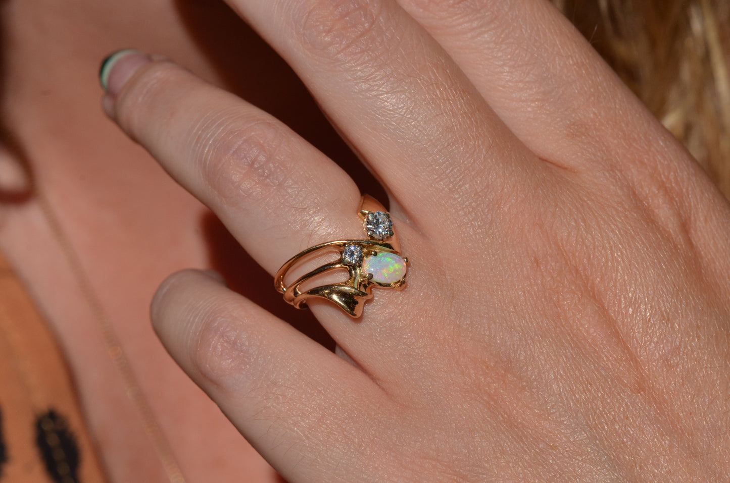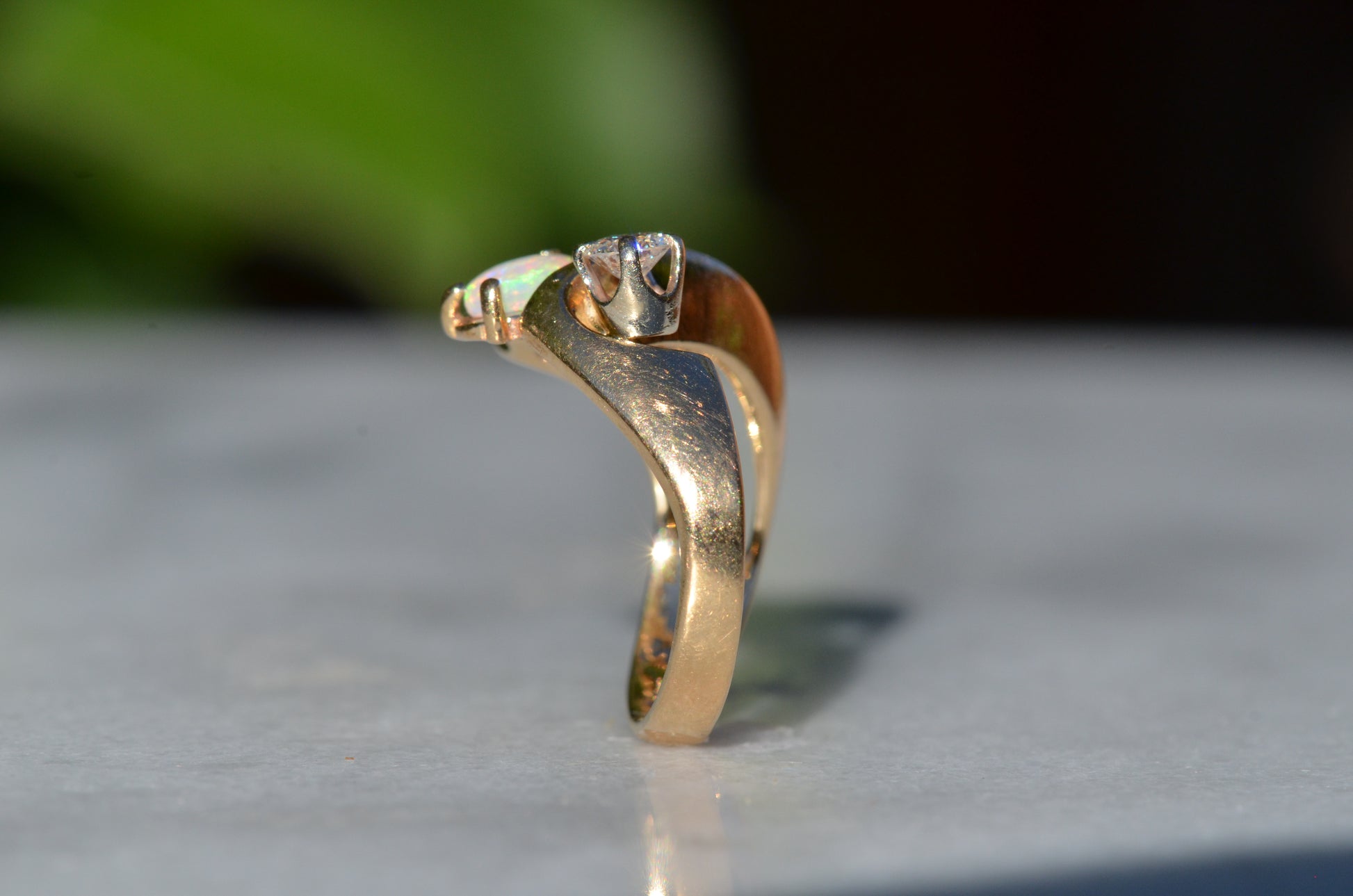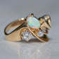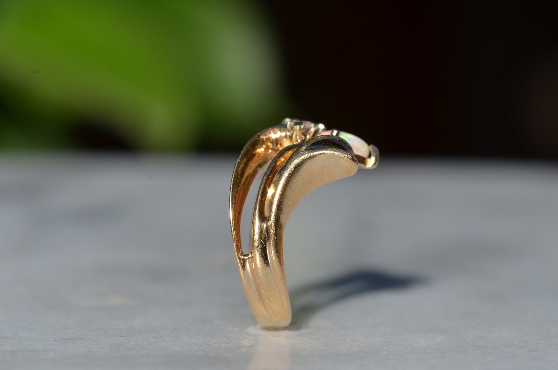 This glamorous vintage ring is a complete showstopper. A positively dazzling oval-shaped opal is joined by a pair of sparkling diamonds, appearing to spray outward from the band. The dynamic asymmetry is complemented by the rainbow play of colour in the opal and twinkling from the bright diamonds. Whiplash lines and sharp angles round out the tour de force design on this ring that is unlike any other we've seen.