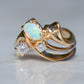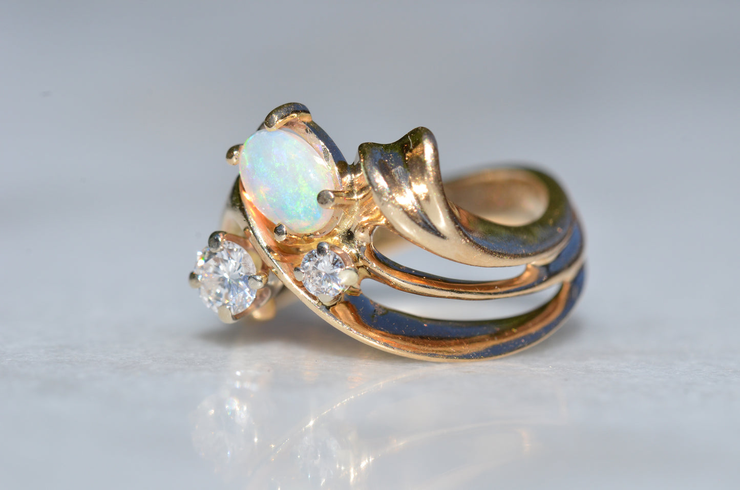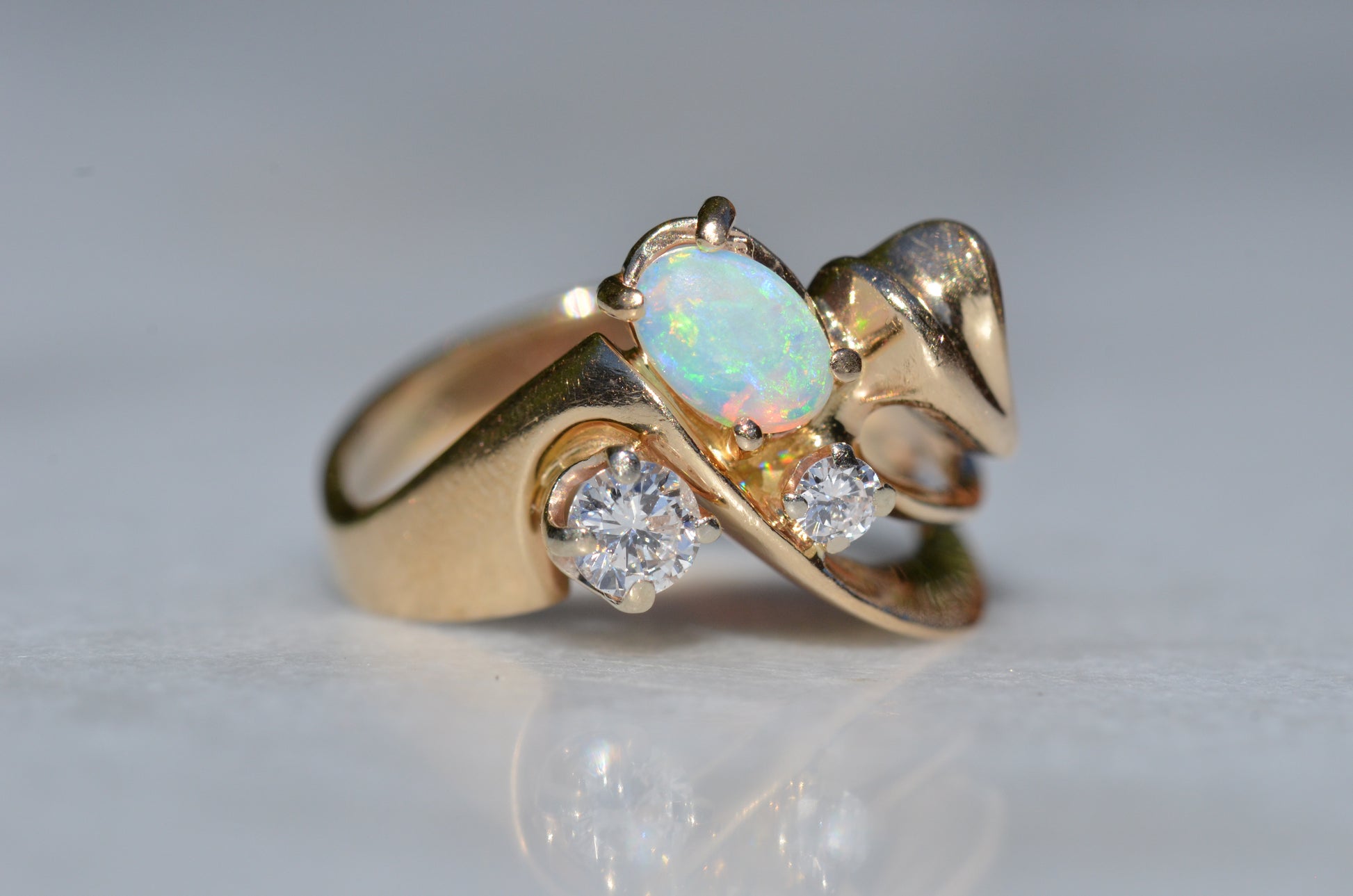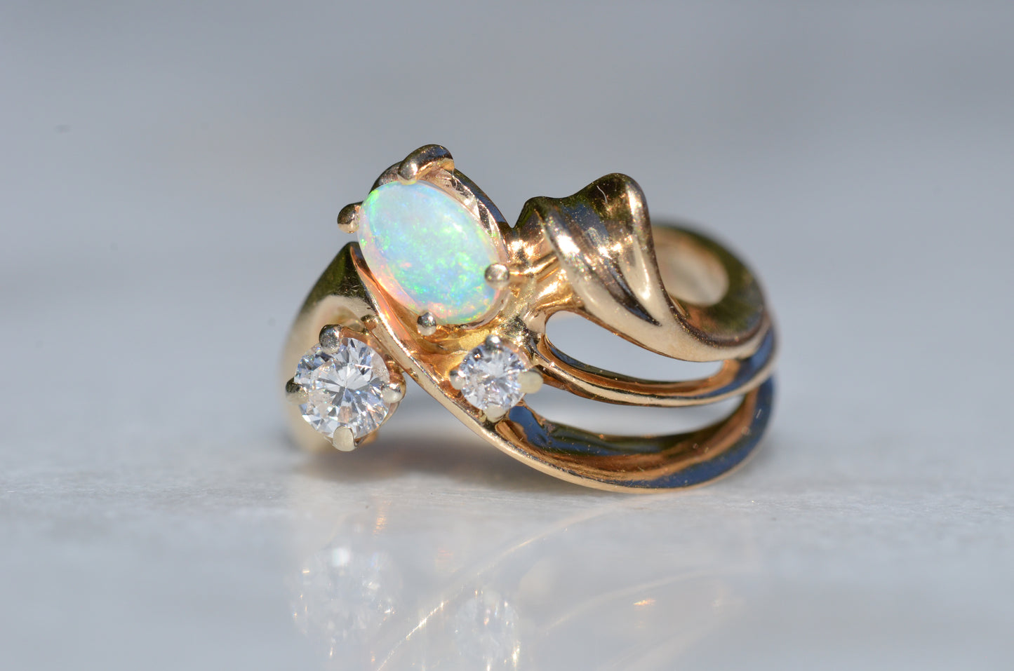 • Two round brilliant natural diamonds approximately 0.27 carat total weight, one oval cabochon natural opal approximately 6.2x4.2x2mm