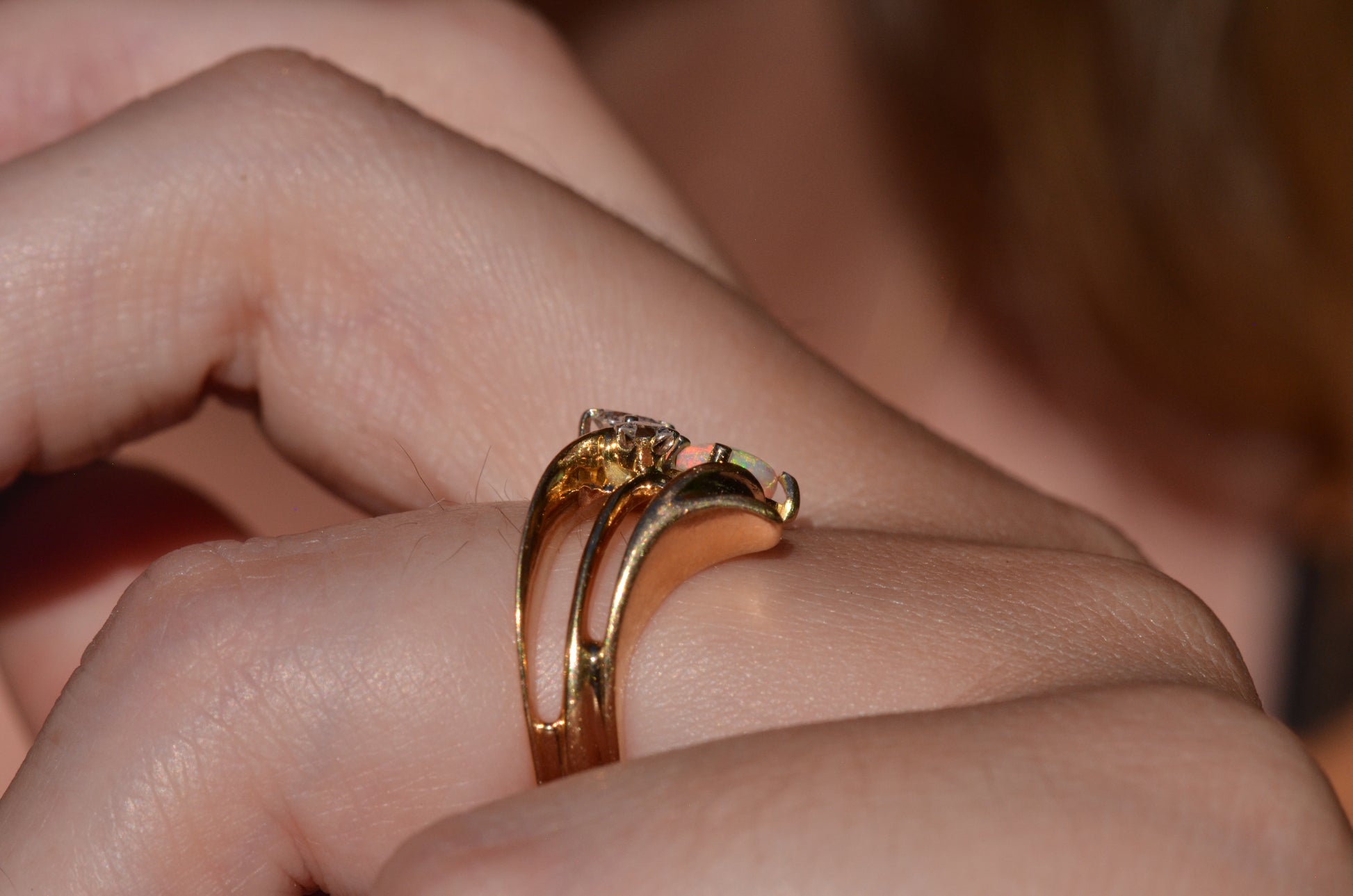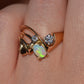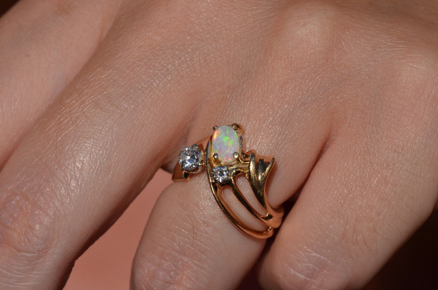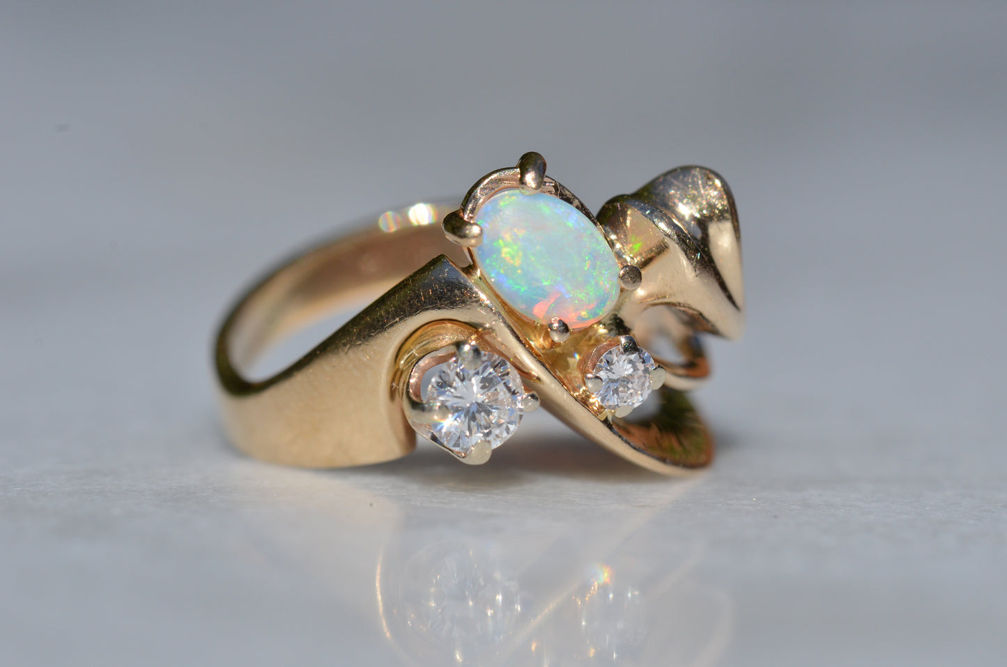 • Two round brilliant natural diamonds approximately 0.27 carat total weight, one oval cabochon natural opal approximately 6.2x4.2x2mm