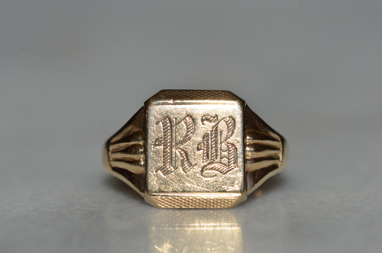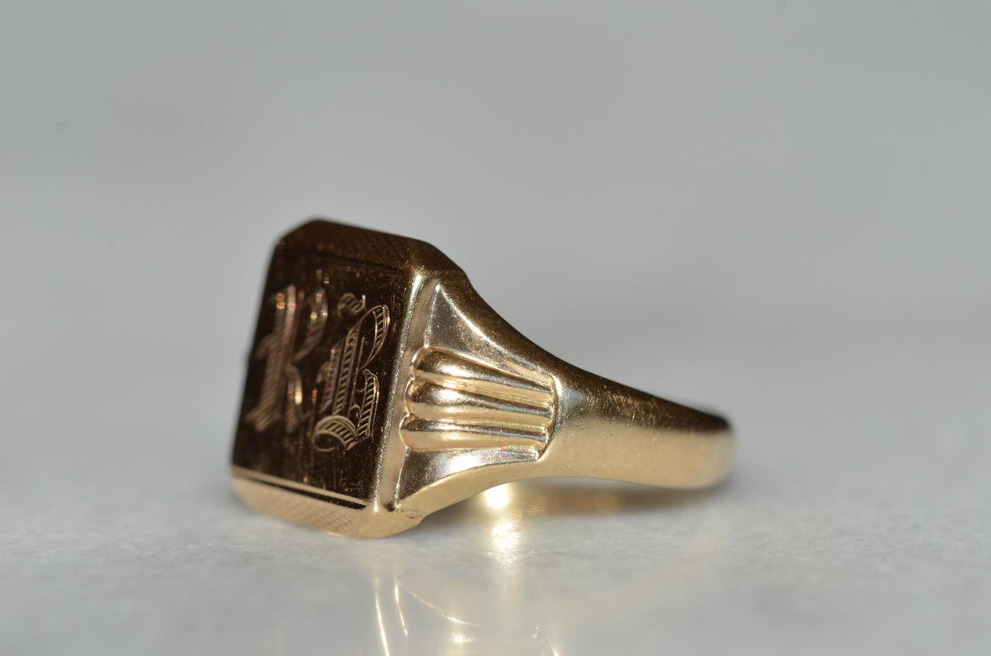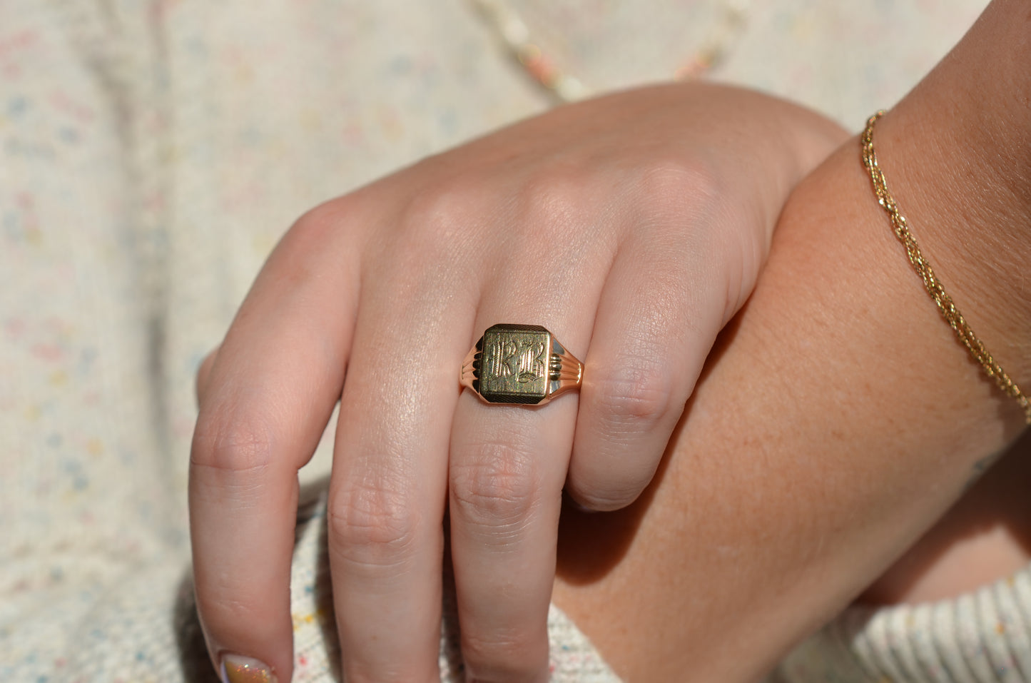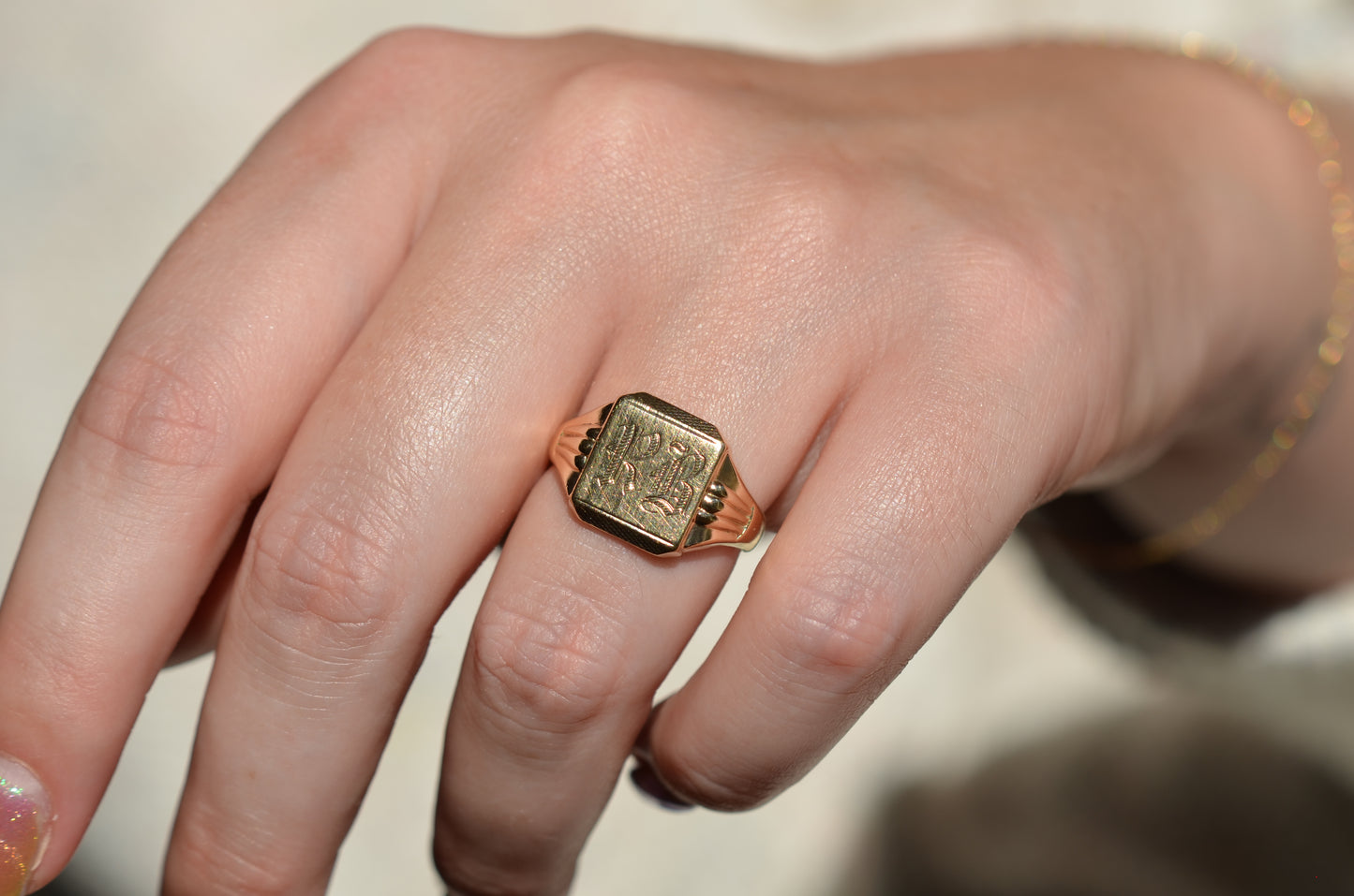 Dramatic in its bold features and textures as well as its classic shaded old English lettering, this ring perfectly straddles a classic-modern divide. There's such a special feeling in finding a preloved piece that already has letters on it that are meaningful to you, that we play pretty fast and loose - maybe it's the first or last initials of you and your lover, or your own in another order, or the initials of a loved one: no matter what, it will feel sentimental every time it catches your eye.