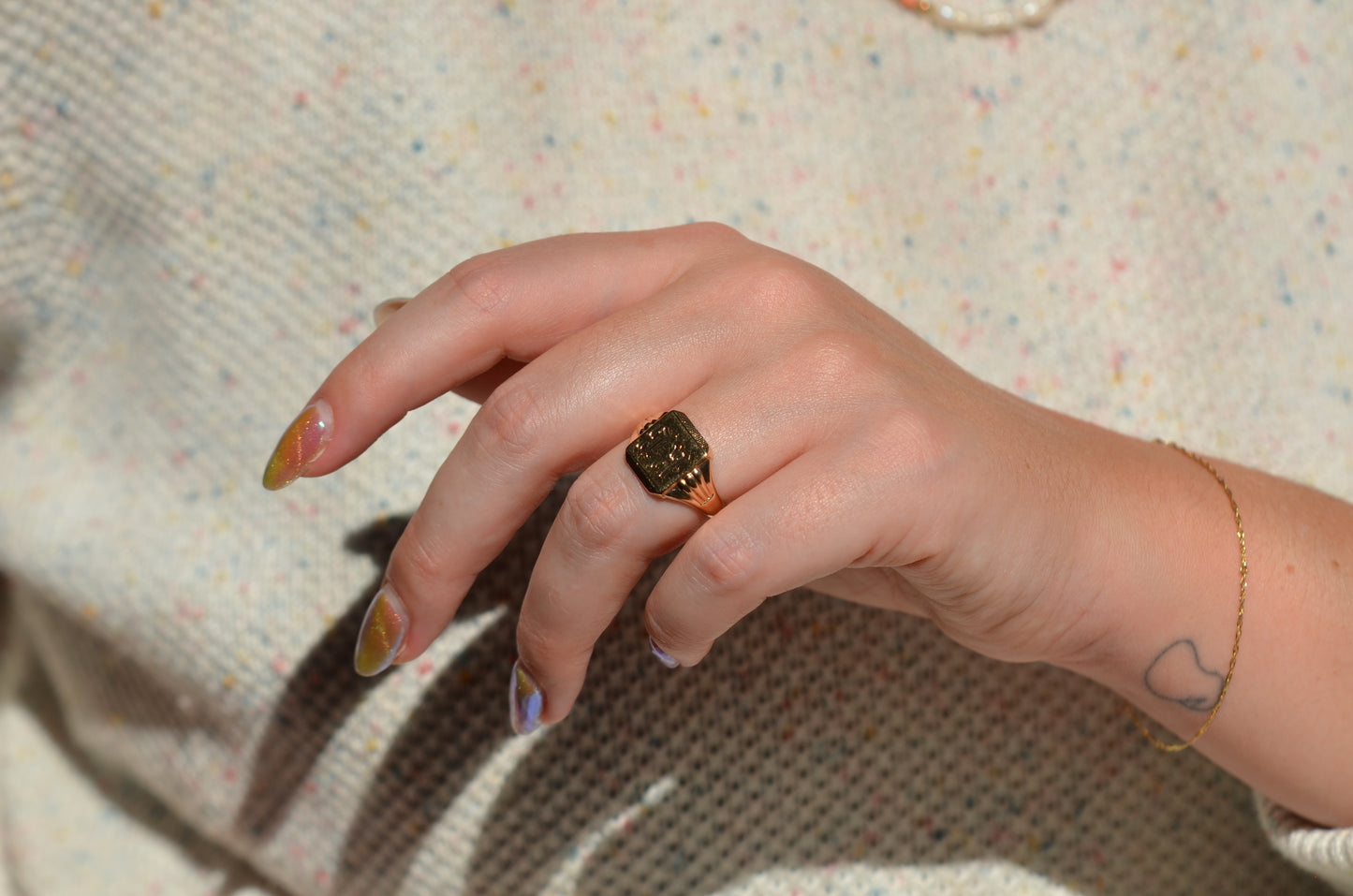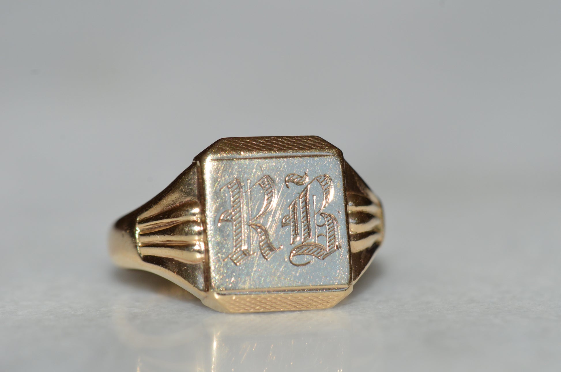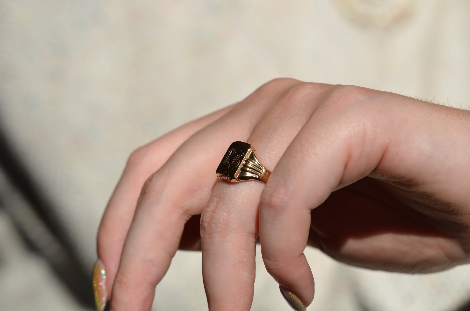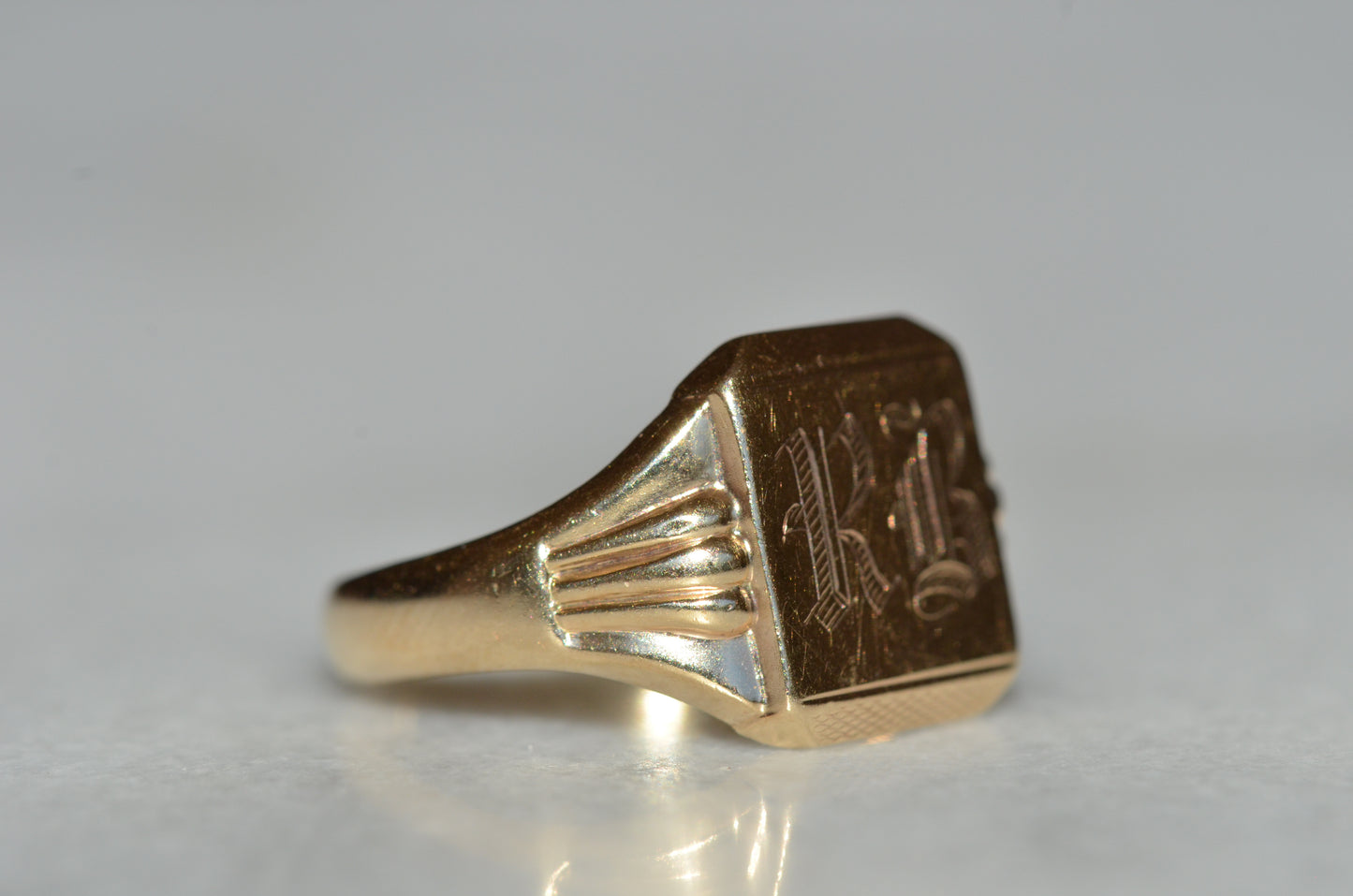 Dramatic in its bold features and textures as well as its classic shaded old English lettering, this ring perfectly straddles a classic-modern divide. There's such a special feeling in finding a preloved piece that already has letters on it that are meaningful to you, that we play pretty fast and loose - maybe it's the first or last initials of you and your lover, or your own in another order, or the initials of a loved one: no matter what, it will feel sentimental every time it catches your eye.