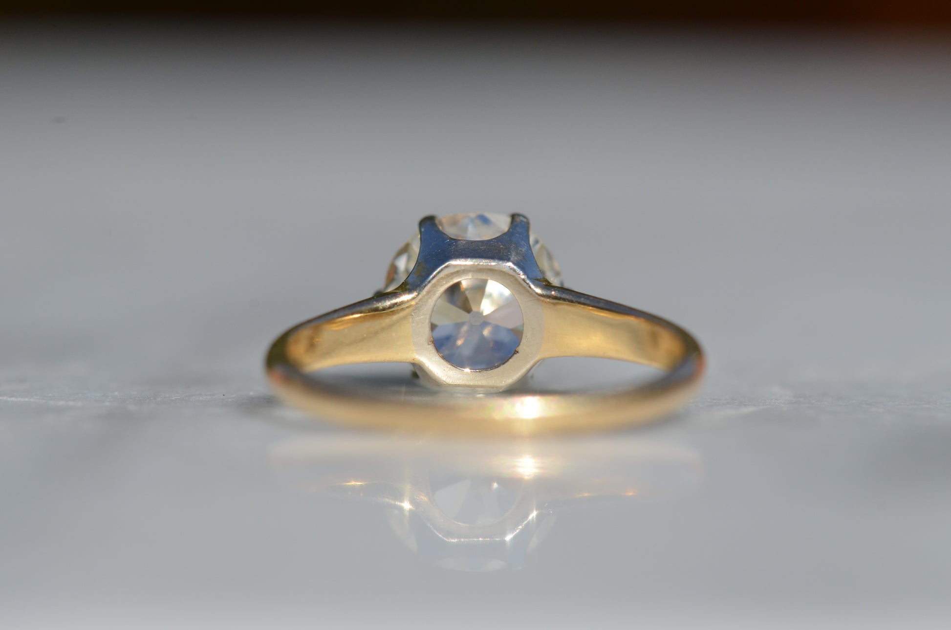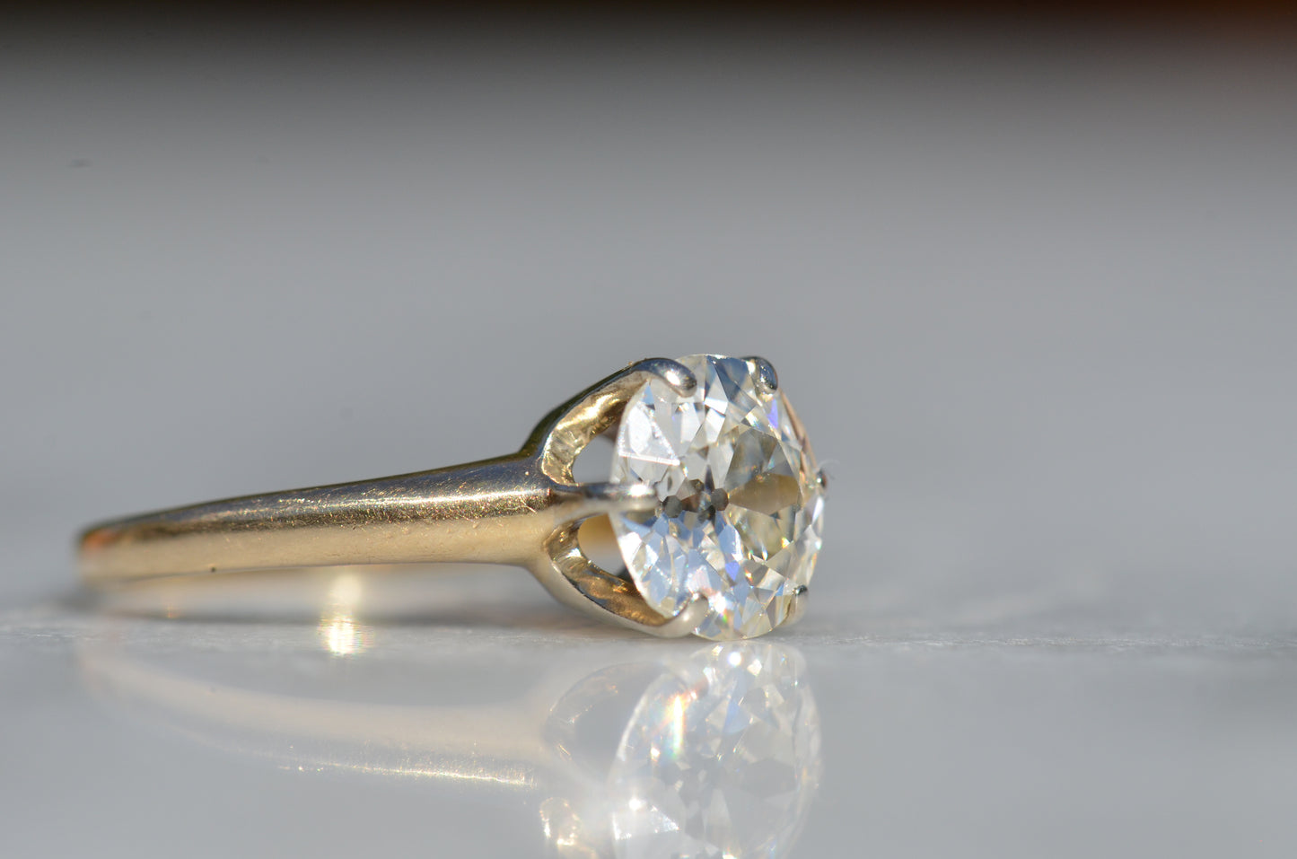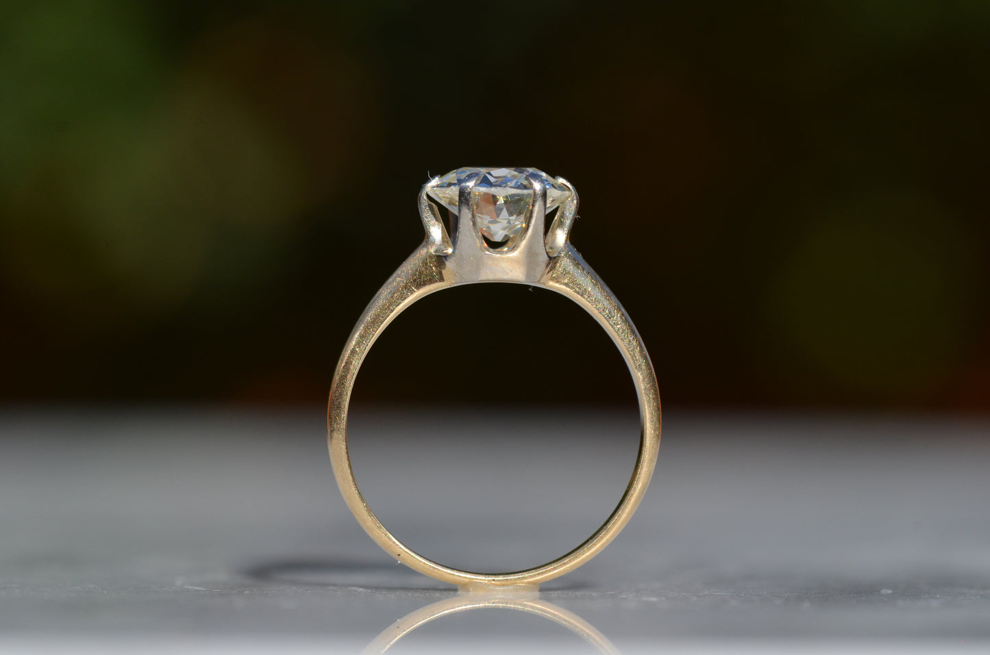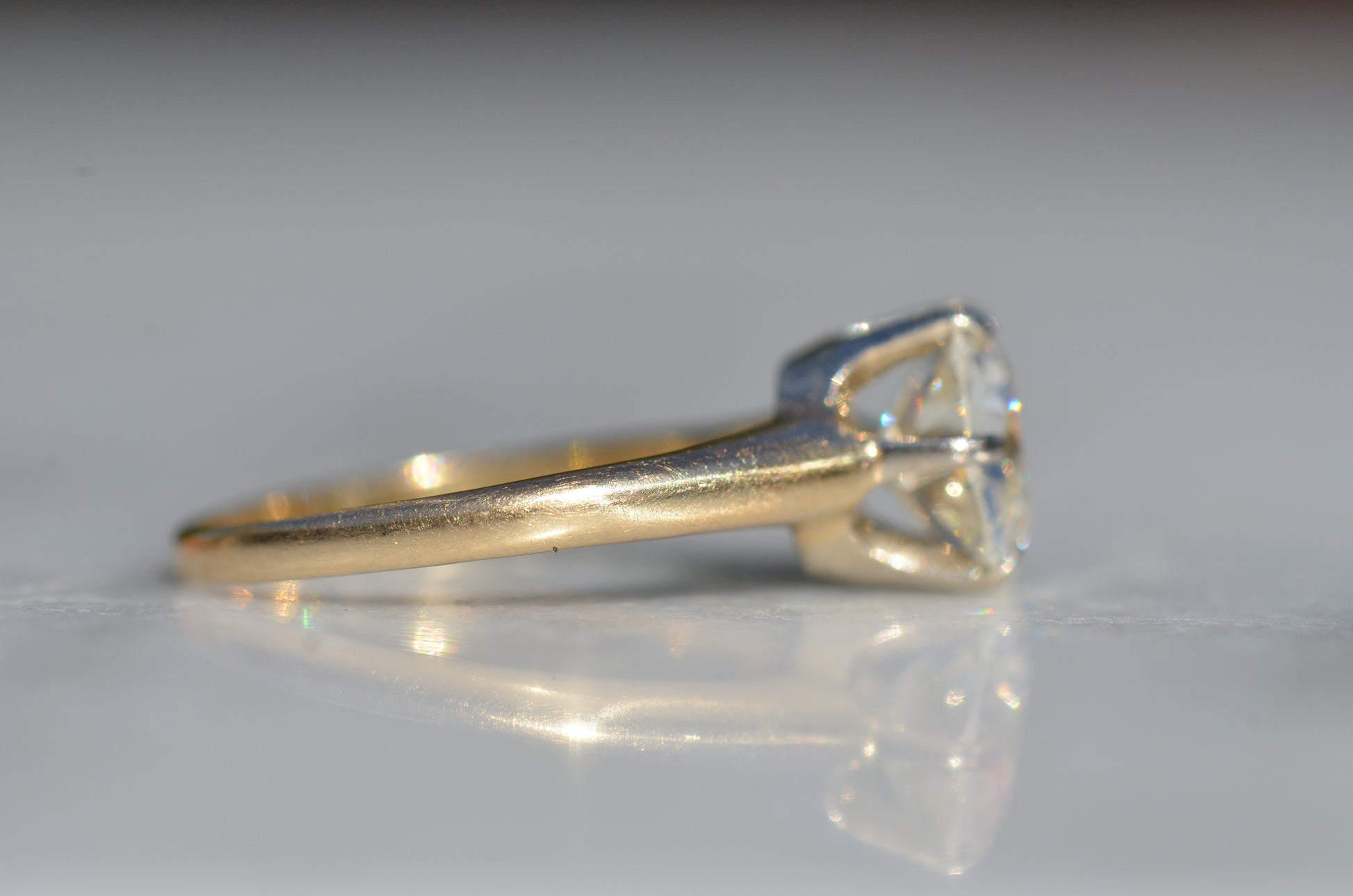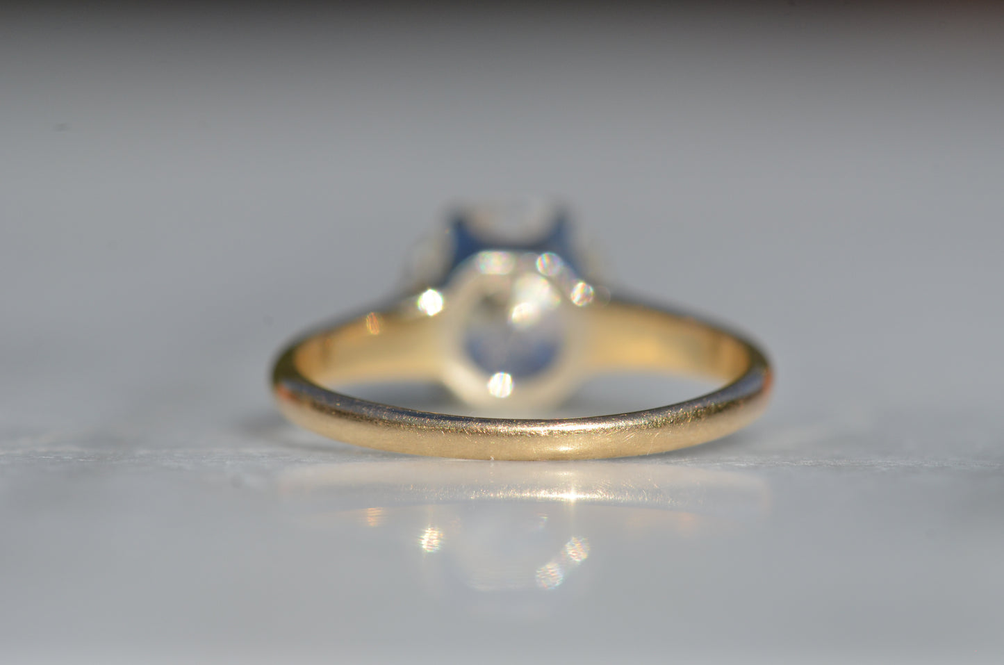Simple, minimal, and utterly classic: this near-antique ring features a stunning and crisply faceted old European oval held aloft in six dainty claw prongs, held in white gold so as not to distract from the stone. On a slim yellow gold band, this ring would check the boxes of what so many contemporary ring designs are trying to achieve, but with the grace and glamour only possible with the craftsmanship of the retro period. Quietly elegant in construction, but with a fiery diamond that sparkles and bluffs - be sure to check instagram.com/st.eloi to see this ring in action.