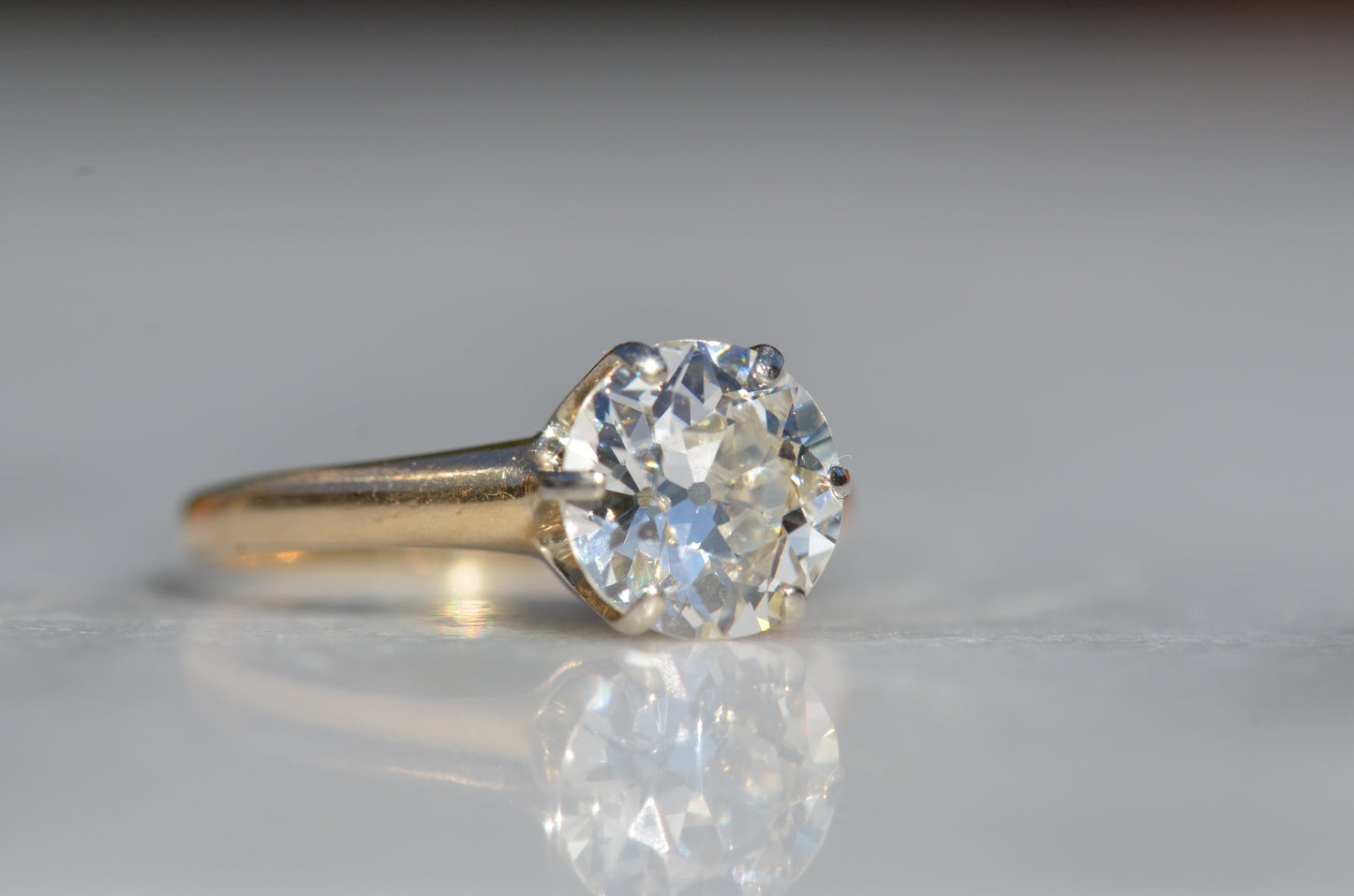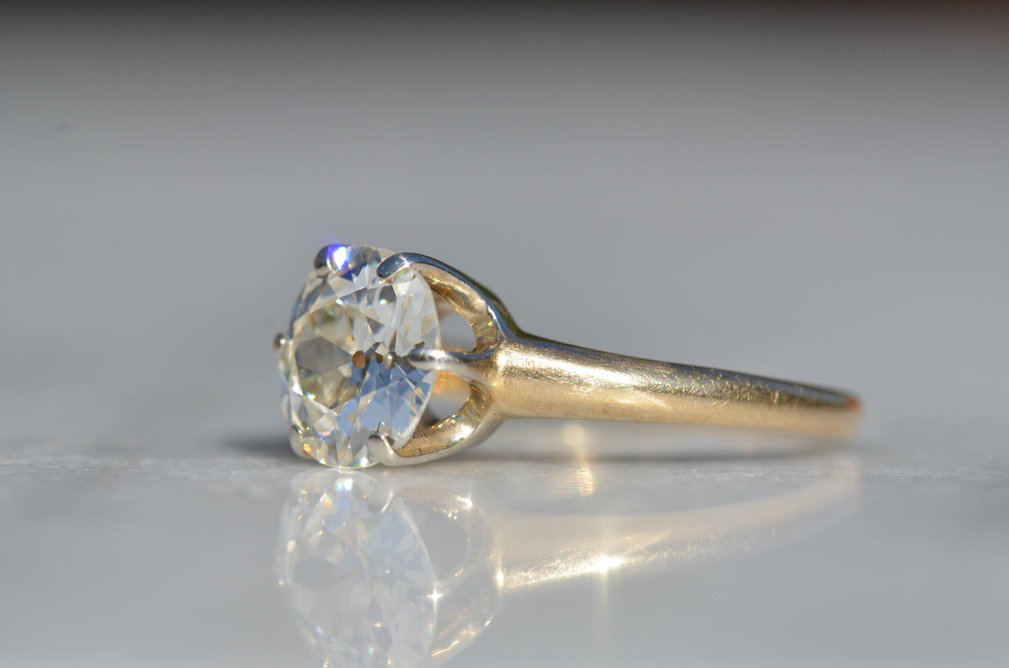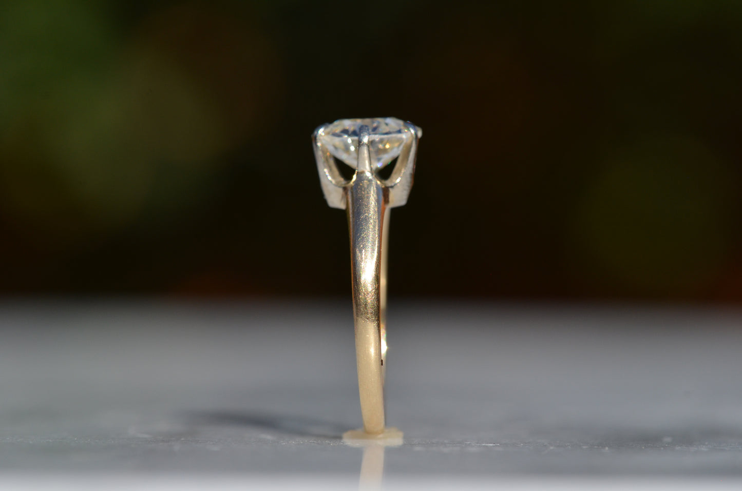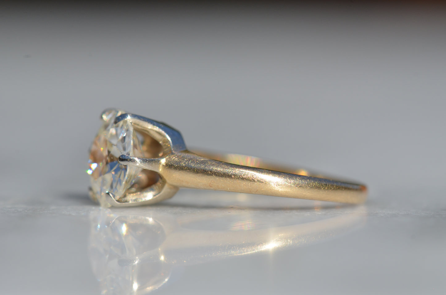 Simple, minimal, and utterly classic: this near-antique ring features a stunning and crisply faceted old European oval held aloft in six dainty claw prongs, held in white gold so as not to distract from the stone. On a slim yellow gold band, this ring would check the boxes of what so many contemporary ring designs are trying to achieve, but with the grace and glamour only possible with the craftsmanship of the retro period. Quietly elegant in construction, but with a fiery diamond that sparkles and bluffs - be sure to check instagram.com/st.eloi to see this ring in action.