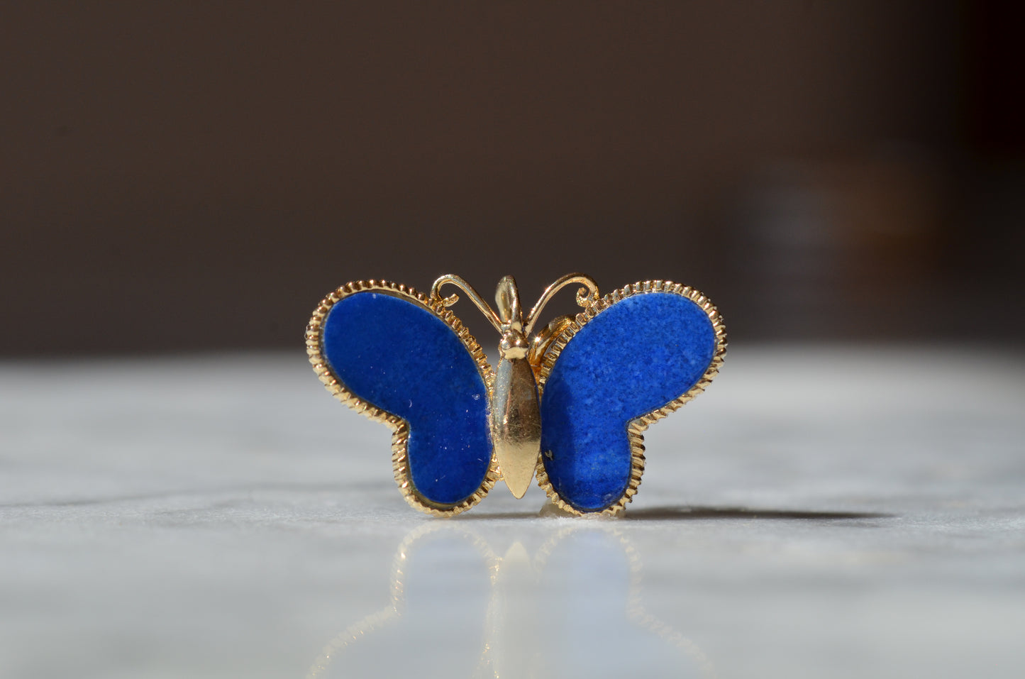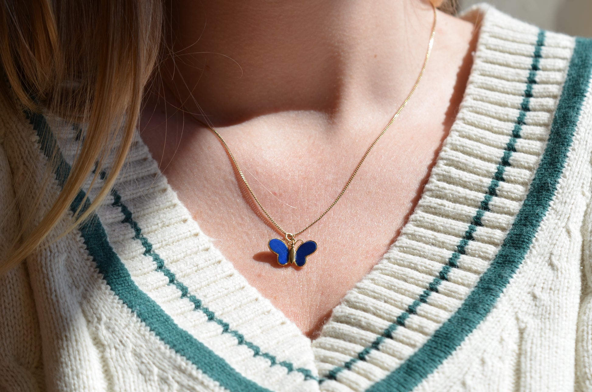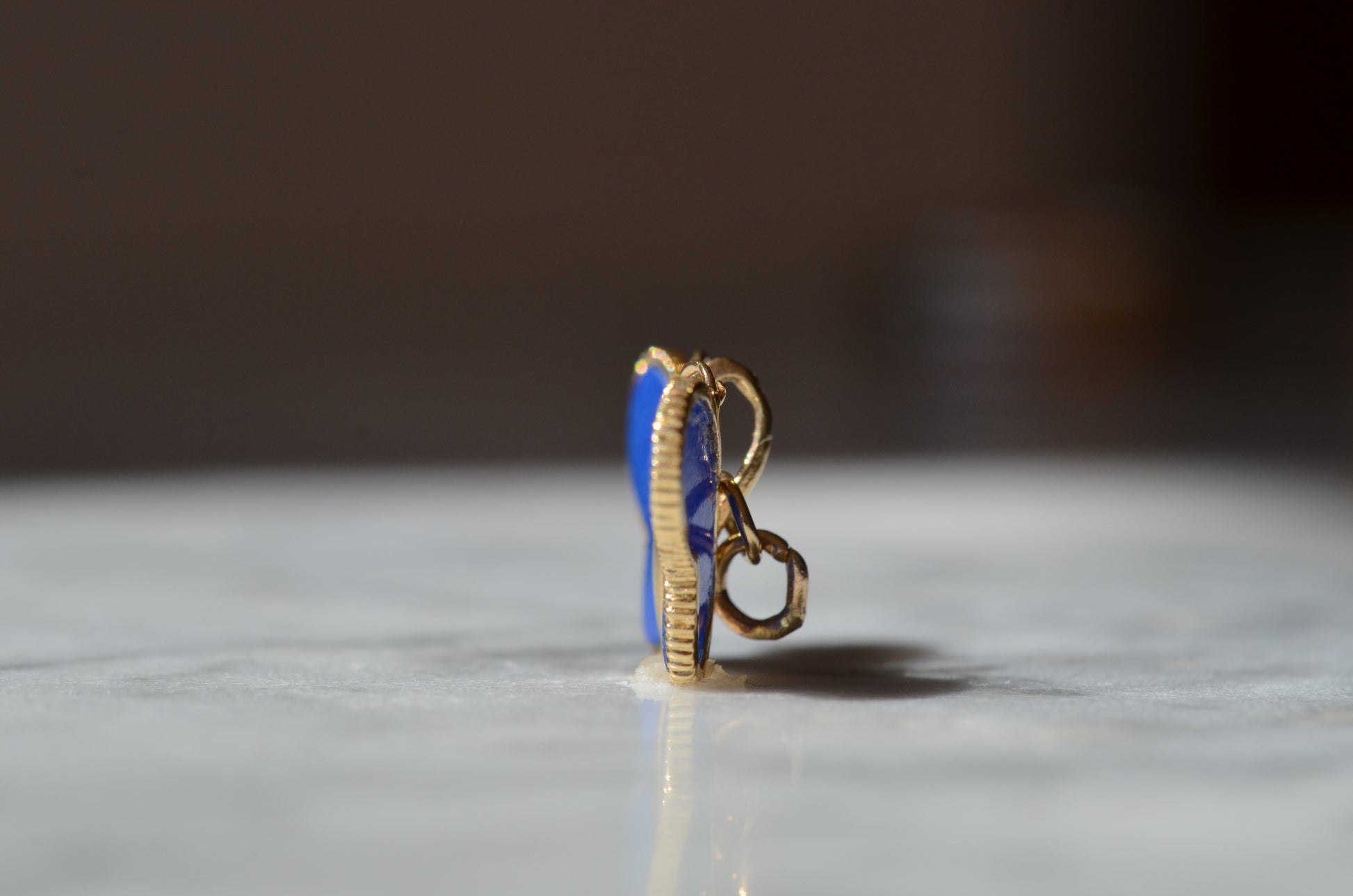 Serving big time Van Cleef & Arpels Alhambra vibes crossed with ‘90s nostalgia, this darling pendant features two vivid lapis lazuli slabs cut to fit a gold frame of butterfly wings with richly textured edges. The back of the pendant has two jump rings attached to a slide loop, so you can easily decide whether to pass a chain directly through or hang from a charm ring or bracelet.
