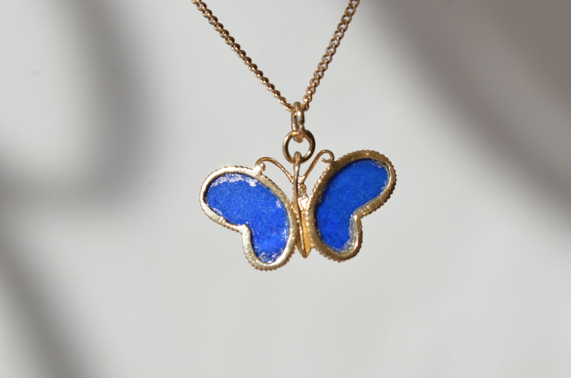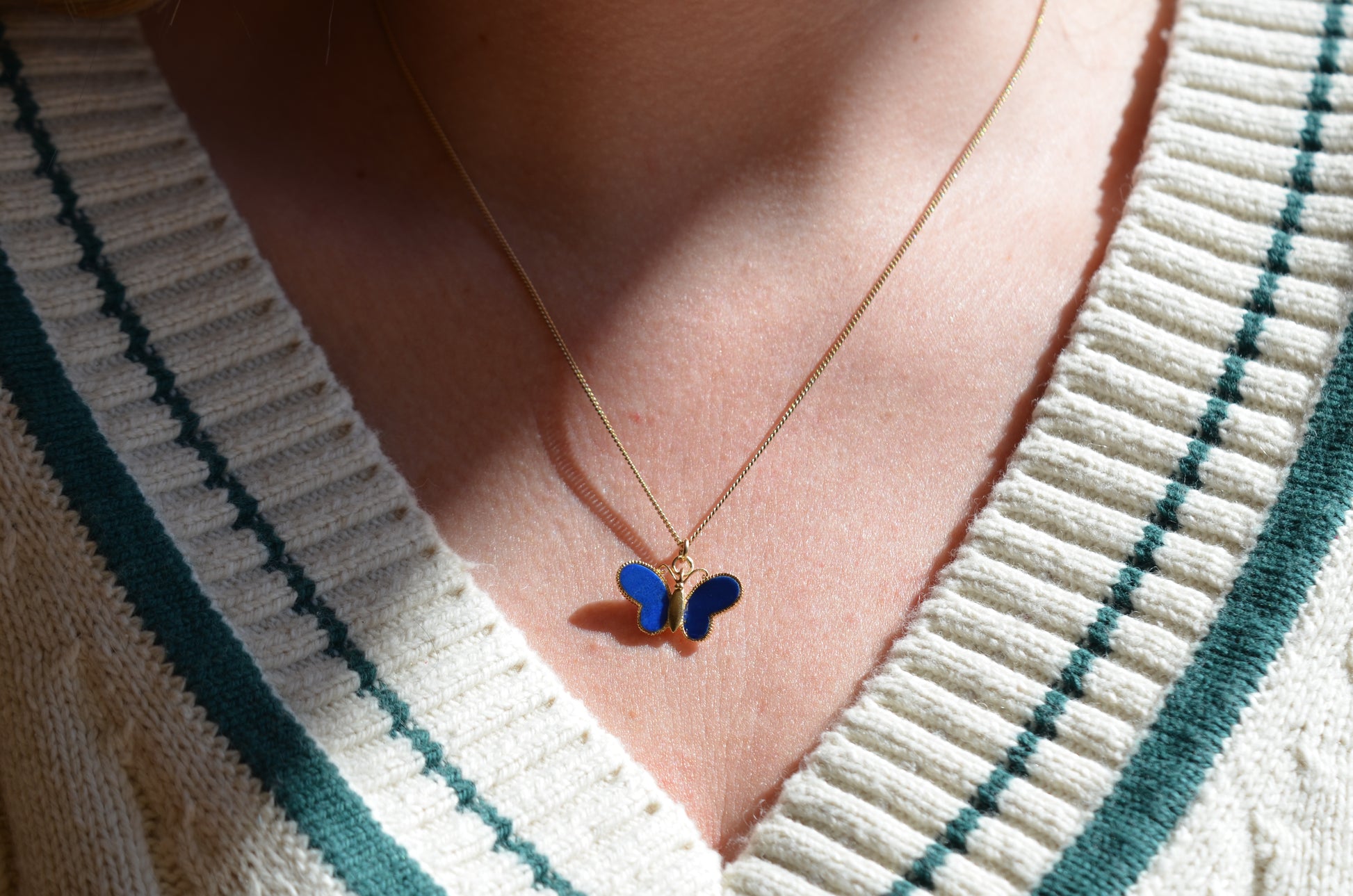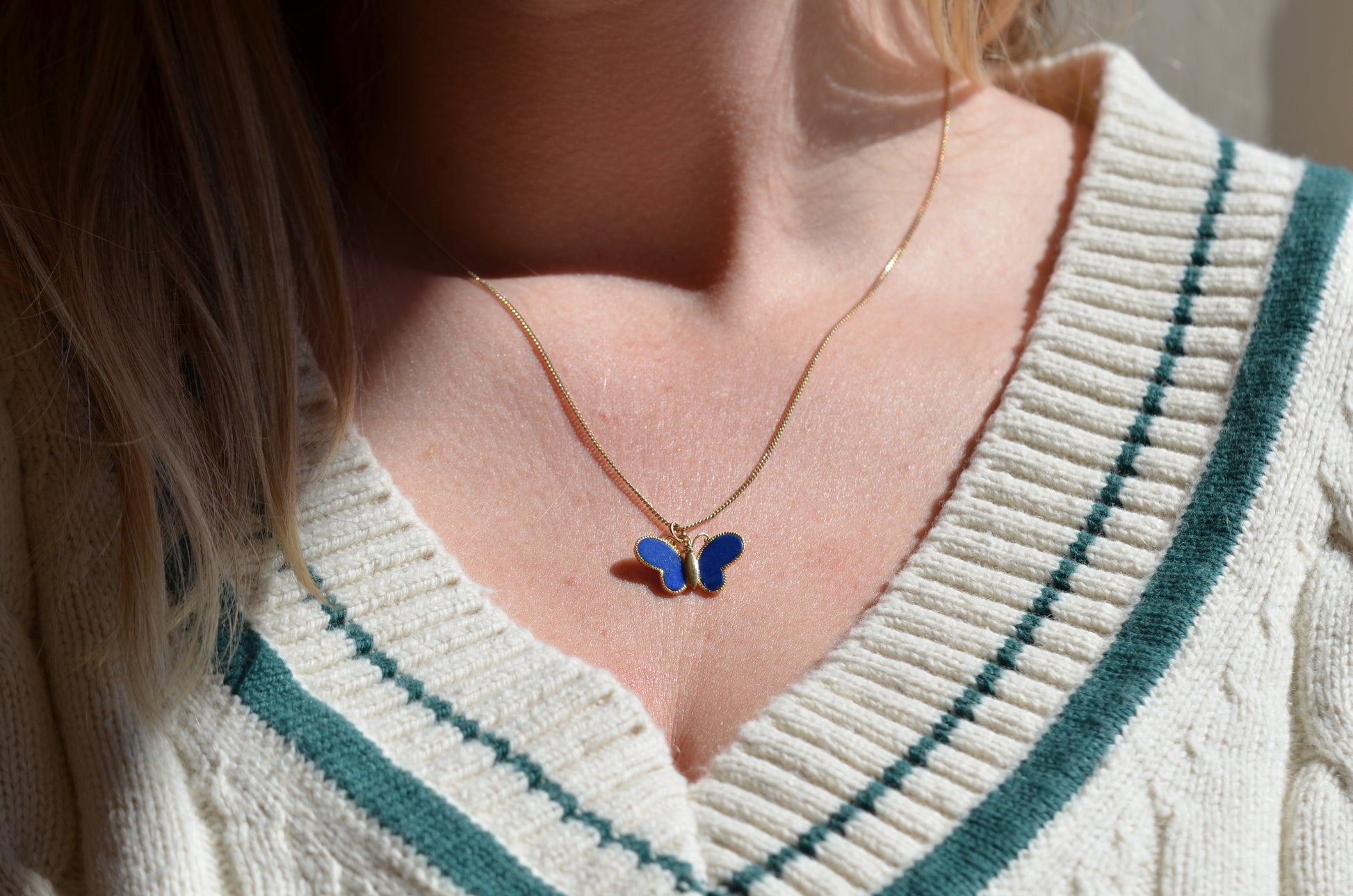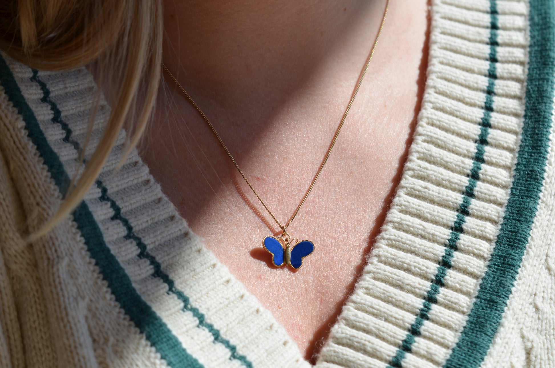 Serving big time Van Cleef & Arpels Alhambra vibes crossed with ‘90s nostalgia, this darling pendant features two vivid lapis lazuli slabs cut to fit a gold frame of butterfly wings with richly textured edges. The back of the pendant has two jump rings attached to a slide loop, so you can easily decide whether to pass a chain directly through or hang from a charm ring or bracelet.