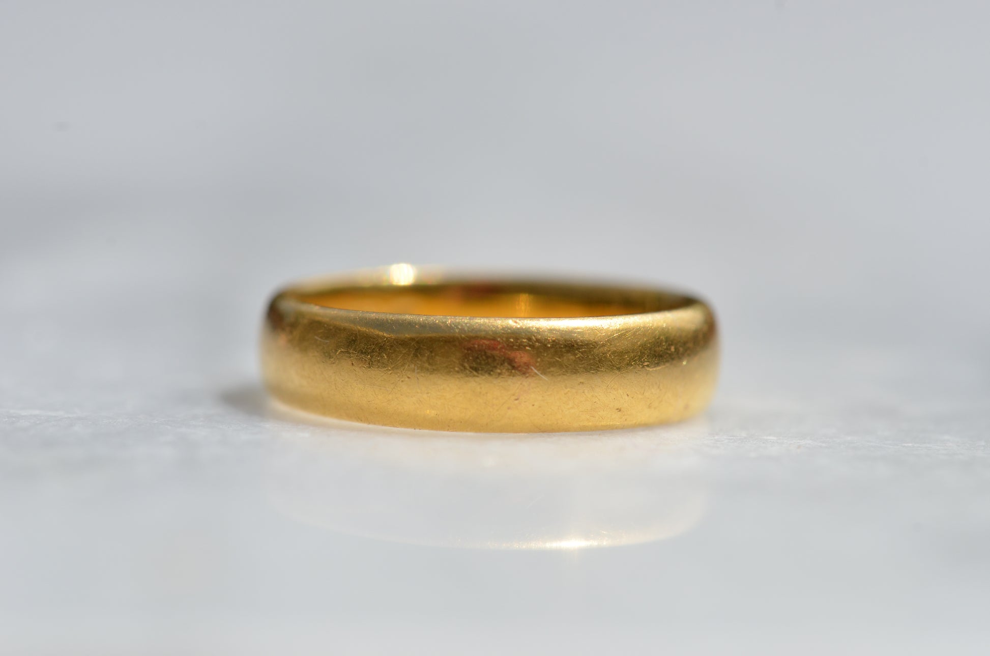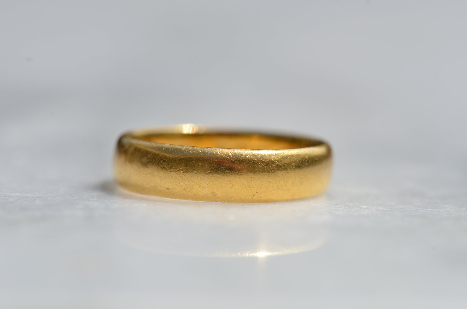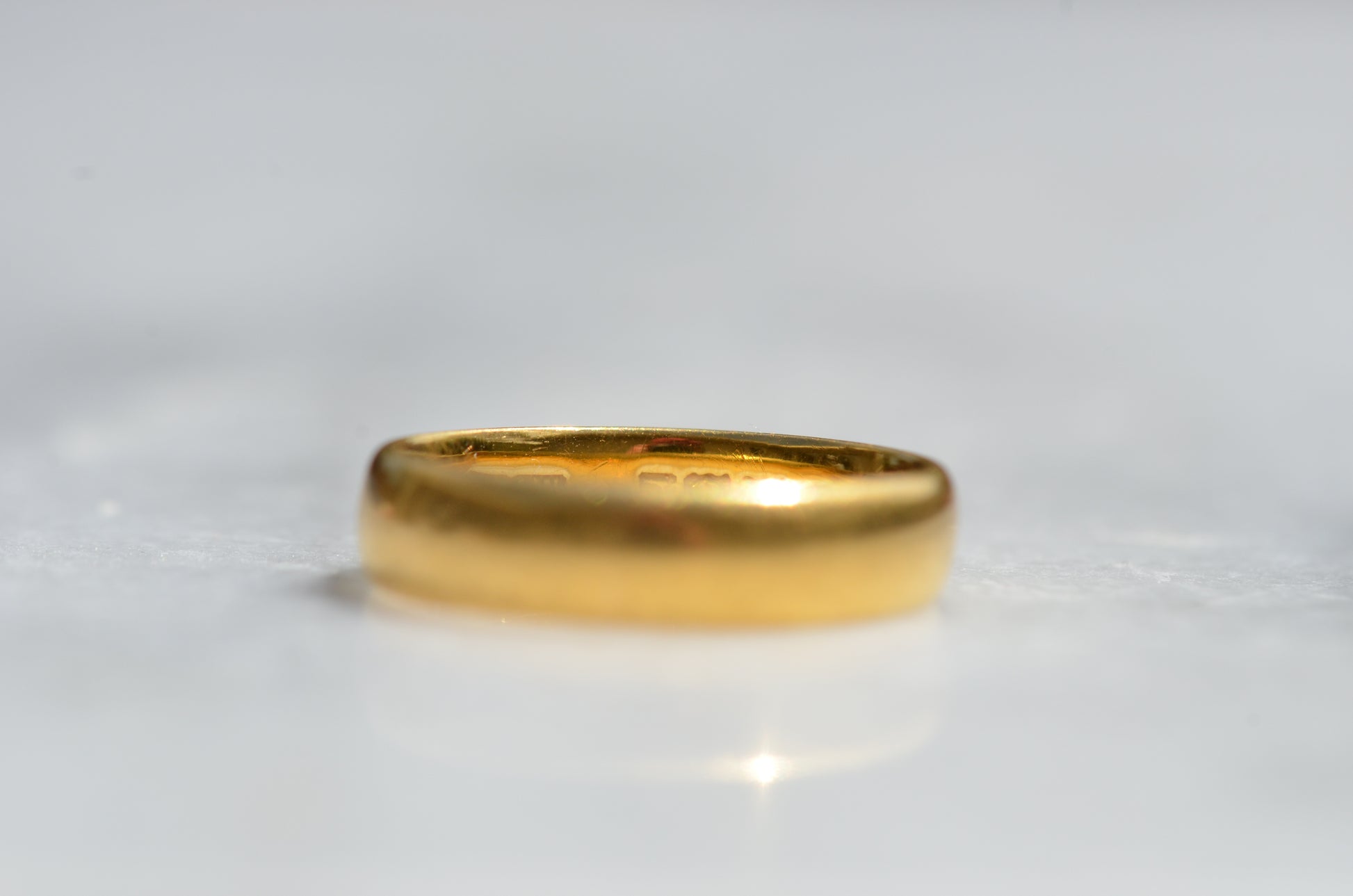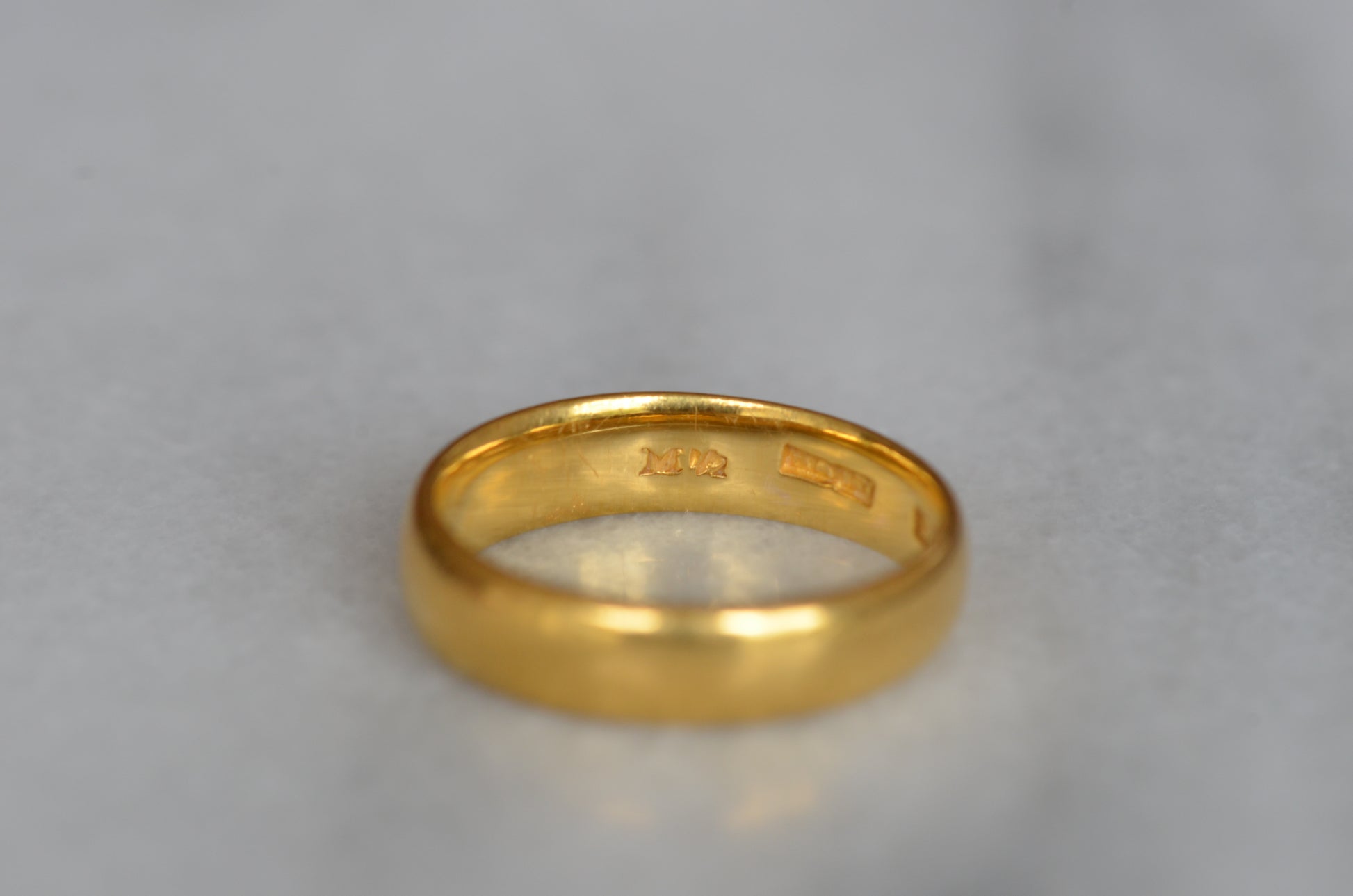 Gold alloys are softer in higher karats, so this old ring has developed some lovely wear over its lifetime with all the little scratches and dings that can't be replicated in a modern piece. While band rings are easy to resize, and often bear evidence of past resizing, we don't recommend it for this ring as that beautiful patina would be lost. The inside of this ring bears a clear, full set of British hallmarks dating it to London 1968, maker's mark AATW, along with a stamp for the letter M 1/2, the equivalent to size 6.5 - stock rings were often stamped with their size to help jewellers quickly locate what they were looking for, and serve as a clue to us when a ring has been previously sized.