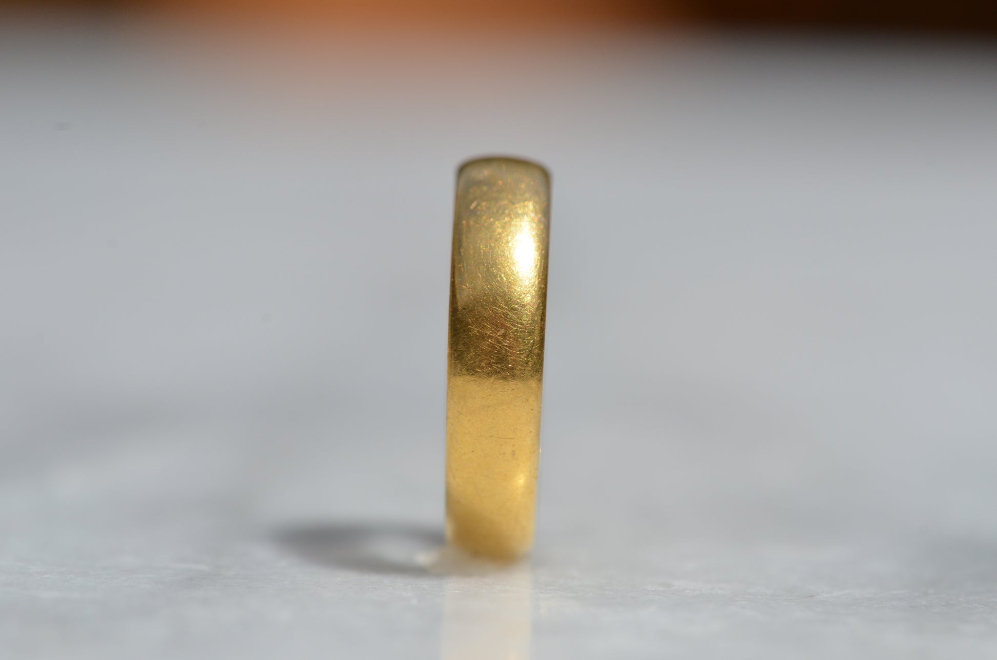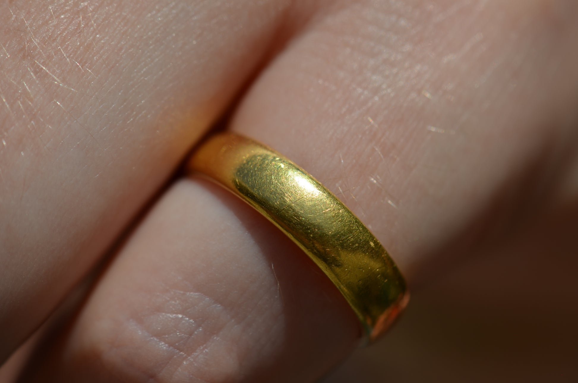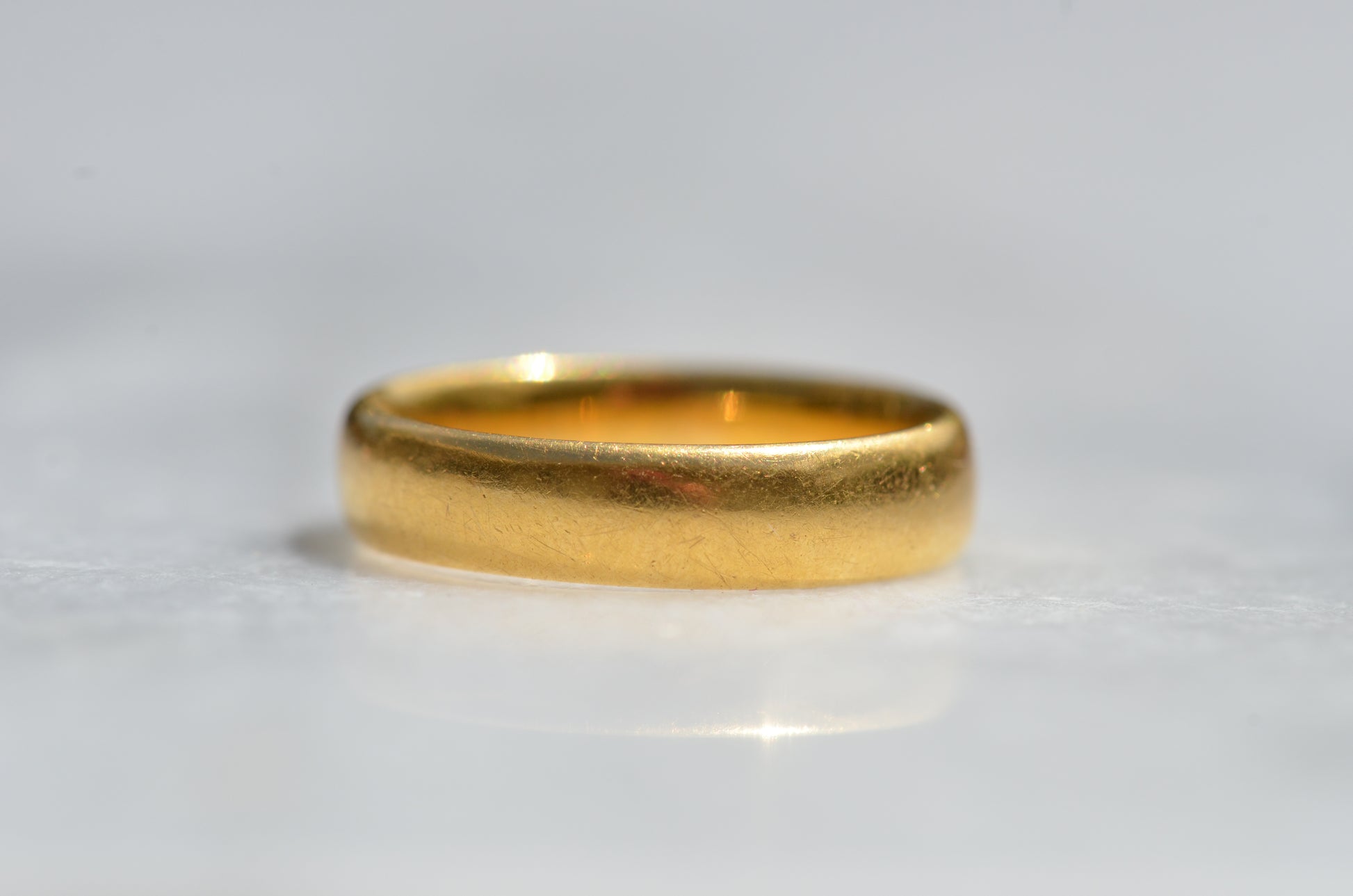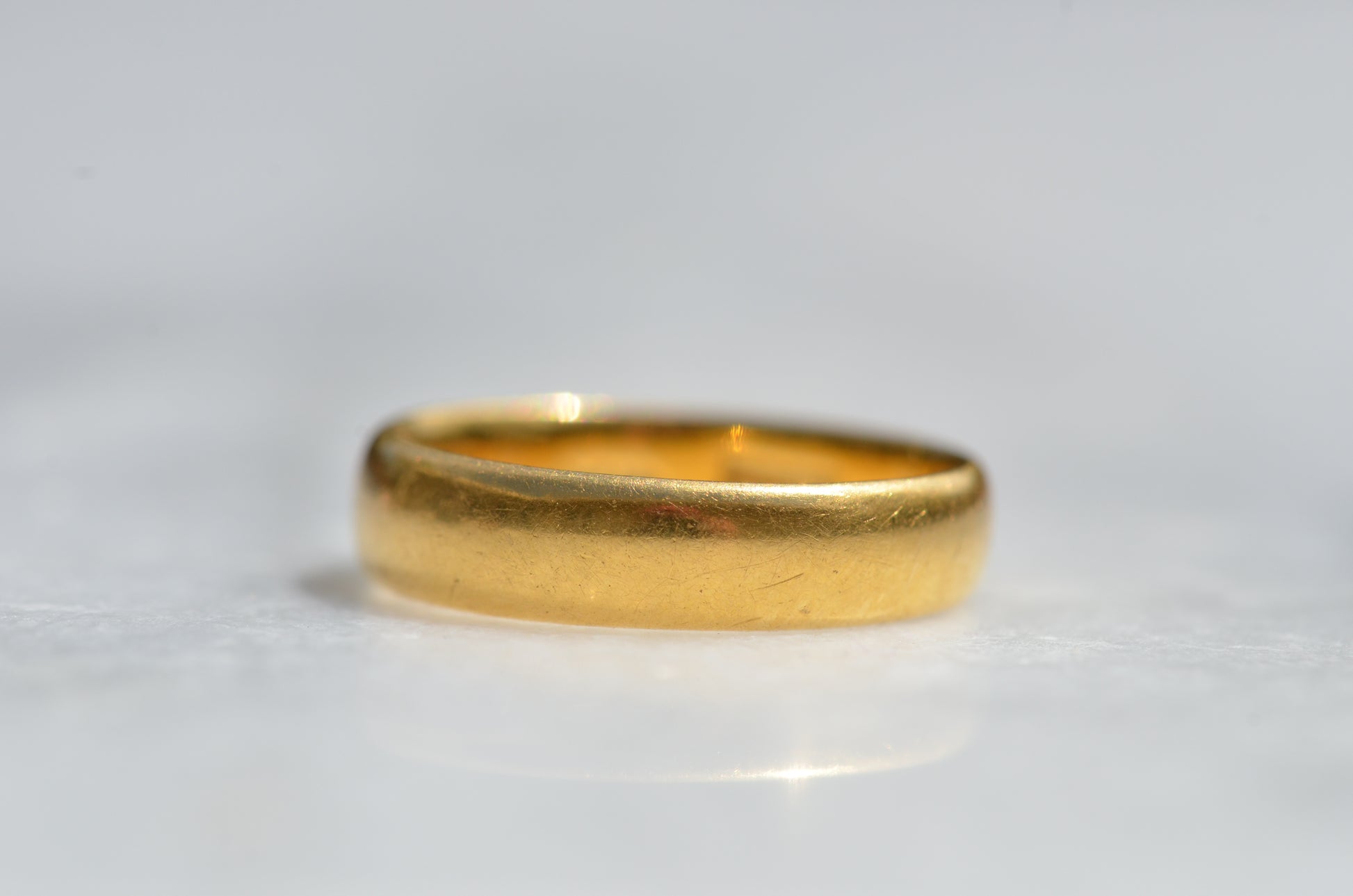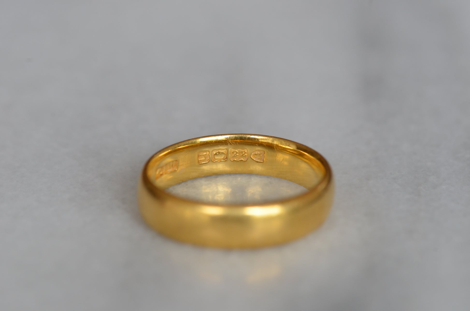 Gold alloys are softer in higher karats, so this old ring has developed some lovely wear over its lifetime with all the little scratches and dings that can't be replicated in a modern piece. While band rings are easy to resize, and often bear evidence of past resizing, we don't recommend it for this ring as that beautiful patina would be lost. The inside of this ring bears a clear, full set of British hallmarks dating it to London 1968, maker's mark AATW, along with a stamp for the letter M 1/2, the equivalent to size 6.5 - stock rings were often stamped with their size to help jewellers quickly locate what they were looking for, and serve as a clue to us when a ring has been previously sized.