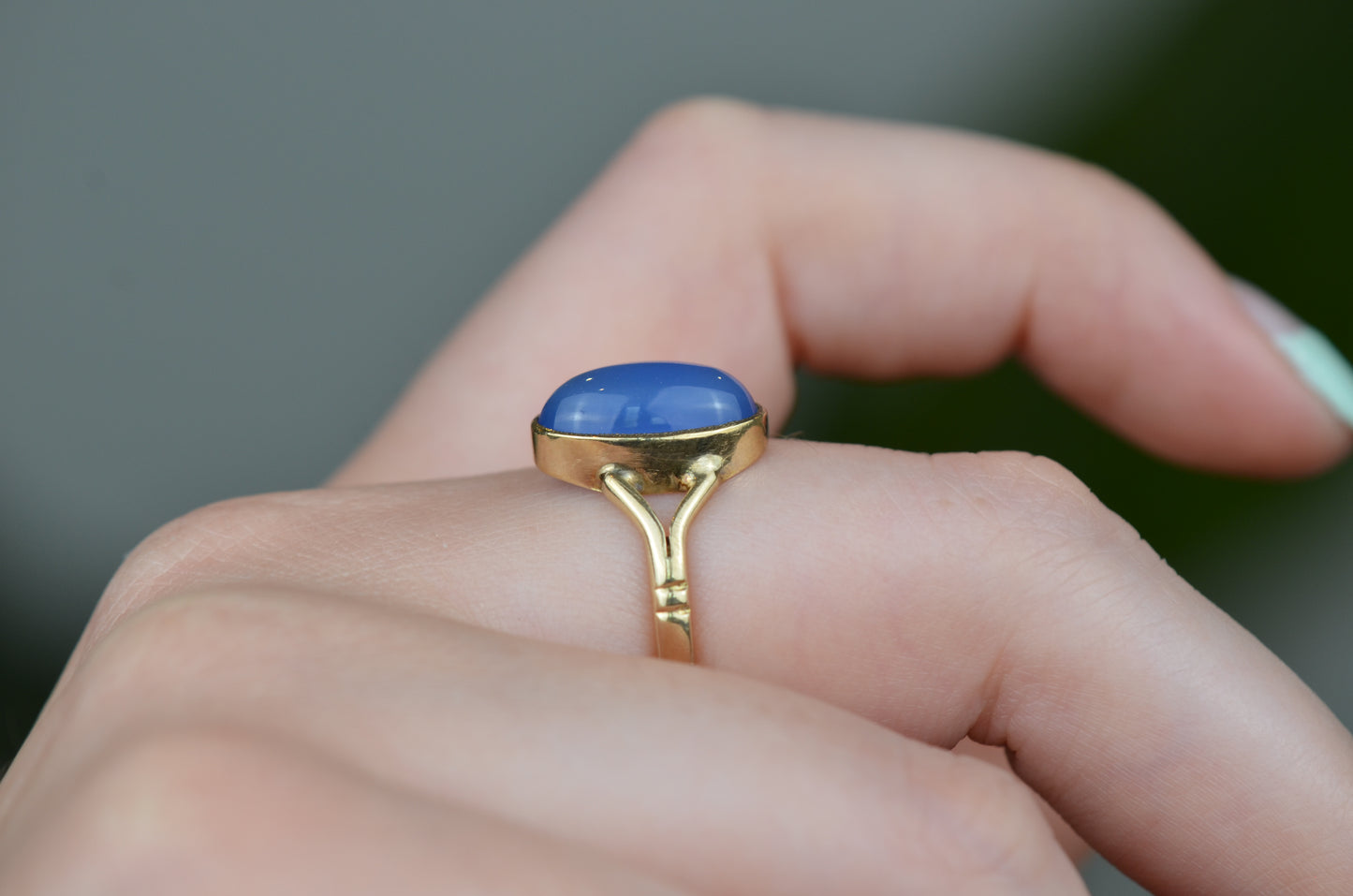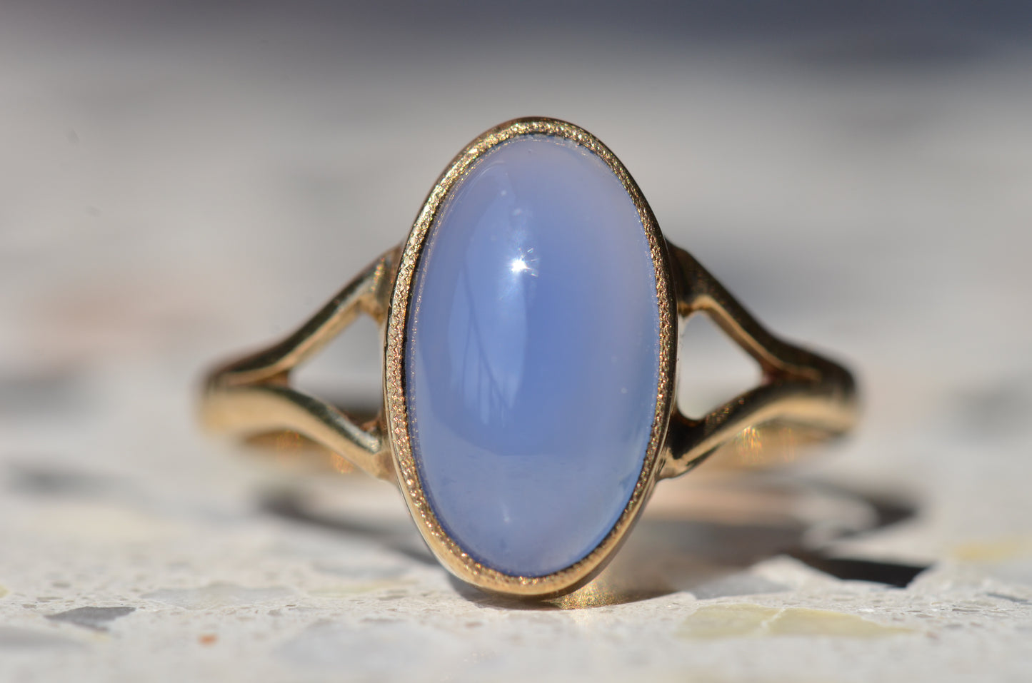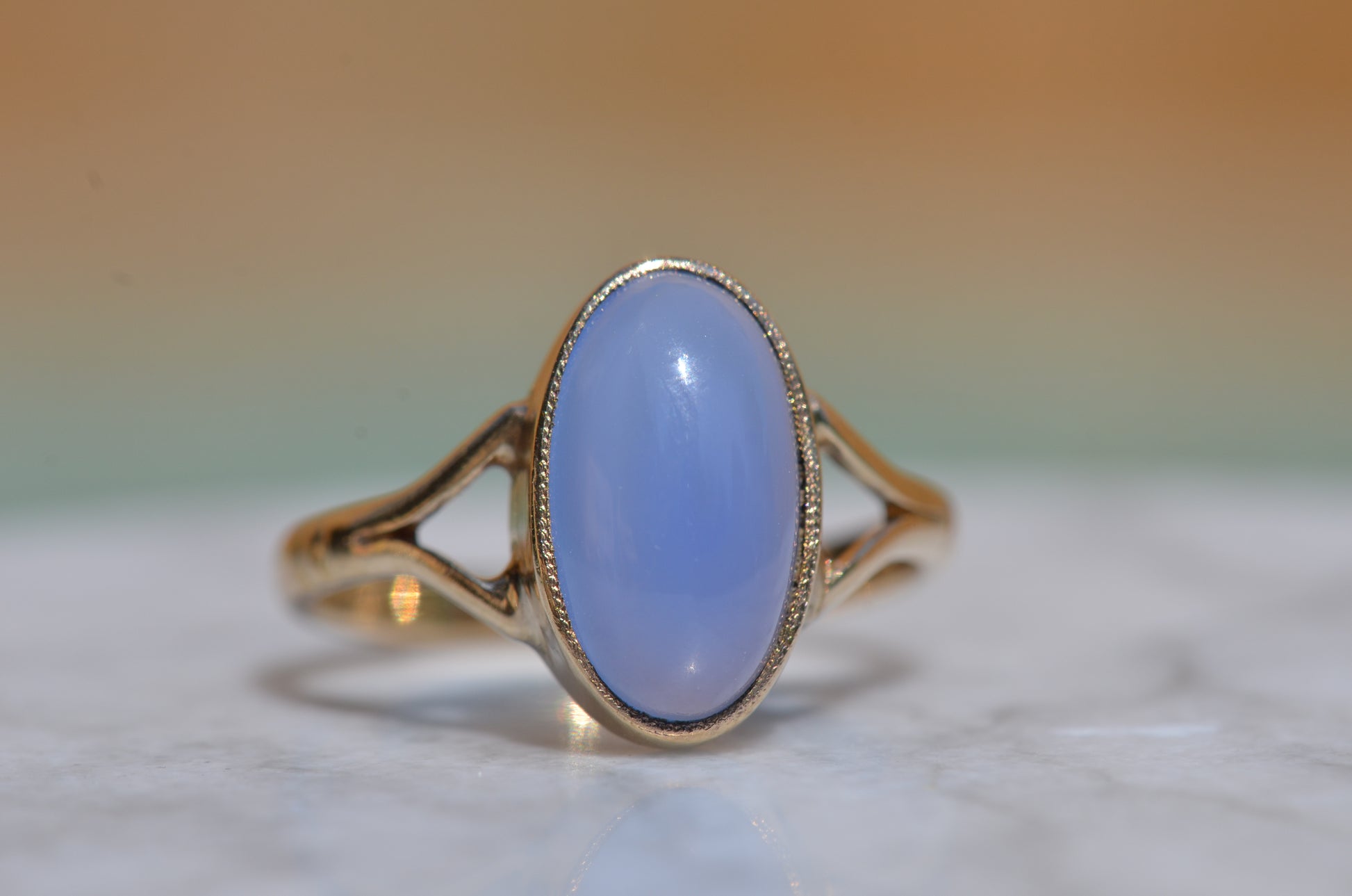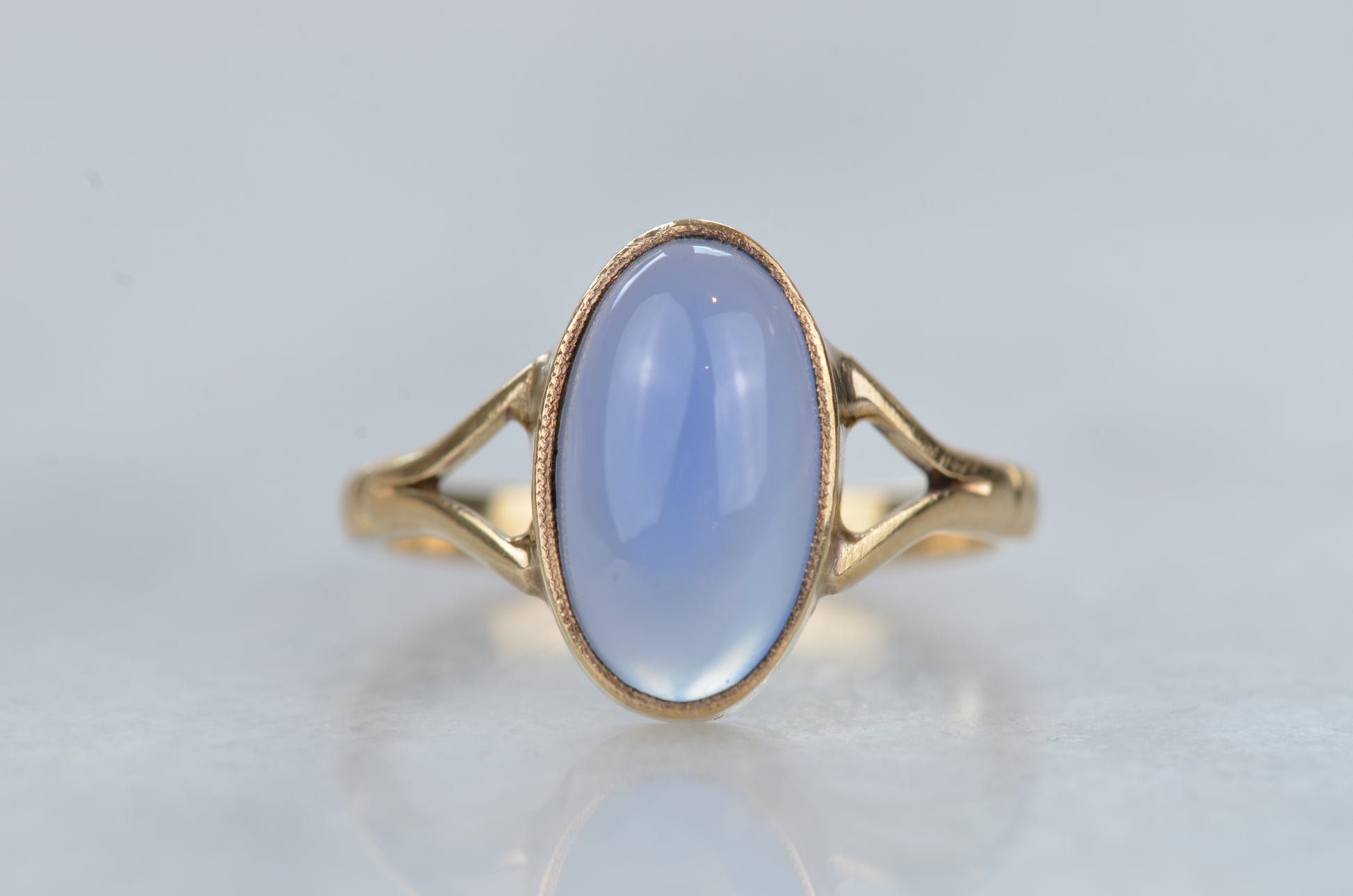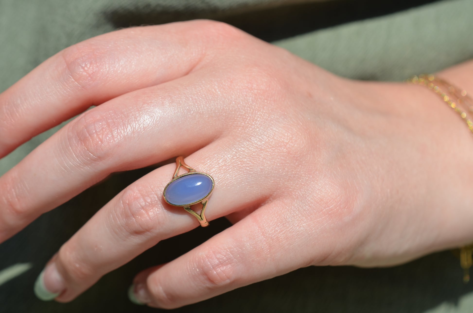 This gorgeous ring has an almost otherworldly quality stemming from the light that appears to nearly glow from the semi translucent blue chalcedony. With a simple milgrained bezel and split shoulders, the ring cedes the spotlight entirely to this sweet, calming stone.