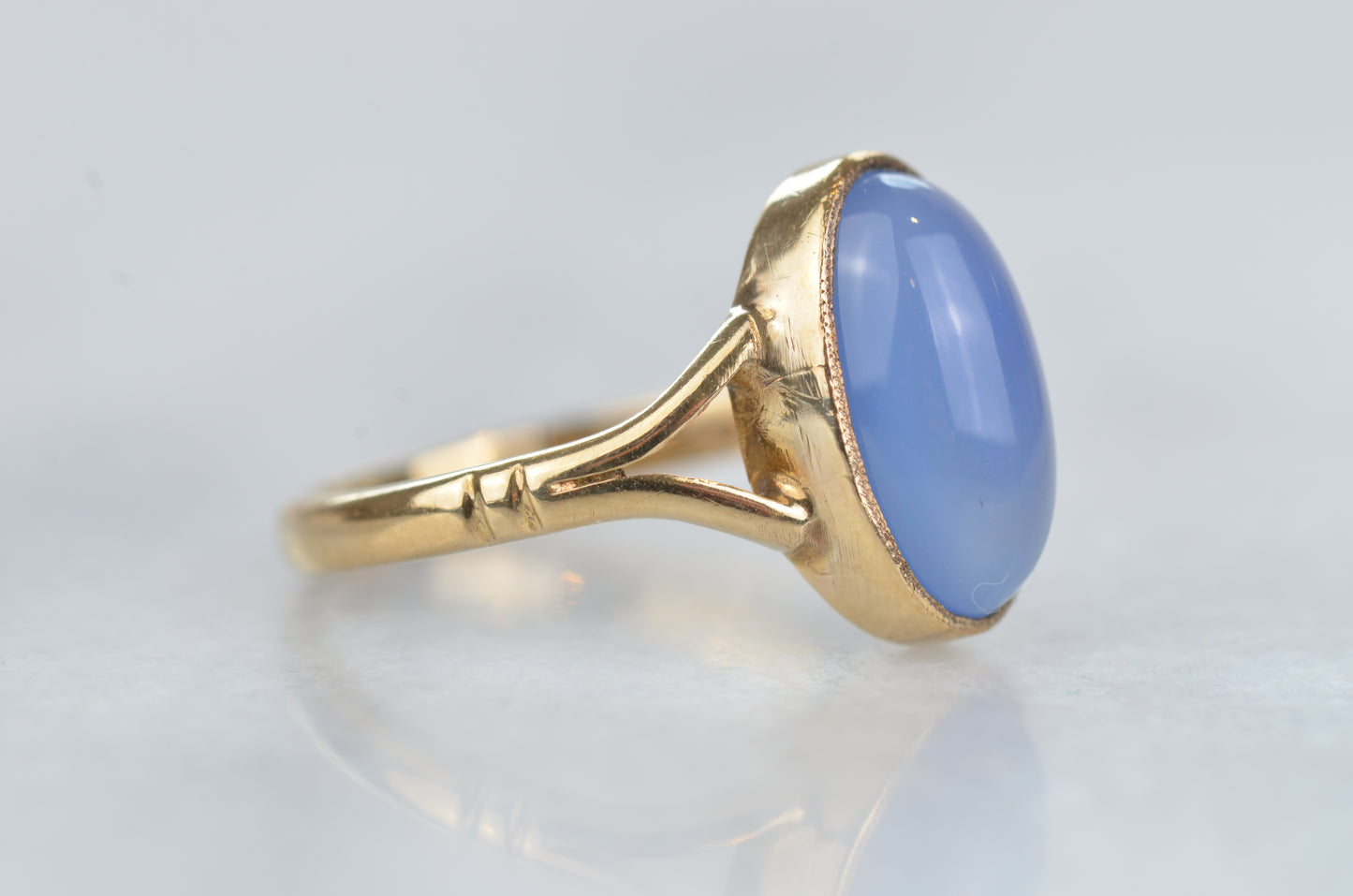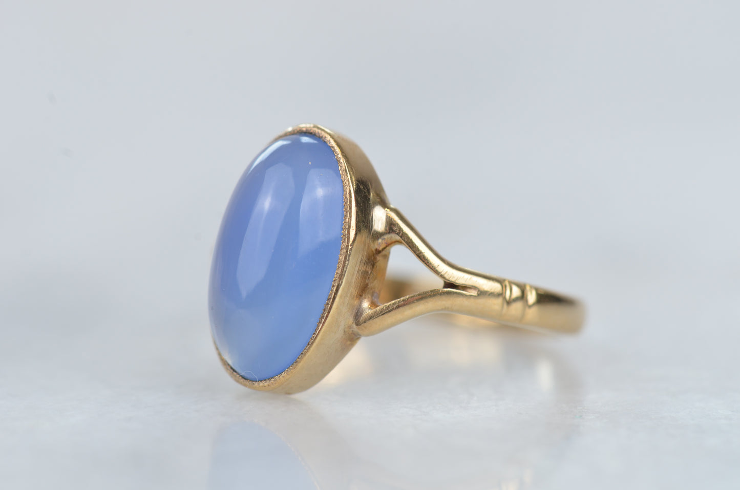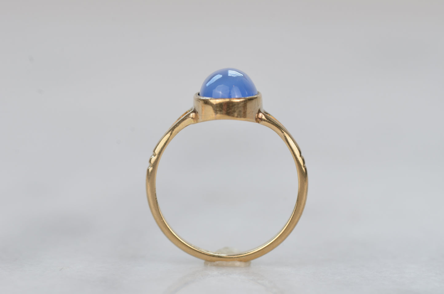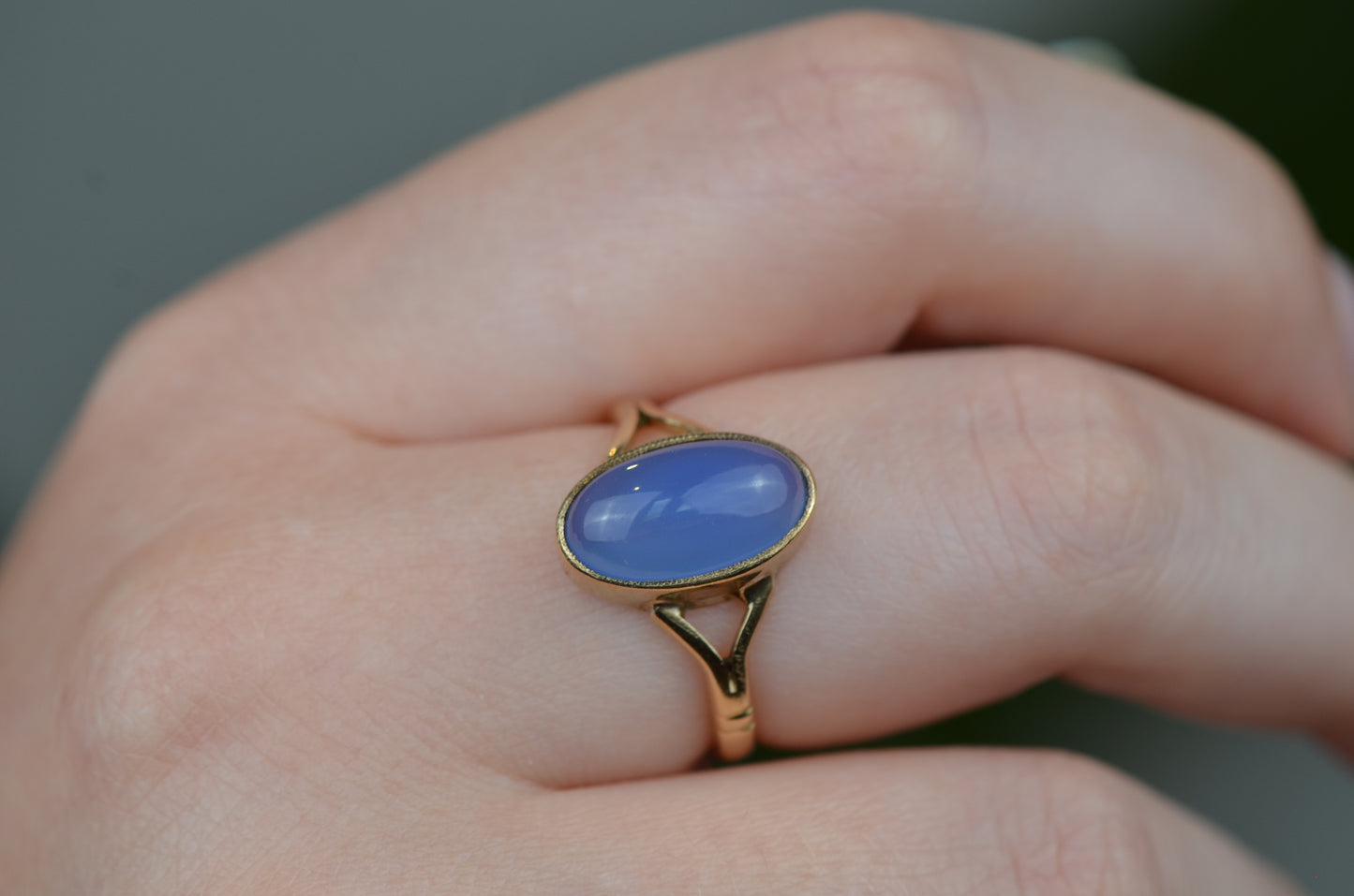 This gorgeous ring has an almost otherworldly quality stemming from the light that appears to nearly glow from the semi translucent blue chalcedony. With a simple milgrained bezel and split shoulders, the ring cedes the spotlight entirely to this sweet, calming stone.