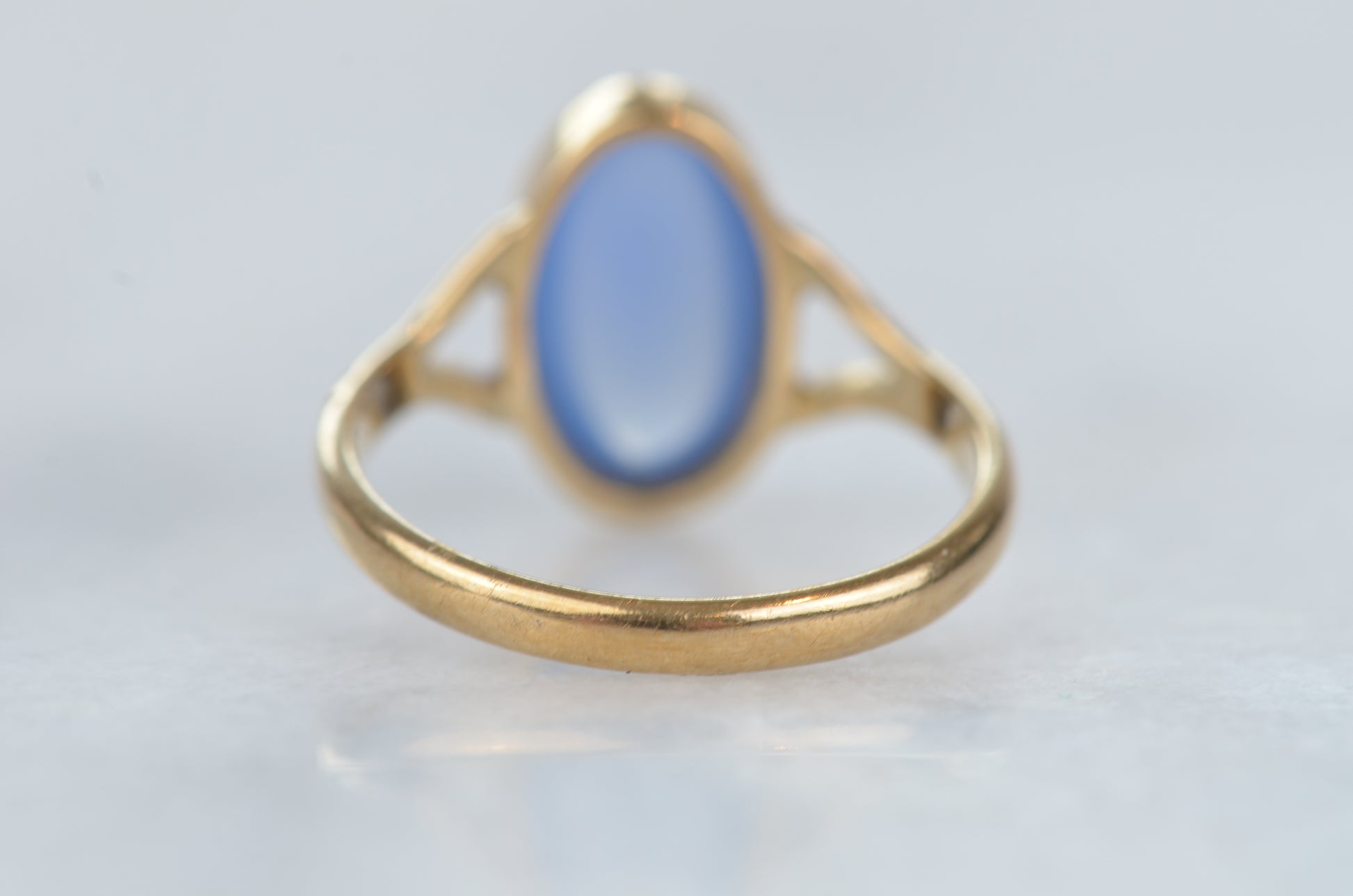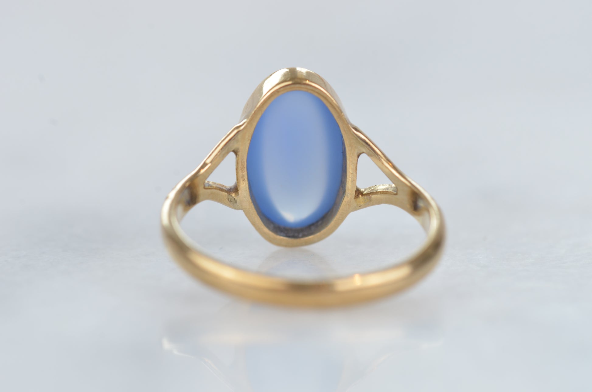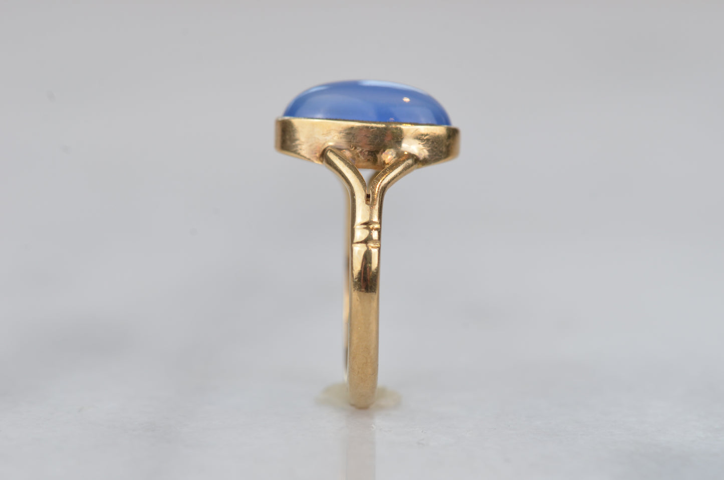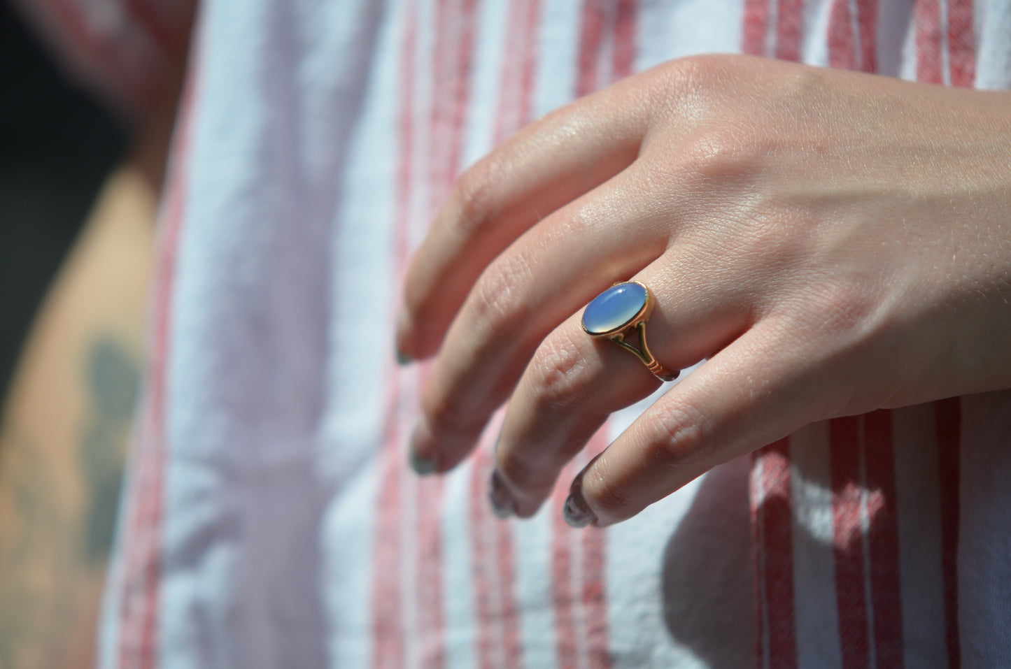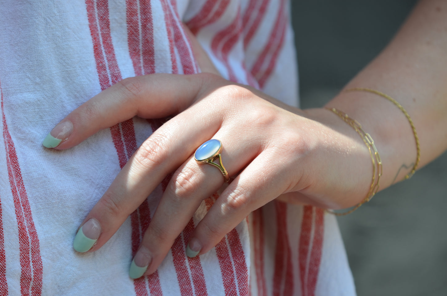 This gorgeous ring has an almost otherworldly quality stemming from the light that appears to nearly glow from the semi translucent blue chalcedony. With a simple milgrained bezel and split shoulders, the ring cedes the spotlight entirely to this sweet, calming stone.