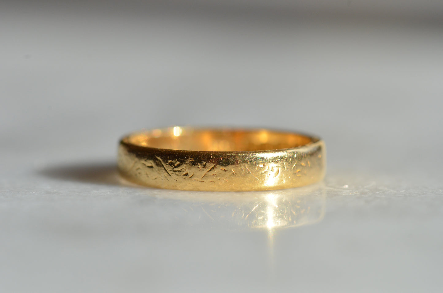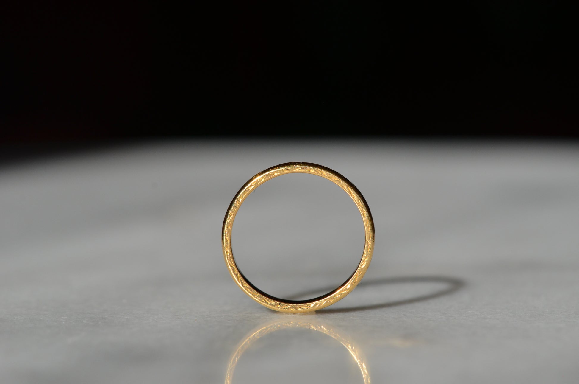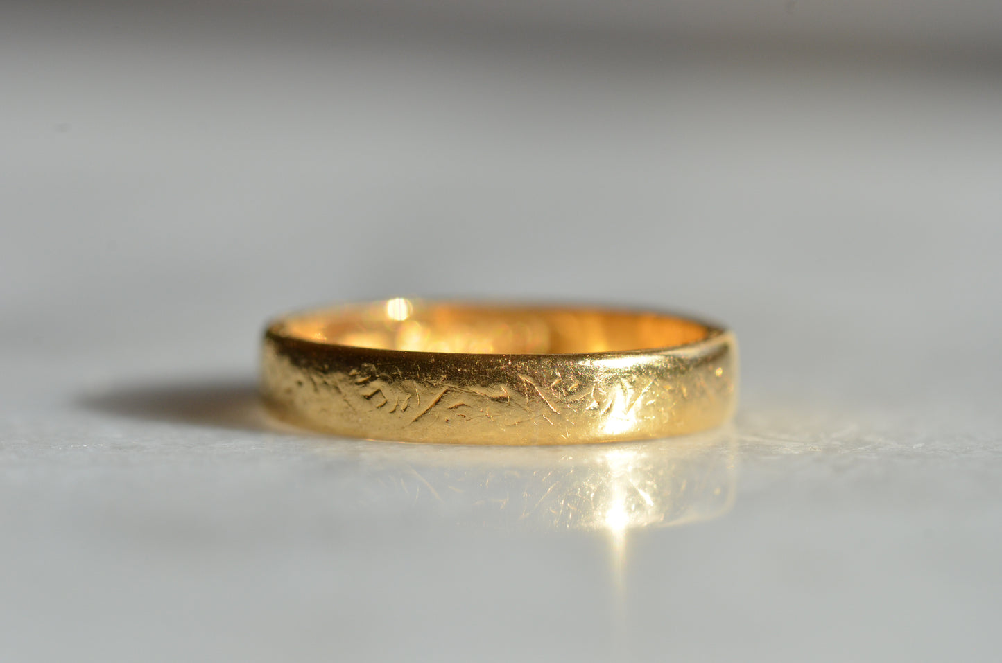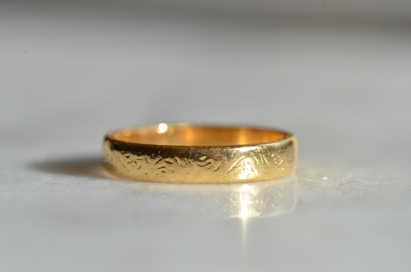 Gold alloys are softer in higher karats, so while this band once bore an intricate foliate-pattern engraving, it's been well loved and well worn, leaving only the traces of the engraved detail. The engraving remains a little crisper along the two sides of the band, giving a sense of the delicate swirling design.